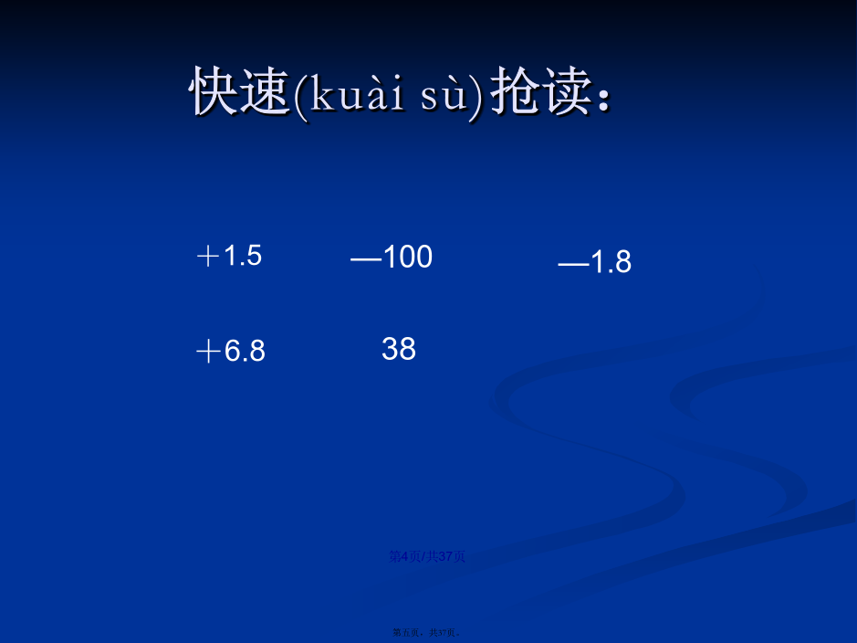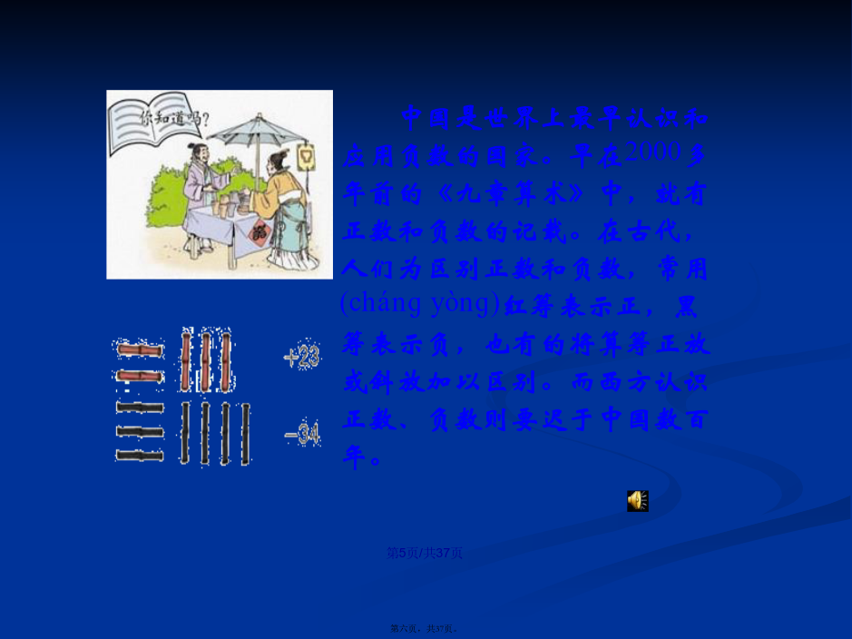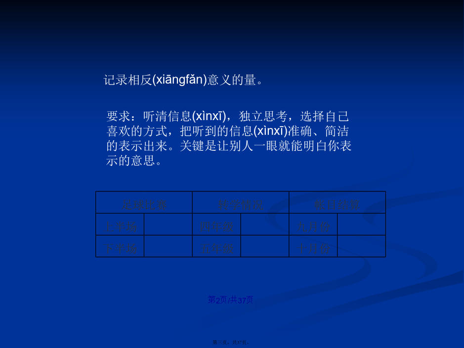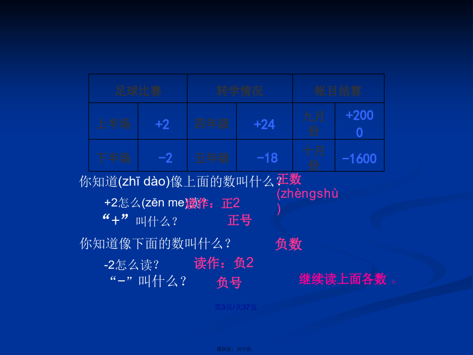 会计学教学(jiāoxué)目标足球比赛足球比赛快速(kuàisù)抢读:中国是世界上最早认识和应用负数的国家。早在2000多年前的《九章算术》中,就有正数和负数的记载。在古代,人们为区别正数和负数,常用(chánɡyònɡ)红筹表示正,黑筹表示负,也有的将算筹正放或斜放加以区别。而西方认识正数、负数则要迟于中国数百年。北京(běijīnɡ)最高温度是5℃,最低温度是零下5℃。北京(běijīnɡ)最高温度是5℃,最低温度是零下5℃。人们通常用正数表示(biǎoshì)零上的温度。瑞典天文学家摄尔休斯把在通常情况(qíngkuàng)下,冰水混合物的温度规定为0℃。人们是利用什么(shénme)工具来测量温度的呢?活动(huódòng):读出水银柱所表示(biǎoshì)的温度。-10℃你能说几个正数(zhèngshù)和负数吗?讨论交流:0怎么分类?是正数还是(háishi)负数呢?(1)叔叔(shūshu)上五楼开会,阿姨到地下二楼取车,应按哪两个键?珠穆朗玛峰比海平面高8844.43米记作()米,那么(nàme)吐鲁番盆地比海平面低155米记作()米,海平面记作()米。(3)上图每格表示1米,小华刚开始(kāishǐ)的位置在0处。5月4日爸爸(bàbà)工资收入1500元5月6日水、电、煤气支出200元5月12日电话费支出120元5月15日妈妈工资收入1400元……(4)刘翔在第十届世界田径锦标赛半决赛中,110米栏的成绩是13.42秒,当时(dàngshí)赛场风速为每秒-0.4米。生活(shēnghuó)中有更多的负数等待你们去发现。高楼地下室为了简单可以把+24简写成24。如果(rúguǒ)去掉正号,这些数你们熟悉吗?是我们过去学的数。某超市每个月的成本为100万元,去年下半年收入分别如下(rúxià):7月份104万元,8月份112万元,9月份100万元,10月份98万元,11月份101万元,12月份97万元(盈利用正数表示,亏本用负数表示)。汇报(huìbào)请你读上面(shàngmiɑn)各数。北京(běijīnɡ)-5℃和5℃一样吗?读出水银柱所表示(biǎoshì)的温度。活动(huódòng):温度计上的刻度是怎样(zěnyàng)排列的?读出水银柱所表示(biǎoshì)的温度。-10℃