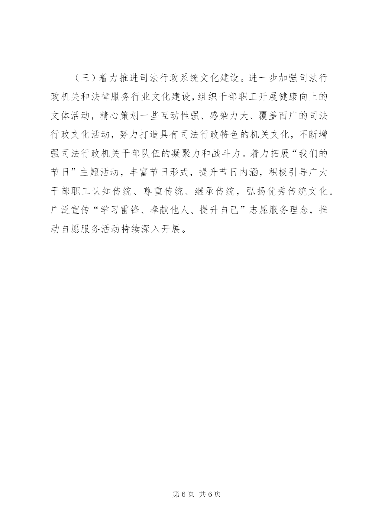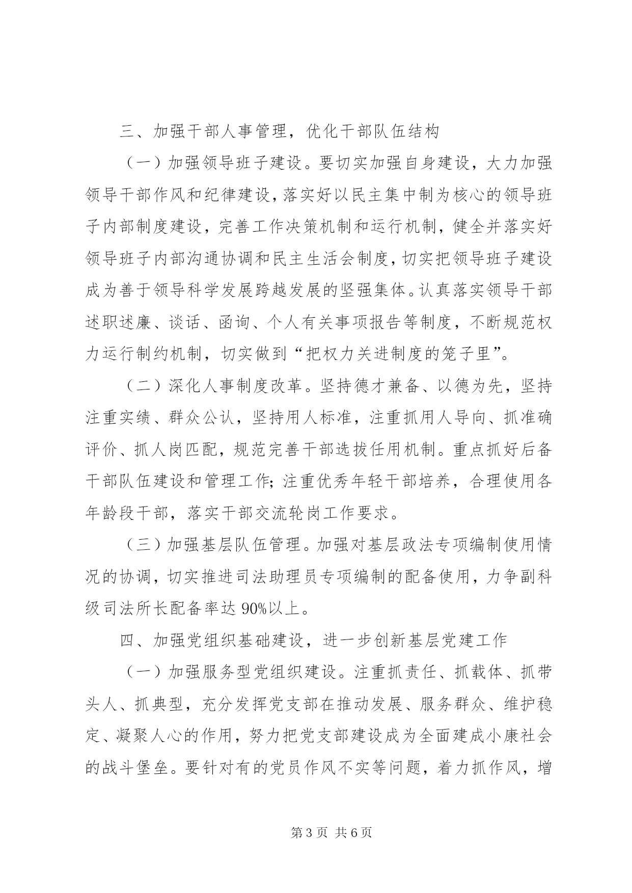 第PAGE\*Arabic\*MERGEFORMAT6页共NUMPAGES\*MERGEFORMAT6页司法局队伍建设工作要点一、加强思想政治建设,提升队伍理论水平(一)全力抓好十八大精神的学习贯彻。以领导干部为重点,采取专题培训、研讨交流等多种方式,分期分批组织轮训,带动全系统深入学习和自觉贯彻十八大提出的重大理论观点、重大方针政策和重大工作部署。要突出加强思想政治建设,把理想信念教育与中国特色社会主义教育、革命传统教育、政法干警核心价值观教育紧密结合起来,坚持用中国特色社会主义理论体系武装党员干部;引导广大党员干部坚定中国特色社会主义的道路自信、理论自信、制度自信。(二)深入开展“增强忧患意识推动长远发展”大讨论活动。按照县委统一部署,严格按照时序步骤抓好每个阶段工作。要贴近工作实际,紧盯年度目标任务,找准司法行政服务全县经济发展的着眼点、着力点,认真研究确定具体调研课题。要通过学习会、征求意见、研讨会、务虚会等形式,组织好讨论和调研,引导机关人员和法律服务人员进一步解放思想、寻找差距、改进作风,提高执行力和落实力,持续推进司法行政工作跨越发展、长远发展。二、加强队伍作风建设,密切党群干群关系(一)扎实开展党的群众路线教育实践活动。按照省、市、县的统一部署,认真组织开展以“为民、务实、清廉”为主要内容的党的群众路线教育实践活动。活动中,根据实际提出并落实不同的措施和要求,确保取得实实在在的效果。要突出抓好群众观教育,注重解决实际问题,完善党员干部直接联系服务群众制度,进一步密切党群干群关系;要积极探索和总结科学规范、富有实效的群众工作方法,提高做好新形势下群众工作的能力。(二)全力抓好队伍作风建设。要认真按照“马上就办”的求真务实精神,从局机关和领导做起,从群众反映强烈的问题改起,从最能体现良好作风的具体事情抓起,重实际、办实事、求实效,切实解决一些党员干部脱离群众、作风不实、为政不廉等问题。认真对照中央政治局“八项规定”和司法部、省厅的实施办法,提出本部门为民便民的具体措施,并认真抓好落实。要继续按照“四下基层”要求,深化“下基层、解民忧、办实事、促发展”活动,推动全系统党员干部直接联系和服务群众。(三)大力学习宣传司法行政先进典型。按照省厅和市局的部署要求,深入开展学习宣传清流监狱直属六中队、XX县区调解员林秀圭等先进单位和个人的典型事迹,在全系统广泛掀起学先进、树典型、比作风、比奉献的热潮。要深入挖掘和树立本系统的先进典型,培育树立身边的先进,学习宣传身边的先进,用身边的事来影响带动身边的人,教育引导广大司法行政干部职工自觉践行政法干警核心价值观,打牢高举旗帜、听党指挥、忠诚使命的思想基础。三、加强干部人事管理,优化干部队伍结构(一)加强领导班子建设。要切实加强自身建设,大力加强领导干部作风和纪律建设,落实好以民主集中制为核心的领导班子内部制度建设,完善工作决策机制和运行机制,健全并落实好领导班子内部沟通协调和民主生活会制度,切实把领导班子建设成为善于领导科学发展跨越发展的坚强集体。认真落实领导干部述职述廉、谈话、函询、个人有关事项报告等制度,不断规范权力运行制约机制,切实做到“把权力关进制度的笼子里”。(二)深化人事制度改革。坚持德才兼备、以德为先,坚持注重实绩、群众公认,坚持用人标准,注重抓用人导向、抓准确评价、抓人岗匹配,规范完善干部选拔任用机制。重点抓好后备干部队伍建设和管理工作;注重优秀年轻干部培养,合理使用各年龄段干部,落实干部交流轮岗工作要求。(三)加强基层队伍管理。加强对基层政法专项编制使用情况的协调,切实推进司法助理员专项编制的配备使用,力争副科级司法所长配备率达90%以上。四、加强党组织基础建设,进一步创新基层党建工作(一)加强服务型党组织建设。注重抓责任、抓载体、抓带头人、抓典型,充分发挥党支部在推动发展、服务群众、维护稳定、凝聚人心的作用,努力把党支部建设成为全面建成小康社会的战斗堡垒。要针对有的党员作风不实等问题,着力抓作风,增强党组织服务基层的活力。(二)深化实施基层党建工作机制。全面落实机关党建1263党建工作机制,加大力度指导律师党建创特色、创品牌,着力培育“拿得出,叫得响,推得开”的示范点。与上级党委协调,争取在符合条件的司法所和律师所建立党支部。扎实推进机关党建三级联创、基层党组织晋位升级,健全党员立足岗位创先争优长效机制。五、加强队伍教育培训,提升队伍能力素质(一)落实教育培训任务。以建设“学习型、服务型、创新型”组织为目标,按照每年参加脱产培训的时间不少于100学时的要求,科学安排业务培训、晋职培训、进修培训等工作。突出落实好调解主任、司法协理员的集中轮训工作。(二)创新教育培训载体。积极开展培训需求调研,及时了解和掌握干部培训的组织需求、岗位需求和个