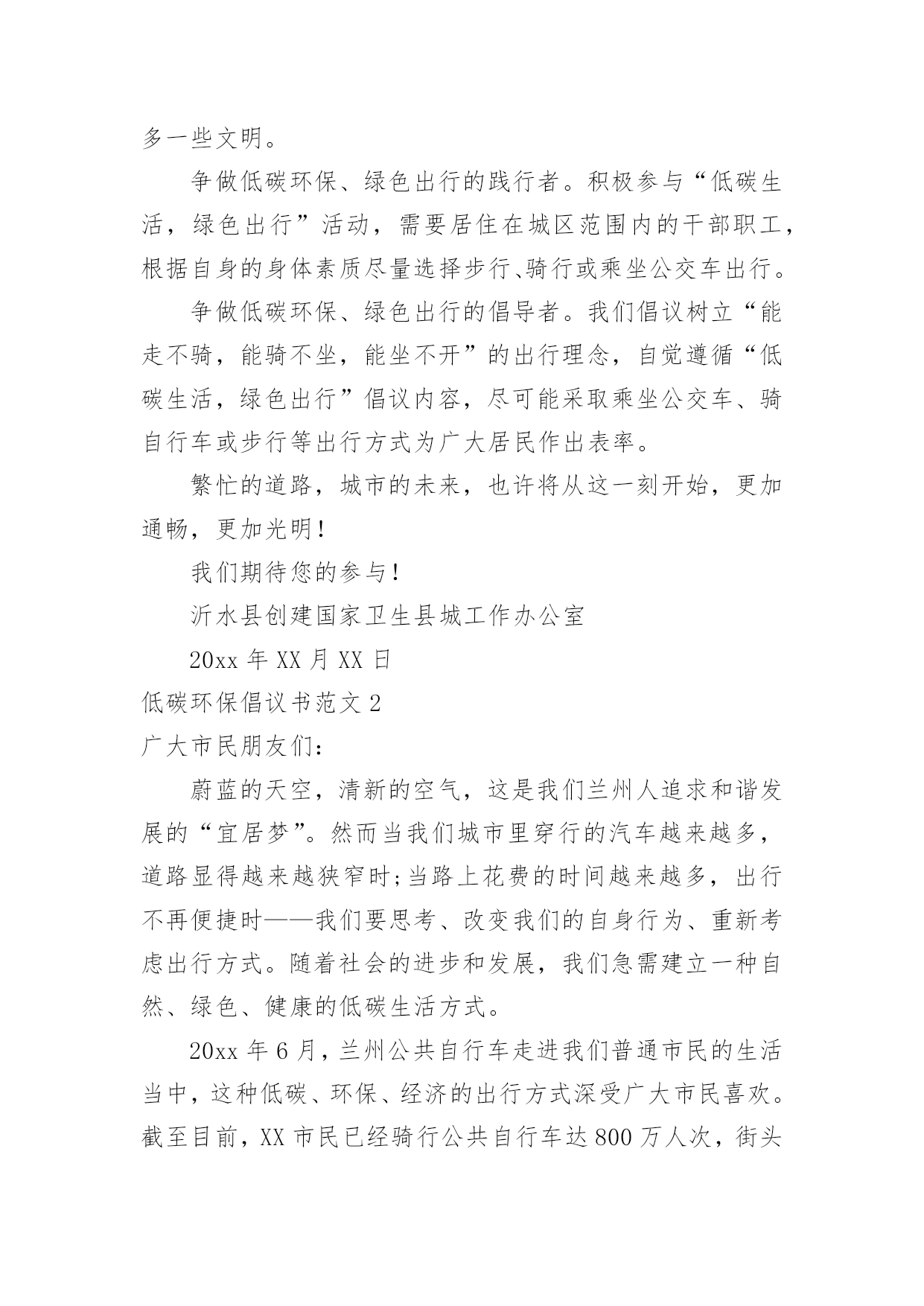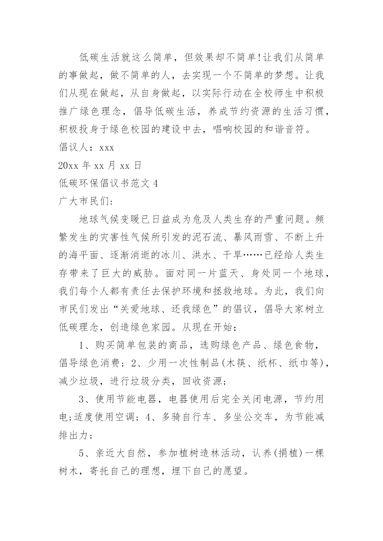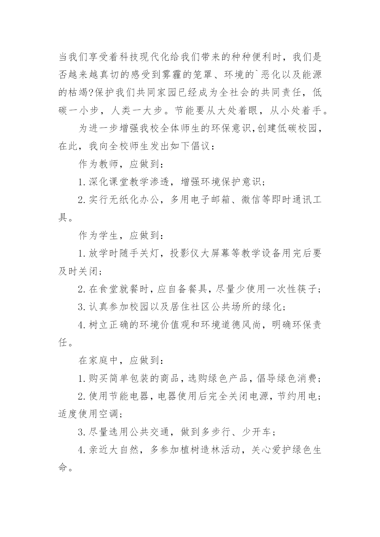 低碳环保倡议书低碳环保倡议书范文15篇(热门)随着社会一步步向前发展,越来越多人会去使用倡议书,倡议书不是对某个人或某一小集体而发的,它的受众往往是广大群众,或是部门的所有人,或是一个地区的所有人,甚至是全国人民。你所见过的倡议书是什么样的呢?下面是小编帮大家整理的低碳环保倡议书范文,欢迎大家借鉴与参考,希望对大家有所帮助。低碳环保倡议书范文1各位市民朋友们:低碳环保、绿色出行,减少碳排放是节能、环保、绿色、生态、健康的一种生活方式,是改善我们的生活环境,享受美好人生的一种愿望。为了我们沂水县更加靓丽,为了我们生活更加幸福、环境更加美好,我们向全县广大人民倡议:争做低碳环保、绿色出行的宣传者。低碳生活无处不在、无处不有。领导干部带头选择绿色出行,带头步行上下班、杜绝公车私用、按规定标准出差下乡,真正把自己的.身影融进人民群众。学习掌握、宣传低碳知识,提高低碳意识,树立低碳理念,倡导低碳生活;向身边人宣传开展“低碳环保、绿色出行”的意义和方式,带动更多的人参与到行动中来。让我们的家园多一片蓝天,多一丝绿色,多一路畅通,多一些文明。争做低碳环保、绿色出行的践行者。积极参与“低碳生活,绿色出行”活动,需要居住在城区范围内的干部职工,根据自身的身体素质尽量选择步行、骑行或乘坐公交车出行。争做低碳环保、绿色出行的倡导者。我们倡议树立“能走不骑,能骑不坐,能坐不开”的出行理念,自觉遵循“低碳生活,绿色出行”倡议内容,尽可能采取乘坐公交车、骑自行车或步行等出行方式为广大居民作出表率。繁忙的道路,城市的未来,也许将从这一刻开始,更加通畅,更加光明!我们期待您的参与!沂水县创建国家卫生县城工作办公室20xx年XX月XX日低碳环保倡议书范文2广大市民朋友们:蔚蓝的天空,清新的空气,这是我们兰州人追求和谐发展的“宜居梦”。然而当我们城市里穿行的汽车越来越多,道路显得越来越狭窄时;当路上花费的时间越来越多,出行不再便捷时——我们要思考、改变我们的自身行为、重新考虑出行方式。随着社会的进步和发展,我们急需建立一种自然、绿色、健康的低碳生活方式。20xx年6月,兰州公共自行车走进我们普通市民的生活当中,这种低碳、环保、经济的出行方式深受广大市民喜欢。截至目前,XX市民已经骑行公共自行车达800万人次,街头那一抹抹流动的绿色成了兰州街头独特的风景。公共自行车在为市民提供低碳、绿色生活的同时,也成为节能减排的助推器。为进一步推动绿色出行,防止大气污染,让更多的人参与到健康骑行的队伍中来,XX市公共自行车服务公司联合中国电信兰州分公司开展此次“骑行达人”活动,期待市民争做“骑行达人”,带动身边更多的`人选择公共自行车这种低碳环保的出行方式。为此,我们向市民朋友发出如下倡议:多选择公共交通出行,争做绿色出行的先行者。倡议“有车族”带头选择骑公共自行车上下班,坚持每周少开一天车,多骑公共自行车。我们不仅是建设绿色兰州的推动者,也是建设美丽兰州的先行者。只有你我共同的努力,才能减少污染的排放,才能守卫我们共同的蓝天。走低碳之路,建设绿色、美丽兰州是我们的共同责任。让我们用智慧去关注自然环境的变化,用热情去传播环保理念,用勇气去改变生活习惯。为了你我的健康,为了环保生活,为了绿色地球,希望市民朋友们积极投身到“骑行达人”的行动中来,让我们的家园多一些绿色,多一路畅通,多一点文明,多一份健康,多一份幸福。xxx青年志愿者中心20xx·3·30低碳环保倡议书范文3老师们、同学们:地球是我们共同的家园,环境与我们的生活息息相关,当我们享受着科技现代化给我们带来的种种便利时,我们是否越来越真切的感受到雾霾的笼罩、环境的`恶化以及能源的枯竭?保护我们共同家园已经成为全社会的共同责任,低碳一小步,人类一大步。节能要从大处着眼,从小处着手。为进一步增强我校全体师生的环保意识,创建低碳校园,在此,我向全校师生发出如下倡议:作为教师,应做到:1.深化课堂教学渗透,增强环境保护意识;2.实行无纸化办公,多用电子邮箱、微信等即时通讯工具。作为学生,应做到:1.放学时随手关灯,投影仪大屏幕等教学设备用完后要及时关闭;2.在食堂就餐时,应自备餐具,尽量少使用一次性筷子;3.认真参加校园以及居住社区公共场所的绿化;4.树立正确的环境价值观和环境道德风尚,明确环保责任。在家庭中,应做到:1.购买简单包装的商品,选购绿色产品,倡导绿色消费;2.使用节能电器,电器使用后完全关闭电源,节约用电;适度使用空调;3.尽量选用公共交通,做到多步行、少开车;4.亲近大自然,多参加植树造林活动,关心爱护绿色生命。低碳生活就这么简单,但效果却不简单!让我们从简单的事做起,做不简单的人,去实现一个不简单的梦想。让我们从现在做起,从自身做起,以实际行动在全校师生中积极推广绿色理念,倡导低碳生活,养成节约资源的生活习
