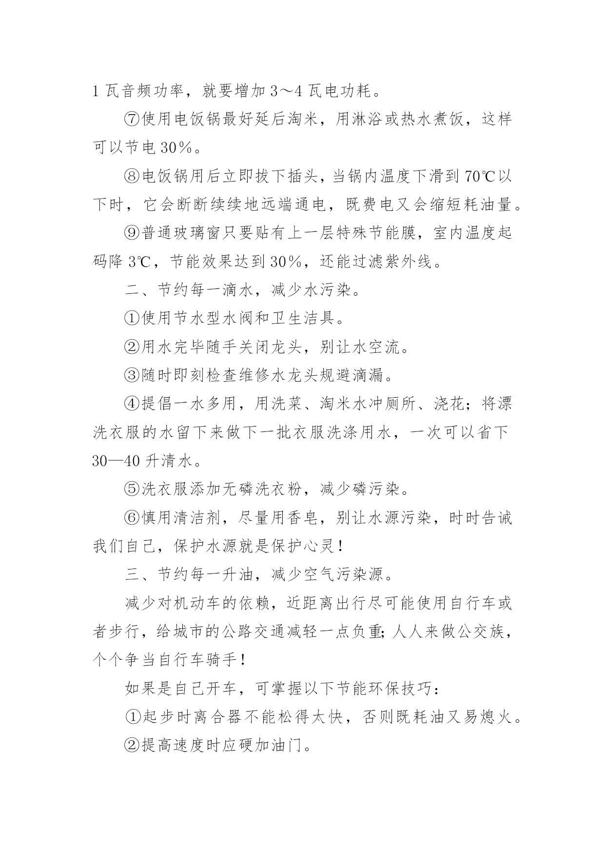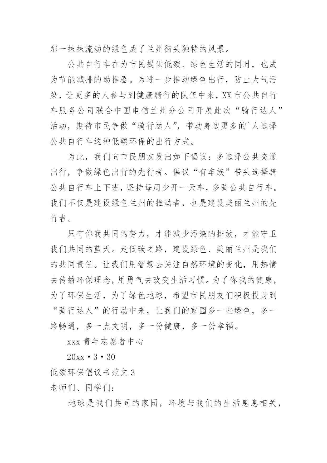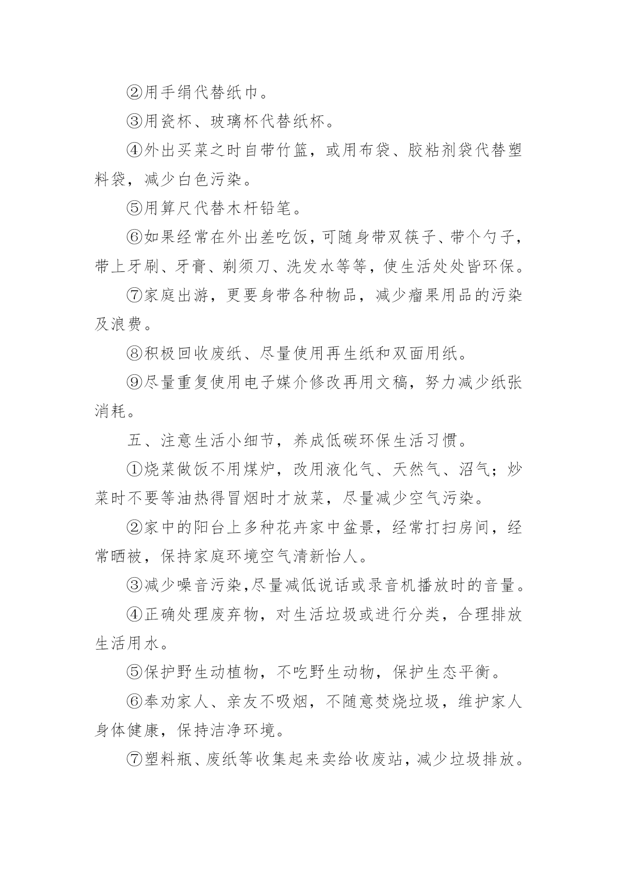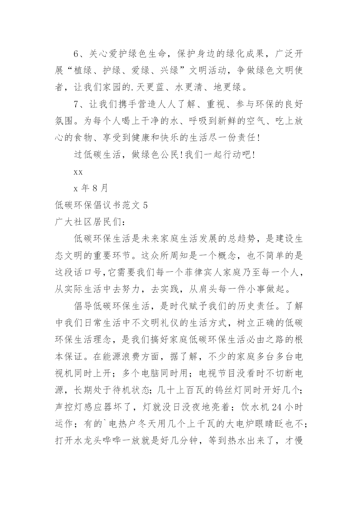 低碳环保倡议书低碳环保倡议书范文15篇(热门)随着社会一步步向前发展,越来越多人会去使用倡议书,倡议书不是对某个人或某一小集体而发的,它的受众往往是广大群众,或是部门的所有人,或是一个地区的所有人,甚至是全国人民。你所见过的倡议书是什么样的呢?下面是小编帮大家整理的低碳环保倡议书范文,欢迎大家借鉴与参考,希望对大家有所帮助。低碳环保倡议书范文1各位市民朋友们:低碳环保、绿色出行,减少碳排放是节能、环保、绿色、生态、健康的一种生活方式,是改善我们的生活环境,享受美好人生的一种愿望。为了我们沂水县更加靓丽,为了我们生活更加幸福、环境更加美好,我们向全县广大人民倡议:争做低碳环保、绿色出行的宣传者。低碳生活无处不在、无处不有。领导干部带头选择绿色出行,带头步行上下班、杜绝公车私用、按规定标准出差下乡,真正把自己的.身影融进人民群众。学习掌握、宣传低碳知识,提高低碳意识,树立低碳理念,倡导低碳生活;向身边人宣传开展“低碳环保、绿色出行”的意义和方式,带动更多的人参与到行动中来。让我们的家园多一片蓝天,多一丝绿色,多一路畅通,多一些文明。争做低碳环保、绿色出行的践行者。积极参与“低碳生活,绿色出行”活动,需要居住在城区范围内的干部职工,根据自身的身体素质尽量选择步行、骑行或乘坐公交车出行。争做低碳环保、绿色出行的倡导者。我们倡议树立“能走不骑,能骑不坐,能坐不开”的出行理念,自觉遵循“低碳生活,绿色出行”倡议内容,尽可能采取乘坐公交车、骑自行车或步行等出行方式为广大居民作出表率。繁忙的道路,城市的未来,也许将从这一刻开始,更加通畅,更加光明!我们期待您的参与!沂水县创建国家卫生县城工作办公室20xx年XX月XX日低碳环保倡议书范文2广大市民朋友们:蔚蓝的天空,清新的空气,这是我们兰州人追求和谐发展的“宜居梦”。然而当我们城市里穿行的汽车越来越多,道路显得越来越狭窄时;当路上花费的时间越来越多,出行不再便捷时——我们要思考、改变我们的自身行为、重新考虑出行方式。随着社会的进步和发展,我们急需建立一种自然、绿色、健康的低碳生活方式。20xx年6月,兰州公共自行车走进我们普通市民的生活当中,这种低碳、环保、经济的出行方式深受广大市民喜欢。截至目前,XX市民已经骑行公共自行车达800万人次,街头那一抹抹流动的绿色成了兰州街头独特的风景。公共自行车在为市民提供低碳、绿色生活的同时,也成为节能减排的助推器。为进一步推动绿色出行,防止大气污染,让更多的人参与到健康骑行的队伍中来,XX市公共自行车服务公司联合中国电信兰州分公司开展此次“骑行达人”活动,期待市民争做“骑行达人”,带动身边更多的`人选择公共自行车这种低碳环保的出行方式。为此,我们向市民朋友发出如下倡议:多选择公共交通出行,争做绿色出行的先行者。倡议“有车族”带头选择骑公共自行车上下班,坚持每周少开一天车,多骑公共自行车。我们不仅是建设绿色兰州的推动者,也是建设美丽兰州的先行者。只有你我共同的努力,才能减少污染的排放,才能守卫我们共同的蓝天。走低碳之路,建设绿色、美丽兰州是我们的共同责任。让我们用智慧去关注自然环境的变化,用热情去传播环保理念,用勇气去改变生活习惯。为了你我的健康,为了环保生活,为了绿色地球,希望市民朋友们积极投身到“骑行达人”的行动中来,让我们的家园多一些绿色,多一路畅通,多一点文明,多一份健康,多一份幸福。xxx青年志愿者中心20xx·3·30低碳环保倡议书范文3老师们、同学们:地球是我们共同的家园,环境与我们的生活息息相关,当我们享受着科技现代化给我们带来的种种便利时,我们是否越来越真切的感受到雾霾的笼罩、环境的`恶化以及能源的枯竭?保护我们共同家园已经成为全社会的共同责任,低碳一小步,人类一大步。节能要从大处着眼,从小处着手。为进一步增强我校全体师生的环保意识,创建低碳校园,在此,我向全校师生发出如下倡议:作为教师,应做到:1.深化课堂教学渗透,增强环境保护意识;2.实行无纸化办公,多用电子邮箱、微信等即时通讯工具。作为学生,应做到:1.放学时随手关灯,投影仪大屏幕等教学设备用完后要及时关闭;2.在食堂就餐时,应自备餐具,尽量少使用一次性筷子;3.认真参加校园以及居住社区公共场所的绿化;4.树立正确的环境价值观和环境道德风尚,明确环保责任。在家庭中,应做到:1.购买简单包装的商品,选购绿色产品,倡导绿色消费;2.使用节能电器,电器使用后完全关闭电源,节约用电;适度使用空调;3.尽量选用公共交通,做到多步行、少开车;4.亲近大自然,多参加植树造林活动,关心爱护绿色生命。低碳生活就这么简单,但效果却不简单!让我们从简单的事做起,做不简单的人,去实现一个不简单的梦想。让我们从现在做起,从自身做起,以实际行动在全校师生中积极推广绿色理念,倡导低碳生活,养成节约资源的生活习