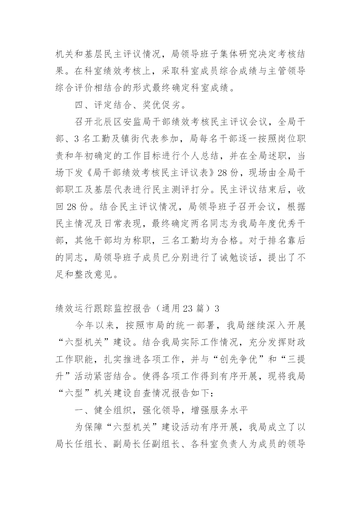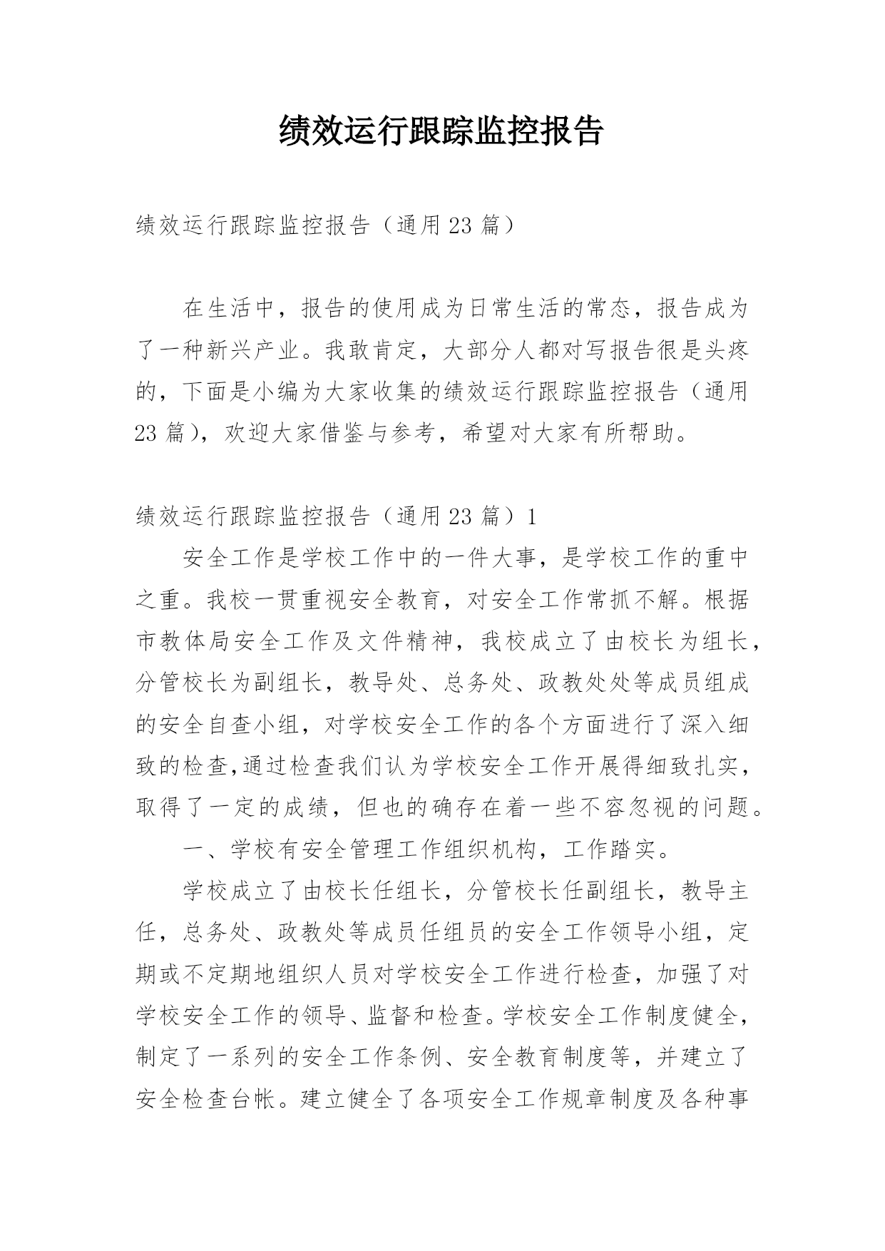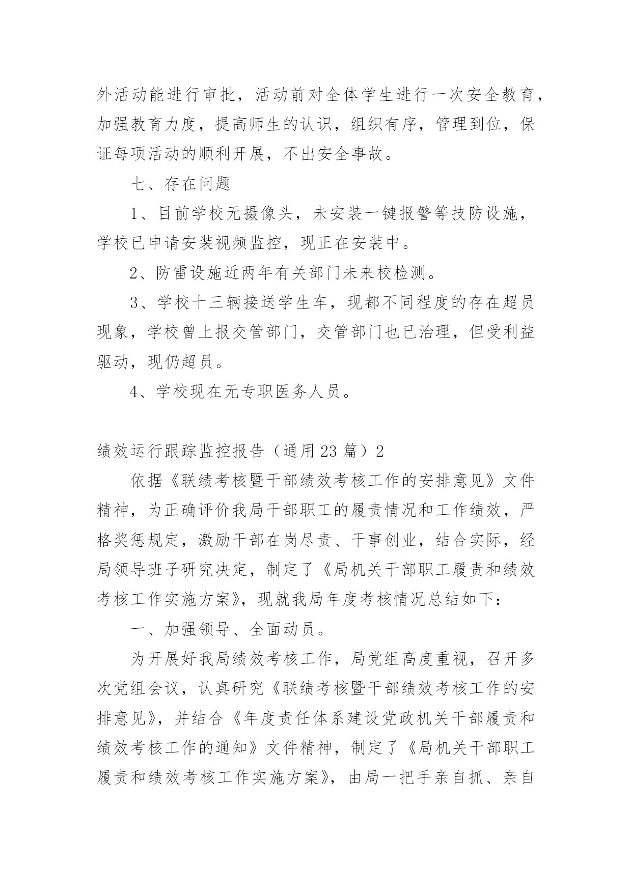 绩效运行跟踪监控报告绩效运行跟踪监控报告(通用23篇)在生活中,报告的使用成为日常生活的常态,报告成为了一种新兴产业。我敢肯定,大部分人都对写报告很是头疼的,下面是小编为大家收集的绩效运行跟踪监控报告(通用23篇),欢迎大家借鉴与参考,希望对大家有所帮助。绩效运行跟踪监控报告(通用23篇)1安全工作是学校工作中的一件大事,是学校工作的重中之重。我校一贯重视安全教育,对安全工作常抓不解。根据市教体局安全工作及文件精神,我校成立了由校长为组长,分管校长为副组长,教导处、总务处、政教处处等成员组成的安全自查小组,对学校安全工作的各个方面进行了深入细致的检查,通过检查我们认为学校安全工作开展得细致扎实,取得了一定的成绩,但也的确存在着一些不容忽视的问题。一、学校有安全管理工作组织机构,工作踏实。学校成立了由校长任组长,分管校长任副组长,教导主任,总务处、政教处等成员任组员的安全工作领导小组,定期或不定期地组织人员对学校安全工作进行检查,加强了对学校安全工作的领导、监督和检查。学校安全工作制度健全,制定了一系列的安全工作条例、安全教育制度等,并建立了安全检查台帐。建立健全了各项安全工作规章制度及各种事故应急处置预案。学校各部门和岗位都有明确的安全责任要求,并层层签订安全责任书,落实事故追究制度。安全经费满足需要,每年都按时投保校方责任险。二、安全设施建设完善有效,及时维护。学校配备两名专职保安,配备安保器械满足需要,救援物资设备充足,按规定配备消防设施设备,应急照明设置符合要求。种类用电设备与线路、开关相匹配,符合安全标准。三、加强师生的交通安全教育。学校领导十分重视师生的交通安全,特别是学生的交通安全。学校利用国旗下讲话时间,在全校进行交通安全常识的教育,利用广播对学生进行交通安全教育,宣传交通法规,组织全校师生观看交通安全宣传片等,各班班主任也利用各种时机、各种手段对学生加强交通,安全的教育。四、重视学校消防安全。学校成立了消防安全工作领导小组,由学校后勤处负责具体实施消防安全工作。经常组织检查督导,发现问题立即督促后勤人员加以解决和整改,消除安全隐患。制订好消防安全管理制度、消防安全检查制度、消防安全教育制度、消防安全考核制度,定期检查和考核,对检查考核情况进行记录,做到有案可查。学校各楼层、楼道口均配备好灭火器。学校在许多公共场所、易发生火灾的地方、重要场所都悬挂好消防安全标志,起好警示作用,提醒全校师生严格执行防火管理措施。学校电器设备较多,用电安全尤为重要,防止因电气故障引发火灾,学校加强了电气设备的保养和维护,定期请专业人员对电气设备进行检查,检查电气设备是否有过载、短路、接触不良、漏电等情况,发现问题及时处理;同时经常组织人员检查和维护各室的照明设备、电器设备,检查防静电和防雷装置的安全,检查尽量做到细而实,避免而疏忽大意而造成消防隐患,导致安全事故的发生。加强对工作人员的消防教育,要求正确使用好液化气、电器设备,确保安全。五、加强防盗工作。学校十分重视防盗工作,对各类电教仪器,尤其是电脑、电视机等贵重仪器均有专人保管。学校在微机室等重要场所均安装了防盗门和防盗窗。学校制订了值班制度,节假日均有人值班,值班为24小时制,特别加强了夜间的巡视。学校实行专职保安门卫制度,平时能对进出学校的人员、车辆、物资作好登记、核对工作。学校对防盗工作从细处、实处入手,力求万无一失。六、学校是从事教育活动的场所,学生的活动安全也是学校安全工作的重点。首先我们对学生活动加强了教育和管理,教育学生课间、课后开展正常的活动,不进行带有危险性的游戏。学校每天都有带班领导、值日教师和值日学生,他们在课间加强了巡视,确保学生的课间活动能有序、正常地开展。其次学校对学生活动场地、器械进行进行定期检查,对一些存在危险因素的地方和器械进行了整改和维修。目前学校活动场地、体育器材、体育设施均符合安全。学校对开展的重大活动和校外活动能进行审批,活动前对全体学生进行一次安全教育,加强教育力度,提高师生的认识,组织有序,管理到位,保证每项活动的顺利开展,不出安全事故。七、存在问题1、目前学校无摄像头,未安装一键报警等技防设施,学校已申请安装视频监控,现正在安装中。2、防雷设施近两年有关部门未来校检测。3、学校十三辆接送学生车,现都不同程度的存在超员现象,学校曾上报交管部门,交管部门也已治理,但受利益驱动,现仍超员。4、学校现在无专职医务人员。绩效运行跟踪监控报告(通用23篇)2依据《联绩考核暨干部绩效考核工作的安排意见》文件精神,为正确评价我局干部职工的履责情况和工作绩效,严格奖惩规定,激励干部在岗尽责、干事创业,结合实际,经局领导班子研究决定,制定了《局机关干部职工履责和绩效考核工作实施方案》,现就我局年度考核情况总结如下:一、加强领导、全面动员。为开展好我