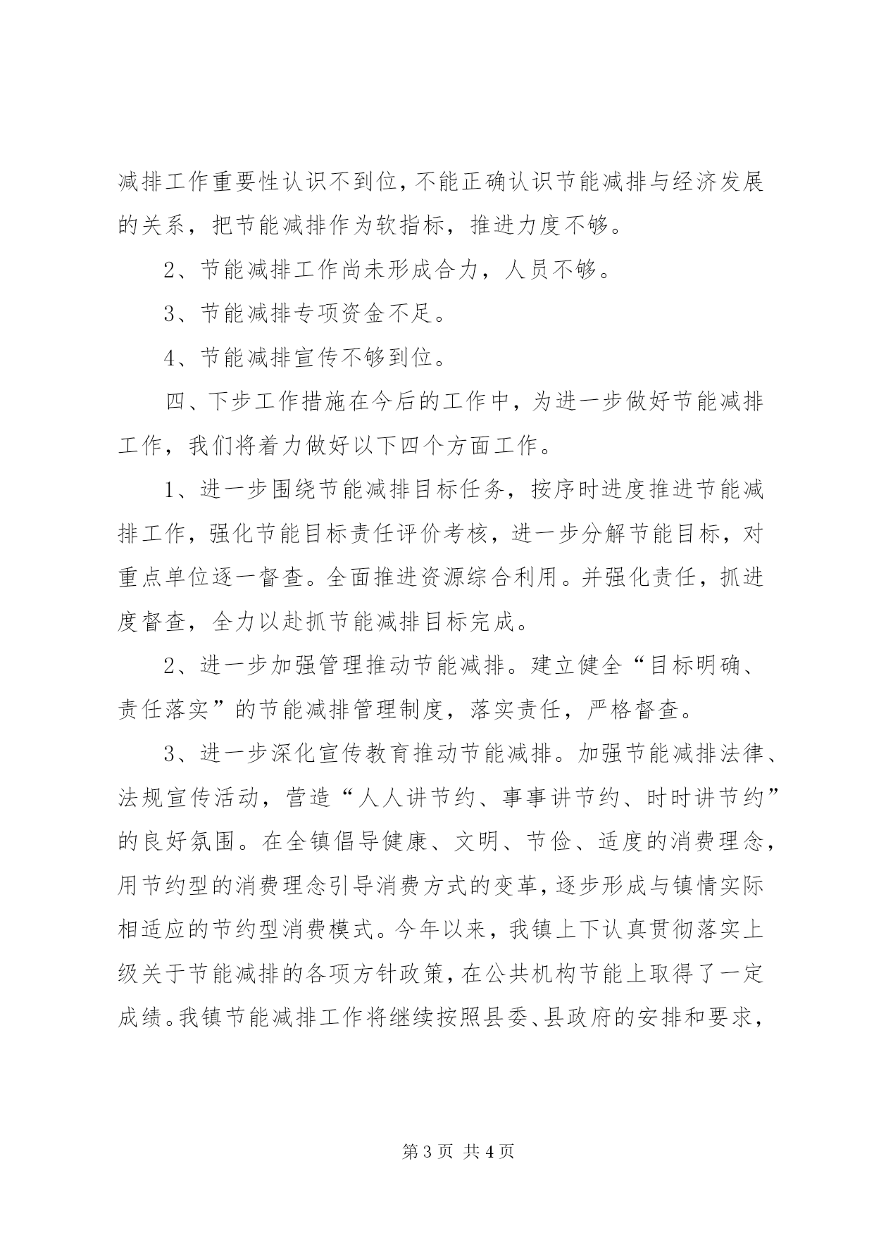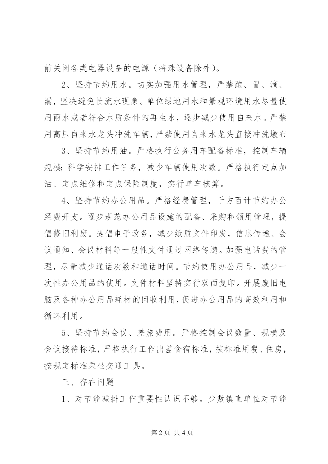 第PAGE\*Arabic\*MERGEFORMAT4页共NUMPAGES\*MERGEFORMAT4页镇公共机构节能工作总结镇机关节能工作在县委、县政府XX县区公共机构节能工作领导小组的正确领导和指导下,坚持以科学发展观为指导,把公共机构节能工作作为一项重要工作,强化措施、狠抓落实,较好地完成了各项工作任务。现将我镇开展公共机构节能工作总结如下:一、领导重视,机构健全,责任明确为切实加强节能减排工作的管理和指导,我镇根据上级文件要求,及时成立了镇节能减排工作领导小组,镇长为组长,分管领导为副组长,各办、站、所负责人为成员,领导小组下设办公室,专门负责此项工作。我镇拨出节能降耗减排专项经费,从基础管理上将节能减排具体工作要求落实到实处,特别是在水、电和油消耗上把握好各个环节,做到节能减排。二、加大节能工作整治力度我镇召开了全镇机关节能工作会,对全镇节能减排工作作了安排和部署。在开展节能降耗过程中,我镇重点节能减排单位主要采取了以下几点措施:1、坚持节约用电。严格控制照明用电,做到人走灯灭;自然光照较好时,办公室一般不使用照明灯具;走廊、通道等照明需求较低的场所,尽量设定隔盏开灯,减少灯管数或安装自动控制开关。使用更换节能灯具,节约用电。在使用电脑、打印机、传真机、复印机等办公自动化设备时,尽量减少待机时间,下班前关闭各类电器设备的电源(特殊设备除外)。2、坚持节约用水。切实加强用水管理,严禁跑、冒、滴、漏,坚决避免长流水现象。单位绿地用水和景观环境用水尽量使用雨水或者符合水质条件的再生水,逐步减少使用自来水。严禁用高压自来水龙头冲洗车辆,严禁使用自来水龙头直接冲洗墩布3、坚持节约用油。严格执行公务用车配备标准,控制车辆规模;科学安排工作任务,减少车辆使用次数。严格执行定点加油、定点维修和定点保险制度,实行单车核算。4、坚持节约办公用品。严格经费管理,千方百计节约办公经费开支。逐步规范办公用品设施的配备、采购和领用管理,提倡修旧利废。提倡电子政务,减少纸质文件印发,信息传递、会议通知、会议材料等一般性文件通过网络传递。加强电话费的管理,尽量减少通话次数和通话时间。节约使用办公用品,减少一次性办公用品的使用。文件材料坚持实行双面复印。开展废旧电脑及各种办公用品耗材的回收利用,促进办公用品的高效利用和循环利用。5、坚持节约会议、差旅费用。严格控制会议数量、规模及会议接待标准,严格执行工作出差食宿标准,按标准用餐、住房,按规定标准乘坐交通工具。三、存在问题1、对节能减排工作重要性认识不够。少数镇直单位对节能减排工作重要性认识不到位,不能正确认识节能减排与经济发展的关系,把节能减排作为软指标,推进力度不够。2、节能减排工作尚未形成合力,人员不够。3、节能减排专项资金不足。4、节能减排宣传不够到位。四、下步工作措施在今后的工作中,为进一步做好节能减排工作,我们将着力做好以下四个方面工作。1、进一步围绕节能减排目标任务,按序时进度推进节能减排工作,强化节能目标责任评价考核,进一步分解节能目标,对重点单位逐一督查。全面推进资源综合利用。并强化责任,抓进度督查,全力以赴抓节能减排目标完成。2、进一步加强管理推动节能减排。建立健全“目标明确、责任落实”的节能减排管理制度,落实责任,严格督查。3、进一步深化宣传教育推动节能减排。加强节能减排法律、法规宣传活动,营造“人人讲节约、事事讲节约、时时讲节约”的良好氛围。在全镇倡导健康、文明、节俭、适度的消费理念,用节约型的消费理念引导消费方式的变革,逐步形成与镇情实际相适应的节约型消费模式。今年以来,我镇上下认真贯彻落实上级关于节能减排的各项方针政策,在公共机构节能上取得了一定成绩。我镇节能减排工作将继续按照县委、县政府的安排和要求,结合本辖镇节能减排工作一如继往地扎实向前推进。