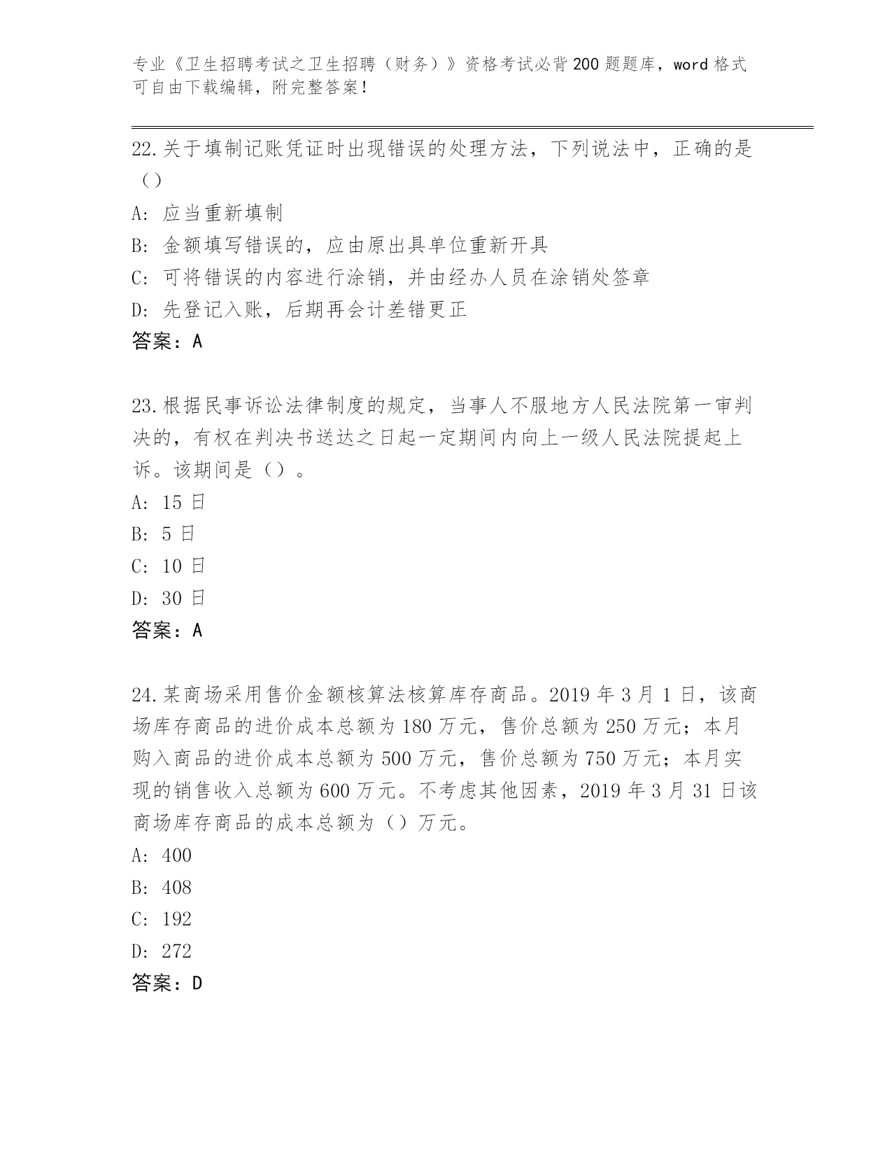 2024年江西省浔阳区《卫生招聘考试之卫生招聘(财务)》资格考试必背200题通关秘籍题库含答案【实用】