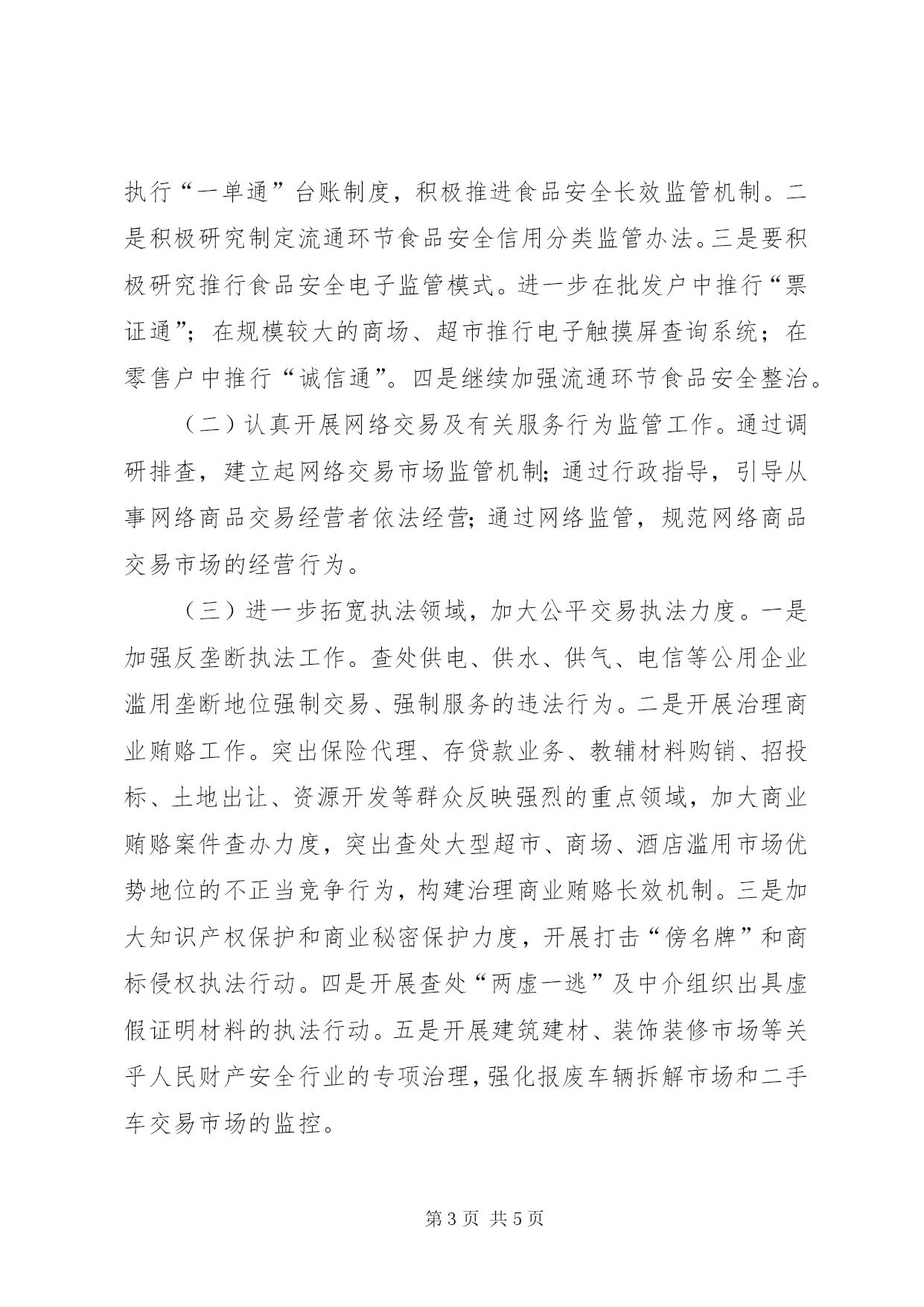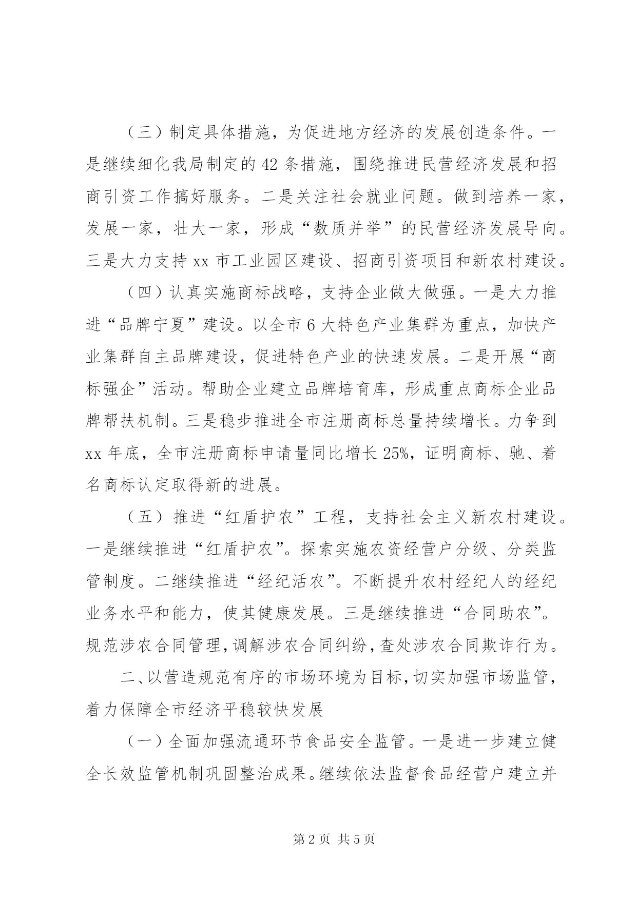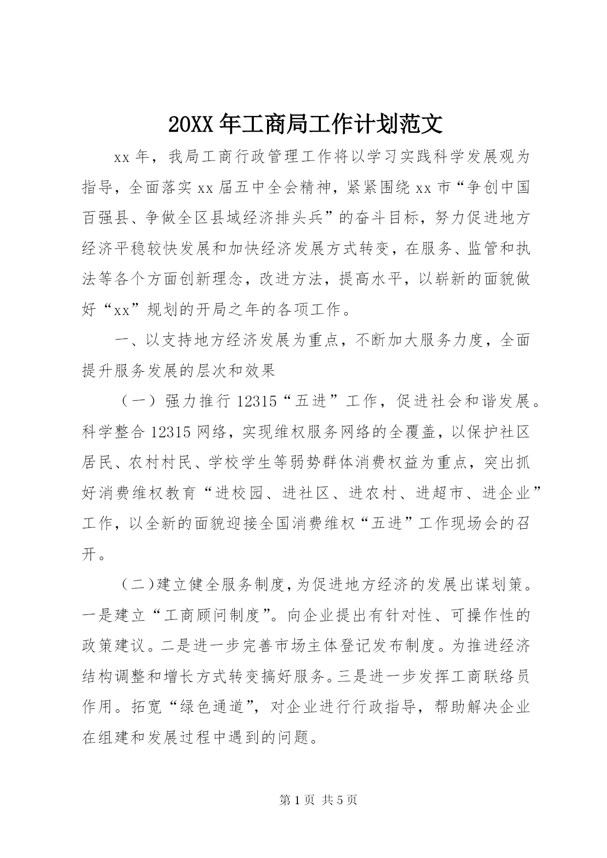 第PAGE\*Arabic\*MERGEFORMAT5页共NUMPAGES\*MERGEFORMAT5页20XX年工商局工作计划范文xx年,我局工商行政管理工作将以学习实践科学发展观为指导,全面落实xx届五中全会精神,紧紧围绕xx市“争创中国百强县、争做全区县域经济排头兵”的奋斗目标,努力促进地方经济平稳较快发展和加快经济发展方式转变,在服务、监管和执法等各个方面创新理念,改进方法,提高水平,以崭新的面貌做好“xx”规划的开局之年的各项工作。一、以支持地方经济发展为重点,不断加大服务力度,全面提升服务发展的层次和效果(一)强力推行12315“五进”工作,促进社会和谐发展。科学整合12315网络,实现维权服务网络的全覆盖,以保护社区居民、农村村民、学校学生等弱势群体消费权益为重点,突出抓好消费维权教育“进校园、进社区、进农村、进超市、进企业”工作,以全新的面貌迎接全国消费维权“五进”工作现场会的召开。(二)建立健全服务制度,为促进地方经济的发展出谋划策。一是建立“工商顾问制度”。向企业提出有针对性、可操作性的政策建议。二是进一步完善市场主体登记发布制度。为推进经济结构调整和增长方式转变搞好服务。三是进一步发挥工商联络员作用。拓宽“绿色通道”,对企业进行行政指导,帮助解决企业在组建和发展过程中遇到的问题。(三)制定具体措施,为促进地方经济的发展创造条件。一是继续细化我局制定的42条措施,围绕推进民营经济发展和招商引资工作搞好服务。二是关注社会就业问题。做到培养一家,发展一家,壮大一家,形成“数质并举”的民营经济发展导向。三是大力支持xx市工业园区建设、招商引资项目和新农村建设。(四)认真实施商标战略,支持企业做大做强。一是大力推进“品牌宁夏”建设。以全市6大特色产业集群为重点,加快产业集群自主品牌建设,促进特色产业的快速发展。二是开展“商标强企”活动。帮助企业建立品牌培育库,形成重点商标企业品牌帮扶机制。三是稳步推进全市注册商标总量持续增长。力争到xx年底,全市注册商标申请量同比增长25%,证明商标、驰、着名商标认定取得新的进展。(五)推进“红盾护农”工程,支持社会主义新农村建设。一是继续推进“红盾护农”。探索实施农资经营户分级、分类监管制度。二继续推进“经纪活农”。不断提升农村经纪人的经纪业务水平和能力,使其健康发展。三是继续推进“合同助农”。规范涉农合同管理,调解涉农合同纠纷,查处涉农合同欺诈行为。二、以营造规范有序的市场环境为目标,切实加强市场监管,着力保障全市经济平稳较快发展(一)全面加强流通环节食品安全监管。一是进一步建立健全长效监管机制巩固整治成果。继续依法监督食品经营户建立并执行“一单通”台账制度,积极推进食品安全长效监管机制。二是积极研究制定流通环节食品安全信用分类监管办法。三是要积极研究推行食品安全电子监管模式。进一步在批发户中推行“票证通”;在规模较大的商场、超市推行电子触摸屏查询系统;在零售户中推行“诚信通”。四是继续加强流通环节食品安全整治。(二)认真开展网络交易及有关服务行为监管工作。通过调研排查,建立起网络交易市场监管机制;通过行政指导,引导从事网络商品交易经营者依法经营;通过网络监管,规范网络商品交易市场的经营行为。(三)进一步拓宽执法领域,加大公平交易执法力度。一是加强反垄断执法工作。查处供电、供水、供气、电信等公用企业滥用垄断地位强制交易、强制服务的违法行为。二是开展治理商业贿赂工作。突出保险代理、存贷款业务、教辅材料购销、招投标、土地出让、资源开发等群众反映强烈的重点领域,加大商业贿赂案件查办力度,突出查处大型超市、商场、酒店滥用市场优势地位的不正当竞争行为,构建治理商业贿赂长效机制。三是加大知识产权保护和商业秘密保护力度,开展打击“傍名牌”和商标侵权执法行动。四是开展查处“两虚一逃”及中介组织出具虚假证明材料的执法行动。五是开展建筑建材、装饰装修市场等关乎人民财产安全行业的专项治理,强化报废车辆拆解市场和二手车交易市场的监控。(四)充分发挥整治虚假违法广告联席会议作用,深入开展虚假违法广告专项整治。利用电脑监控设备,对全市的电视广告实施动态监控;积极探索研究网络广告监管模式,着力拓展广告监管领域;认真履行指导广告业发展的职能,尽快促成市政府出台加强广告管理的意见。(五)以推进商品交易市场信用分类监管工作为契机,创建文明市场。三、以“三个过硬”为目标,强化培训提高,提升队伍素质一是进一步加强党风廉政建设工作。以行风政风评议为抓手,深入开展效能建设和作风建设。进一步加强廉政教育。二是进一步提高党建工作水平。进一步加强政治思想教育工作,深入开展“两承诺三评议”活动,深化创先争优活动。三是进一步改进干部教育培训工作。严格落实“逢训必考”制度,切实改进培训方法,着力完善学习激励