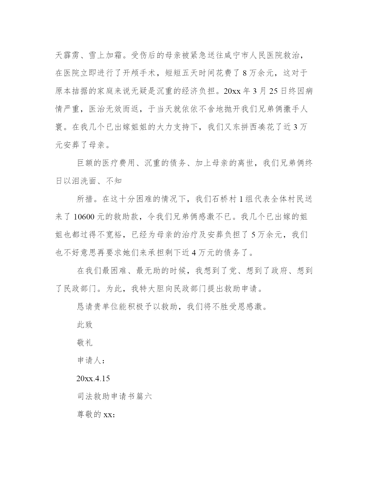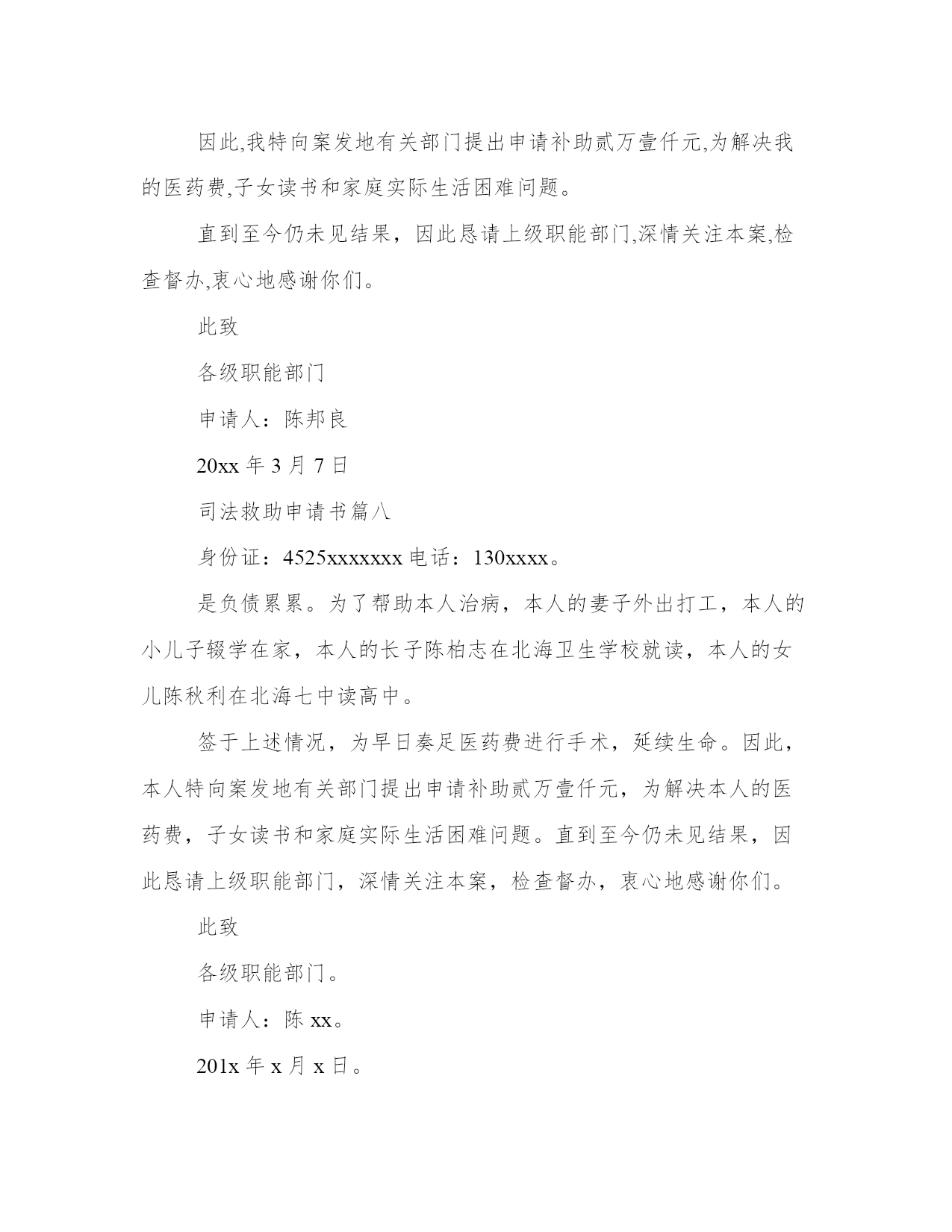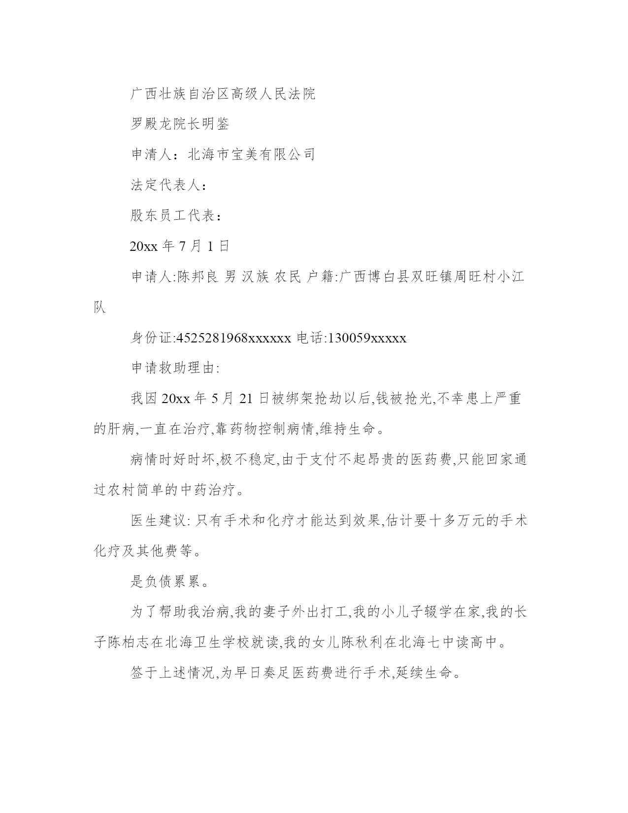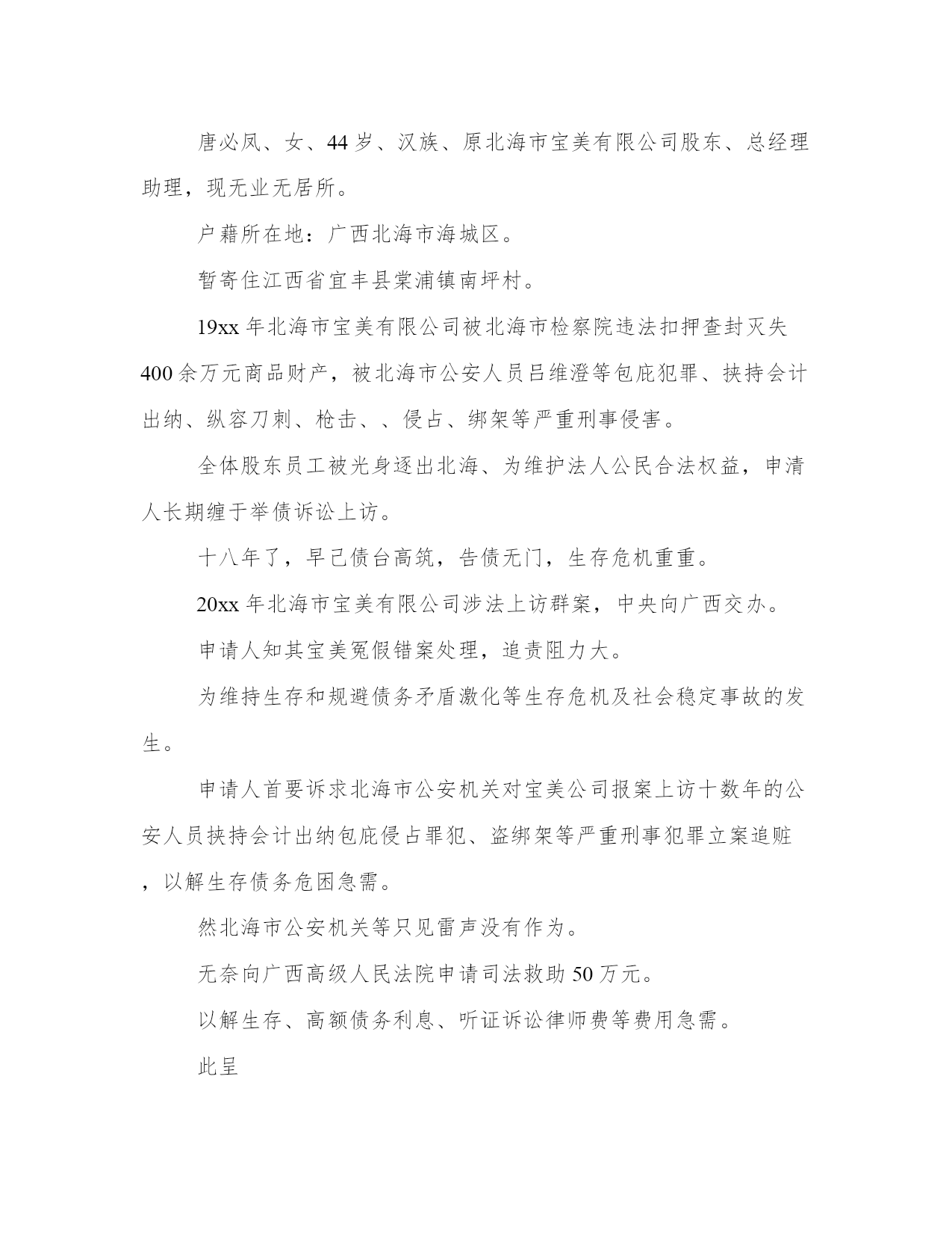 司法救助申请书(汇总10篇)在日常的学习、工作、生活中,肯定对各类范文都很熟悉吧。范文书写有哪些要求呢?我们怎样才能写好一篇范文呢?以下是小编为大家收集的优秀范文,欢迎大家分享阅读。司法救助申请书篇一理由:申请人已向贵院提起遗产继承诉讼,但是由于申请人目前属城市低保人员且生活非常困难,无力支付诉讼费用,特申请贵院依法提供司法救助,予以免交诉讼费用。请予准许为盼。此致xx区人民法院。20xx年x月x日。司法救助申请书篇二尊敬的***区人民法院:请求事项:免交诉讼费用。事实和理由:申请人已向贵院提起离婚诉讼,但是由于申请人被婆家暴力赶出家门,患病加没有生活来源,目前生活非常困难,无力支付诉讼费用,特申请贵院依法提供司法救助,予以免交诉讼费用。请予准许为盼。申请人:司法救助申请书篇三十三师党委政法委:基金是从机制体制上解决此类问题的有效途径。我院按照兵团分院要求,在借鉴他人经验,充分调研的基础上,向师党委政法委申请设立执行案件特困群体救助基金。农十三师中级人民法院。20xx年xx月xx日。司法救助申请书篇四73岁、汉族、原北海市宝美有限公司董事长,现无业无居所。户藉所在地:湖北省鄂洲市鄂城区。暂寄住祖藉:江西省宜丰县棠浦镇南坪村。唐必凤、女、44岁、汉族、原北海市宝美有限公司股东、总经理助理,现无业无居所。户藉所在地:广西北海市海城区。暂寄住江西省宜丰县棠浦镇南坪村。1994年北海市宝美有限公司被北海市检察院违法扣押查封灭失400余万元商品财产,被北海市公安人员吕维澄等包庇犯罪、挟持会计出纳、纵容刀刺、枪击、***、侵占、绑架等严重刑事侵害。全体股东员工被光身逐出北海、为维护法人公民合法权益,申清人长期缠于举债诉讼上访。十八年了,早己债台高筑,告债无门,生存危机重重。20xx年北海市宝美有限公司涉法上访群案,中央向广西交办。申请人知其宝美冤假错案处理,追责阻力大。为维持生存和规避债务矛盾激化等生存危机及社会稳定事故的发生。申请人首要诉求北海市公安机关对宝美公司报案上访十数年的公安人员挟持会计出纳包庇侵占罪犯、***盗绑架等严重刑事犯罪立案追赃,以解生存债务危困急需。然北海市公安机关等只见雷声没有作为。无奈向广西高级人民法院申请司法救助50万元。以解生存、高额债务利息、听证诉讼律师费等费用急需。此呈。广西壮族自治区高级人民法院。罗殿龙院长明鉴。申清人:北海市xx有限公司。法定代表人:股东员工代表:20xx年x月x日。司法救助申请书篇五尊敬的民政相关部门领导:我叫xx,现年25岁,是咸宁市咸安区大幕乡石桥村村1组村民。我家原有3口人,母亲、我和弟弟。由于我和弟弟目前都没有成家,一直以来,我们家都是靠勤劳的母亲操持内外,我和弟弟陈超过早辍学、没有文化,只能常年在外靠打工勉强养活自己。20xx年3月21日,作为一家之主的'母亲在参加我们1组合作劳动时不慎摔倒,导致后脑勺摔碎。这对于本来拮据的家庭来说犹如晴天霹雳、雪上加霜。受伤后的母亲被紧急送往咸宁市人民医院救治,在医院立即进行了开颅手术,短短五天时间花费了8万余元,这对于原本拮据的家庭来说无疑是沉重的经济负担。20xx年3月25日终因病情严重,医治无效而返,于当天就依依不舍地抛开我们兄弟俩撒手人寰。在我几个已出嫁姐姐的大力支持下,我们又东拼西凑花了近3万元安葬了母亲。巨额的医疗费用、沉重的债务、加上母亲的离世,我们兄弟俩终日以泪洗面、不知所措。在这十分困难的情况下,我们石桥村1组代表全体村民送来了10600元的救助款,令我们兄弟俩感激不已。我几个已出嫁的姐姐也都过得不宽裕,已经为母亲的治疗及安葬负担了5万余元,我们也不好意思再要求她们来承担剩下近4万元的债务了。在我们最困难、最无助的时候,我想到了党、想到了政府、想到了民政部门。为此,我特大胆向民政部门提出救助申请。恳请贵单位能积极予以救助,我们将不胜受恩感激。此致敬礼申请人:20xx.4.15司法救助申请书篇六尊敬的xx:申请人:陈xx男。身份证:4525xxxxxxx。电话:130xxxx。本人因20xx年5月21日被绑架抢劫以后,钱被抢光,不幸患上严重的肝病,一直在治疗,靠药物控制病情,维持生命。病情时好时坏,极不稳定,由于支付不起昂贵的医药费,只能回家通过农村简单的中药治疗。医生建议:只有手术和化疗才能达到效果,估计要十多万元的手术化疗及其他费等。这对于一个农村家庭来说无疑是一个天文数字,加之前,本人曾到北海市人民医院、北海市第二人民医院、广西医科大肿瘤医院、广西医科大第一附属医院检查治疗,花费了三万多元,所有亲朋好友的钱都借遍了,己是负债累累。为了帮助本人治病,本人的妻子外出打工,本人的小儿子辍学在家,本人的长子陈柏志在北海卫生学校就