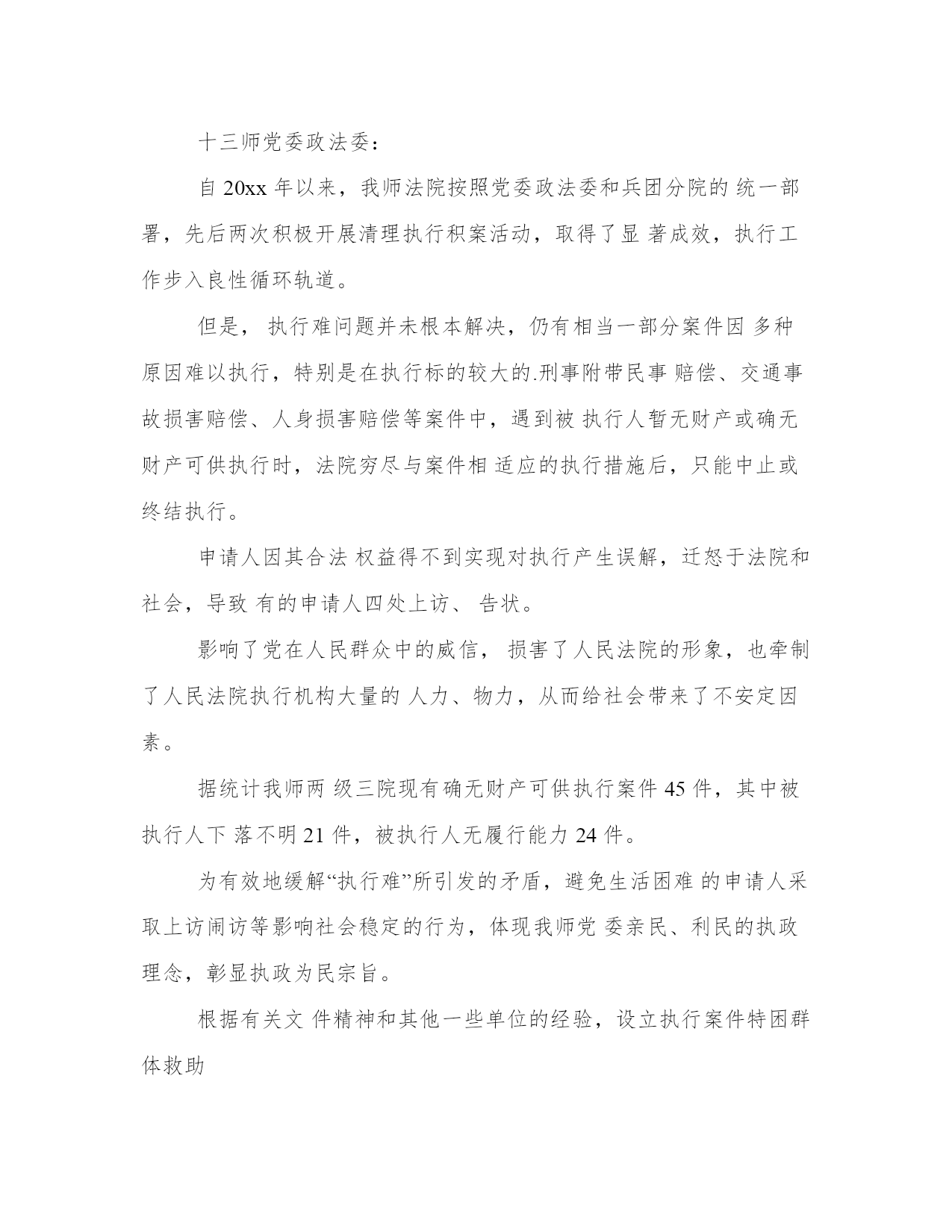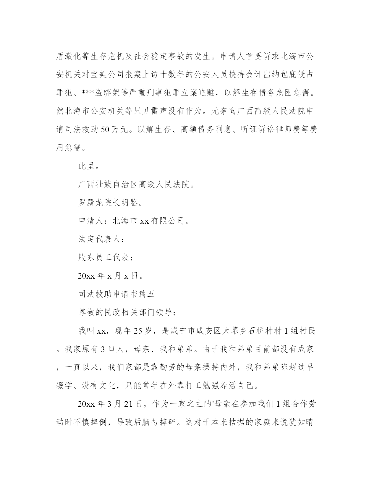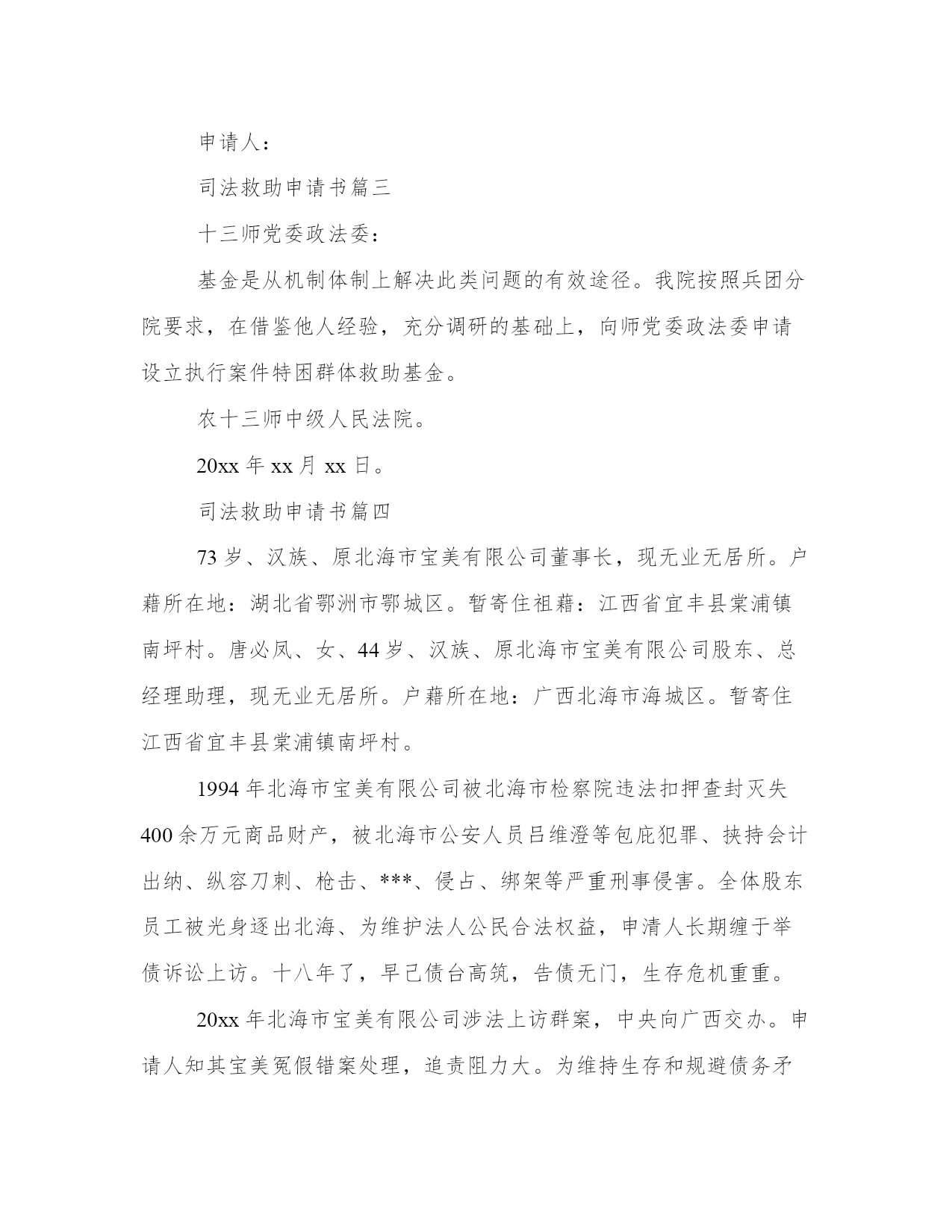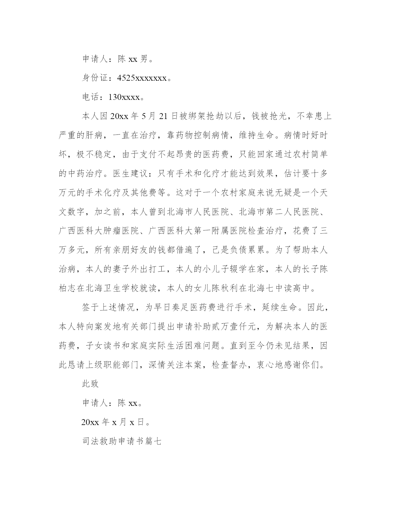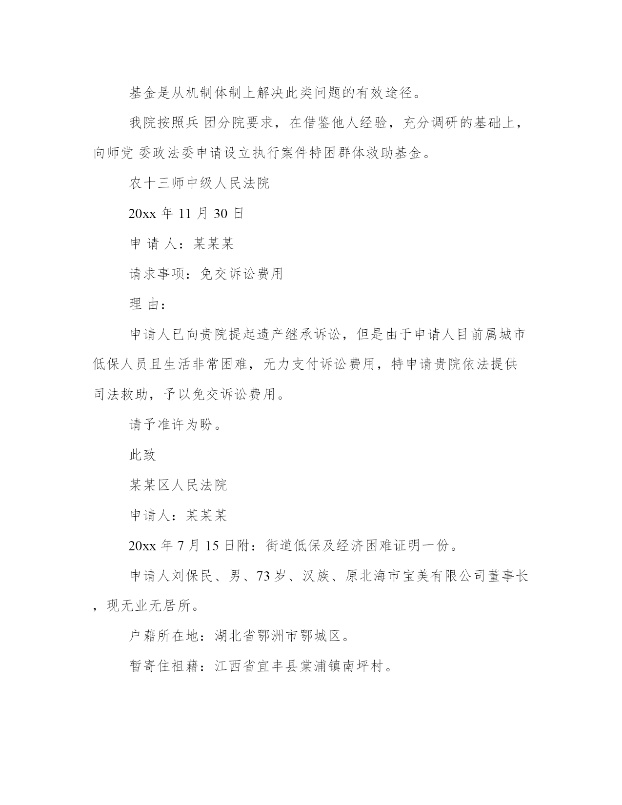 司法救助申请书(汇总10篇)在日常的学习、工作、生活中,肯定对各类范文都很熟悉吧。范文书写有哪些要求呢?我们怎样才能写好一篇范文呢?以下是小编为大家收集的优秀范文,欢迎大家分享阅读。司法救助申请书篇一理由:申请人已向贵院提起遗产继承诉讼,但是由于申请人目前属城市低保人员且生活非常困难,无力支付诉讼费用,特申请贵院依法提供司法救助,予以免交诉讼费用。请予准许为盼。此致xx区人民法院。20xx年x月x日。司法救助申请书篇二尊敬的***区人民法院:请求事项:免交诉讼费用。事实和理由:申请人已向贵院提起离婚诉讼,但是由于申请人被婆家暴力赶出家门,患病加没有生活来源,目前生活非常困难,无力支付诉讼费用,特申请贵院依法提供司法救助,予以免交诉讼费用。请予准许为盼。申请人:司法救助申请书篇三十三师党委政法委:基金是从机制体制上解决此类问题的有效途径。我院按照兵团分院要求,在借鉴他人经验,充分调研的基础上,向师党委政法委申请设立执行案件特困群体救助基金。农十三师中级人民法院。20xx年xx月xx日。司法救助申请书篇四73岁、汉族、原北海市宝美有限公司董事长,现无业无居所。户藉所在地:湖北省鄂洲市鄂城区。暂寄住祖藉:江西省宜丰县棠浦镇南坪村。唐必凤、女、44岁、汉族、原北海市宝美有限公司股东、总经理助理,现无业无居所。户藉所在地:广西北海市海城区。暂寄住江西省宜丰县棠浦镇南坪村。1994年北海市宝美有限公司被北海市检察院违法扣押查封灭失400余万元商品财产,被北海市公安人员吕维澄等包庇犯罪、挟持会计出纳、纵容刀刺、枪击、***、侵占、绑架等严重刑事侵害。全体股东员工被光身逐出北海、为维护法人公民合法权益,申清人长期缠于举债诉讼上访。十八年了,早己债台高筑,告债无门,生存危机重重。20xx年北海市宝美有限公司涉法上访群案,中央向广西交办。申请人知其宝美冤假错案处理,追责阻力大。为维持生存和规避债务矛盾激化等生存危机及社会稳定事故的发生。申请人首要诉求北海市公安机关对宝美公司报案上访十数年的公安人员挟持会计出纳包庇侵占罪犯、***盗绑架等严重刑事犯罪立案追赃,以解生存债务危困急需。然北海市公安机关等只见雷声没有作为。无奈向广西高级人民法院申请司法救助50万元。以解生存、高额债务利息、听证诉讼律师费等费用急需。此呈。广西壮族自治区高级人民法院。罗殿龙院长明鉴。申清人:北海市xx有限公司。法定代表人:股东员工代表:20xx年x月x日。司法救助申请书篇五尊敬的民政相关部门领导:我叫xx,现年25岁,是咸宁市咸安区大幕乡石桥村村1组村民。我家原有3口人,母亲、我和弟弟。由于我和弟弟目前都没有成家,一直以来,我们家都是靠勤劳的母亲操持内外,我和弟弟陈超过早辍学、没有文化,只能常年在外靠打工勉强养活自己。20xx年3月21日,作为一家之主的'母亲在参加我们1组合作劳动时不慎摔倒,导致后脑勺摔碎。这对于本来拮据的家庭来说犹如晴天霹雳、雪上加霜。受伤后的母亲被紧急送往咸宁市人民医院救治,在医院立即进行了开颅手术,短短五天时间花费了8万余元,这对于原本拮据的家庭来说无疑是沉重的经济负担。20xx年3月25日终因病情严重,医治无效而返,于当天就依依不舍地抛开我们兄弟俩撒手人寰。在我几个已出嫁姐姐的大力支持下,我们又东拼西凑花了近3万元安葬了母亲。巨额的医疗费用、沉重的债务、加上母亲的离世,我们兄弟俩终日以泪洗面、不知所措。在这十分困难的情况下,我们石桥村1组代表全体村民送来了10600元的救助款,令我们兄弟俩感激不已。我几个已出嫁的姐姐也都过得不宽裕,已经为母亲的治疗及安葬负担了5万余元,我们也不好意思再要求她们来承担剩下近4万元的债务了。在我们最困难、最无助的时候,我想到了党、想到了政府、想到了民政部门。为此,我特大胆向民政部门提出救助申请。恳请贵单位能积极予以救助,我们将不胜受恩感激。此致敬礼申请人:20xx.4.15司法救助申请书篇六尊敬的xx:申请人:陈xx男。身份证:4525xxxxxxx。电话:130xxxx。本人因20xx年5月21日被绑架抢劫以后,钱被抢光,不幸患上严重的肝病,一直在治疗,靠药物控制病情,维持生命。病情时好时坏,极不稳定,由于支付不起昂贵的医药费,只能回家通过农村简单的中药治疗。医生建议:只有手术和化疗才能达到效果,估计要十多万元的手术化疗及其他费等。这对于一个农村家庭来说无疑是一个天文数字,加之前,本人曾到北海市人民医院、北海市第二人民医院、广西医科大肿瘤医院、广西医科大第一附属医院检查治疗,花费了三万多元,所有亲朋好友的钱都借遍了,己是负债累累。为了帮助本人治病,本人的妻子外出打工,本人的小儿子辍学在家,本人的长子陈柏志在北海卫生学校就