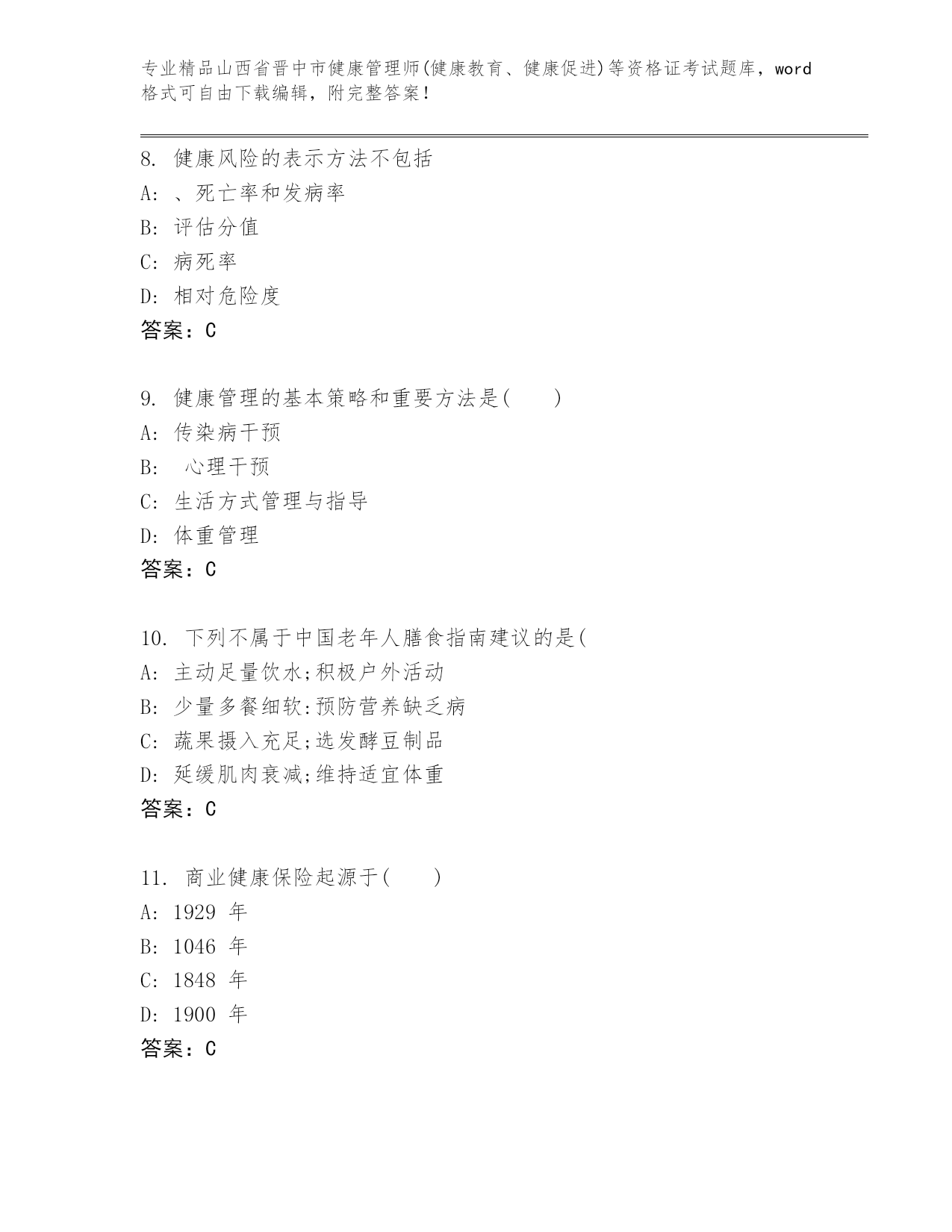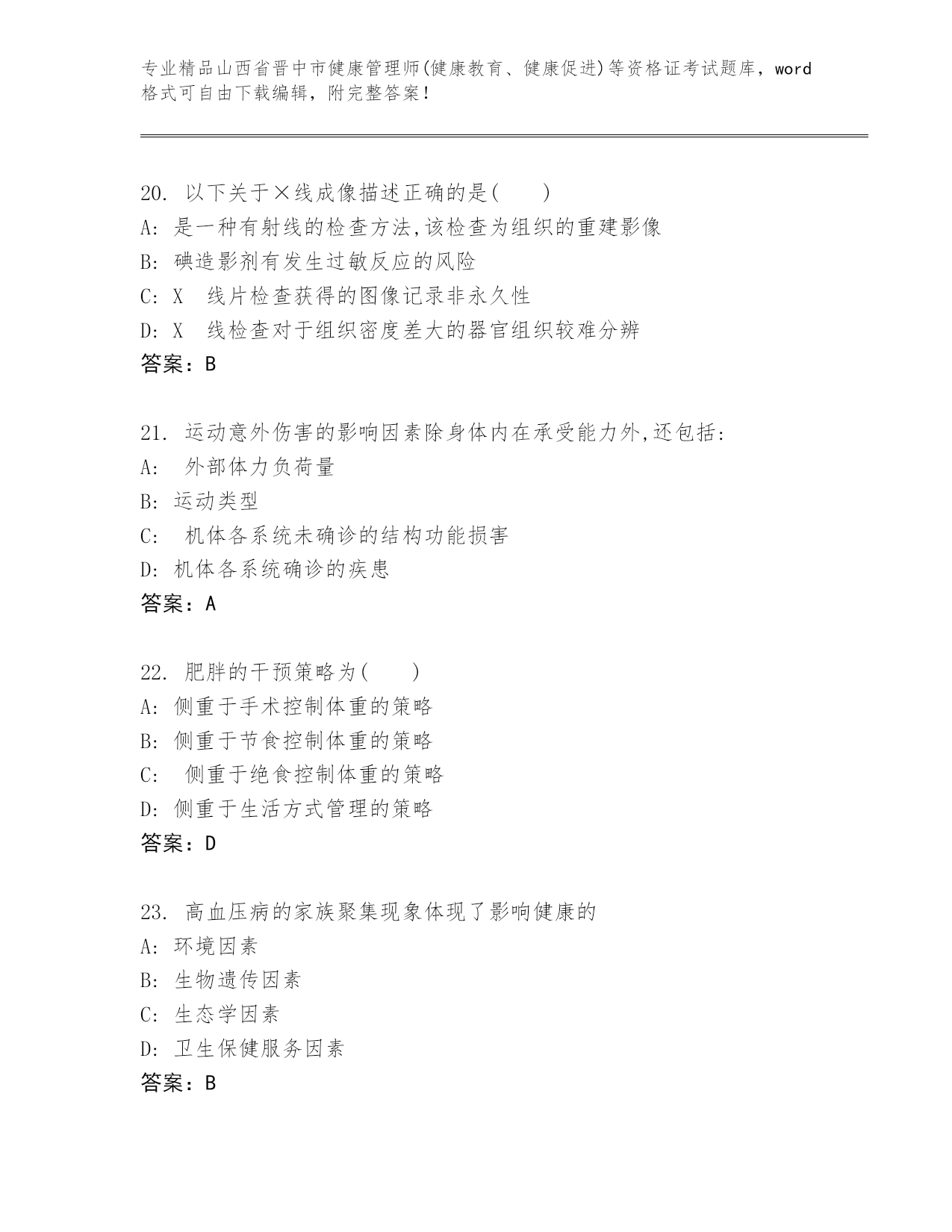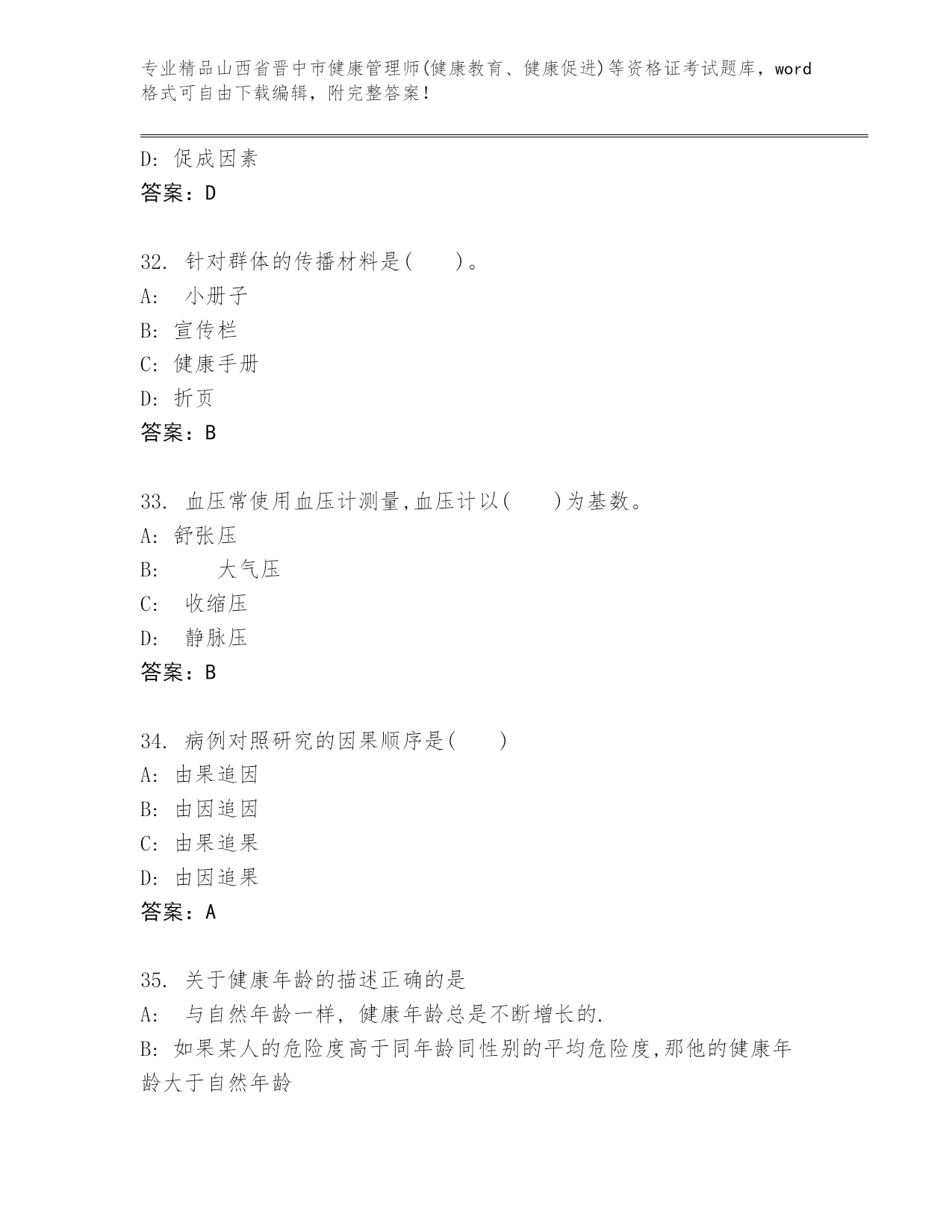 优选山西省晋中市健康管理师(健康教育、健康促进)等资格证考试内部题库及精品答案