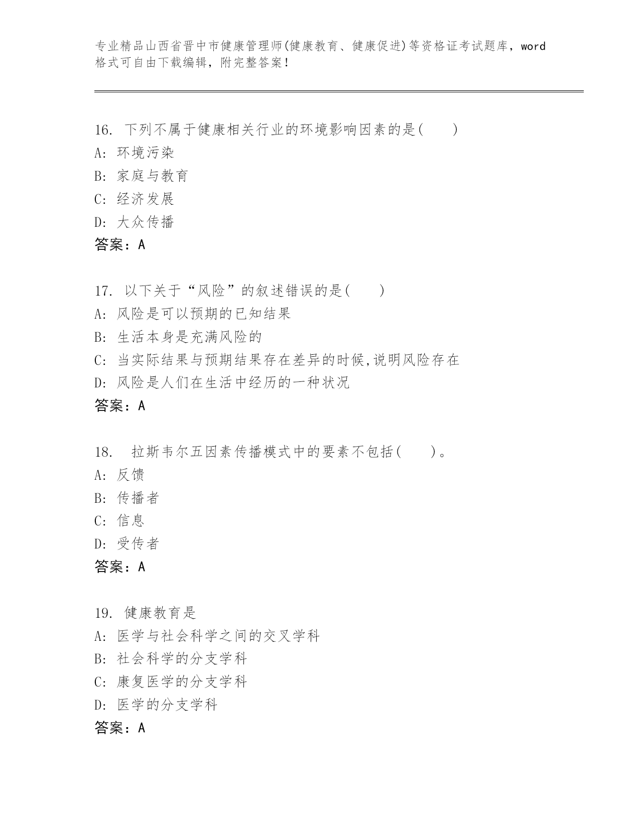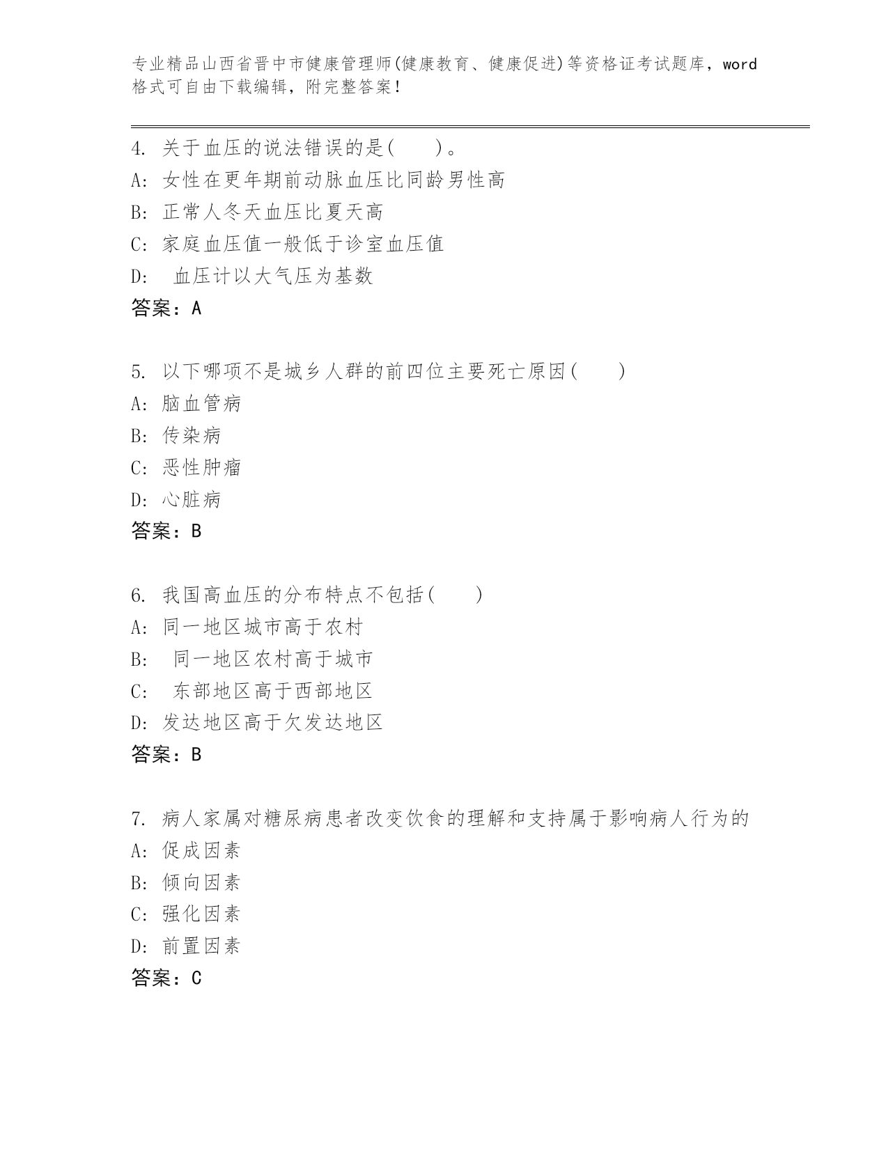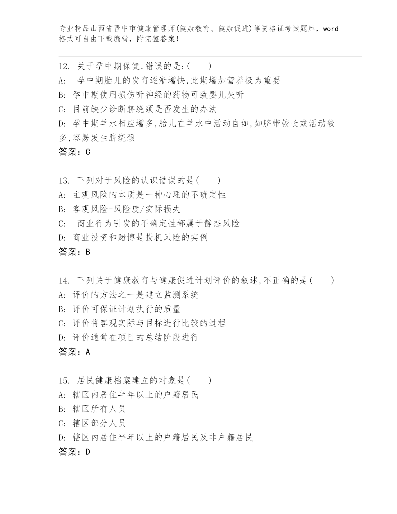 优选山西省晋中市健康管理师(健康教育、健康促进)等资格证考试内部题库及精品答案
