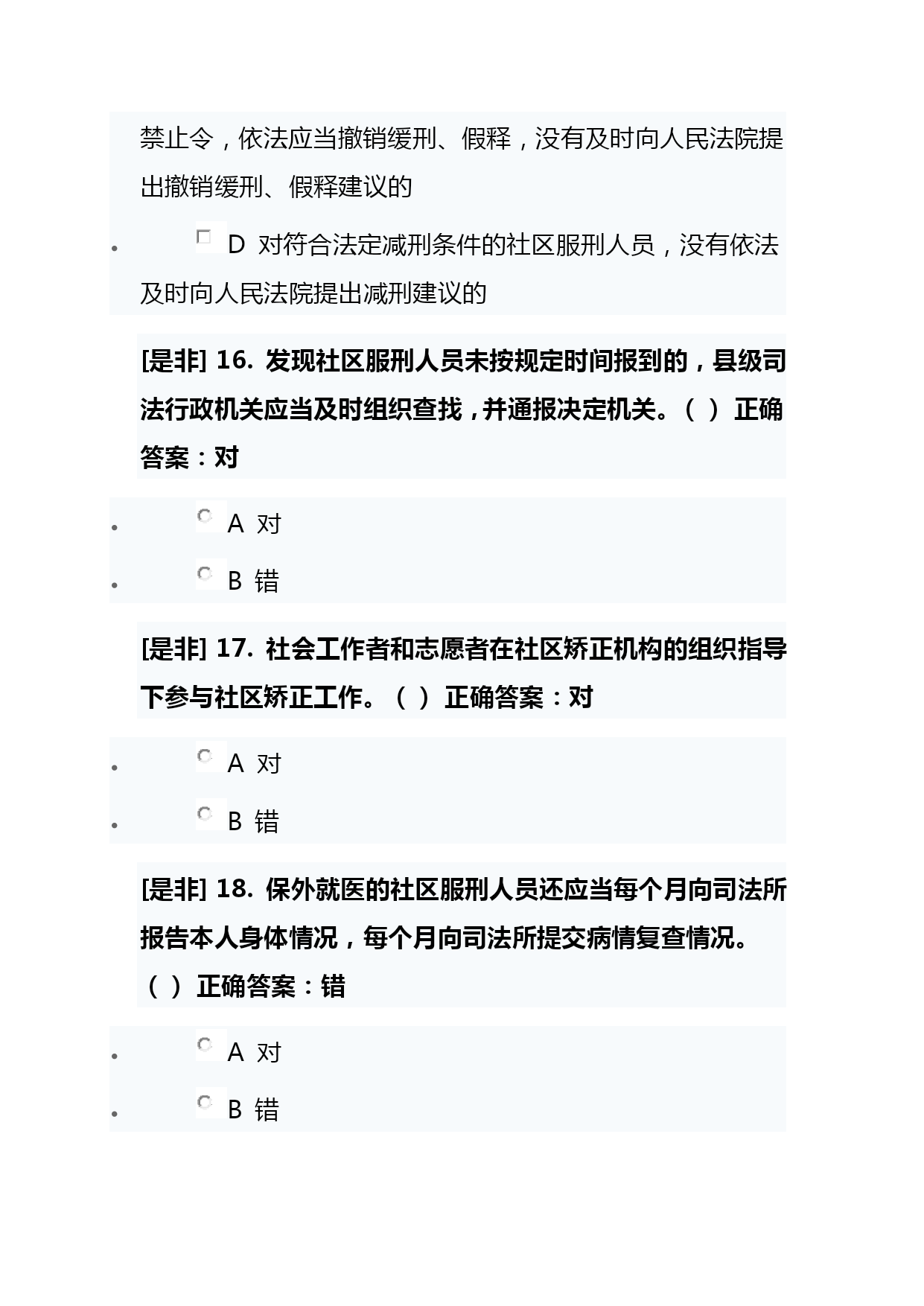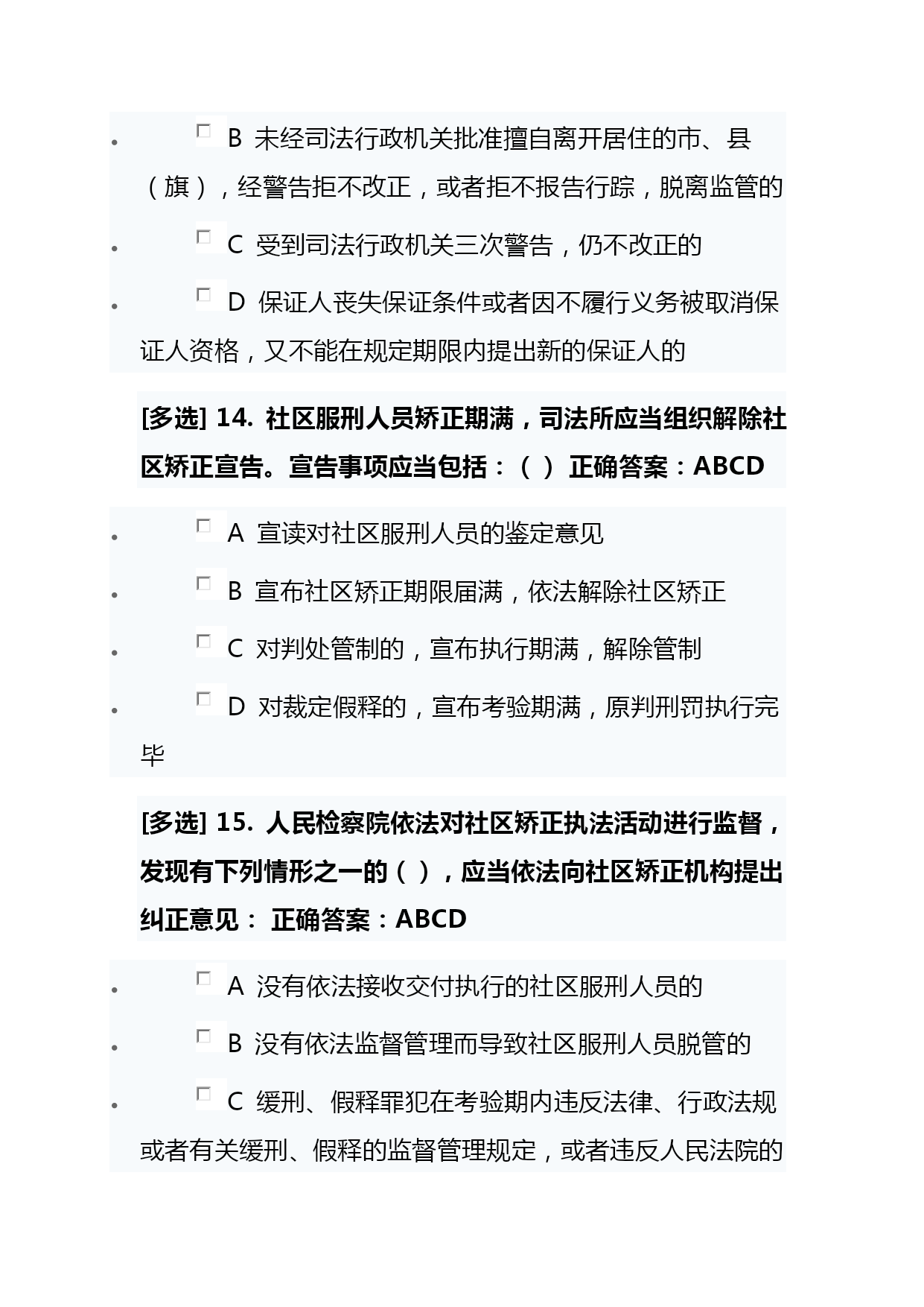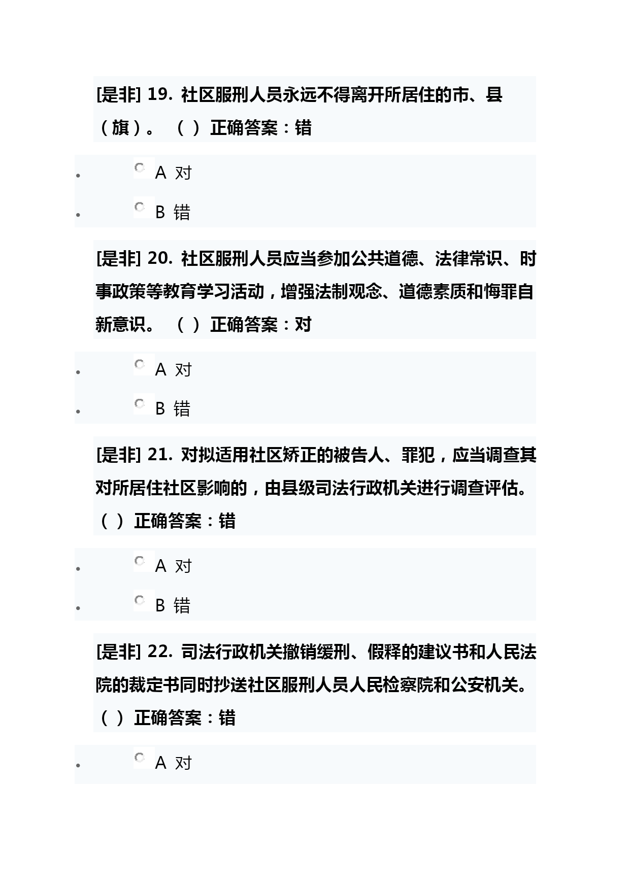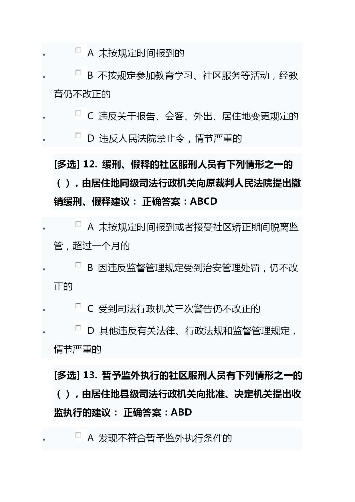 司法学习《社区矫正实施方法》测试答案(完整版)资料(可以直接使用,可编辑优秀版资料,欢迎下载)1.社区服刑人员应当自人民法院判决、裁定生效之日或者离开监所之日起()内到居住地县级司法行政机关报到。正确答案:CA三日B五日C十日D一个月内[单选]2.()负责指导管理、组织实施社区矫正工作。正确答案:AA司法行政机关B人民法院C人民检察院D公安机关[单选]3.罪犯需要回居住地暂予监外执行的,服刑地的省级监狱管理机关、公安机关监所管理部门()书面通知罪犯居住地的同级监狱管理机关、公安机关监所管理部门,指定一所监狱、看守所接收罪犯档案,负责办理罪犯收监、释放等手续。正确答案:BA可以B应当C必须D视情况而定[单选]4.对被判处管制、宣告缓刑的罪犯,()应当核实其居住地。正确答案:BA司法行政机关B人民法院C人民检察院D公安机关[单选]5.社区服刑人员确有悔改表现,且符合相关情形的,可以给与表扬,表扬以()为周期评定一次。正确答案:CA一个月B两个月C三个月D半年[单选]6.实施犯罪时不满十八周岁被判处()有期徒刑以下刑罚的社区服刑人员,适用未成年人社区矫正的有关规定。正确答案:CA两年B三年C五年D十年[单选]7.县级司法行政机关应当及时为社区服刑人员办理登记接收手续,并告知其()内到指定的司法所接受社区矫正。正确答案:BA两日B三日C五日D十日[单选]8.适用禁止令的社区服刑人员禁止令执行完毕,司法所应当组织公开宣告,并由县级司法行政机关通知()。正确答案:AA同级人民检察院B上级人民检察院C上级司法行政机关D公安机关[单选]9.社区矫正中的矫正小组成员包括:司法所工作人员、()、有关部门、村(居)民委员会、社区服刑人员所在单位、就读学校、家庭成员或者监护人、保证人等。正确答案:BA社会爱心人士B社会工作者和志愿者C慈善组织成员D社会团体[单选]10.社区矫正宣告由()主持,矫正小组成员及其他相关人员到场,按照规定程序进行正确答案:AA司法所工作人员B法院工作人员C社会工作者D检察院工作人员[多选]11.社区服刑人员有下列情形之一的(),县级司法行政机关应当给予警告,并出具书面决定:正确答案:ABCA未按规定时间报到的B不按规定参加教育学习、社区服务等活动,经教育仍不改正的C违反关于报告、会客、外出、居住地变更规定的D违反人民法院禁止令,情节严重的[多选]12.缓刑、假释的社区服刑人员有下列情形之一的(),由居住地同级司法行政机关向原裁判人民法院提出撤销缓刑、假释建议:正确答案:ABCDA未按规定时间报到或者接受社区矫正期间脱离监管,超过一个月的B因违反监督管理规定受到治安管理处罚,仍不改正的C受到司法行政机关三次警告仍不改正的D其他违反有关法律、行政法规和监督管理规定,情节严重的[多选]13.暂予监外执行的社区服刑人员有下列情形之一的(),由居住地县级司法行政机关向批准、决定机关提出收监执行的建议:正确答案:ABDA发现不符合暂予监外执行条件的B未经司法行政机关批准擅自离开居住的市、县(旗),经警告拒不改正,或者拒不报告行踪,脱离监管的C受到司法行政机关三次警告,仍不改正的D保证人丧失保证条件或者因不履行义务被取消保证人资格,又不能在规定期限内提出新的保证人的[多选]14.社区服刑人员矫正期满,司法所应当组织解除社区矫正宣告。宣告事项应当包括:()正确答案:ABCDA宣读对社区服刑人员的鉴定意见B宣布社区矫正期限届满,依法解除社区矫正C对判处管制的,宣布执行期满,解除管制D对裁定假释的,宣布考验期满,原判刑罚执行完毕[多选]15.人民检察院依法对社区矫正执法活动进行监督,发现有下列情形之一的(),应当依法向社区矫正机构提出纠正意见:正确答案:ABCDA没有依法接收交付执行的社区服刑人员的B没有依法监督管理而导致社区服刑人员脱管的C缓刑、假释罪犯在考验期内违反法律、行政法规或者有关缓刑、假释的监督管理规定,或者违反人民法院的禁止令,依法应当撤销缓刑、假释,没有及时向人民法院提出撤销缓刑、假释建议的D对符合法定减刑条件的社区服刑人员,没有依法及时向人民法院提出减刑建议的[是非]16.发现社区服刑人员未按规定时间报到的,县级司法行政机关应当及时组织查找,并通报决定机关。()正确答案:对A对B错[是非]17.社会工作者和志愿者在社区矫正机构的组织指导下参与社区矫正工作。()正确答案:对A对B错[是非]18.保外就医的社区服刑人员还应当每个月向司法所报告本人身体情况,每个月向司法所提交病情复查情况。()正确答案:错A对B错[是非]19.社区服刑人员永远不