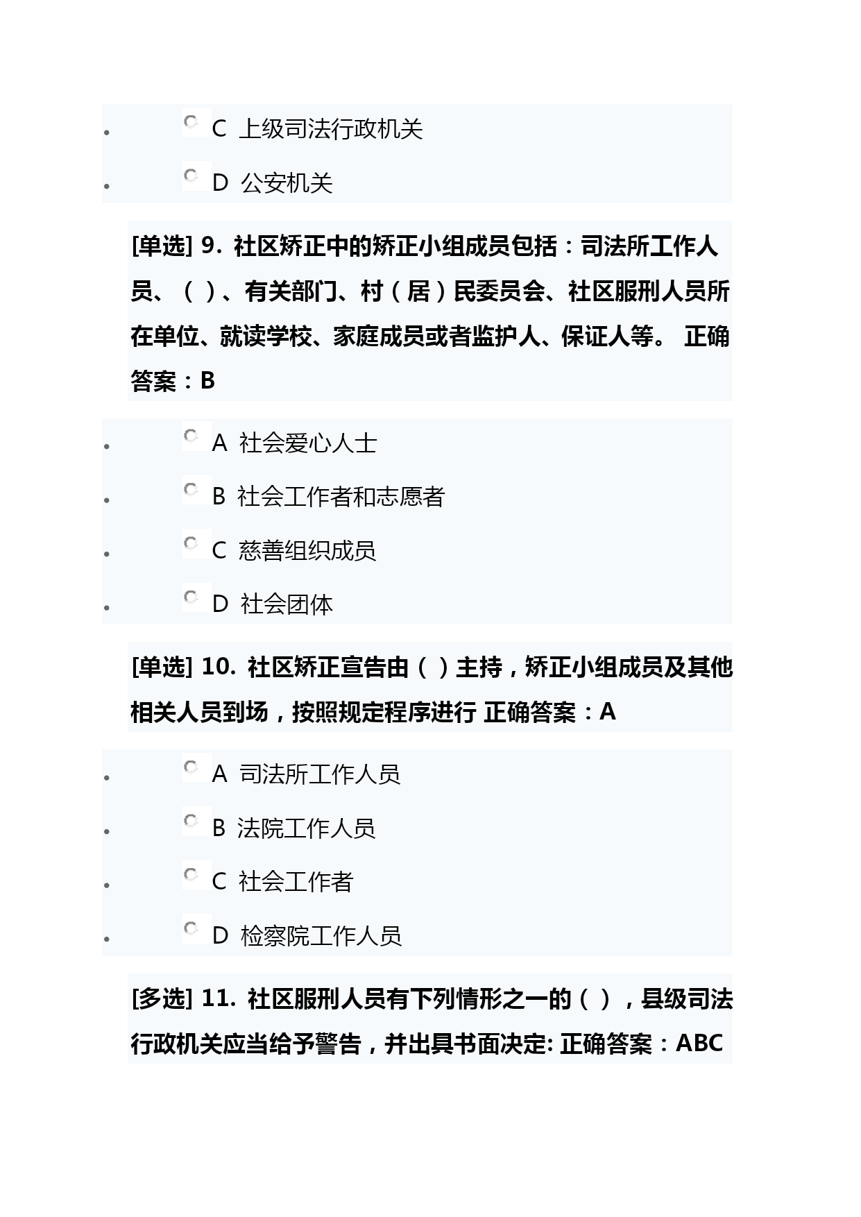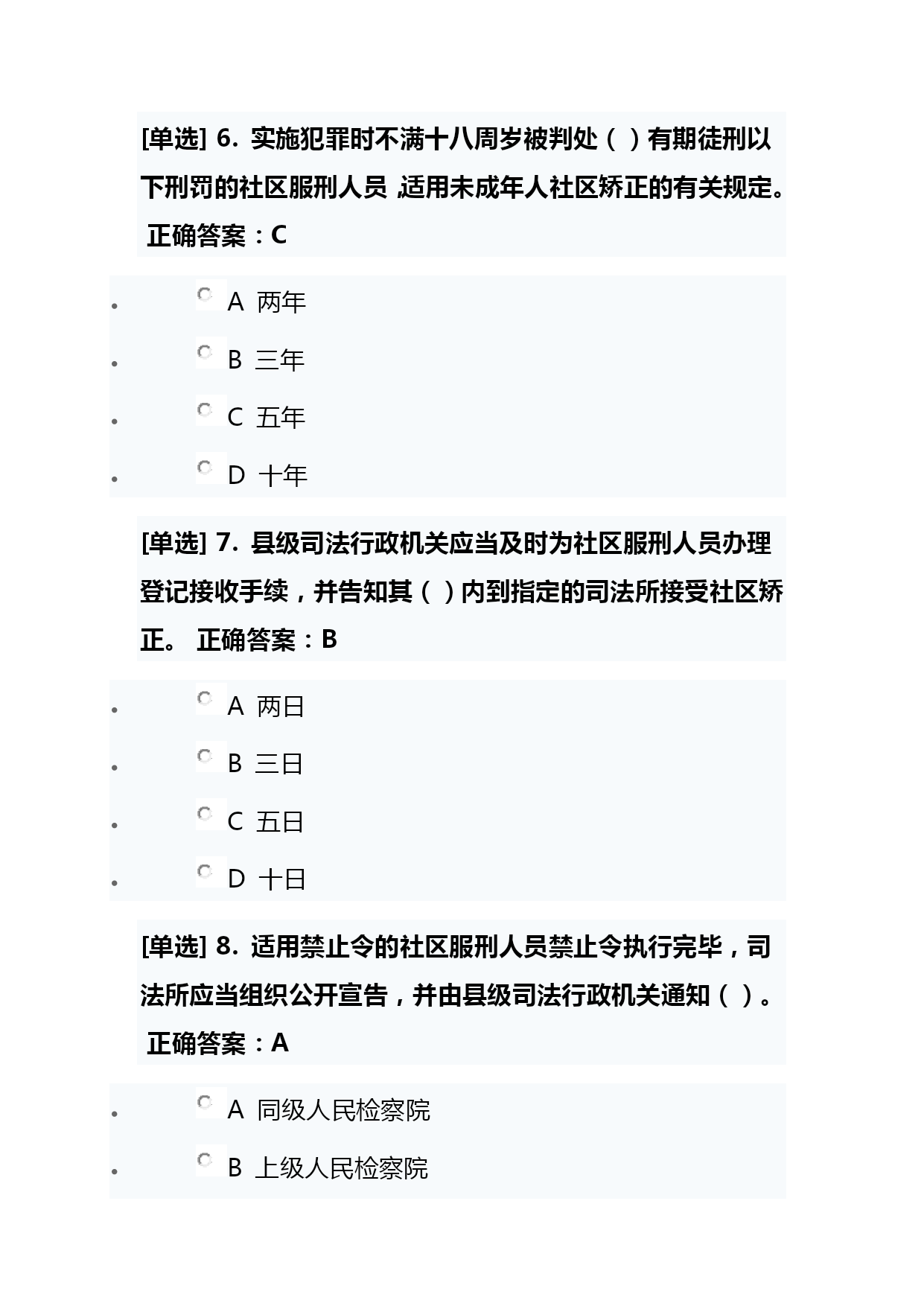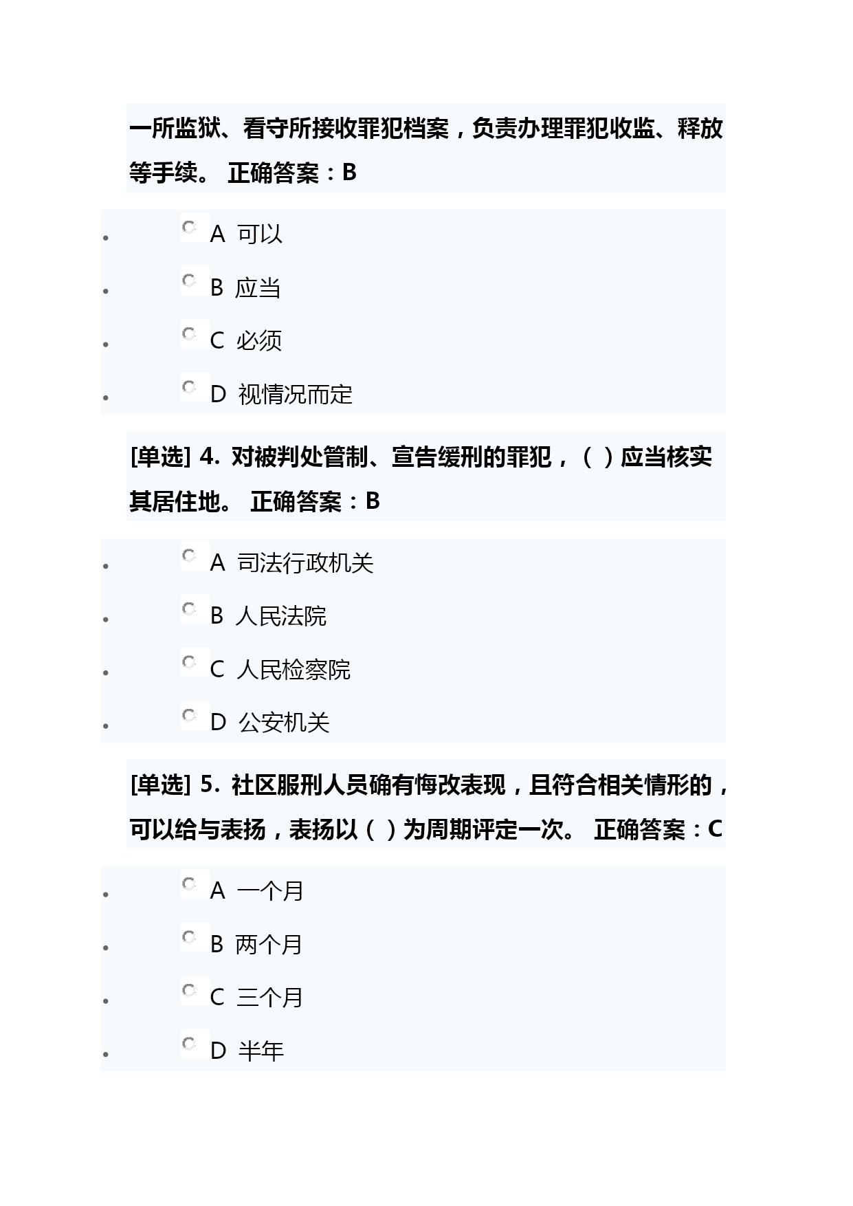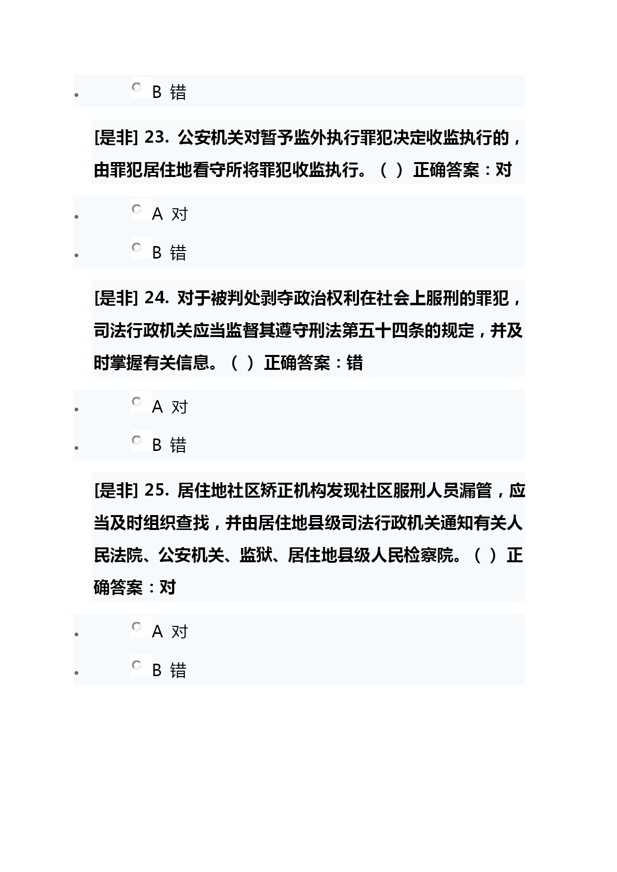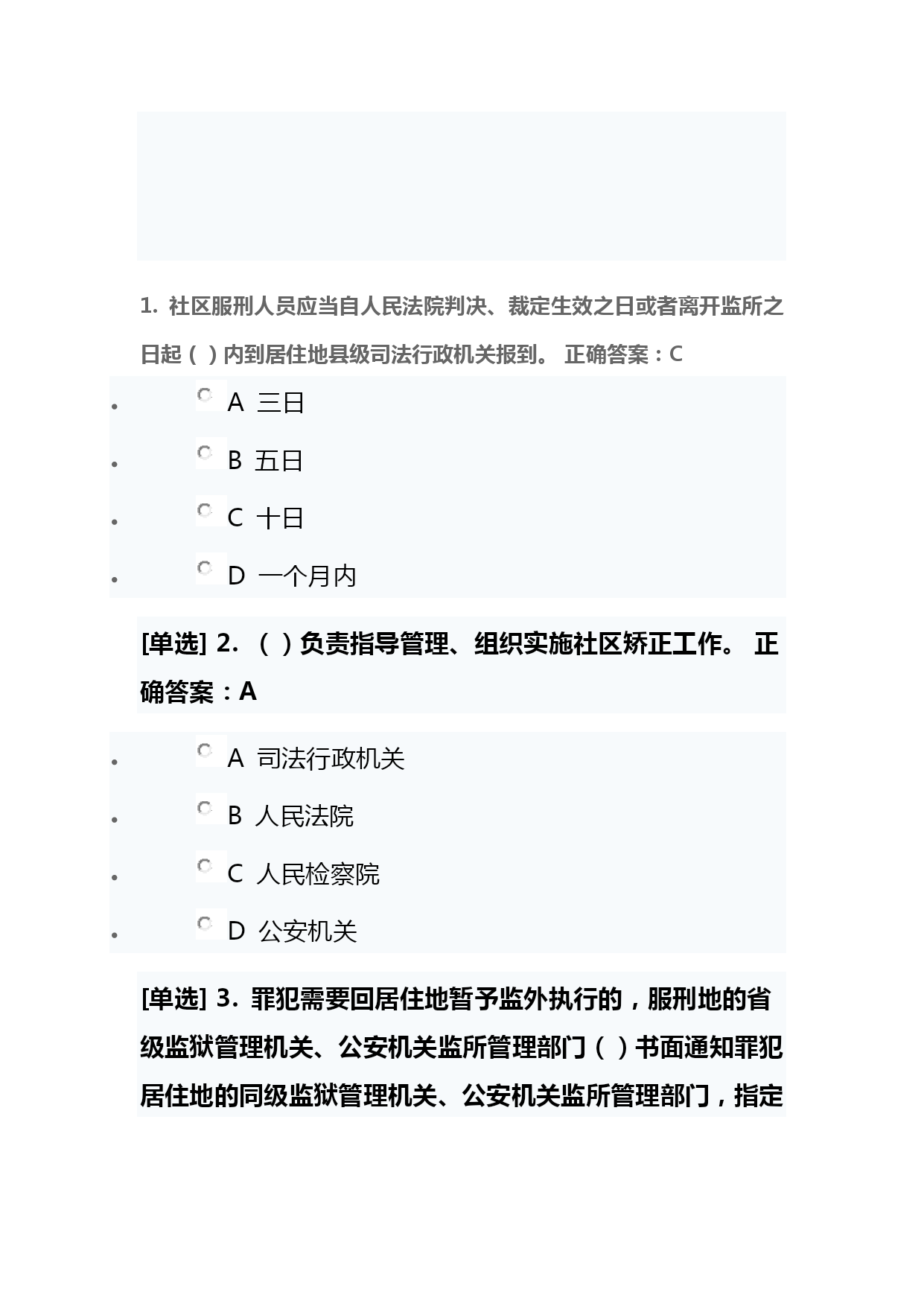 司法学习《社区矫正实施方法》测试答案(完整版)资料(可以直接使用,可编辑优秀版资料,欢迎下载)1.社区服刑人员应当自人民法院判决、裁定生效之日或者离开监所之日起()内到居住地县级司法行政机关报到。正确答案:CA三日B五日C十日D一个月内[单选]2.()负责指导管理、组织实施社区矫正工作。正确答案:AA司法行政机关B人民法院C人民检察院D公安机关[单选]3.罪犯需要回居住地暂予监外执行的,服刑地的省级监狱管理机关、公安机关监所管理部门()书面通知罪犯居住地的同级监狱管理机关、公安机关监所管理部门,指定一所监狱、看守所接收罪犯档案,负责办理罪犯收监、释放等手续。正确答案:BA可以B应当C必须D视情况而定[单选]4.对被判处管制、宣告缓刑的罪犯,()应当核实其居住地。正确答案:BA司法行政机关B人民法院C人民检察院D公安机关[单选]5.社区服刑人员确有悔改表现,且符合相关情形的,可以给与表扬,表扬以()为周期评定一次。正确答案:CA一个月B两个月C三个月D半年[单选]6.实施犯罪时不满十八周岁被判处()有期徒刑以下刑罚的社区服刑人员,适用未成年人社区矫正的有关规定。正确答案:CA两年B三年C五年D十年[单选]7.县级司法行政机关应当及时为社区服刑人员办理登记接收手续,并告知其()内到指定的司法所接受社区矫正。正确答案:BA两日B三日C五日D十日[单选]8.适用禁止令的社区服刑人员禁止令执行完毕,司法所应当组织公开宣告,并由县级司法行政机关通知()。正确答案:AA同级人民检察院B上级人民检察院C上级司法行政机关D公安机关[单选]9.社区矫正中的矫正小组成员包括:司法所工作人员、()、有关部门、村(居)民委员会、社区服刑人员所在单位、就读学校、家庭成员或者监护人、保证人等。正确答案:BA社会爱心人士B社会工作者和志愿者C慈善组织成员D社会团体[单选]10.社区矫正宣告由()主持,矫正小组成员及其他相关人员到场,按照规定程序进行正确答案:AA司法所工作人员B法院工作人员C社会工作者D检察院工作人员[多选]11.社区服刑人员有下列情形之一的(),县级司法行政机关应当给予警告,并出具书面决定:正确答案:ABCA未按规定时间报到的B不按规定参加教育学习、社区服务等活动,经教育仍不改正的C违反关于报告、会客、外出、居住地变更规定的D违反人民法院禁止令,情节严重的[多选]12.缓刑、假释的社区服刑人员有下列情形之一的(),由居住地同级司法行政机关向原裁判人民法院提出撤销缓刑、假释建议:正确答案:ABCDA未按规定时间报到或者接受社区矫正期间脱离监管,超过一个月的B因违反监督管理规定受到治安管理处罚,仍不改正的C受到司法行政机关三次警告仍不改正的D其他违反有关法律、行政法规和监督管理规定,情节严重的[多选]13.暂予监外执行的社区服刑人员有下列情形之一的(),由居住地县级司法行政机关向批准、决定机关提出收监执行的建议:正确答案:ABDA发现不符合暂予监外执行条件的B未经司法行政机关批准擅自离开居住的市、县(旗),经警告拒不改正,或者拒不报告行踪,脱离监管的C受到司法行政机关三次警告,仍不改正的D保证人丧失保证条件或者因不履行义务被取消保证人资格,又不能在规定期限内提出新的保证人的[多选]14.社区服刑人员矫正期满,司法所应当组织解除社区矫正宣告。宣告事项应当包括:()正确答案:ABCDA宣读对社区服刑人员的鉴定意见B宣布社区矫正期限届满,依法解除社区矫正C对判处管制的,宣布执行期满,解除管制D对裁定假释的,宣布考验期满,原判刑罚执行完毕[多选]15.人民检察院依法对社区矫正执法活动进行监督,发现有下列情形之一的(),应当依法向社区矫正机构提出纠正意见:正确答案:ABCDA没有依法接收交付执行的社区服刑人员的B没有依法监督管理而导致社区服刑人员脱管的C缓刑、假释罪犯在考验期内违反法律、行政法规或者有关缓刑、假释的监督管理规定,或者违反人民法院的禁止令,依法应当撤销缓刑、假释,没有及时向人民法院提出撤销缓刑、假释建议的D对符合法定减刑条件的社区服刑人员,没有依法及时向人民法院提出减刑建议的[是非]16.发现社区服刑人员未按规定时间报到的,县级司法行政机关应当及时组织查找,并通报决定机关。()正确答案:对A对B错[是非]17.社会工作者和志愿者在社区矫正机构的组织指导下参与社区矫正工作。()正确答案:对A对B错[是非]18.保外就医的社区服刑人员还应当每个月向司法所报告本人身体情况,每个月向司法所提交病情复查情况。()正确答案:错A对B错[是非]19.社区服刑人员永远不