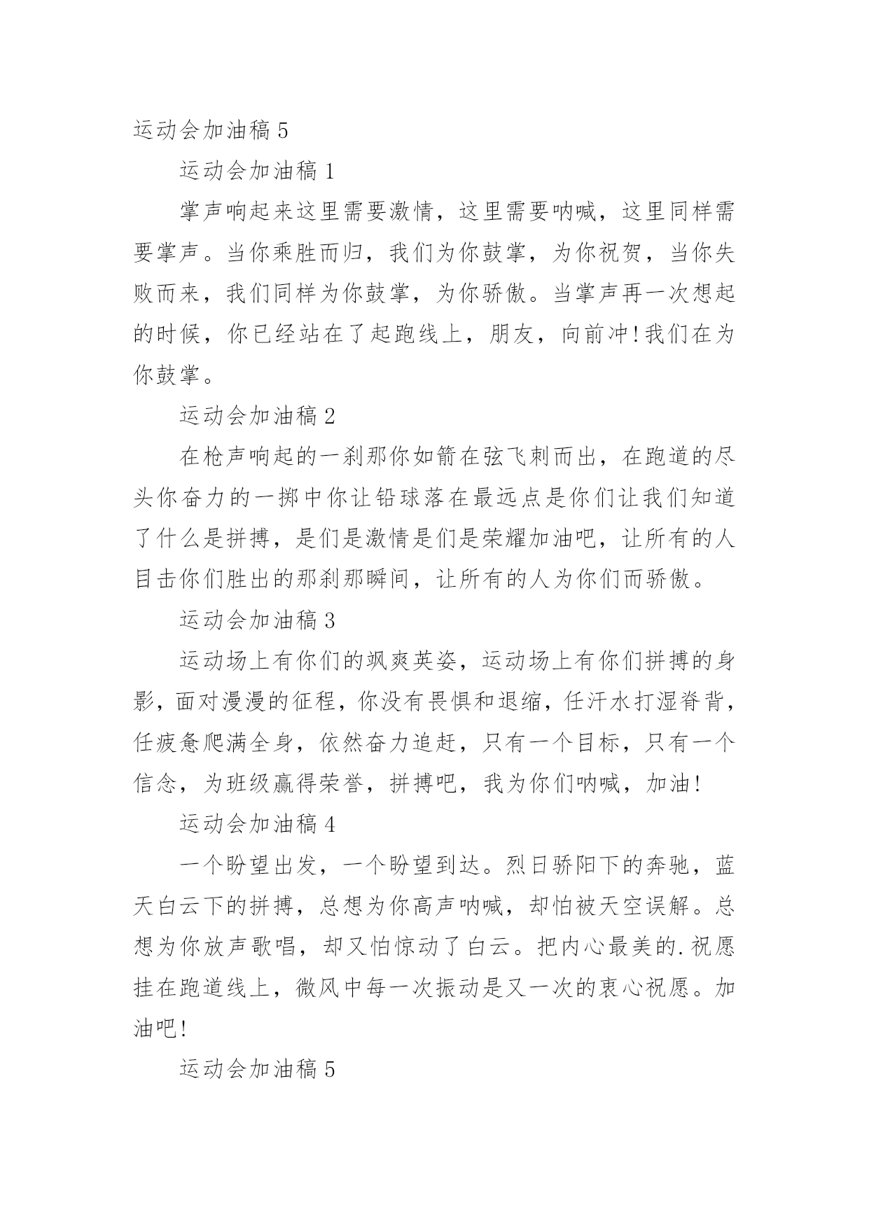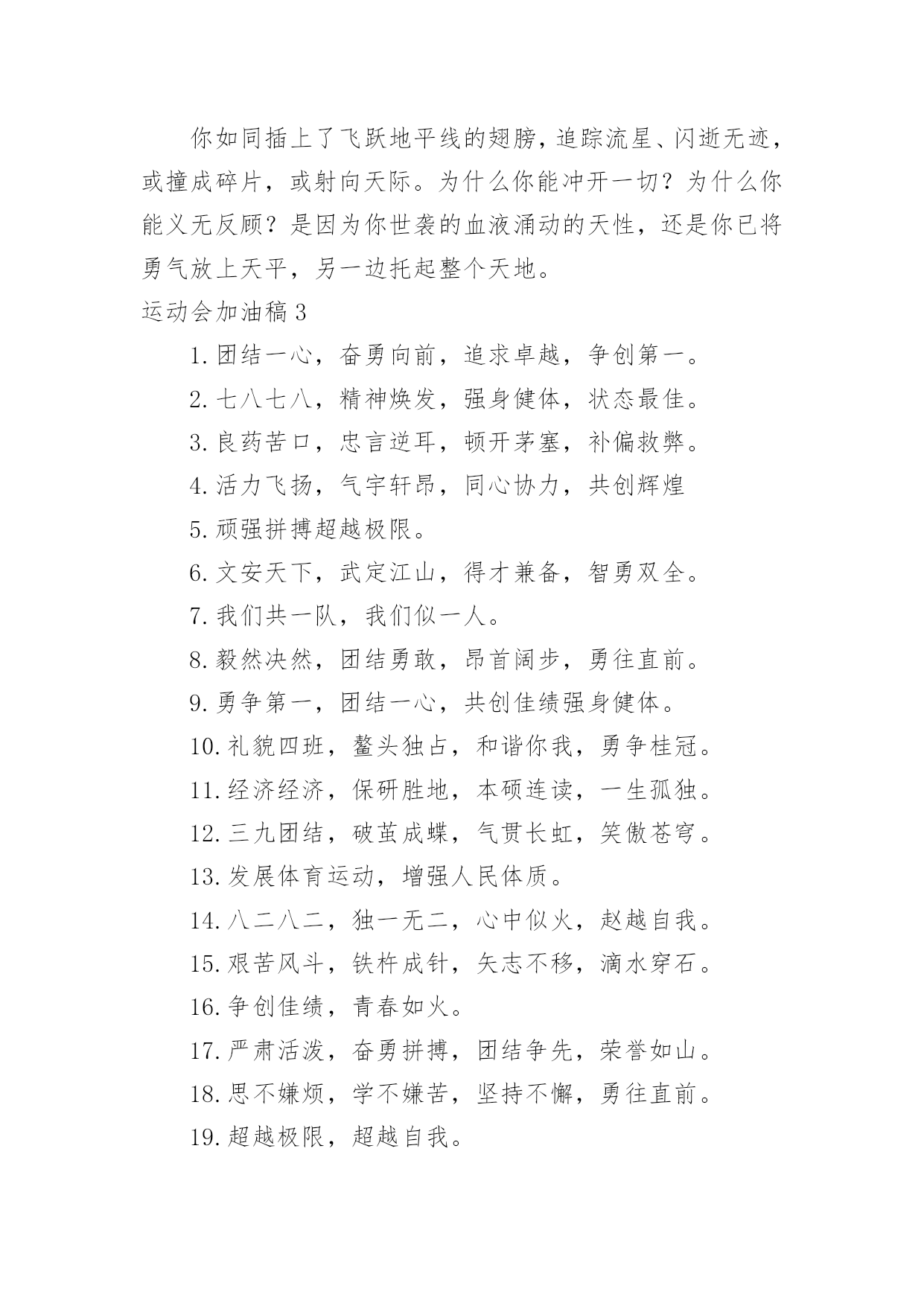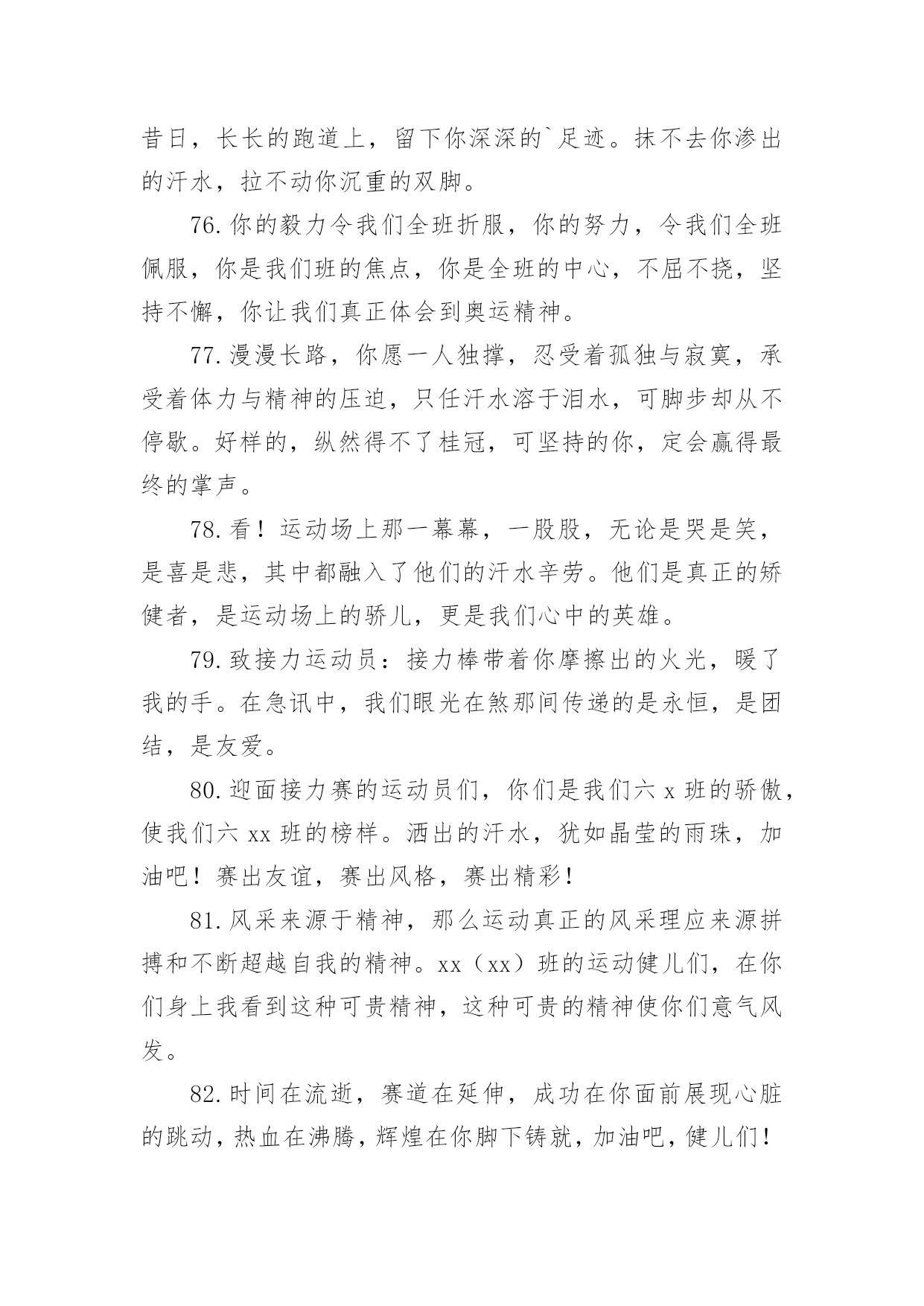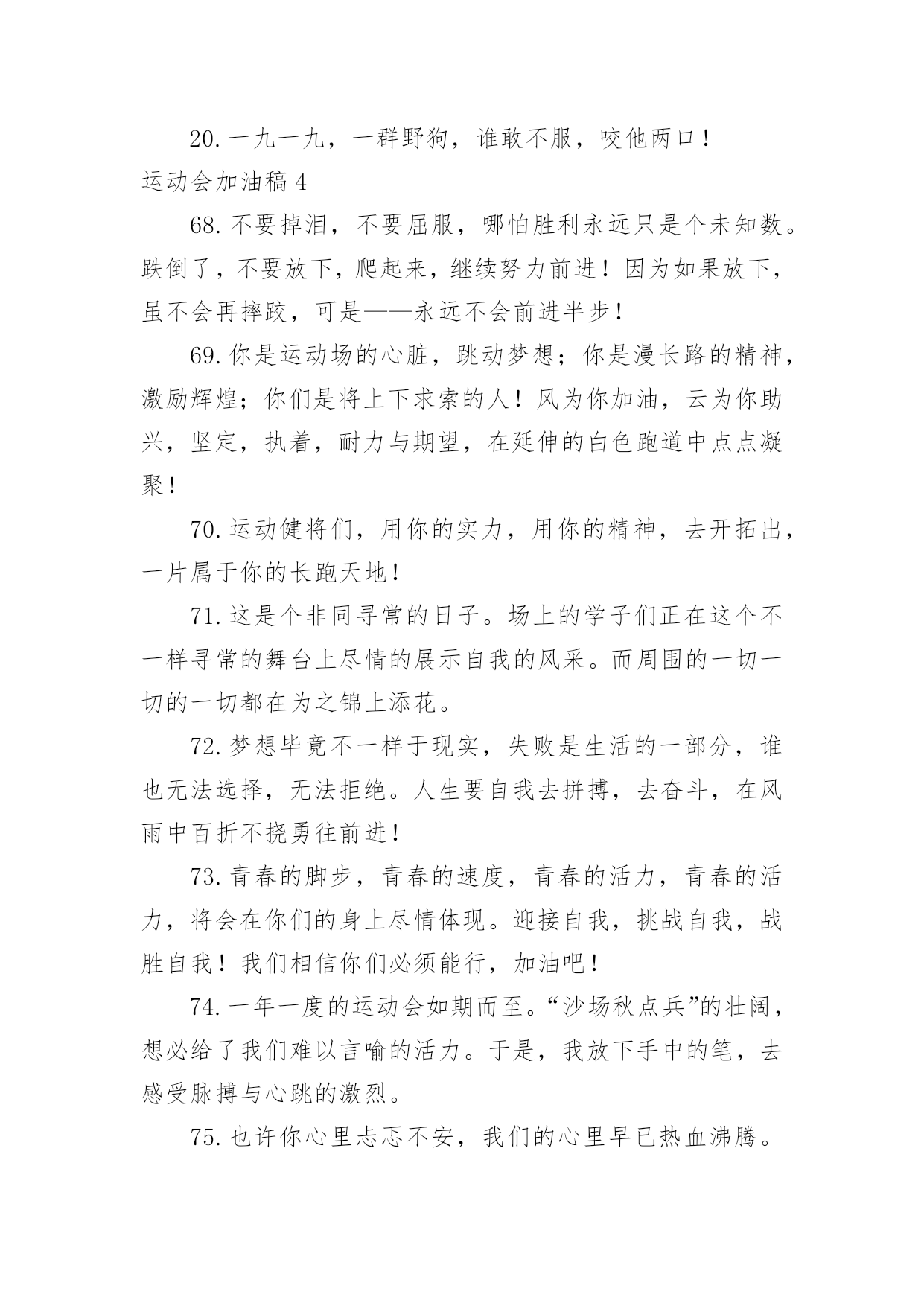 运动会加油稿(荐)运动会加油稿15篇在充满活力,日益开放的今天,我们很多时候都不得不用到加油稿,加油稿是用于给别人加油鼓气,提升别人气势的文稿。你所见过的加油稿是什么样的呢?以下是小编为大家整理的运动会加油稿,欢迎大家分享。运动会加油稿11、团结拼搏奋斗。2、挥动激情,放飞梦想,团结拼搏,树我雄风。3、励精图治,开拓进取,超越刘翔,从我做起。4、14礼貌守纪拥抱胜利5、青春如火,超越自我;机汽学子,勇创佳绩;6、15努力拼搏自强不息7、向参加校运会的体育健儿学习致敬!8、信笃志坚,奋起争先,机汽学子,再创辉煌。9、20班:这天的骄傲将从这诞生,明日的太阳将从那里升起!10、拼搏追娶善学勤11、超越极限,超越自我。12、15班:15班,齐心进,运动会,创佳绩!13、与时俱进,奋力拼搏,齐心协力,争创一流。14、鸣奏青春旋律,抒写运动乐意!15、19班:团结友爱,勤奋好学,激情飞扬。16、向辛勤工作的.全体裁判员工作人员致敬!17、青春如火,超越自我;机汽学子,勇创佳绩。18、九班九班,勇夺桂冠,齐心协力,共创辉煌。19、22班:展现青春风采!20、奋力拼搏,扬我班风,努力学习,勇争第一。21、心理健康加身体健康就是幸福。22、青春如火,超越自我,八年五班,奋勇拼搏。23、4,不要掉泪,不要屈服,哪怕胜利永远只是个未知数。24、16班:犯其至难,图其至远!25、扬体育精神,展青春风采!26、以勇求改,以改求变,以变求进。27、8班:人要搏出一片蓝天!28、学习思考创新,用知识创造生产力。29、看我六班,影子飒爽,奋勇拼搏,展现自我。30、振兴中华赛出水平31、扬帆把舵,奋勇拼搏,看我三班,锐不可当。32、机汽机汽,勇创佳绩;团结拼搏,展现自我;33、青春演绎,勇者激情,机汽健儿,永不言弃;34、我精彩,我运动。35、八年二班,猛虎出山,八年二班,锐不可当。36、八(4)精英,敢闯敢拼,齐心协力,争创佳绩。37、16运动起来勇敢第一38、魅力机汽,驰骋华园;众志成城,谁与争锋。39、与时俱进,开拓创新,顽强拼搏,勇夺第一。40、我运动我快乐我锻炼我提高41、梦五彩传奇,迎缤纷征途。42、3,高二3班的全体运动员们,你们加油,我们为你们喝彩!43、1班:飞跃梦想超越刘翔。44、奇迈山下,喜迎华园研运盛会;竞赛场上,尽显机汽健儿雄姿!45、17班:17班的人,17班的魂!46、梦五彩传奇,迎缤纷征途。47、强身健体,立志成材,2班2班,非同一般。48、八班一出,谁与争锋,横扫赛场,唯我称雄。49、互相学习,取长补短,再接再厉,勇攀高峰。50、23班:23,23,冲出国门,走向明天。运动会加油稿2开朗和阴郁都曾写在前额,昨天和明天都没有放弃执著。狂风的日子里我是卷起的浪,晴朗的日子里我是闪亮的玻,不改的是奔流的本色。成功和失败都镌刻进生活,春履和秋痕都不失为景色。绿色的季节里我是烂漫的花,金色的季节里我是迎风的果,不变的`是生命的蓬勃。你如同插上了飞跃地平线的翅膀,追踪流星、闪逝无迹,或撞成碎片,或射向天际。为什么你能冲开一切?为什么你能义无反顾?是因为你世袭的血液涌动的天性,还是你已将勇气放上天平,另一边托起整个天地。运动会加油稿31.团结一心,奋勇向前,追求卓越,争创第一。2.七八七八,精神焕发,强身健体,状态最佳。3.良药苦口,忠言逆耳,顿开茅塞,补偏救弊。4.活力飞扬,气宇轩昂,同心协力,共创辉煌5.顽强拼搏超越极限。6.文安天下,武定江山,得才兼备,智勇双全。7.我们共一队,我们似一人。8.毅然决然,团结勇敢,昂首阔步,勇往直前。9.勇争第一,团结一心,共创佳绩强身健体。10.礼貌四班,鳌头独占,和谐你我,勇争桂冠。11.经济经济,保研胜地,本硕连读,一生孤独。12.三九团结,破茧成蝶,气贯长虹,笑傲苍穹。13.发展体育运动,增强人民体质。14.八二八二,独一无二,心中似火,赵越自我。15.艰苦风斗,铁杵成针,矢志不移,滴水穿石。16.争创佳绩,青春如火。17.严肃活泼,奋勇拼搏,团结争先,荣誉如山。18.思不嫌烦,学不嫌苦,坚持不懈,勇往直前。19.超越极限,超越自我。20.一九一九,一群野狗,谁敢不服,咬他两口!运动会加油稿468.不要掉泪,不要屈服,哪怕胜利永远只是个未知数。跌倒了,不要放下,爬起来,继续努力前进!因为如果放下,虽不会再摔跤,可是——永远不会前进半步!69.你是运动场的心脏,跳动梦想;你是漫长路的精神,激励辉煌;你们是将上下求索的人!风为你加油,云为你助兴,坚定,执着,耐力与期望,在延伸的白色跑道中点点凝聚!70.运动健将们,用你的实力,用你的精神,去开拓出,一片属于你的长跑天地!71.这是个非同寻常的日子。场上的学子们正在这个不一样寻常的舞台上尽情的展示自我的风采。而周围的一切一切的一切都在为之锦上添