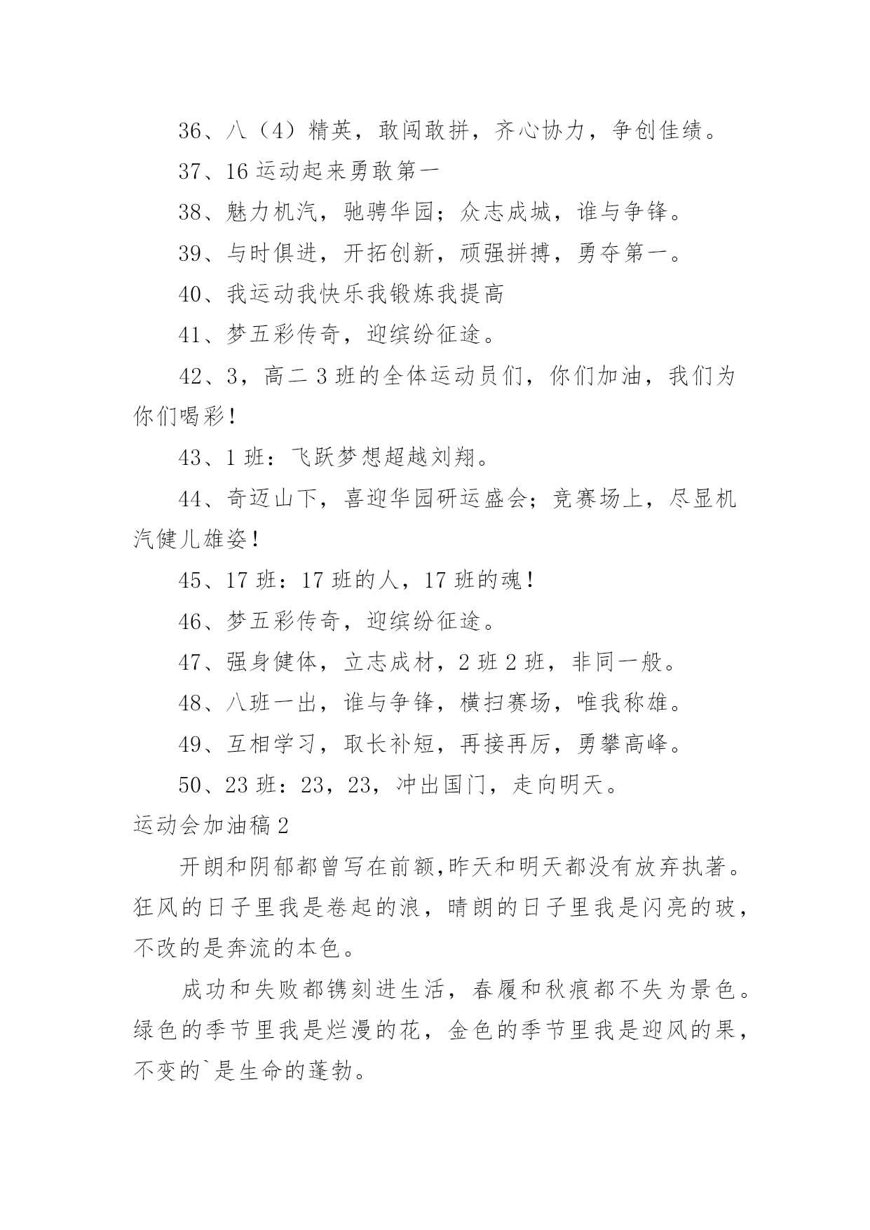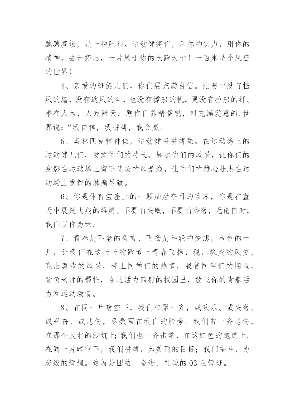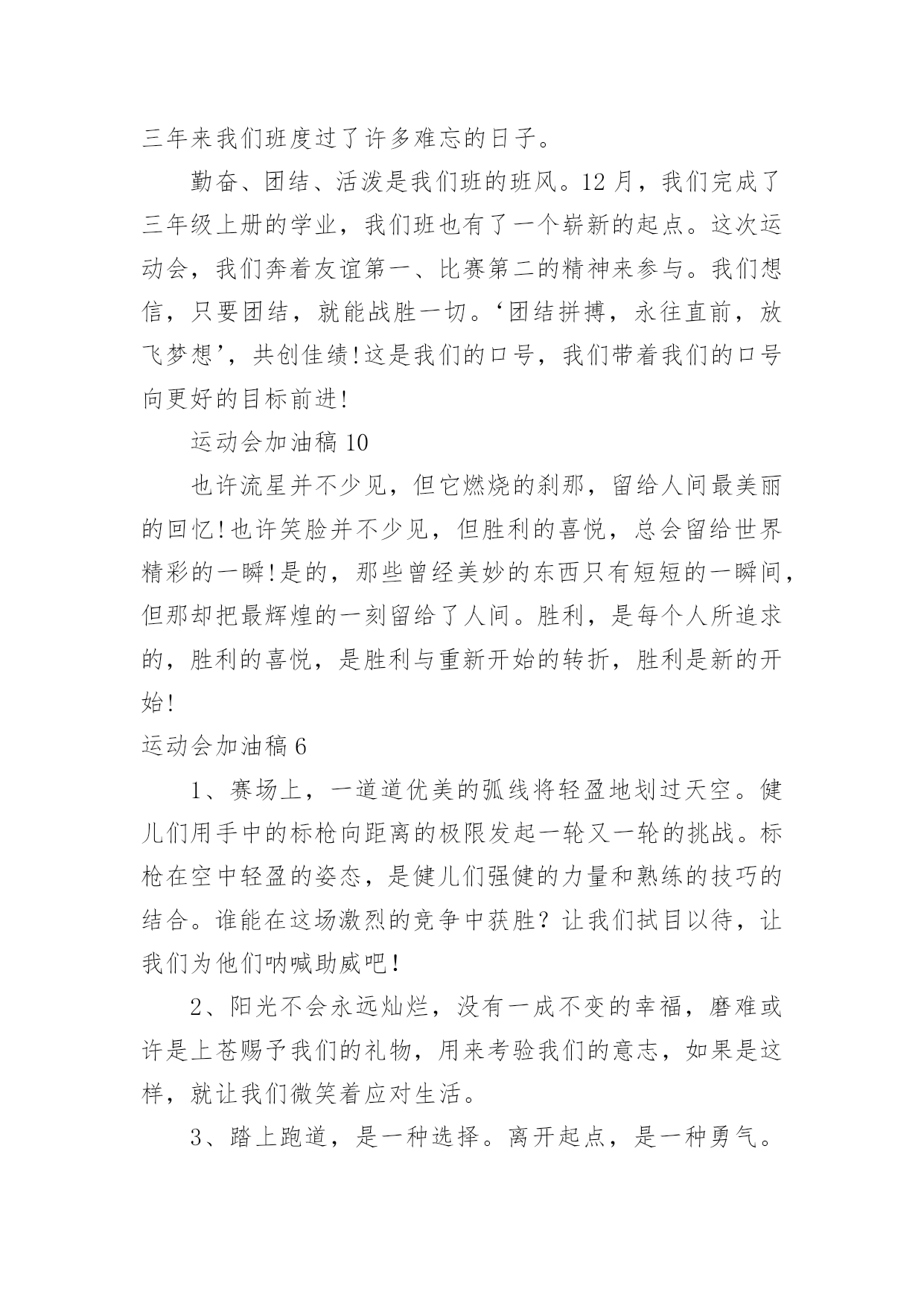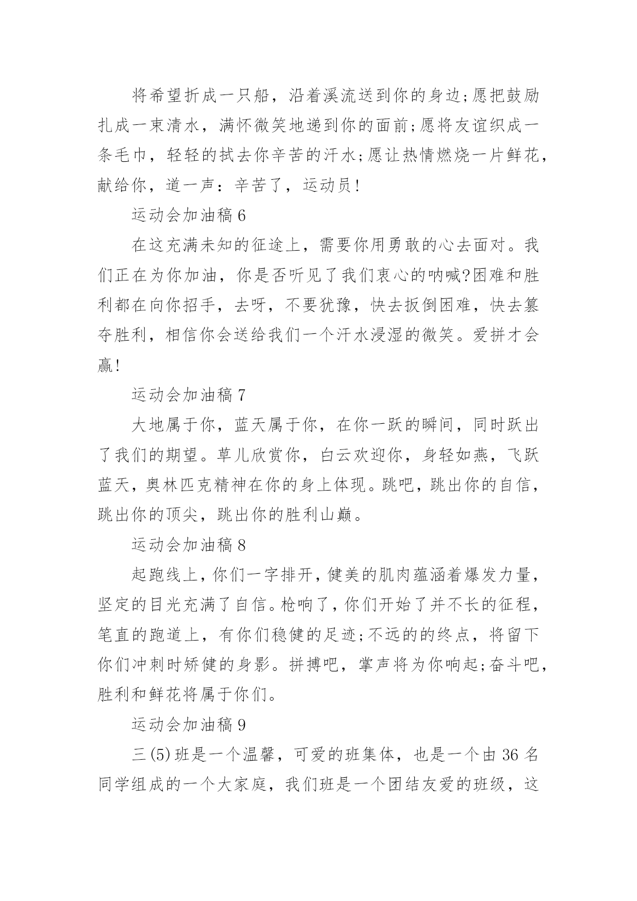 运动会加油稿(荐)运动会加油稿15篇在充满活力,日益开放的今天,我们很多时候都不得不用到加油稿,加油稿是用于给别人加油鼓气,提升别人气势的文稿。你所见过的加油稿是什么样的呢?以下是小编为大家整理的运动会加油稿,欢迎大家分享。运动会加油稿11、团结拼搏奋斗。2、挥动激情,放飞梦想,团结拼搏,树我雄风。3、励精图治,开拓进取,超越刘翔,从我做起。4、14礼貌守纪拥抱胜利5、青春如火,超越自我;机汽学子,勇创佳绩;6、15努力拼搏自强不息7、向参加校运会的体育健儿学习致敬!8、信笃志坚,奋起争先,机汽学子,再创辉煌。9、20班:这天的骄傲将从这诞生,明日的太阳将从那里升起!10、拼搏追娶善学勤11、超越极限,超越自我。12、15班:15班,齐心进,运动会,创佳绩!13、与时俱进,奋力拼搏,齐心协力,争创一流。14、鸣奏青春旋律,抒写运动乐意!15、19班:团结友爱,勤奋好学,激情飞扬。16、向辛勤工作的.全体裁判员工作人员致敬!17、青春如火,超越自我;机汽学子,勇创佳绩。18、九班九班,勇夺桂冠,齐心协力,共创辉煌。19、22班:展现青春风采!20、奋力拼搏,扬我班风,努力学习,勇争第一。21、心理健康加身体健康就是幸福。22、青春如火,超越自我,八年五班,奋勇拼搏。23、4,不要掉泪,不要屈服,哪怕胜利永远只是个未知数。24、16班:犯其至难,图其至远!25、扬体育精神,展青春风采!26、以勇求改,以改求变,以变求进。27、8班:人要搏出一片蓝天!28、学习思考创新,用知识创造生产力。29、看我六班,影子飒爽,奋勇拼搏,展现自我。30、振兴中华赛出水平31、扬帆把舵,奋勇拼搏,看我三班,锐不可当。32、机汽机汽,勇创佳绩;团结拼搏,展现自我;33、青春演绎,勇者激情,机汽健儿,永不言弃;34、我精彩,我运动。35、八年二班,猛虎出山,八年二班,锐不可当。36、八(4)精英,敢闯敢拼,齐心协力,争创佳绩。37、16运动起来勇敢第一38、魅力机汽,驰骋华园;众志成城,谁与争锋。39、与时俱进,开拓创新,顽强拼搏,勇夺第一。40、我运动我快乐我锻炼我提高41、梦五彩传奇,迎缤纷征途。42、3,高二3班的全体运动员们,你们加油,我们为你们喝彩!43、1班:飞跃梦想超越刘翔。44、奇迈山下,喜迎华园研运盛会;竞赛场上,尽显机汽健儿雄姿!45、17班:17班的人,17班的魂!46、梦五彩传奇,迎缤纷征途。47、强身健体,立志成材,2班2班,非同一般。48、八班一出,谁与争锋,横扫赛场,唯我称雄。49、互相学习,取长补短,再接再厉,勇攀高峰。50、23班:23,23,冲出国门,走向明天。运动会加油稿2开朗和阴郁都曾写在前额,昨天和明天都没有放弃执著。狂风的日子里我是卷起的浪,晴朗的日子里我是闪亮的玻,不改的是奔流的本色。成功和失败都镌刻进生活,春履和秋痕都不失为景色。绿色的季节里我是烂漫的花,金色的季节里我是迎风的果,不变的`是生命的蓬勃。你如同插上了飞跃地平线的翅膀,追踪流星、闪逝无迹,或撞成碎片,或射向天际。为什么你能冲开一切?为什么你能义无反顾?是因为你世袭的血液涌动的天性,还是你已将勇气放上天平,另一边托起整个天地。运动会加油稿31.团结一心,奋勇向前,追求卓越,争创第一。2.七八七八,精神焕发,强身健体,状态最佳。3.良药苦口,忠言逆耳,顿开茅塞,补偏救弊。4.活力飞扬,气宇轩昂,同心协力,共创辉煌5.顽强拼搏超越极限。6.文安天下,武定江山,得才兼备,智勇双全。7.我们共一队,我们似一人。8.毅然决然,团结勇敢,昂首阔步,勇往直前。9.勇争第一,团结一心,共创佳绩强身健体。10.礼貌四班,鳌头独占,和谐你我,勇争桂冠。11.经济经济,保研胜地,本硕连读,一生孤独。12.三九团结,破茧成蝶,气贯长虹,笑傲苍穹。13.发展体育运动,增强人民体质。14.八二八二,独一无二,心中似火,赵越自我。15.艰苦风斗,铁杵成针,矢志不移,滴水穿石。16.争创佳绩,青春如火。17.严肃活泼,奋勇拼搏,团结争先,荣誉如山。18.思不嫌烦,学不嫌苦,坚持不懈,勇往直前。19.超越极限,超越自我。20.一九一九,一群野狗,谁敢不服,咬他两口!运动会加油稿468.不要掉泪,不要屈服,哪怕胜利永远只是个未知数。跌倒了,不要放下,爬起来,继续努力前进!因为如果放下,虽不会再摔跤,可是——永远不会前进半步!69.你是运动场的心脏,跳动梦想;你是漫长路的精神,激励辉煌;你们是将上下求索的人!风为你加油,云为你助兴,坚定,执着,耐力与期望,在延伸的白色跑道中点点凝聚!70.运动健将们,用你的实力,用你的精神,去开拓出,一片属于你的长跑天地!71.这是个非同寻常的日子。场上的学子们正在这个不一样寻常的舞台上尽情的展示自我的风采。而周围的一切一切的一切都在为之锦上添