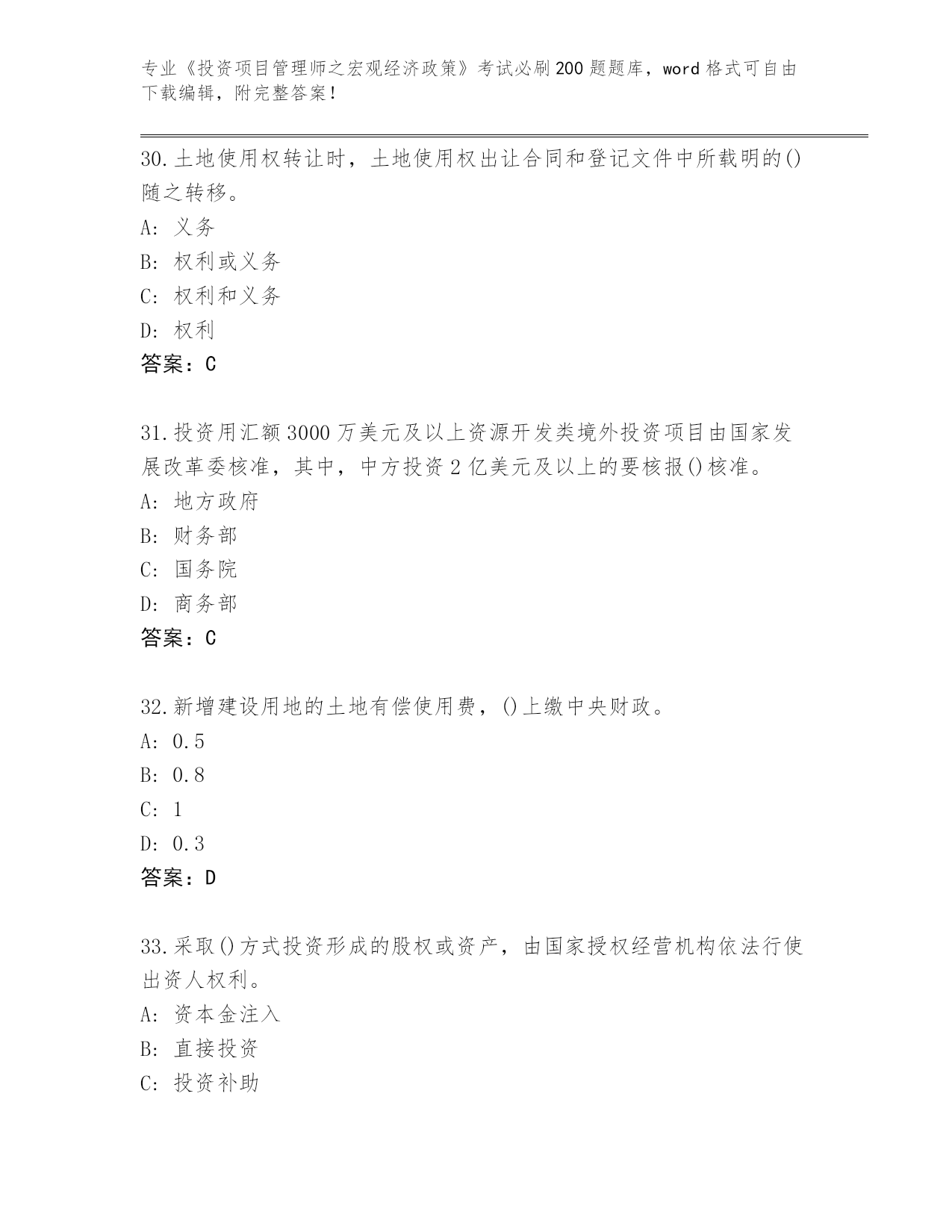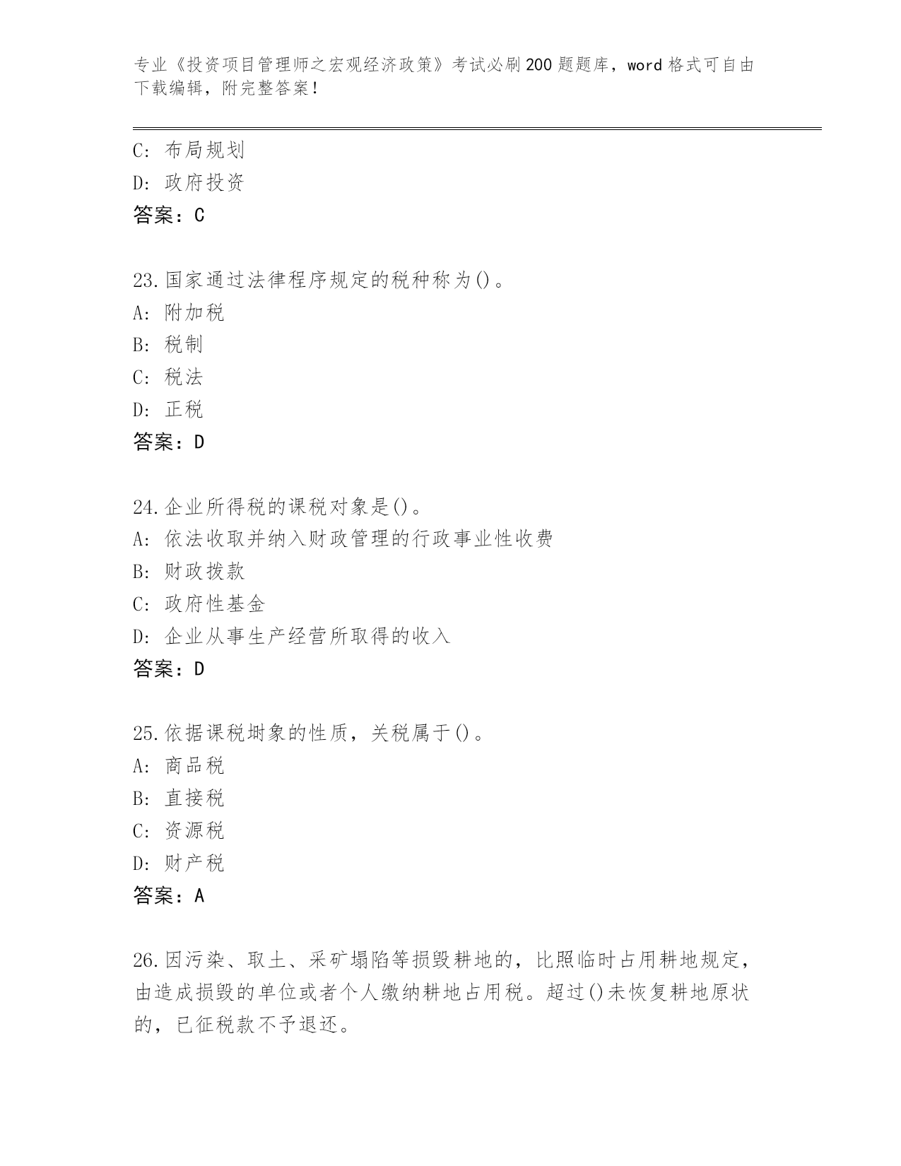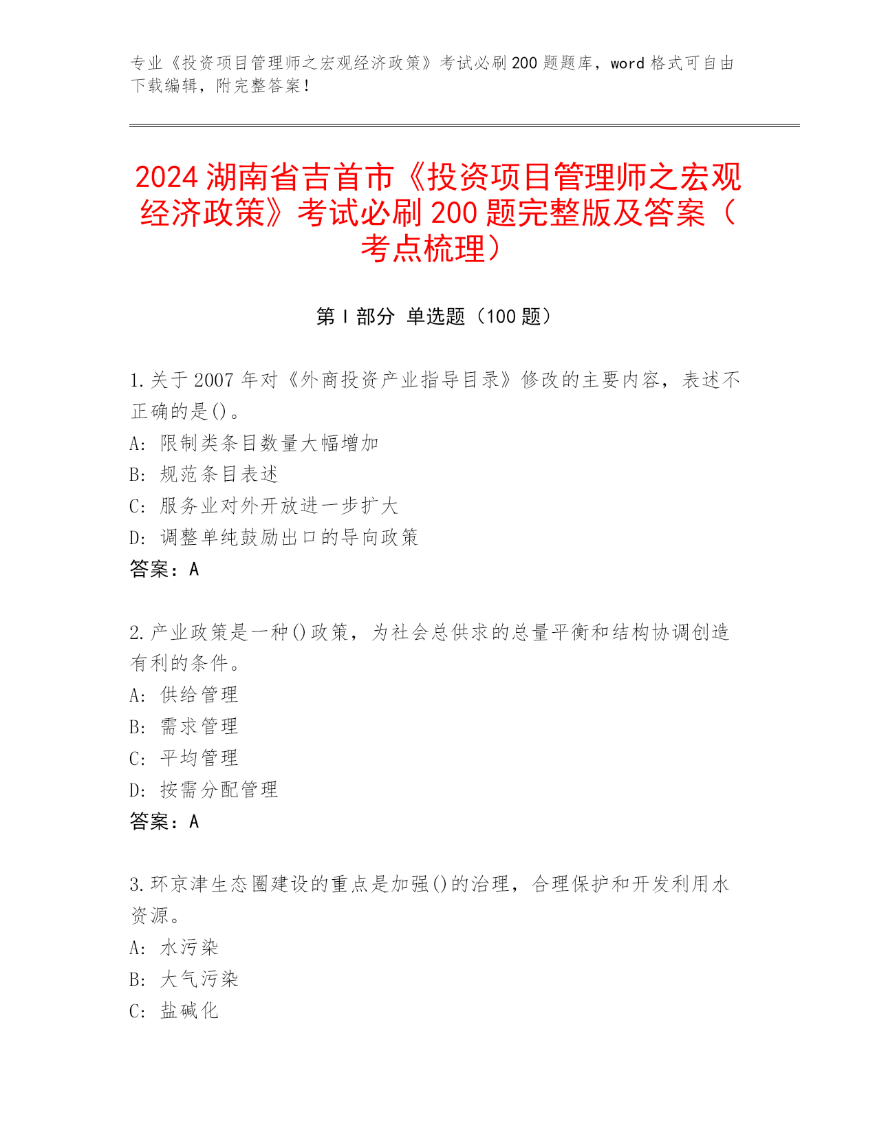 2024湖南省吉首市《投资项目管理师之宏观经济政策》考试必刷200题完整版及答案(考点梳理)