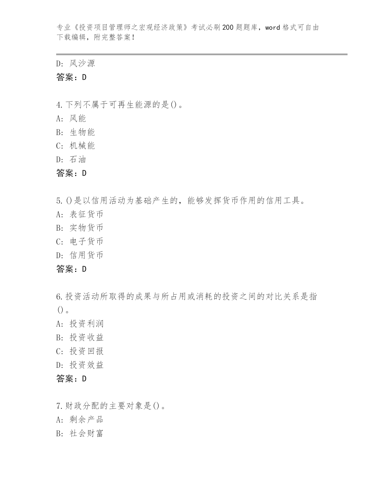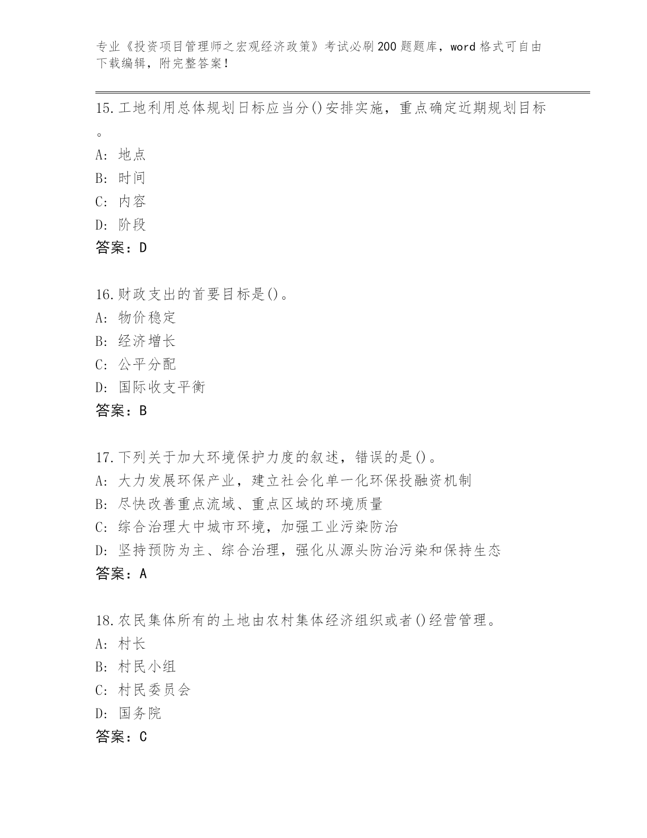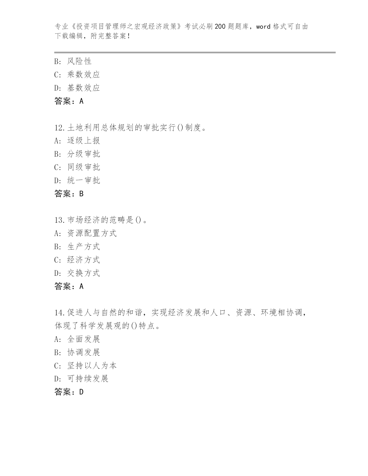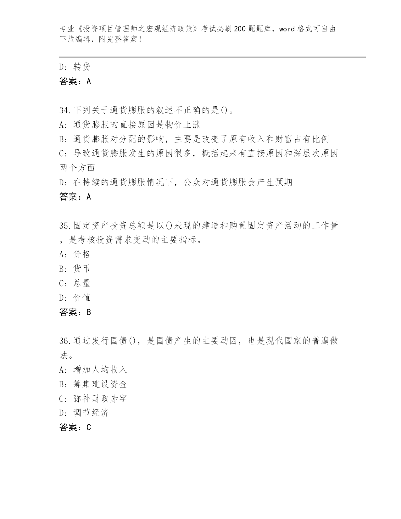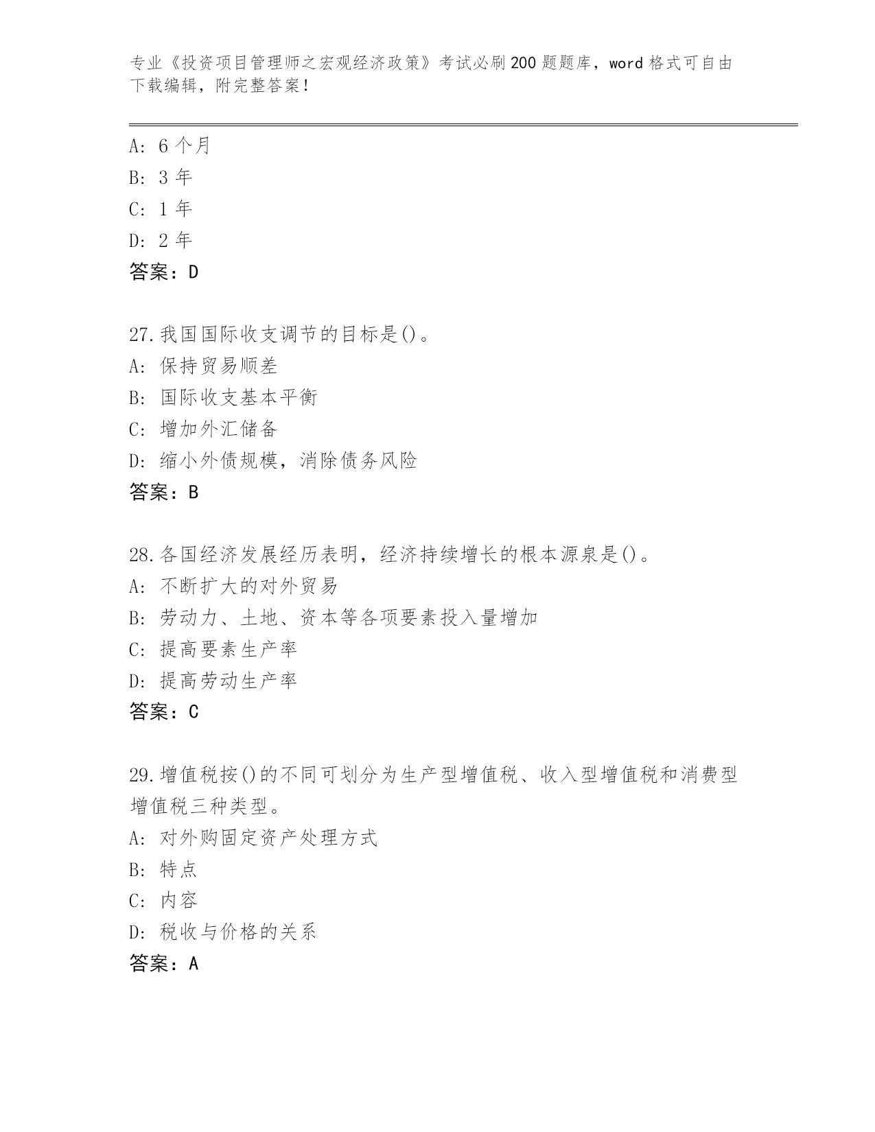 湖南省吉首市2024年《投资项目管理师之宏观经济政策》考试必刷200题内部题库及答案【基础+提升】