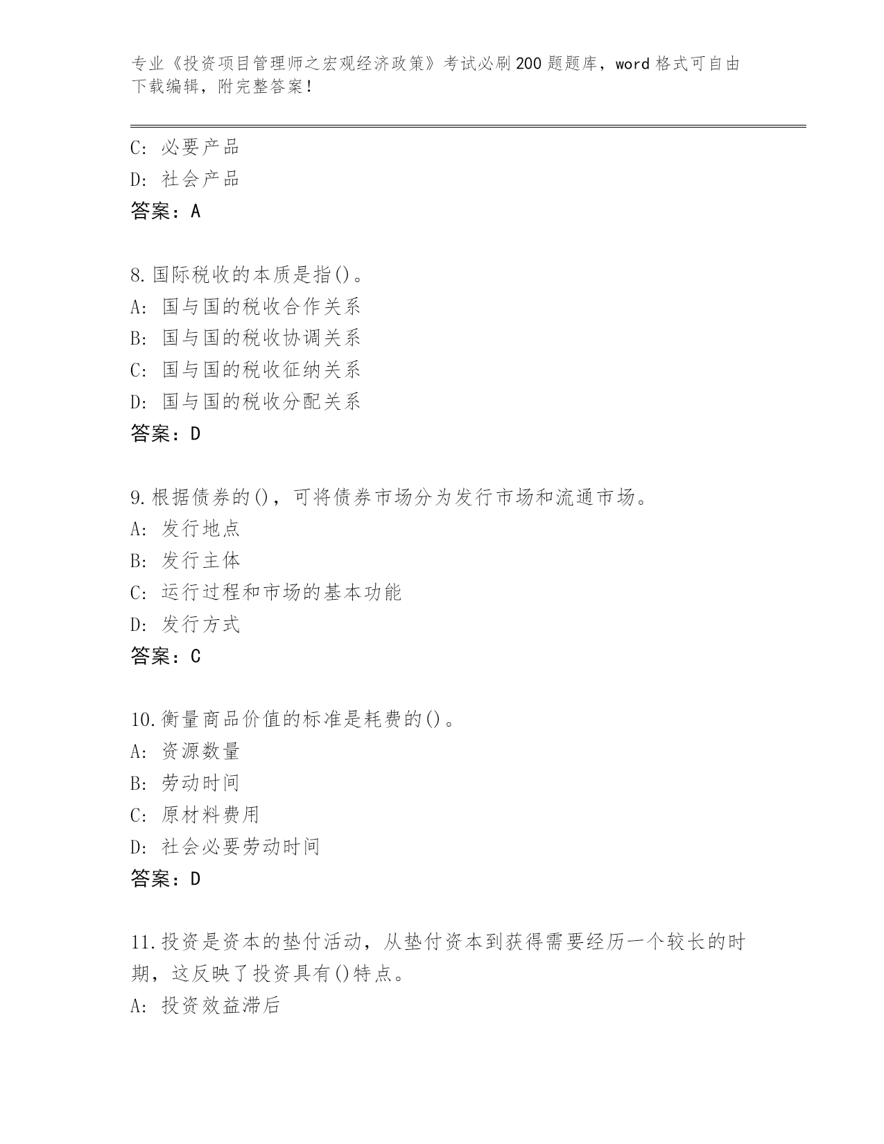 内部使用山西省《投资项目管理师之宏观经济政策》考试必刷200题真题(考点梳理)