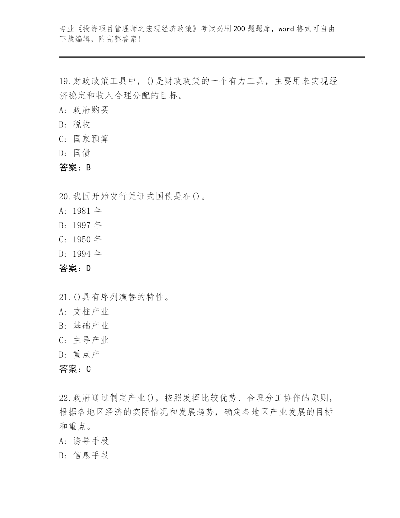 江西省内部使用《投资项目管理师之宏观经济政策》考试必刷200题题库(考点梳理)