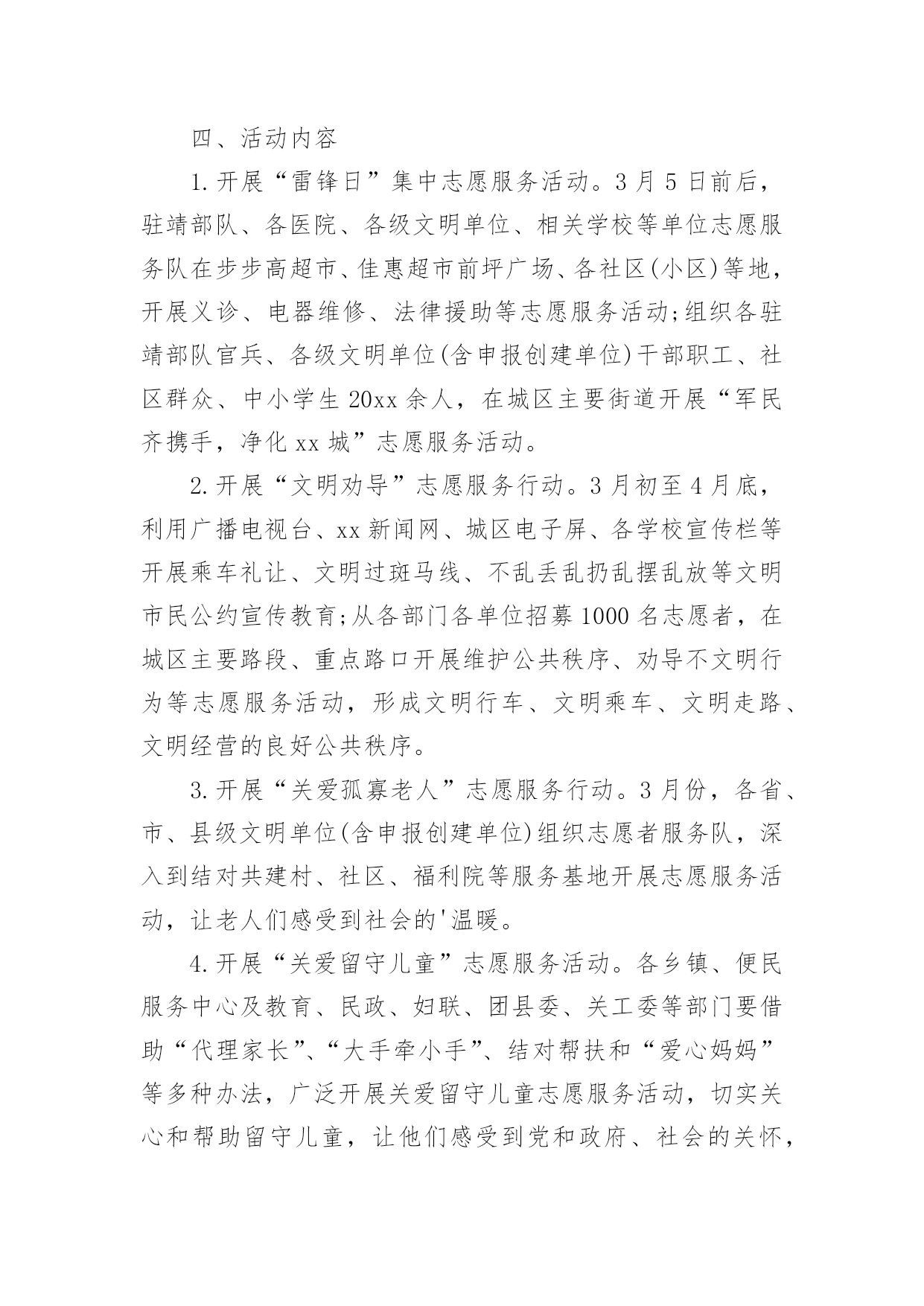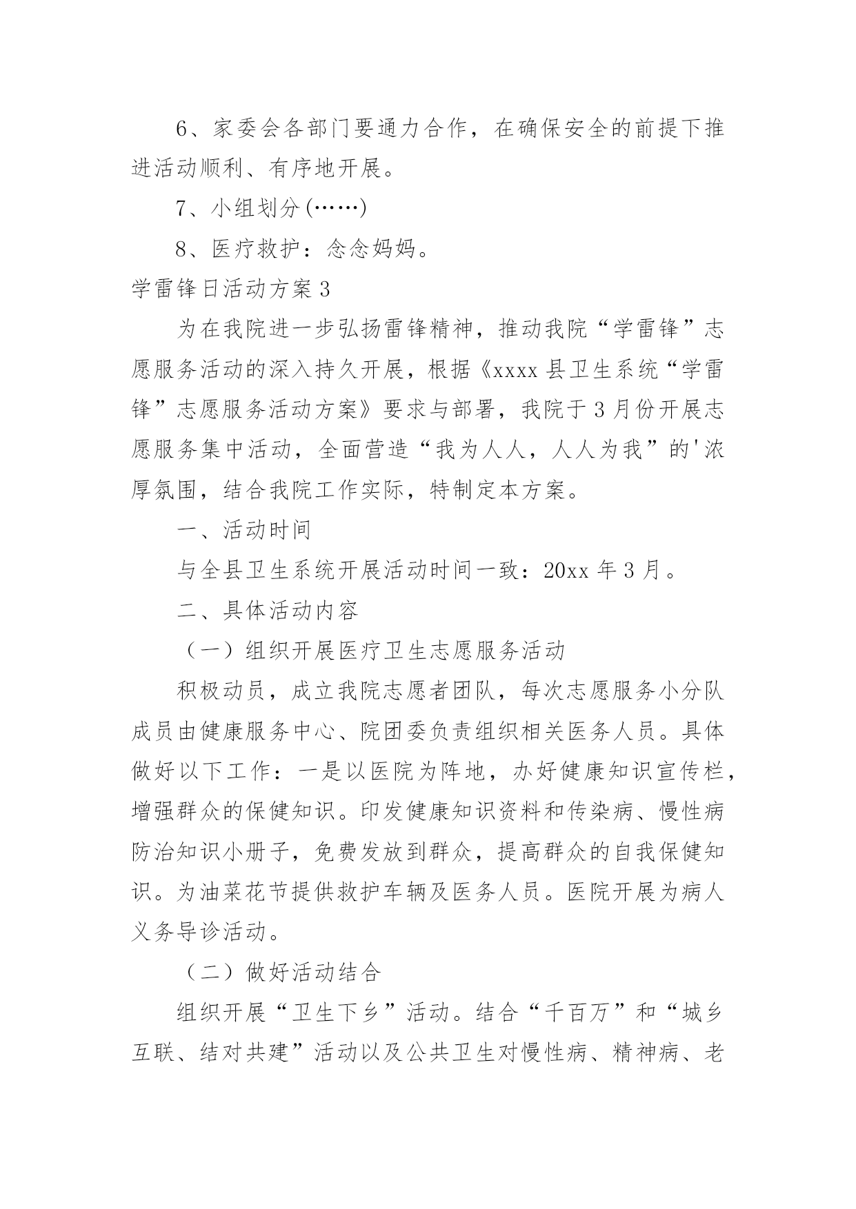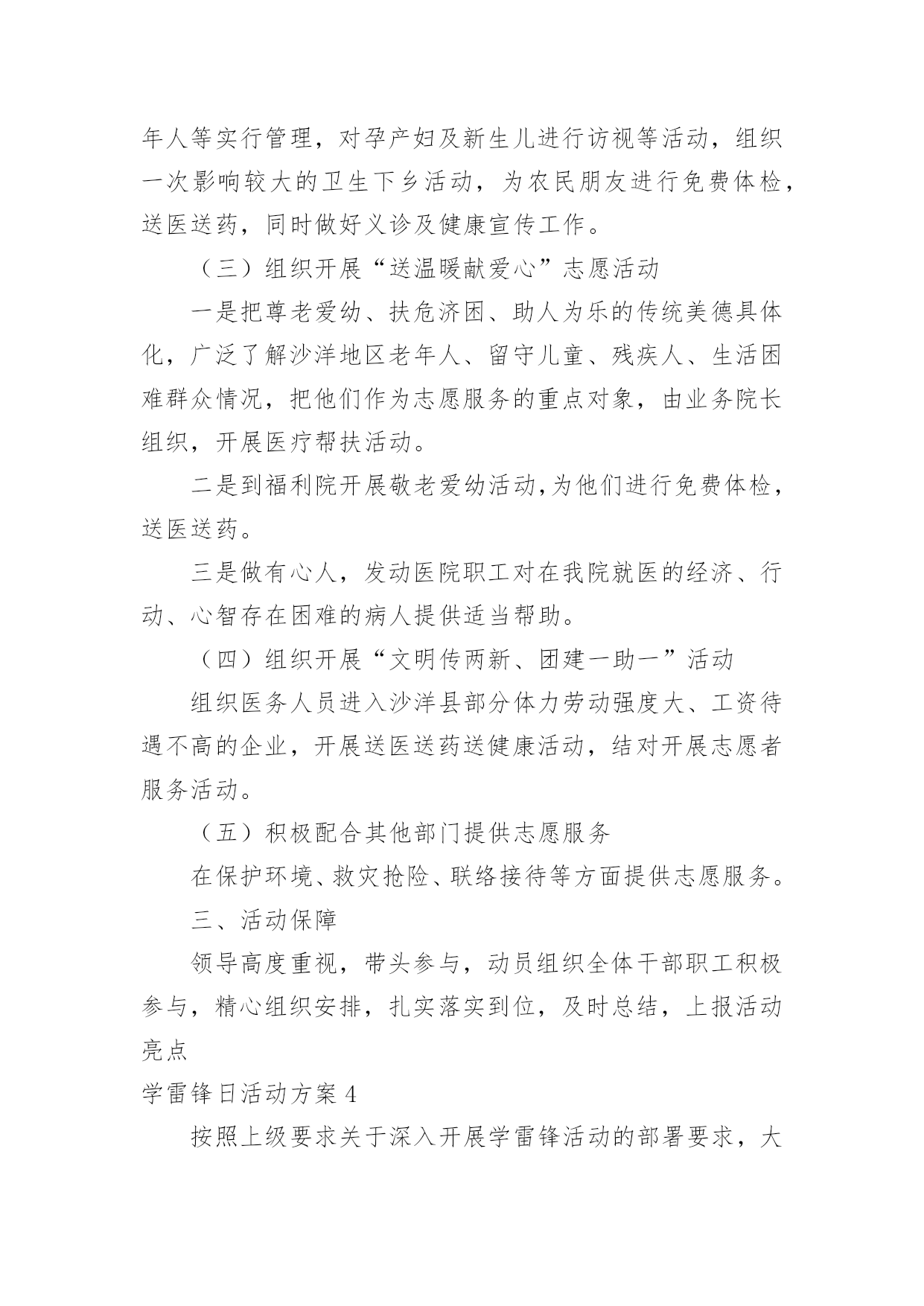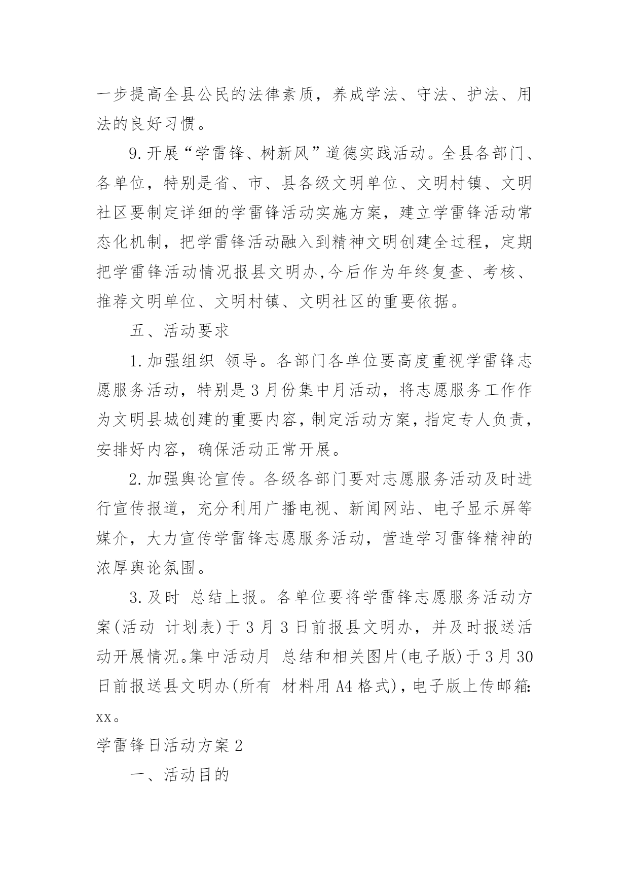 学雷锋日活动方案学雷锋日活动方案为了确定工作或事情顺利开展,预先制定方案是必不可少的,方案是计划中内容最为复杂的一种。写方案需要注意哪些格式呢?以下是小编为大家整理的学雷锋日活动方案,仅供参考,大家一起来看看吧。学雷锋日活动方案1为认真贯彻落实党的十八大、十八届五中全会精神,进一步弘扬雷锋精神,推进志愿服务工作扎实深入开展,助力全国文明城市(县级)创建,现制定20xx年xx县“学雷锋,我行动”志愿服务活动方案如下:一、活动目的以培育和践行社会主义核心价值观为根本,广泛普及“行善立德”志愿服务理念,大力培育志愿服务文化,扎实开展“关爱他人、关爱社会、关爱自然”志愿服务活动,增强广大市民的社会责任意识和奉献他人精神,推动学雷锋志愿服务活动常态化,助推全国文明城市创建。二、活动主题学雷锋我行动三、活动时间20xx年全年,3月份为集中活动月。四、活动内容1.开展“雷锋日”集中志愿服务活动。3月5日前后,驻靖部队、各医院、各级文明单位、相关学校等单位志愿服务队在步步高超市、佳惠超市前坪广场、各社区(小区)等地,开展义诊、电器维修、法律援助等志愿服务活动;组织各驻靖部队官兵、各级文明单位(含申报创建单位)干部职工、社区群众、中小学生20xx余人,在城区主要街道开展“军民齐携手,净化xx城”志愿服务活动。2.开展“文明劝导”志愿服务行动。3月初至4月底,利用广播电视台、xx新闻网、城区电子屏、各学校宣传栏等开展乘车礼让、文明过斑马线、不乱丢乱扔乱摆乱放等文明市民公约宣传教育;从各部门各单位招募1000名志愿者,在城区主要路段、重点路口开展维护公共秩序、劝导不文明行为等志愿服务活动,形成文明行车、文明乘车、文明走路、文明经营的良好公共秩序。3.开展“关爱孤寡老人”志愿服务行动。3月份,各省、市、县级文明单位(含申报创建单位)组织志愿者服务队,深入到结对共建村、社区、福利院等服务基地开展志愿服务活动,让老人们感受到社会的'温暖。4.开展“关爱留守儿童”志愿服务活动。各乡镇、便民服务中心及教育、民政、妇联、团县委、关工委等部门要借助“代理家长”、“大手牵小手”、结对帮扶和“爱心妈妈”等多种办法,广泛开展关爱留守儿童志愿服务活动,切实关心和帮助留守儿童,让他们感受到党和政府、社会的关怀,促进他们健康快乐成长。5.开展“弘扬雷锋精神”专题宣讲活动。3月份,由县教育局组织各中小学召开团会(队会)、校会,安排时间就“如何在新时期学习雷锋精神”进行专题宣讲。组织学生写心得体会,并以校内黑板报、宣传栏、学习园地为宣传主阵地,倡导中小学生立足校园,融入社会,从我做起,从小事做起,做有益于他人、学校、家庭和社会的好事,展示青少年儿童的高尚情操和风采。积极组织开展“四个一”活动,即:彻底改掉一个坏习惯;帮助一个孤寡老人做件事;关爱一个学习或经济困难的同学;每人每周为集体做一件好事。通过一系列活动,积极营造学校助人为乐的良好氛围,从小培养青少年服务社会、奉献社会的精神。6.开展感恩教育活动。4月份,由县教育局组织全县各中小学开展以孝敬父母、尊敬师长、关爱他人、学会感恩为主要内容的“感恩教育”活动。引导广大青少年感激祖国和人民的关怀、感激父母的养育之恩、感激老师的辛苦教诲、感激同学的真诚相助、感恩自然的伟大赐予。7.开展义务植树活动。3月12日前后,县林业局、县环保局等部门结合全民义务植树节活动,组织广大干部职工及志愿者到河边、城区公园、绿化带及村镇街边路旁开展义务植树绿化活动。8.开展法律宣传志愿服务活动。由县司法局、县人民法院等法律部门及各乡镇、社区,围绕群众急需了解的法律援助、人民调解和劳动纠纷等开展法律宣传志愿服务活动,进一步提高全县公民的法律素质,养成学法、守法、护法、用法的良好习惯。9.开展“学雷锋、树新风”道德实践活动。全县各部门、各单位,特别是省、市、县各级文明单位、文明村镇、文明社区要制定详细的学雷锋活动实施方案,建立学雷锋活动常态化机制,把学雷锋活动融入到精神文明创建全过程,定期把学雷锋活动情况报县文明办,今后作为年终复查、考核、推荐文明单位、文明村镇、文明社区的重要依据。五、活动要求1.加强组织领导。各部门各单位要高度重视学雷锋志愿服务活动,特别是3月份集中月活动,将志愿服务工作作为文明县城创建的重要内容,制定活动方案,指定专人负责,安排好内容,确保活动正常开展。2.加强舆论宣传。各级各部门要对志愿服务活动及时进行宣传报道,充分利用广播电视、新闻网站、电子显示屏等媒介,大力宣传学雷锋志愿服务活动,营造学习雷锋精神的浓厚舆论氛围。3.及时总结上报。各单位要将学雷锋志愿服务活动方案(活动计划表)于3月3日前报县文明办,并及时报送活动开展情况。集中活动月总结和相关图片(电子版)于3月30日前报送县文明办(所有材料用A4格式),电子版上传邮箱:xx。