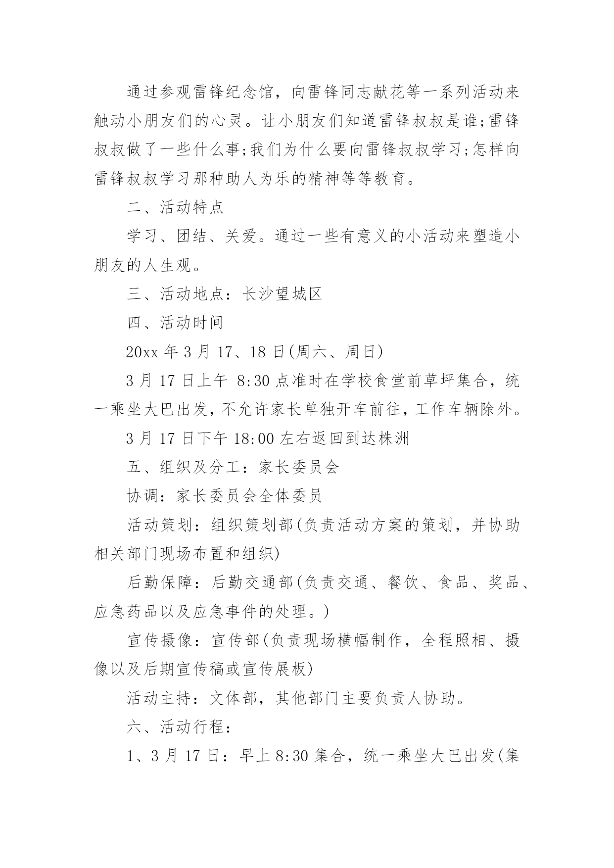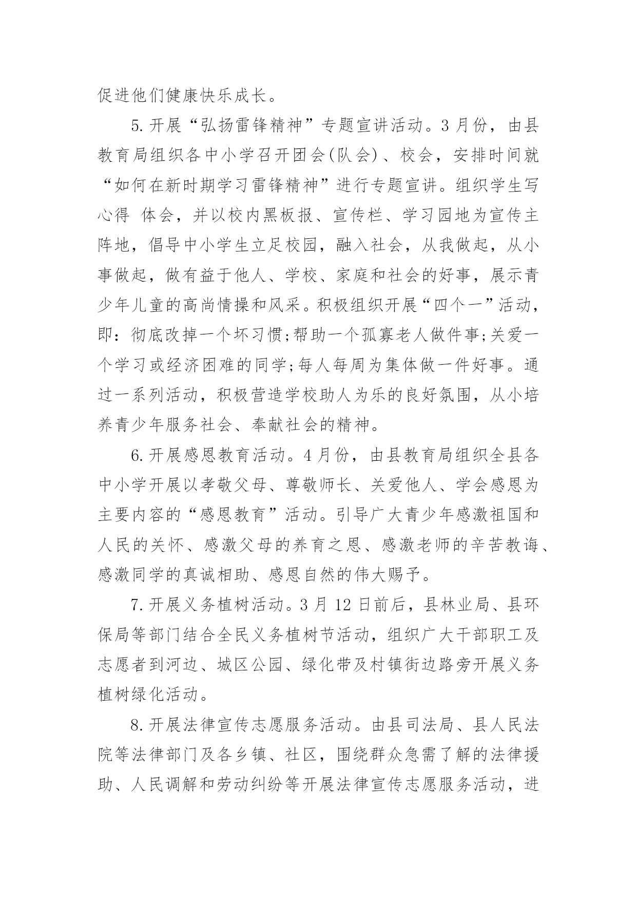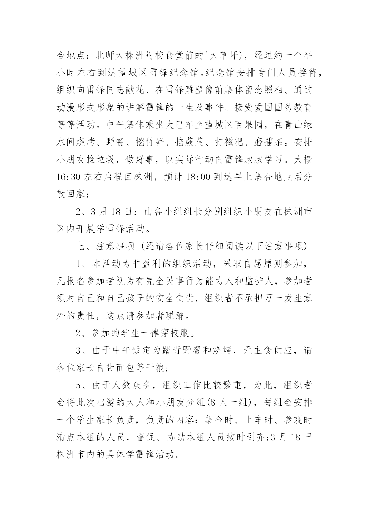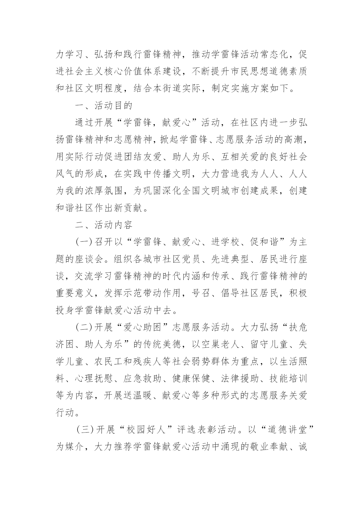 学雷锋日活动方案学雷锋日活动方案为了确定工作或事情顺利开展,预先制定方案是必不可少的,方案是计划中内容最为复杂的一种。写方案需要注意哪些格式呢?以下是小编为大家整理的学雷锋日活动方案,仅供参考,大家一起来看看吧。学雷锋日活动方案1为认真贯彻落实党的十八大、十八届五中全会精神,进一步弘扬雷锋精神,推进志愿服务工作扎实深入开展,助力全国文明城市(县级)创建,现制定20xx年xx县“学雷锋,我行动”志愿服务活动方案如下:一、活动目的以培育和践行社会主义核心价值观为根本,广泛普及“行善立德”志愿服务理念,大力培育志愿服务文化,扎实开展“关爱他人、关爱社会、关爱自然”志愿服务活动,增强广大市民的社会责任意识和奉献他人精神,推动学雷锋志愿服务活动常态化,助推全国文明城市创建。二、活动主题学雷锋我行动三、活动时间20xx年全年,3月份为集中活动月。四、活动内容1.开展“雷锋日”集中志愿服务活动。3月5日前后,驻靖部队、各医院、各级文明单位、相关学校等单位志愿服务队在步步高超市、佳惠超市前坪广场、各社区(小区)等地,开展义诊、电器维修、法律援助等志愿服务活动;组织各驻靖部队官兵、各级文明单位(含申报创建单位)干部职工、社区群众、中小学生20xx余人,在城区主要街道开展“军民齐携手,净化xx城”志愿服务活动。2.开展“文明劝导”志愿服务行动。3月初至4月底,利用广播电视台、xx新闻网、城区电子屏、各学校宣传栏等开展乘车礼让、文明过斑马线、不乱丢乱扔乱摆乱放等文明市民公约宣传教育;从各部门各单位招募1000名志愿者,在城区主要路段、重点路口开展维护公共秩序、劝导不文明行为等志愿服务活动,形成文明行车、文明乘车、文明走路、文明经营的良好公共秩序。3.开展“关爱孤寡老人”志愿服务行动。3月份,各省、市、县级文明单位(含申报创建单位)组织志愿者服务队,深入到结对共建村、社区、福利院等服务基地开展志愿服务活动,让老人们感受到社会的'温暖。4.开展“关爱留守儿童”志愿服务活动。各乡镇、便民服务中心及教育、民政、妇联、团县委、关工委等部门要借助“代理家长”、“大手牵小手”、结对帮扶和“爱心妈妈”等多种办法,广泛开展关爱留守儿童志愿服务活动,切实关心和帮助留守儿童,让他们感受到党和政府、社会的关怀,促进他们健康快乐成长。5.开展“弘扬雷锋精神”专题宣讲活动。3月份,由县教育局组织各中小学召开团会(队会)、校会,安排时间就“如何在新时期学习雷锋精神”进行专题宣讲。组织学生写心得体会,并以校内黑板报、宣传栏、学习园地为宣传主阵地,倡导中小学生立足校园,融入社会,从我做起,从小事做起,做有益于他人、学校、家庭和社会的好事,展示青少年儿童的高尚情操和风采。积极组织开展“四个一”活动,即:彻底改掉一个坏习惯;帮助一个孤寡老人做件事;关爱一个学习或经济困难的同学;每人每周为集体做一件好事。通过一系列活动,积极营造学校助人为乐的良好氛围,从小培养青少年服务社会、奉献社会的精神。6.开展感恩教育活动。4月份,由县教育局组织全县各中小学开展以孝敬父母、尊敬师长、关爱他人、学会感恩为主要内容的“感恩教育”活动。引导广大青少年感激祖国和人民的关怀、感激父母的养育之恩、感激老师的辛苦教诲、感激同学的真诚相助、感恩自然的伟大赐予。7.开展义务植树活动。3月12日前后,县林业局、县环保局等部门结合全民义务植树节活动,组织广大干部职工及志愿者到河边、城区公园、绿化带及村镇街边路旁开展义务植树绿化活动。8.开展法律宣传志愿服务活动。由县司法局、县人民法院等法律部门及各乡镇、社区,围绕群众急需了解的法律援助、人民调解和劳动纠纷等开展法律宣传志愿服务活动,进一步提高全县公民的法律素质,养成学法、守法、护法、用法的良好习惯。9.开展“学雷锋、树新风”道德实践活动。全县各部门、各单位,特别是省、市、县各级文明单位、文明村镇、文明社区要制定详细的学雷锋活动实施方案,建立学雷锋活动常态化机制,把学雷锋活动融入到精神文明创建全过程,定期把学雷锋活动情况报县文明办,今后作为年终复查、考核、推荐文明单位、文明村镇、文明社区的重要依据。五、活动要求1.加强组织领导。各部门各单位要高度重视学雷锋志愿服务活动,特别是3月份集中月活动,将志愿服务工作作为文明县城创建的重要内容,制定活动方案,指定专人负责,安排好内容,确保活动正常开展。2.加强舆论宣传。各级各部门要对志愿服务活动及时进行宣传报道,充分利用广播电视、新闻网站、电子显示屏等媒介,大力宣传学雷锋志愿服务活动,营造学习雷锋精神的浓厚舆论氛围。3.及时总结上报。各单位要将学雷锋志愿服务活动方案(活动计划表)于3月3日前报县文明办,并及时报送活动开展情况。集中活动月总结和相关图片(电子版)于3月30日前报送县文明办(所有材料用A4格式),电子版上传邮箱:xx。