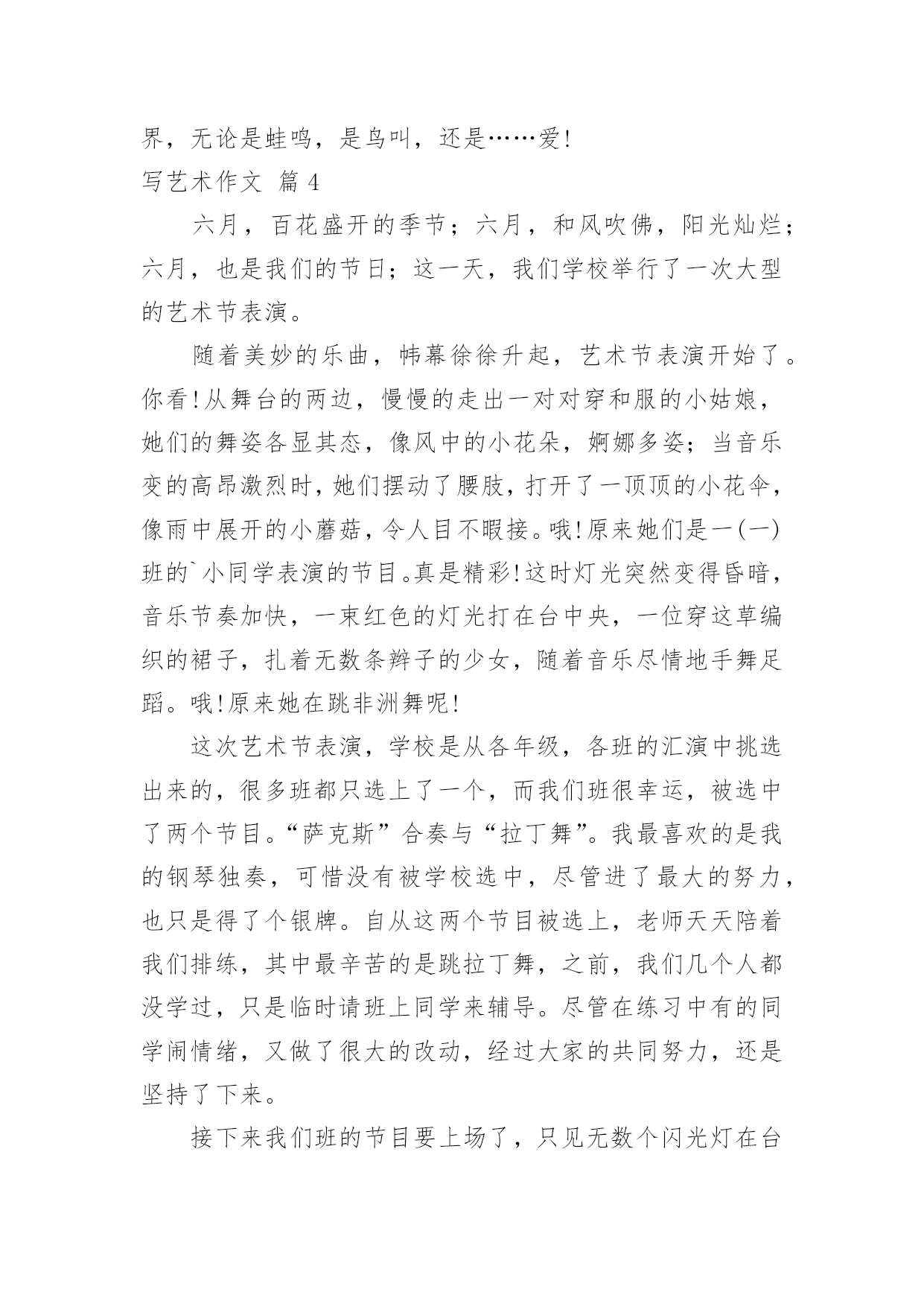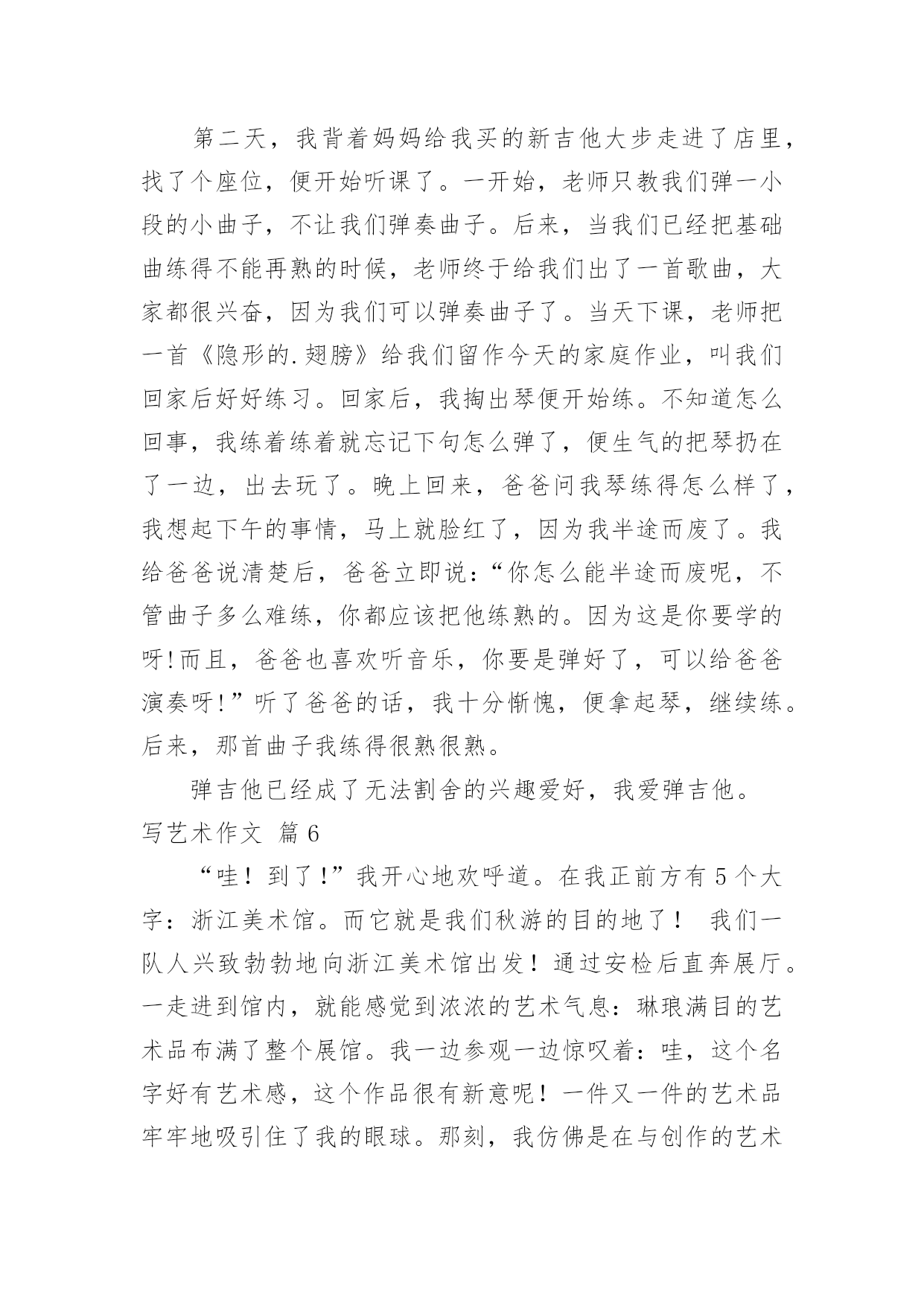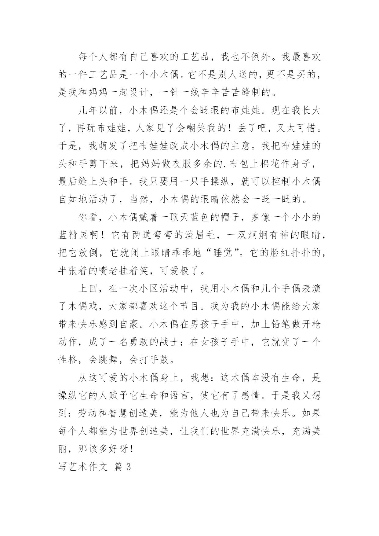 写艺术作文有关写艺术作文锦集六篇在学习、工作、生活中,大家都有写作文的经历,对作文很是熟悉吧,借助作文可以提高我们的语言组织能力。那要怎么写好作文呢?下面是小编精心整理的写艺术作文6篇,仅供参考,希望能够帮助到大家。写艺术作文篇1其实在我看来,读书就在于感受,一本书读下来之后,很多人都会强制性的写下一篇读后感,其实心中很杂很乱,一时半会也理不清思绪。如果在这时写下文章,很可能错误百出。其实不然,读完一本书,必定会有许多发自内心的感悟,那种感悟,不是用一般的文字语言能描述出来的,如果达不到那种艺术,反倒会侮辱了文章的本意。在这一方面的话,最好是等自我平静下来之后再慢慢构思!文章中艺术的真谛不在于运用华丽的.词藻,而是在于发自内心的那种真诚的东西。就算语言再平实,也能写的真实动人!只要到达这个水平文章才能写的真实感人。而且笔尖稍稍一动,一篇习作佳文就如流水般一样瞬间就写出来了。拥有这样的写作手法,才算真正到家了。其次,要懂得运用各种修辞手法,在适宜的地方添加适宜的修辞手法,让文章变得趣味横生,更加灵活巧妙!总之一句话:文章的艺术,难乎?难也!易乎?易也!写艺术作文篇2每个人都有自己喜欢的工艺品,我也不例外。我最喜欢的一件工艺品是一个小木偶。它不是别人送的,更不是买的,是我和妈妈一起设计,一针一线辛辛苦苦缝制的。几年以前,小木偶还是个会眨眼的布娃娃。现在我长大了,再玩布娃娃,人家见了会嘲笑我的!丢了吧,又太可惜。于是,我萌发了把布娃娃改成小木偶的主意。我把布娃娃的头和手剪下来,把妈妈做衣服多余的.布包上棉花作身子,最后缝上头和手。我只要用一只手操纵,就可以控制小木偶自如地活动了,当然,小木偶的眼睛依然会一眨一眨的。你看,小木偶戴着一顶天蓝色的帽子,多像一个小小的蓝精灵啊!它有两道弯弯的淡眉毛,一双炯炯有神的眼睛,把它放倒,它就闭上眼睛乖乖地“睡觉”。它的脸红扑扑的,半张着的嘴老挂着笑,可爱极了。上回,在一次小区活动中,我用小木偶和几个手偶表演了木偶戏,大家都喜欢这个节目。我为我的小木偶能给大家带来快乐感到自豪。小木偶在男孩子手中,加上铅笔做开枪动作,成了一名勇敢的战士;在女孩子手中,它就变了一个性格,会跳舞,会打手鼓。从这可爱的小木偶身上,我想:这木偶本没有生命,是操纵它的人赋予它生命和语言,使它有了感情。于是我又想到:劳动和智慧创造美,能为他人也为自己带来快乐。如果每个人都能为世界创造美,让我们的世界充满快乐,充满美丽,那该多好呀!写艺术作文篇3夏夜里,在闪闪的星光下,你是否曾聆听这蛙鸣;冬日里,在暖暖的阳光下,你是否曾倾听这鸟叫…….上帝是公平的,它给我们一对耳朵,它们不是摆设,而是生活中必不可少的工具。我是一个“马大哈”。人家都说……夏夜里,在闪闪的星光下,你是否曾聆听这蛙鸣;冬日里,在暖暖的阳光下,你是否曾倾听这鸟叫…….上帝是公平的,它给我们一对耳朵,它们不是摆设,而是生活中必不可少的工具。我是一个“马大哈”。人家都说女孩子最细心了。可我就是与众不同。整天丢三落四的,被妈妈给数落个没完。上课了,我翻开抽屉一看,呀!作业本怎么不翼而飞了?我急得抓耳荛腮,像热锅上的`蚂蚁一样。可是任凭我怎么寻找,怎么呼唤,它始终未浮出水面。这时,窗外响起一阵脚步声。我诧异的往外一看,呀,是我妈,不,是我的上帝,我的救星啊!当我乐呵呵的接过本子时,却发现妈妈摆着一张冷脸。Oh!Mygood!我情知大事不妙了。我的预感就是灵验!没错,我刚到门口,就有一大堆“教育”在等着我了,它的内容十分广泛,可以从人生哲学到名人名言乃至将来的生活。虽然我不喜欢,但我从里面倾听到了爱啊!谁会喜欢训话呢?每一个孩子都不喜欢,他们甚至觉得这比打骂还要难受。那么,这些人还没有学会倾听,它是一门艺术,它需要用爱去青天,千万不要白白糟蹋它。每一个人都是艺术家,他们都用爱去倾听这个美丽的世界,无论是蛙鸣,是鸟叫,还是……爱!写艺术作文篇4六月,百花盛开的季节;六月,和风吹佛,阳光灿烂;六月,也是我们的节日;这一天,我们学校举行了一次大型的艺术节表演。随着美妙的乐曲,帏幕徐徐升起,艺术节表演开始了。你看!从舞台的两边,慢慢的走出一对对穿和服的小姑娘,她们的舞姿各显其态,像风中的小花朵,婀娜多姿;当音乐变的高昂激烈时,她们摆动了腰肢,打开了一顶顶的小花伞,像雨中展开的小蘑菇,令人目不暇接。哦!原来她们是一(一)班的`小同学表演的节目。真是精彩!这时灯光突然变得昏暗,音乐节奏加快,一束红色的灯光打在台中央,一位穿这草编织的裙子,扎着无数条辫子的少女,随着音乐尽情地手舞足蹈。哦!原来她在跳非洲舞呢!这次艺术节表演,学校是从各年级,各班的汇演中挑选出来的,很多班都只选上了一个,而我们班很幸运,被选中了两个节目。“萨克斯”合奏与“拉丁舞”。我最喜欢的是我的钢琴独奏,可惜没有被学校选中