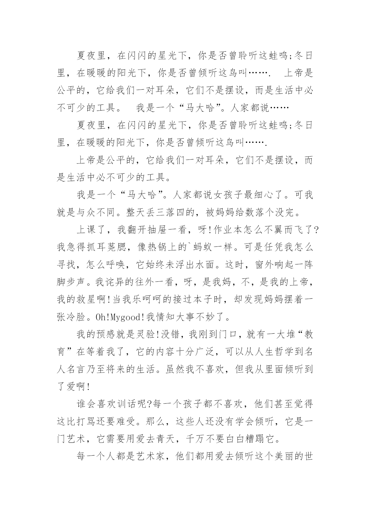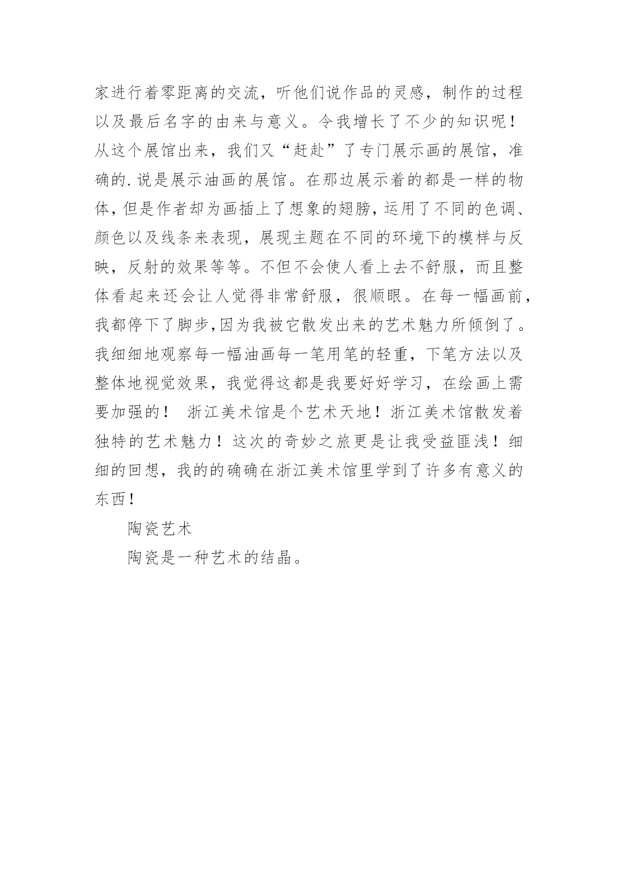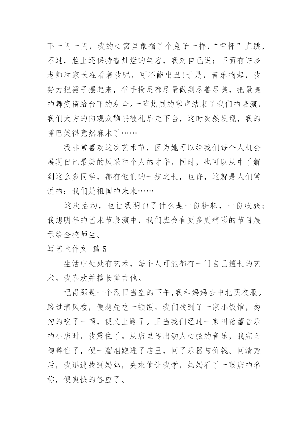 写艺术作文有关写艺术作文锦集六篇在学习、工作、生活中,大家都有写作文的经历,对作文很是熟悉吧,借助作文可以提高我们的语言组织能力。那要怎么写好作文呢?下面是小编精心整理的写艺术作文6篇,仅供参考,希望能够帮助到大家。写艺术作文篇1其实在我看来,读书就在于感受,一本书读下来之后,很多人都会强制性的写下一篇读后感,其实心中很杂很乱,一时半会也理不清思绪。如果在这时写下文章,很可能错误百出。其实不然,读完一本书,必定会有许多发自内心的感悟,那种感悟,不是用一般的文字语言能描述出来的,如果达不到那种艺术,反倒会侮辱了文章的本意。在这一方面的话,最好是等自我平静下来之后再慢慢构思!文章中艺术的真谛不在于运用华丽的.词藻,而是在于发自内心的那种真诚的东西。就算语言再平实,也能写的真实动人!只要到达这个水平文章才能写的真实感人。而且笔尖稍稍一动,一篇习作佳文就如流水般一样瞬间就写出来了。拥有这样的写作手法,才算真正到家了。其次,要懂得运用各种修辞手法,在适宜的地方添加适宜的修辞手法,让文章变得趣味横生,更加灵活巧妙!总之一句话:文章的艺术,难乎?难也!易乎?易也!写艺术作文篇2每个人都有自己喜欢的工艺品,我也不例外。我最喜欢的一件工艺品是一个小木偶。它不是别人送的,更不是买的,是我和妈妈一起设计,一针一线辛辛苦苦缝制的。几年以前,小木偶还是个会眨眼的布娃娃。现在我长大了,再玩布娃娃,人家见了会嘲笑我的!丢了吧,又太可惜。于是,我萌发了把布娃娃改成小木偶的主意。我把布娃娃的头和手剪下来,把妈妈做衣服多余的.布包上棉花作身子,最后缝上头和手。我只要用一只手操纵,就可以控制小木偶自如地活动了,当然,小木偶的眼睛依然会一眨一眨的。你看,小木偶戴着一顶天蓝色的帽子,多像一个小小的蓝精灵啊!它有两道弯弯的淡眉毛,一双炯炯有神的眼睛,把它放倒,它就闭上眼睛乖乖地“睡觉”。它的脸红扑扑的,半张着的嘴老挂着笑,可爱极了。上回,在一次小区活动中,我用小木偶和几个手偶表演了木偶戏,大家都喜欢这个节目。我为我的小木偶能给大家带来快乐感到自豪。小木偶在男孩子手中,加上铅笔做开枪动作,成了一名勇敢的战士;在女孩子手中,它就变了一个性格,会跳舞,会打手鼓。从这可爱的小木偶身上,我想:这木偶本没有生命,是操纵它的人赋予它生命和语言,使它有了感情。于是我又想到:劳动和智慧创造美,能为他人也为自己带来快乐。如果每个人都能为世界创造美,让我们的世界充满快乐,充满美丽,那该多好呀!写艺术作文篇3夏夜里,在闪闪的星光下,你是否曾聆听这蛙鸣;冬日里,在暖暖的阳光下,你是否曾倾听这鸟叫…….上帝是公平的,它给我们一对耳朵,它们不是摆设,而是生活中必不可少的工具。我是一个“马大哈”。人家都说……夏夜里,在闪闪的星光下,你是否曾聆听这蛙鸣;冬日里,在暖暖的阳光下,你是否曾倾听这鸟叫…….上帝是公平的,它给我们一对耳朵,它们不是摆设,而是生活中必不可少的工具。我是一个“马大哈”。人家都说女孩子最细心了。可我就是与众不同。整天丢三落四的,被妈妈给数落个没完。上课了,我翻开抽屉一看,呀!作业本怎么不翼而飞了?我急得抓耳荛腮,像热锅上的`蚂蚁一样。可是任凭我怎么寻找,怎么呼唤,它始终未浮出水面。这时,窗外响起一阵脚步声。我诧异的往外一看,呀,是我妈,不,是我的上帝,我的救星啊!当我乐呵呵的接过本子时,却发现妈妈摆着一张冷脸。Oh!Mygood!我情知大事不妙了。我的预感就是灵验!没错,我刚到门口,就有一大堆“教育”在等着我了,它的内容十分广泛,可以从人生哲学到名人名言乃至将来的生活。虽然我不喜欢,但我从里面倾听到了爱啊!谁会喜欢训话呢?每一个孩子都不喜欢,他们甚至觉得这比打骂还要难受。那么,这些人还没有学会倾听,它是一门艺术,它需要用爱去青天,千万不要白白糟蹋它。每一个人都是艺术家,他们都用爱去倾听这个美丽的世界,无论是蛙鸣,是鸟叫,还是……爱!写艺术作文篇4六月,百花盛开的季节;六月,和风吹佛,阳光灿烂;六月,也是我们的节日;这一天,我们学校举行了一次大型的艺术节表演。随着美妙的乐曲,帏幕徐徐升起,艺术节表演开始了。你看!从舞台的两边,慢慢的走出一对对穿和服的小姑娘,她们的舞姿各显其态,像风中的小花朵,婀娜多姿;当音乐变的高昂激烈时,她们摆动了腰肢,打开了一顶顶的小花伞,像雨中展开的小蘑菇,令人目不暇接。哦!原来她们是一(一)班的`小同学表演的节目。真是精彩!这时灯光突然变得昏暗,音乐节奏加快,一束红色的灯光打在台中央,一位穿这草编织的裙子,扎着无数条辫子的少女,随着音乐尽情地手舞足蹈。哦!原来她在跳非洲舞呢!这次艺术节表演,学校是从各年级,各班的汇演中挑选出来的,很多班都只选上了一个,而我们班很幸运,被选中了两个节目。“萨克斯”合奏与“拉丁舞”。我最喜欢的是我的钢琴独奏,可惜没有被学校选中