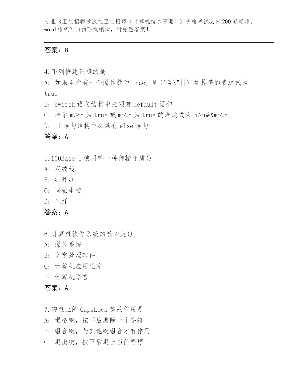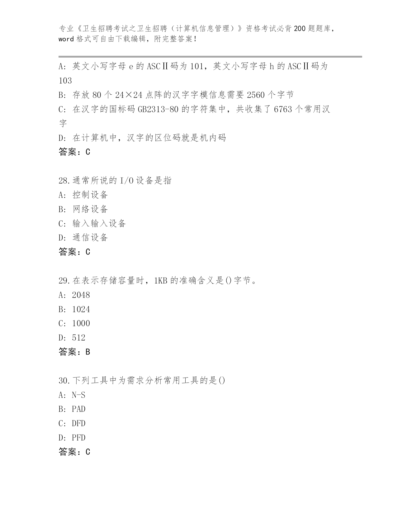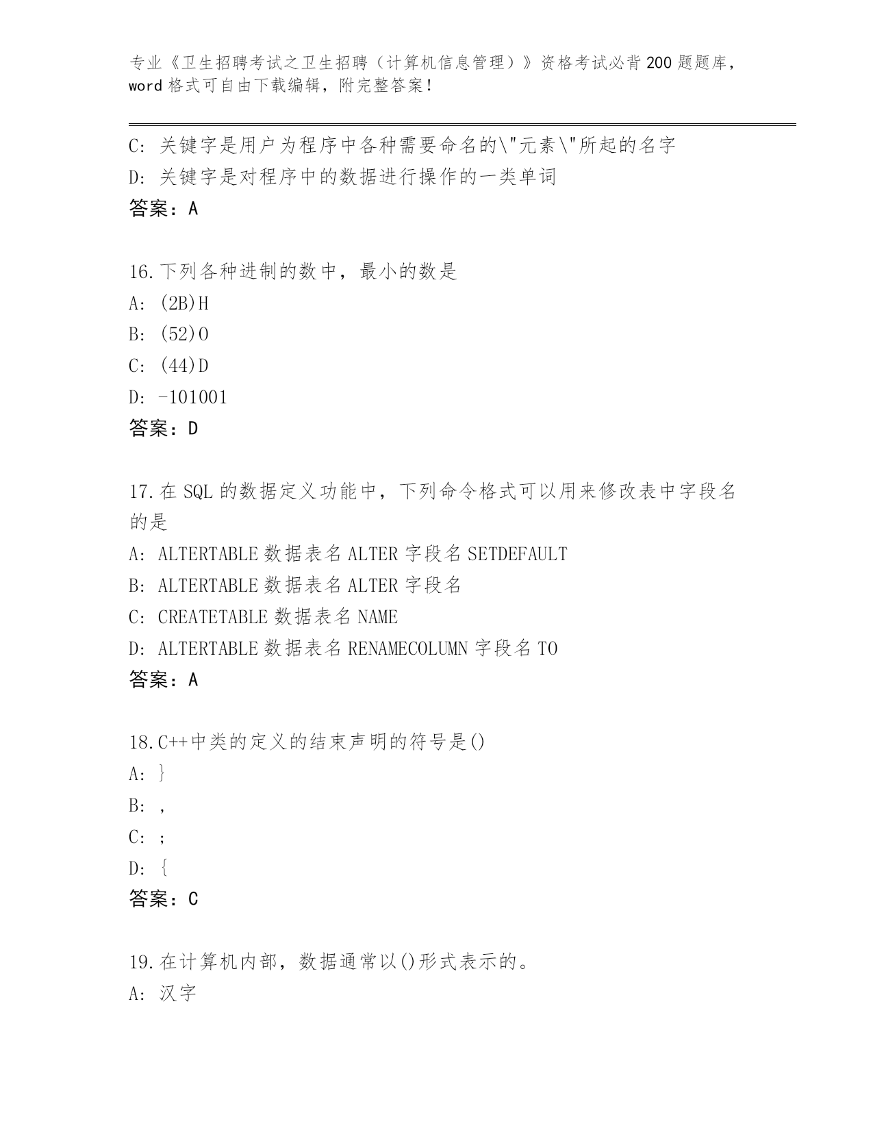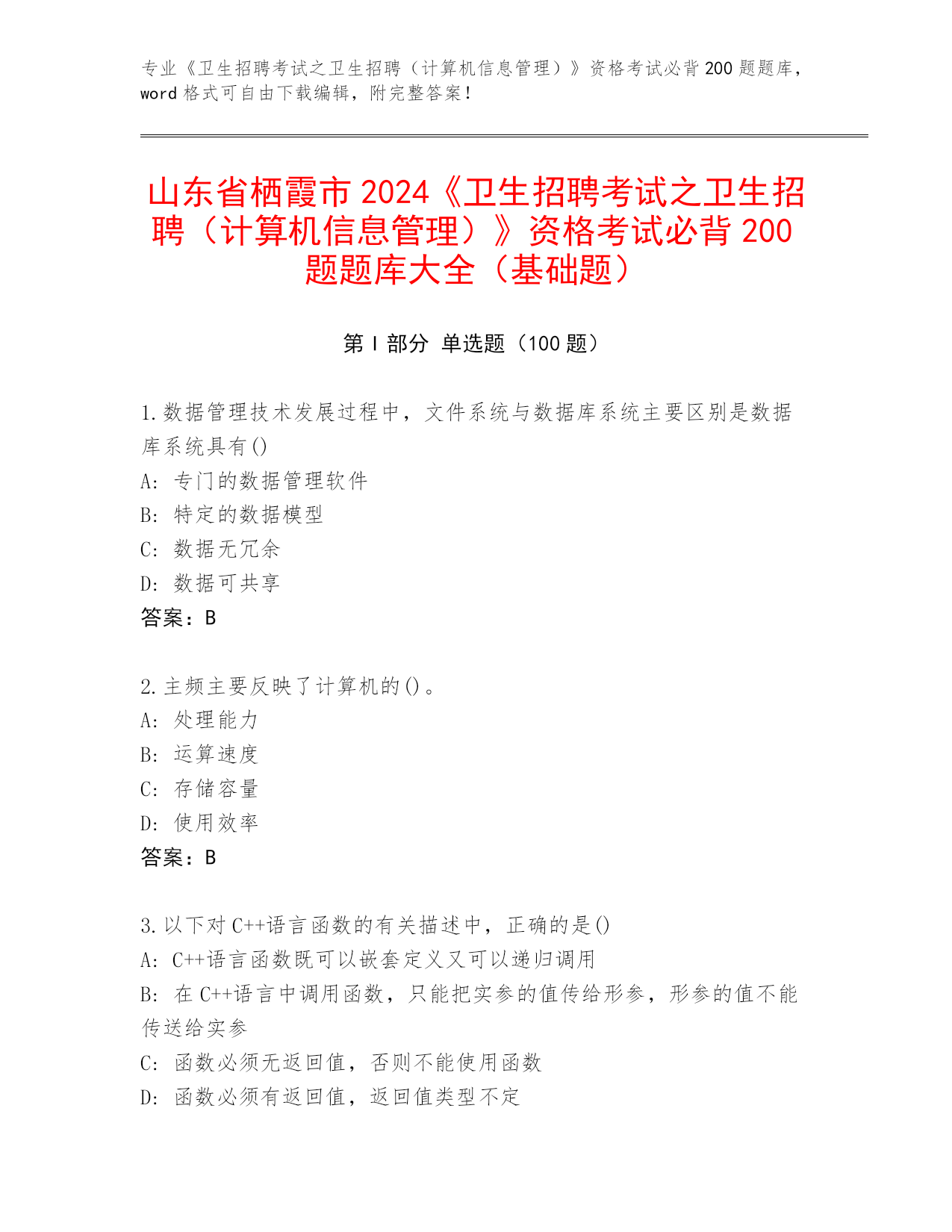 山东省栖霞市2024年《卫生招聘考试之卫生招聘(计算机信息管理)》资格考试必背200题题库含答案(最新)