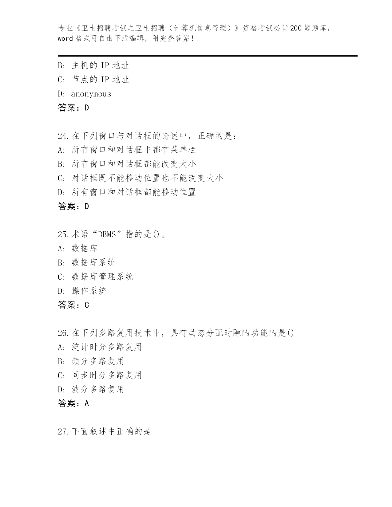 山东省栖霞市2024《卫生招聘考试之卫生招聘(计算机信息管理)》资格考试必背200题题库大全(基础题)