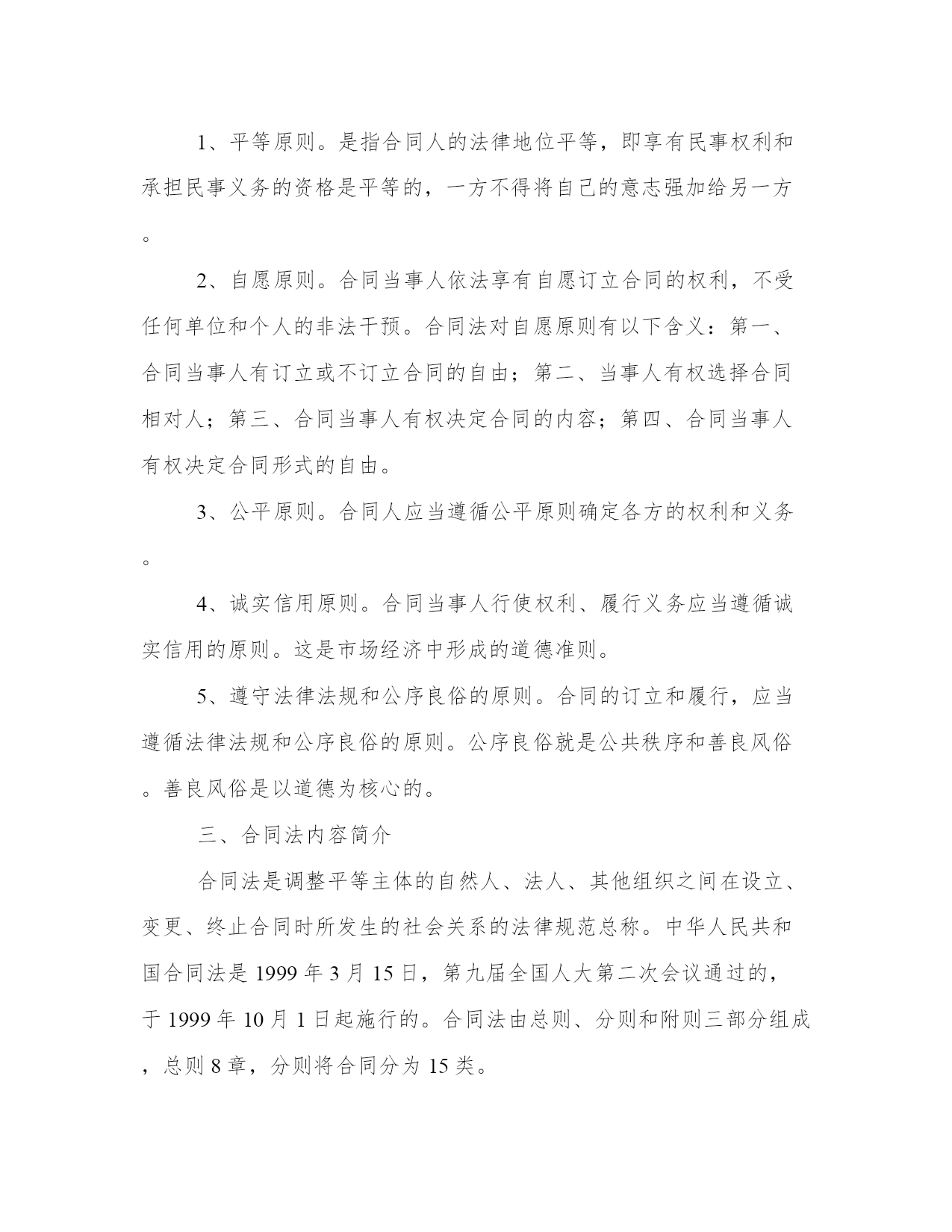 合同的概念讲义的内容第一节合同法概述一、合同的概念合同是平等主体的自然人、法人、其他组织之间设立、变更、终止民事权利义务关系的协议。各国的合同法规范的都是债权合同,它是市场经济条件下规范财产流转关系的基本依据,因此,合同是市场经济中广泛进行的法律行为。而广义的合同还应包括婚姻、收养、监护等有关身份关系的协议,以及劳动合同等,这些合同由其他法律进行规范.不属于我国合同法中规范的合同。在市场经济中,财产的流转主要依靠合同。特别是工程项目,标的大、履行时间长、协调关系多.合同尤为重要。因此,建筑市场中的各方主体,包括建设单位、勘察设计单位、施工单位、咨询单位、监理单位、材料设备供应单位等都要依靠合同确立相互之间的关系。合同作为一种协议,其本质是一种合意,必须是两个以上意思表示一致的民事法律行为。因此,合同的缔结必须由双方当事人协商一致才能成立。合同当事人作出的意思表示必须合法.这样才能具有法律约束力。合同中所确立的权利义务,必须是当事人依法可以享有的权利和能够承担的义务,这是合同具有法律效力的前提。二、合同法的基本原则:1、平等原则。是指合同人的法律地位平等,即享有民事权利和承担民事义务的资格是平等的,一方不得将自己的意志强加给另一方。2、自愿原则。合同当事人依法享有自愿订立合同的权利,不受任何单位和个人的非法干预。合同法对自愿原则有以下含义:第一、合同当事人有订立或不订立合同的自由;第二、当事人有权选择合同相对人;第三、合同当事人有权决定合同的内容;第四、合同当事人有权决定合同形式的自由。3、公平原则。合同人应当遵循公平原则确定各方的权利和义务。4、诚实信用原则。合同当事人行使权利、履行义务应当遵循诚实信用的原则。这是市场经济中形成的道德准则。5、遵守法律法规和公序良俗的原则。合同的订立和履行,应当遵循法律法规和公序良俗的原则。公序良俗就是公共秩序和善良风俗。善良风俗是以道德为核心的。三、合同法内容简介合同法是调整平等主体的自然人、法人、其他组织之间在设立、变更、终止合同时所发生的社会关系的法律规范总称。中华人民共和国合同法是1999年3月15日,第九届全国人大第二次会议通过的,于1999年10月1日起施行的。合同法由总则、分则和附则三部分组成,总则8章,分则将合同分为15类。