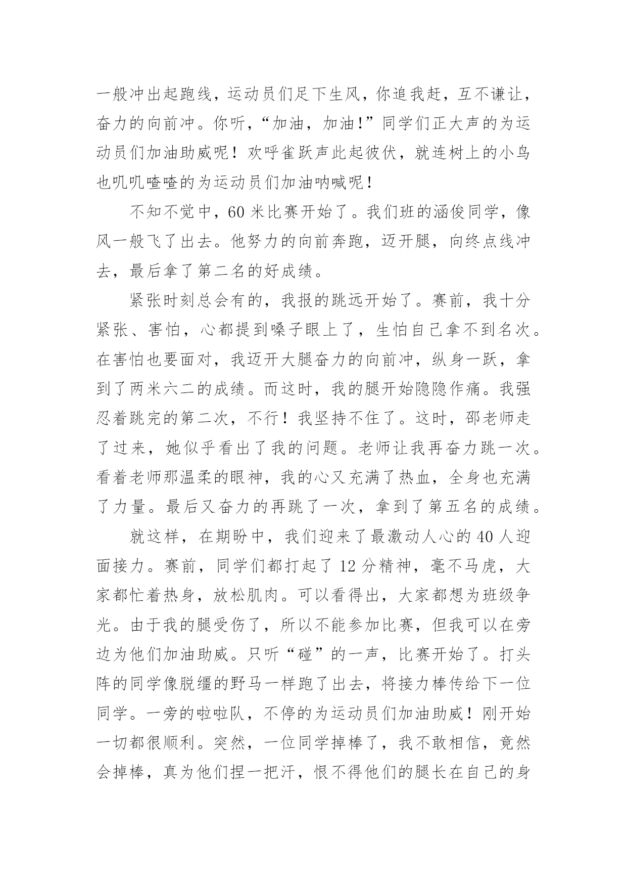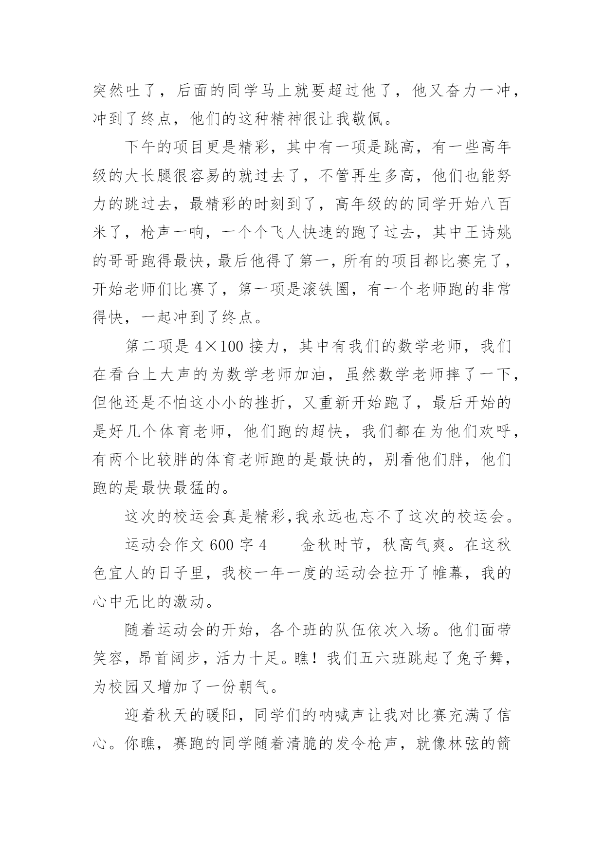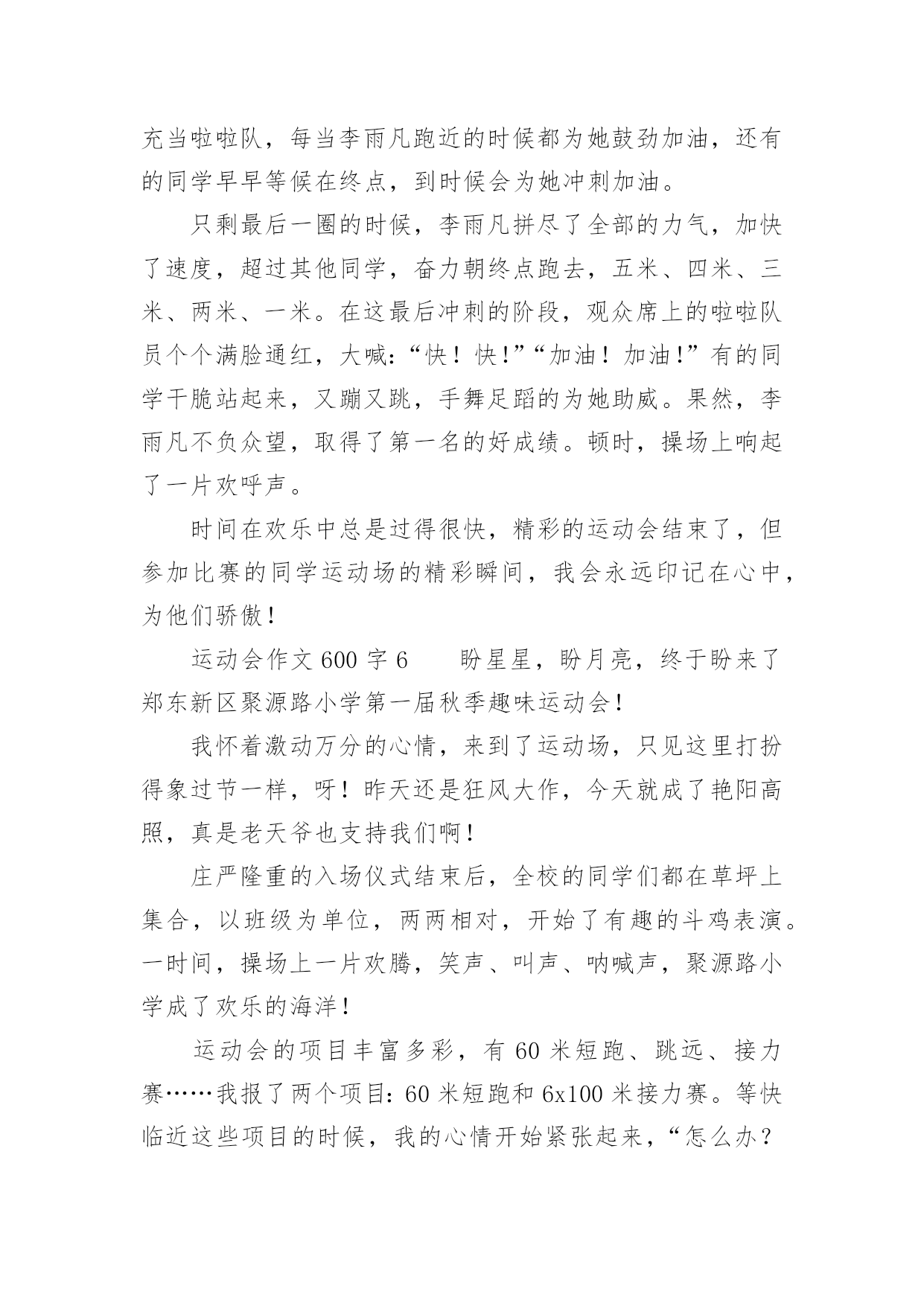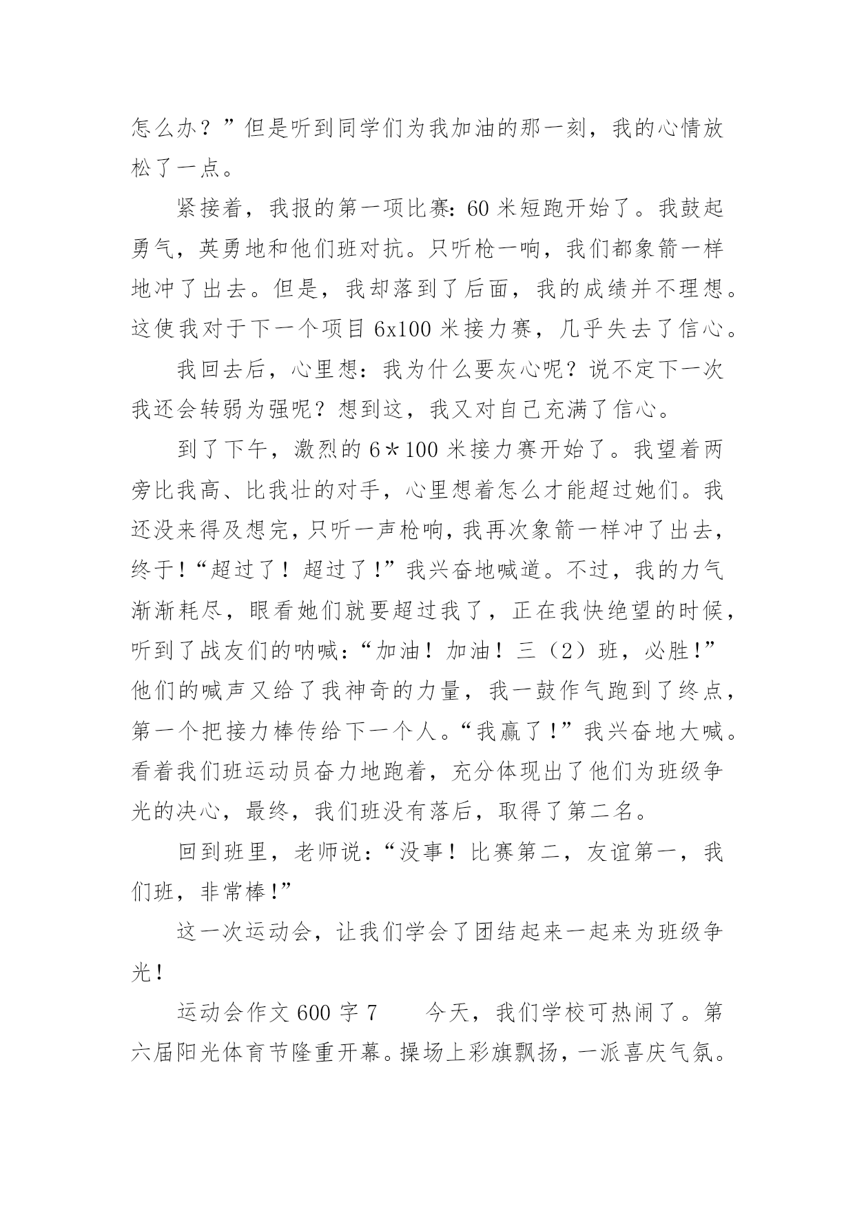运动会作文600字运动会作文600字作文的分类写作时限来分从作文的写作时限来分,作文可以分为限时作文和非限时作文。限时作文又可以分为课堂作文和考试作文两类。写作字数来分从作文的写作字数来分,作文可以分为限字作文和非限字作文。教育部的新课程标准在学生作文的字数上有了一定的要求,要想让学生在有限的文字中写出非同寻常的好作文,必须要在“想”上下功夫。写作命题来分从作文的写作命题来分,作文可以分为命题作文和非命题作文。命题作文,一般是指出题者给出一个既定的题目,要求应试者根据这个给定题目进行写作。运动会作文600字(精选31篇)在生活、工作和学习中,大家都经常接触到作文吧,借助作文可以宣泄心中的情感,调节自己的心情。那么一般作文是怎么写的呢?以下是小编帮大家整理的运运动会作文600字(精选31篇),希望对大家有所帮助。运动会作文600字1简短的开幕式,精彩、激烈、紧张的比赛在我的心中留下了深刻的印象。最令我记忆犹新的是20×50接力跑,因为我也参加了这个项目。比赛开始了,只听“砰”地一声枪响,第一棒的罗璐同学像一支离弦的箭一般冲了出去,只见她准确无误地把棒子传递给了下一个同学刘佳梦,她又传给了下一个同学,这时,我们已经超过2班了。到了,马上到我了。这时,我的心里像揣了一只小兔子似的,“通通”直跳,我紧张极了,生怕掉了棒,终于,前一个同学把棒传给了我,我一点也不敢犹豫,抓起棒就跑。在炮的路上,我听见了同学们在为我加油,这样,我就更不能给班级丢脸了,我使出吃奶的劲向前跑去,把棒递给了下一个同学。“呼”,我长长地吁出了一口气。接着,我和同学们一起,帮剩下的几名同学加油。到最后一棒啦,这时,我们依然遥遥领先2班,最后一棒是陈子豪同学,他的手臂上系着一根代表冲刺的红领巾,他飞快地往前跑去,他的脚下向像生了风一般,又与2班拉开一段距离。啊,他到达了终点,那一刻,我们全班沸腾了起来。不过,我们的成绩还要和其他班比一下。有一种胜利叫坚持,最振奋人心的就是1500米跑了。1500米,对于我来说是一个遥远的数字,想到它都会觉得颤栗。然而对于站在起跑线上的每一位女运动员来说,这将是她们将要面临的比赛。比赛开始了,罗璐冲在了最前边,我负责为她送水。我每隔一圈就为她拧开盖子,把水递给她,并不时地为她加油。终于,她来到了终点,在她跨入终点的那一霎那,她瘫坐在了地上,这时我的心中不由得一颤,到底是一股怎样的力量将她推上了1500米这一个漫长又富有挑战性的赛道呢?突然,我明白了,是坚定的毅力和无比巨大的勇气!啊,运动员们,我们为你们骄傲,我们为你们自豪!通过这次运动会,我明白了一个道理:我们的人生道路就像是运动场,需要的是拼搏和勇气,才能带着我们跨越心胜利的终点线。运动会作文600字2凉风飕飕,我校冬季综合性运动会隆重举行,运动会上到处洋溢着团结拼搏的气氛,留给师生永久的回味。运动会于12月17日下午1点整准时开幕。同学们首先以整齐的步伐、飒爽的风貌进入操场,展现新时代育诚学子健康向上的风采。在蒋志荣书记激情的发言后,紧接着是学校健美操队、舞蹈队的表演,同学们身着红色艳丽的健身操服装,合着优美强劲的节奏,表演了自编自创的健身操,刚劲有力的动作,精美的造型,精彩的表演不时激起同学们阵阵掌声,整个操场自始自终洋溢着欢快健康的气氛。本着比赛与友谊同为第一的思想,同学们积极参与到运动会的各项比赛活动中,选手们互相竞争,顽强拼搏。“叭”,发令枪响了,运动员们象箭一样朝前冲去。在激烈的田径赛场上,参赛学生无不奋力拼搏,赛出风格,赛出水平。这时跑道外立刻响起“加油,加油”的喊声,这响亮的声音在操场上空回荡,鼓励着运动员们奋力向前,赛场气氛一片欢腾。有些同学在赛道上摔倒后,只见他们仍然站起,奋起直追,虽然已落在了最后,但他们的这种精神仍是我们学习的榜样。在这样的活动中,同学们可以磨练钢铁的意志,练就强健的体魄。运动会上,老师的身影也成为运动会上一道亮丽的风景。平日里站在三尺讲台上的老师,篮球场上也毫不逊色。40分钟师生篮球对抗友谊赛给全校师生留下的耐久的回味,更是将整场冬季综合性运动会推向了高潮。校运会的时间是短暂的,但它给师生创造了一次可贵的平等、协作、交流的平台,贴近了师生的关系,它留给师生们的精神动力无疑是长远的。运动会作文600字3今天,我们又迎来了一年一度的校运会。早晨吃完饭,我们满心欢喜的来到了操场,在看台上做了下来,我参加的项目只有一个,就是沙包掷远,让我意想不到的是,第一个项目就是沙包掷远,我们直接去了操场的东北角,直接开始,安排好顺序以后,便开始了,轮到我的时候,我拽着沙包的一个角,用胳膊用力一投,投的非常的远,很多人都喊了:“哇!”的一声,后来我便回到了我的座位上,时间越来越长,阳光晒到我的身上,让我很热,我见别人班都喝冰红茶,我的很想喝,可是老师为了我们好