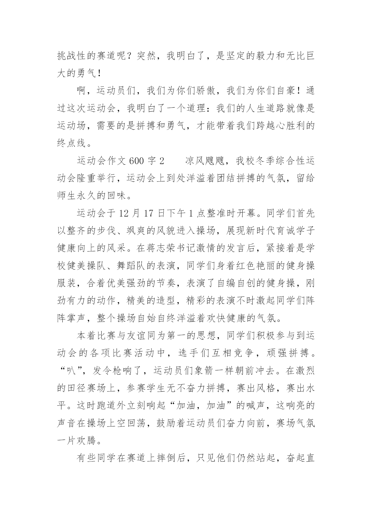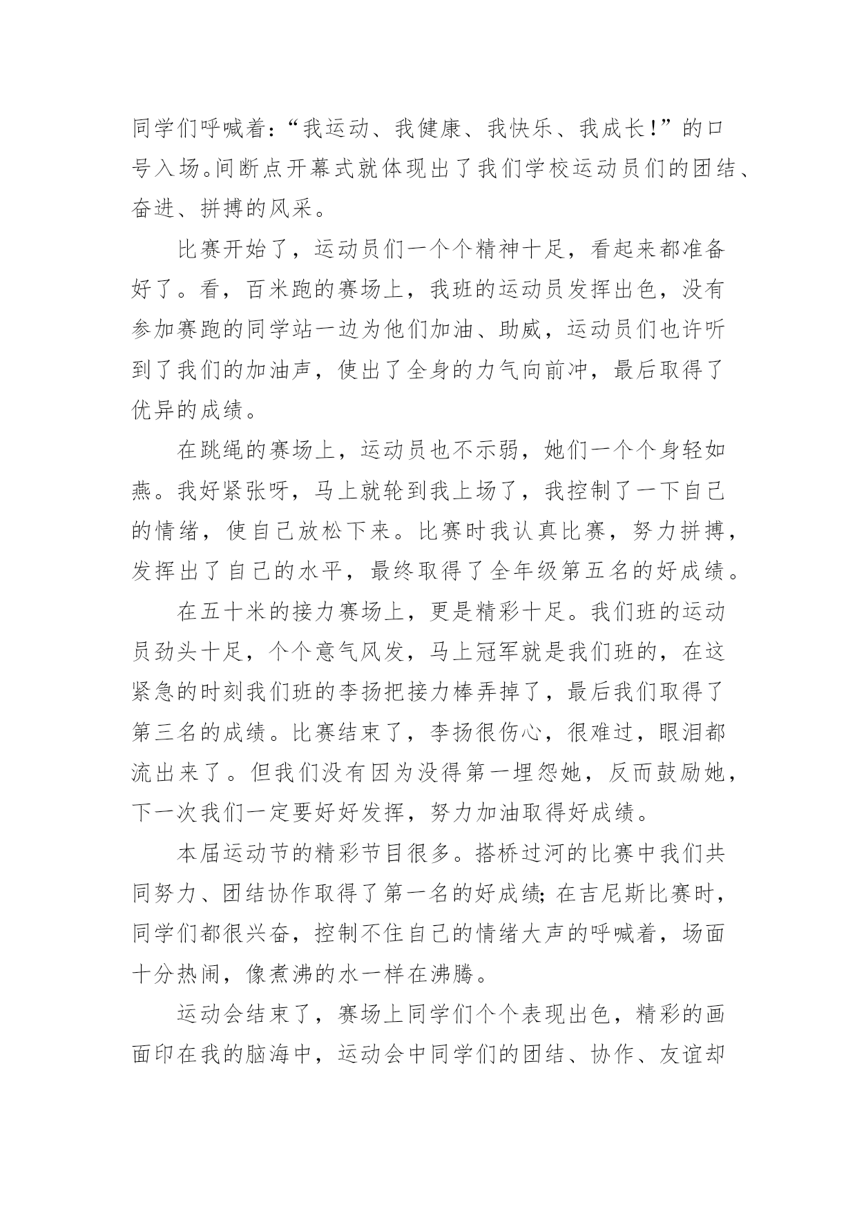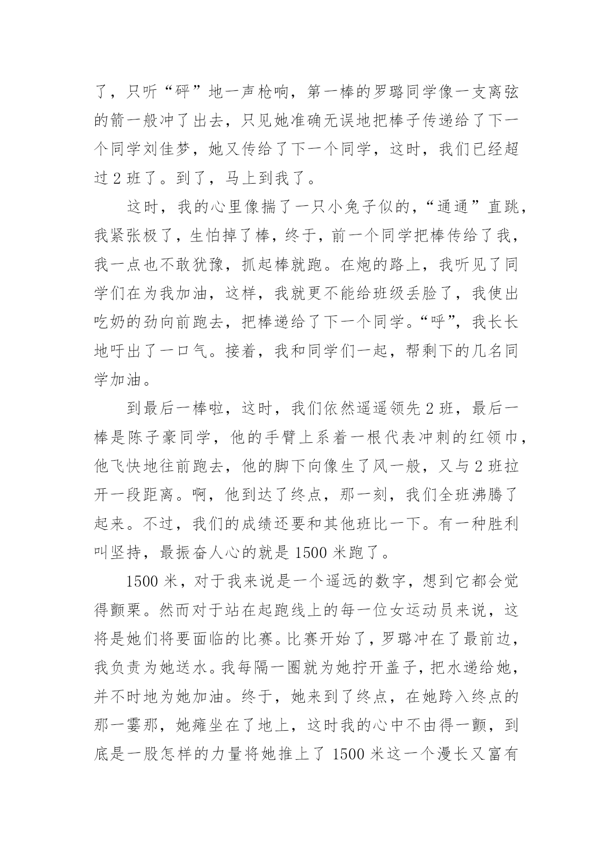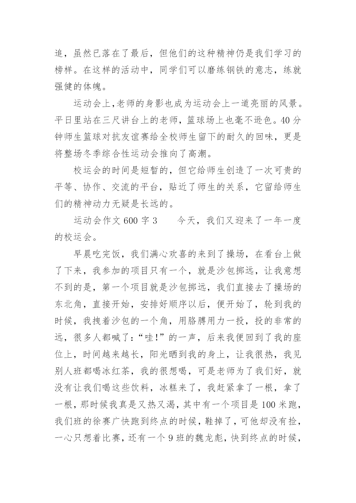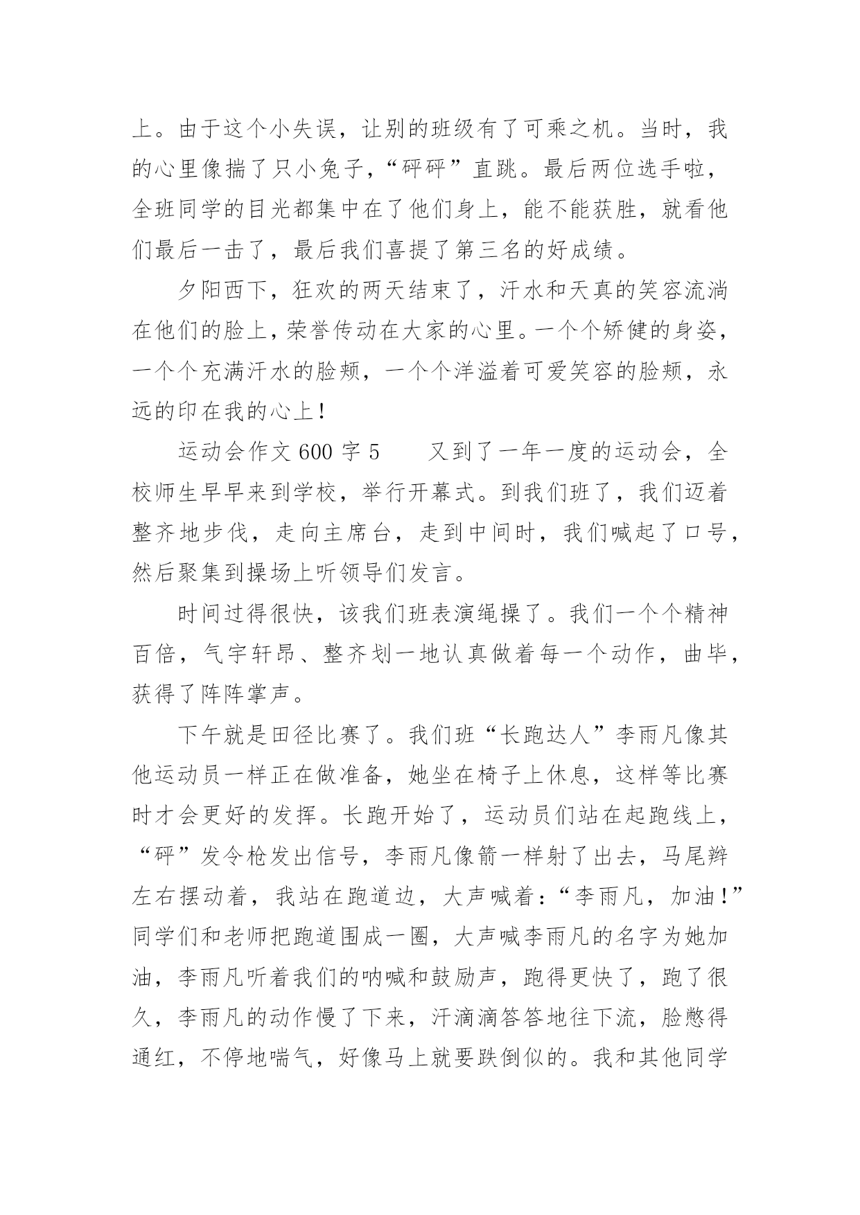运动会作文600字运动会作文600字作文的分类写作时限来分从作文的写作时限来分,作文可以分为限时作文和非限时作文。限时作文又可以分为课堂作文和考试作文两类。写作字数来分从作文的写作字数来分,作文可以分为限字作文和非限字作文。教育部的新课程标准在学生作文的字数上有了一定的要求,要想让学生在有限的文字中写出非同寻常的好作文,必须要在“想”上下功夫。写作命题来分从作文的写作命题来分,作文可以分为命题作文和非命题作文。命题作文,一般是指出题者给出一个既定的题目,要求应试者根据这个给定题目进行写作。运动会作文600字(精选31篇)在生活、工作和学习中,大家都经常接触到作文吧,借助作文可以宣泄心中的情感,调节自己的心情。那么一般作文是怎么写的呢?以下是小编帮大家整理的运运动会作文600字(精选31篇),希望对大家有所帮助。运动会作文600字1简短的开幕式,精彩、激烈、紧张的比赛在我的心中留下了深刻的印象。最令我记忆犹新的是20×50接力跑,因为我也参加了这个项目。比赛开始了,只听“砰”地一声枪响,第一棒的罗璐同学像一支离弦的箭一般冲了出去,只见她准确无误地把棒子传递给了下一个同学刘佳梦,她又传给了下一个同学,这时,我们已经超过2班了。到了,马上到我了。这时,我的心里像揣了一只小兔子似的,“通通”直跳,我紧张极了,生怕掉了棒,终于,前一个同学把棒传给了我,我一点也不敢犹豫,抓起棒就跑。在炮的路上,我听见了同学们在为我加油,这样,我就更不能给班级丢脸了,我使出吃奶的劲向前跑去,把棒递给了下一个同学。“呼”,我长长地吁出了一口气。接着,我和同学们一起,帮剩下的几名同学加油。到最后一棒啦,这时,我们依然遥遥领先2班,最后一棒是陈子豪同学,他的手臂上系着一根代表冲刺的红领巾,他飞快地往前跑去,他的脚下向像生了风一般,又与2班拉开一段距离。啊,他到达了终点,那一刻,我们全班沸腾了起来。不过,我们的成绩还要和其他班比一下。有一种胜利叫坚持,最振奋人心的就是1500米跑了。1500米,对于我来说是一个遥远的数字,想到它都会觉得颤栗。然而对于站在起跑线上的每一位女运动员来说,这将是她们将要面临的比赛。比赛开始了,罗璐冲在了最前边,我负责为她送水。我每隔一圈就为她拧开盖子,把水递给她,并不时地为她加油。终于,她来到了终点,在她跨入终点的那一霎那,她瘫坐在了地上,这时我的心中不由得一颤,到底是一股怎样的力量将她推上了1500米这一个漫长又富有挑战性的赛道呢?突然,我明白了,是坚定的毅力和无比巨大的勇气!啊,运动员们,我们为你们骄傲,我们为你们自豪!通过这次运动会,我明白了一个道理:我们的人生道路就像是运动场,需要的是拼搏和勇气,才能带着我们跨越心胜利的终点线。运动会作文600字2凉风飕飕,我校冬季综合性运动会隆重举行,运动会上到处洋溢着团结拼搏的气氛,留给师生永久的回味。运动会于12月17日下午1点整准时开幕。同学们首先以整齐的步伐、飒爽的风貌进入操场,展现新时代育诚学子健康向上的风采。在蒋志荣书记激情的发言后,紧接着是学校健美操队、舞蹈队的表演,同学们身着红色艳丽的健身操服装,合着优美强劲的节奏,表演了自编自创的健身操,刚劲有力的动作,精美的造型,精彩的表演不时激起同学们阵阵掌声,整个操场自始自终洋溢着欢快健康的气氛。本着比赛与友谊同为第一的思想,同学们积极参与到运动会的各项比赛活动中,选手们互相竞争,顽强拼搏。“叭”,发令枪响了,运动员们象箭一样朝前冲去。在激烈的田径赛场上,参赛学生无不奋力拼搏,赛出风格,赛出水平。这时跑道外立刻响起“加油,加油”的喊声,这响亮的声音在操场上空回荡,鼓励着运动员们奋力向前,赛场气氛一片欢腾。有些同学在赛道上摔倒后,只见他们仍然站起,奋起直追,虽然已落在了最后,但他们的这种精神仍是我们学习的榜样。在这样的活动中,同学们可以磨练钢铁的意志,练就强健的体魄。运动会上,老师的身影也成为运动会上一道亮丽的风景。平日里站在三尺讲台上的老师,篮球场上也毫不逊色。40分钟师生篮球对抗友谊赛给全校师生留下的耐久的回味,更是将整场冬季综合性运动会推向了高潮。校运会的时间是短暂的,但它给师生创造了一次可贵的平等、协作、交流的平台,贴近了师生的关系,它留给师生们的精神动力无疑是长远的。运动会作文600字3今天,我们又迎来了一年一度的校运会。早晨吃完饭,我们满心欢喜的来到了操场,在看台上做了下来,我参加的项目只有一个,就是沙包掷远,让我意想不到的是,第一个项目就是沙包掷远,我们直接去了操场的东北角,直接开始,安排好顺序以后,便开始了,轮到我的时候,我拽着沙包的一个角,用胳膊用力一投,投的非常的远,很多人都喊了:“哇!”的一声,后来我便回到了我的座位上,时间越来越长,阳光晒到我的身上,让我很热,我见别人班都喝冰红茶,我的很想喝,可是老师为了我们好