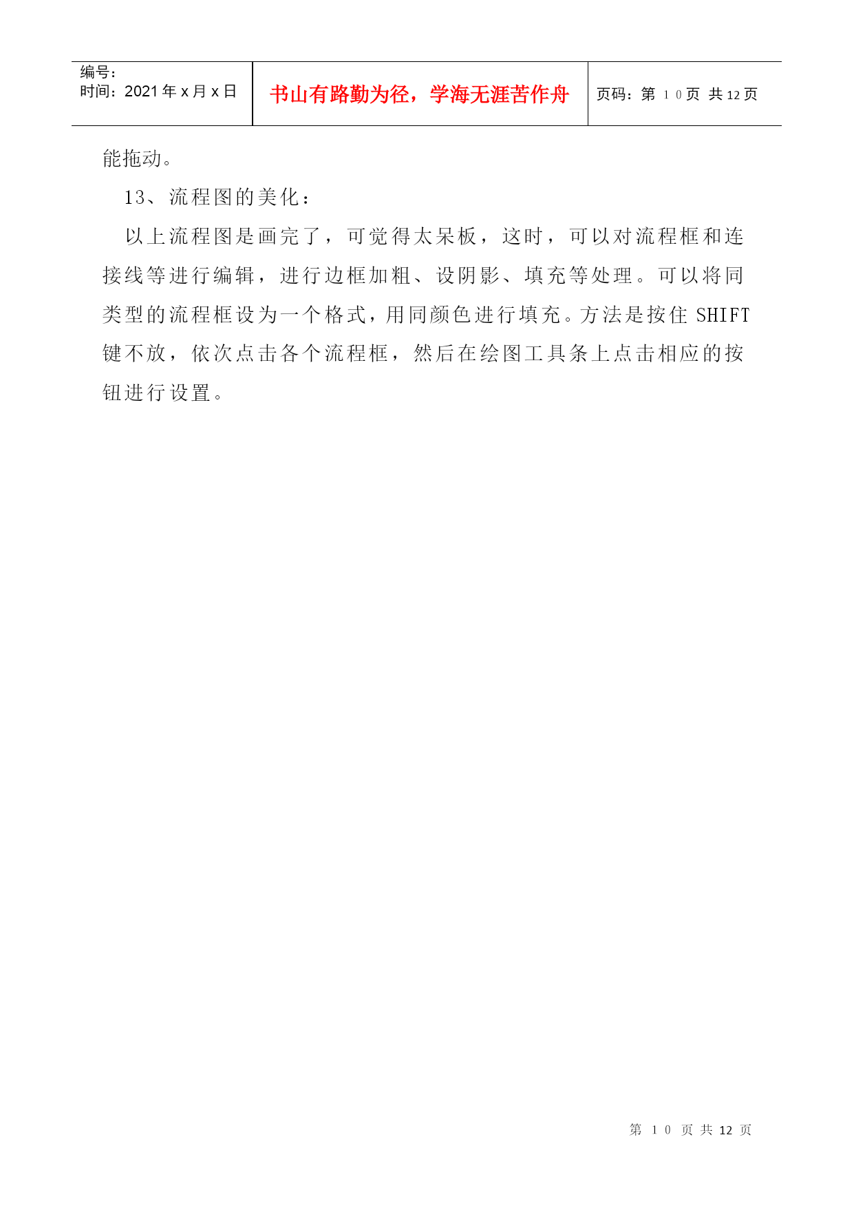 编号:时间:2021年x月x日书山有路勤为径,学海无涯苦作舟页码:第PAGE12页共NUMPAGES12页第PAGE\*MERGEFORMAT12页共NUMPAGES\*MERGEFORMAT12页手把手教你绘制施工工艺流程图在标书编制或者施工方案编写工作中,我们常常会需要绘制施工工艺流程图。如果使用比较经典的流程图绘制工具,比如Visio,可能会觉得比较麻烦,而且也不容易与Word文档一起排版。这时你可能会采用Word自带的流程图绘图工具来绘制流程图。但是,Word的早期版本,即使是Word2000在流程图的绘制,尤其是修改方面都是非常麻烦的。我们常常需要在线条的对准等细节问题上耗费大量的时间。在网上看到很多网友上传的流程图不是很规范,主要反应在以下几方面:不符合工艺的实际流程。逻辑关系混乱,不是逻辑关系不全就是逻辑关系错误。很多网友绘制流程图使用的是文本框加箭头的方式绘制,在排版上不美观,文本框大小不一,不整齐。那么有没有更好的办法使画出来的工艺流程图既美观又快捷呢?有,在OfficeXP以上的版本在流程图的绘制方面引入了Visio的很多绘图工具,比如连接符。这时的流程图的绘制比以前方便了许多,也容易了许多。这里,就详细介绍一下使用Word2003绘制流程图的方法。1、首先在“绘图”工具栏上,单击“自选图形”,指向“流程图”,再单击所需的形状。注:流程图中的各种形状主要程序编程流程图的形状,多数形状对于我们工程上的工艺流程图用处不是很大,概括起来,可用的就四种,分别是“过程”、“决策”、“终止”、“准备”四种。2、单击要绘制流程图的位置。此时你会发现,在页面上出现了如下图所示的虚框。这是什么?以前的版本好像没这东东啊。是,这是Word2003新增功能之一的绘图画布。绘图画布是在创建图形对象(例如自选图形和文本框)时产生的。它是一个区域,可在该区域上绘制多个形状。因为形状包含在绘图画布内,所以它们可作为一个单元移动和调整大小。明白吧,这个绘图画布可帮助您排列并移动多个图形,当图形对象包括几个图形时这个功能会很有帮助。还记得以前要在Word中排列、移动一组图形的麻烦吗?有了绘图画布,这些烦恼就不再困扰你了。绘图画布还在图形和文档的其他部分之间提供一条类似框架的边界。在默认情况下,绘图画布没有背景或边框,但是如同处理图形对象一样,可以对绘图画布应用格式。3、在绘图画布上插入你选择的那个图形。就像这样,插入一个凌形。4、若要向流程图中添加额外的形状,请重复步骤1到3,再按所需的顺序对其进行排列。如果绘图画布太小,没办法把所有你要画的流程图放进去怎么办?没关系你可以调整它的大小。点击画布,看到上图的绘图画布周围比较粗的几个小线条了吗?选择它们,你可以任意的增大或者缩小绘图画布了。5、我们一遍遍的重复步骤1到3,画出了如下图所示的流程图的基本框架。6、接下来,要做什么呢?既然是流程图,自然是要建立各种图形之间的连接了。这里我们使用Word2003提供的一个非常好用的自选图形——连接符来建立连接。什么是连接符?你希望使用线条来连接形状并保持它们之间的连接吗?这就是连接符的作用。连接符看起来像线条,但是它将始终与其附加到的形状相连。也就是说,无论你怎样拖动各种形状,只要它们是以连接符相连的,就会始终连在一起。在Word2003提供了两种类型共九种线型的连接符用于连接对象:直线、肘形线(带角度)和曲线。基中一种是带箭头的连接线,一种是不带箭头的连接线,我们用的多的是带箭头的连接线。选择连接符自选图形后,将鼠标指针移动到对象上时,会在其上显示蓝色连接符位置。这些点表示可以附加连接符线的位置。7、我们首先用带箭头的肘形线连接符将图形连接到一起,如图。1234你可以随意移动流程框了,你会发现,无论你将它移动到什么地方,连接线始终没有离开流程框。咦,怎么中间两个流程框1和3没有对齐?不用急,这时,你可以先框选流程框1和3,然后选择“绘图”工具条上的“对齐或分布”,再选择“水平居中”即可。对齐后的效果如下图所示,连接线和流程框均已对齐。12348、当然,你也可能发现有一条连接符连接错了地方,需要调整一下。该怎么做呢?你需要先解除连接符的锁定。具体操作方法是:(1)移动连接符的任一端点(对,就是那个红色的端点),则该端点将解除锁定或从对象中分离。(2)然后可以将其锁定到同一对象上的其他连接位置。9、接下来,我们需要在图形中添加文字。用鼠标右键单击形状,单击“添加文字”并开始键入。可以使用文档的排版工具对文字进行居中、字体、颜色等属性修改。需要注意的是,在Word2003中不能向线段或连接符上添加文字,但可以使用文