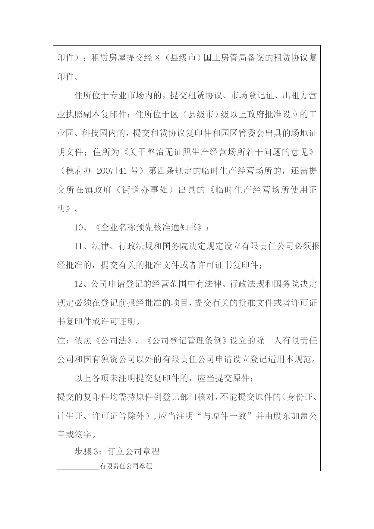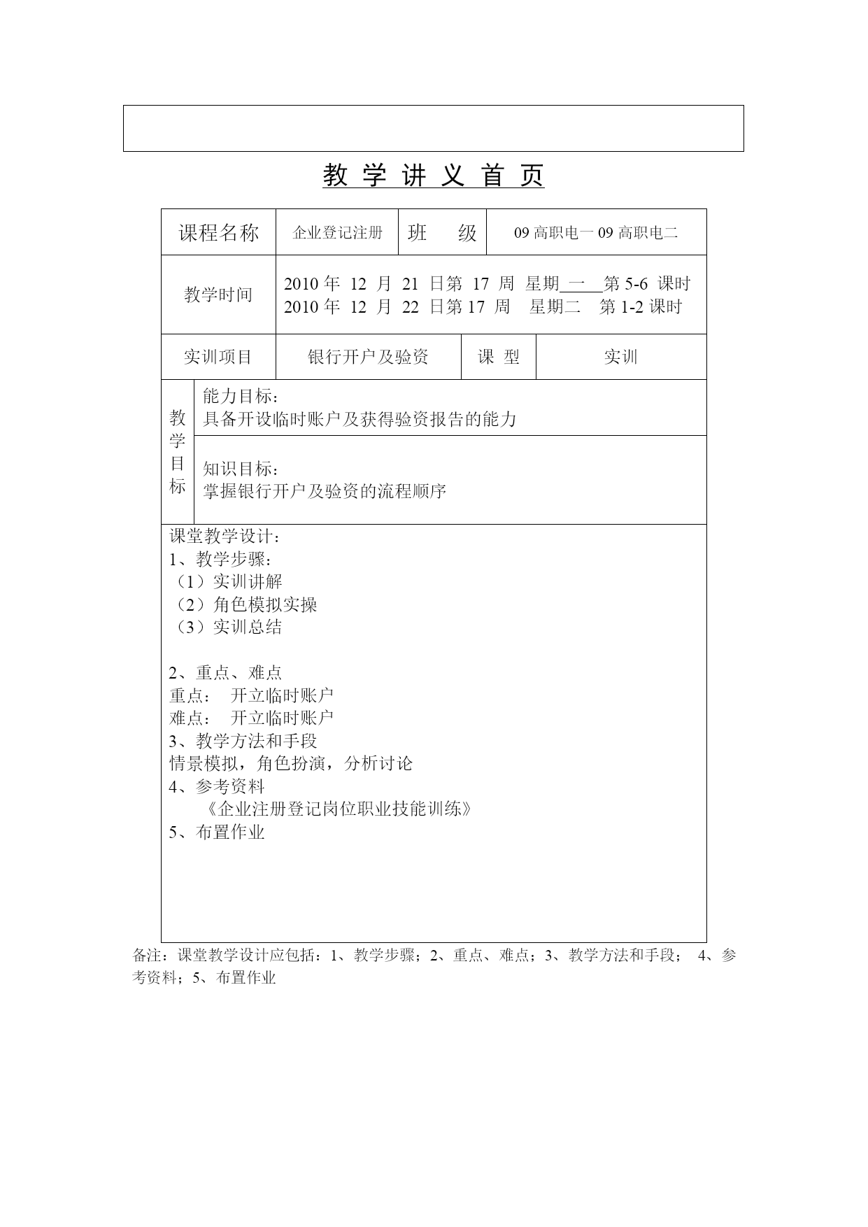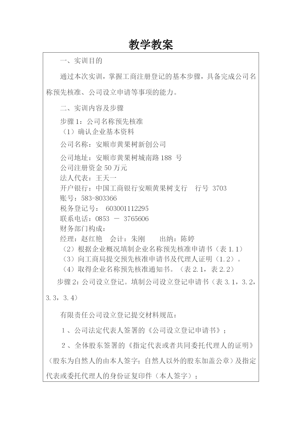 教学讲义首页课程名称企业登记注册班级09高职电一09高职电二教学时间2010年12月21日第17周星期一第1-4课时实训项目工商注册登记课型实训教学目标能力目标:具备工商登记表格填制及流程实现的能力知识目标:掌握工商注册登记的基本步骤课堂教学设计:1、教学步骤:(1)实训讲解(2)角色模拟实操(3)实训总结2、重点、难点重点:公司设立登记难点:公司设立登记3、教学方法和手段情景模拟,角色扮演,分析讨论4、参考资料《企业注册登记岗位职业技能训练》5、布置作业备注:课堂教学设计应包括:1、教学步骤;2、重点、难点;3、教学方法和手段;4、参考资料;5、布置作业教学教案一、实训目的通过本次实训,掌握工商注册登记的基本步骤,具备完成公司名称预先核准、公司设立申请等事项的能力。二、实训内容及步骤步骤1:公司名称预先核准(1)确认企业基本资料公司名称:安顺市黄果树新创公司公司地址:安顺市黄果树城南路188号公司注册资金50万元法人代表:王天一开户银行:中国工商银行安顺黄果树支行行号3703账号:583-803366税务登记号:603001112295联系电话:0853-3765606财务部门构成:经理:赵红艳会计:朱刚出纳:陈婷(2)根据企业概况填制企业名称预先核准申请书(表1.1)(3)向工商局提交预先核准申请书及代理人证明(1.2)。(4)取得企业名称预先核准通知书。(表2.1,表2.2)步骤2:公司设立登记。填制公司设立登记申请书(表3.1,3.2,3.3,3.4)有限责任公司设立登记提交材料规范:1、公司法定代表人签署的《公司设立登记申请书》;2、全体股东签署的《指定代表或者共同委托代理人的证明》(股东为自然人的由本人签字;自然人以外的股东加盖公章)及指定代表或委托代理人的身份证复印件(本人签字);应标明具体委托事项、被委托人的权限、委托期限。3、全体股东签署的公司章程(股东为自然人的由本人签字;自然人以外的股东加盖公章);4、股东的主体资格证明或者自然人身份证明复印件;股东为企业的,提交营业执照副本复印件;股东为事业法人的,提交事业法人登记证书复印件;股东人为社团法人的,提交社团法人登记证复印件;股东为民办非企业单位的,提交民办非企业单位证书复印件;股东为自然人的,提交身份证复印件。5、依法设立的验资机构出具的验资证明;6、股东首次出资是非货币财产的,提交已办理财产权转移手续的证明文件;7、董事、监事和经理的任职文件及身份证明复印件;依据《公司法》和公司章程的规定和程序,提交股东会决议、董事会决议或其他相关材料。股东会决议由股东签署(股东为自然人的由本人签字;自然人以外的股东加盖公章),董事会决议由董事签字。8、法定代表人任职文件及身份证明复印件;根据《公司法》和公司章程的规定和程序,提交股东会决议、董事会决议或其他相关材料。股东会决议由股东签署(股东为自然人的由本人签字;自然人以外的股东加盖公章),董事会决议由董事签字。9、住所使用证明;住所用途应与其规划用途相符。自有房产提交房屋产权证复印件(有关房屋未取得房屋产权证的,提交房地产管理部门的权属证明或《建筑工程规划验收合格证》、购房合同及派出所编定门牌的证明复印件);租赁房屋提交经区(县级市)国土房管局备案的租赁协议复印件。住所位于专业市场内的,提交租赁协议、市场登记证、出租方营业执照副本复印件;住所位于区(县级市)级以上政府批准设立的工业园、科技园内的,提交租赁协议复印件和园区管委会出具的场地证明文件;住所为《关于整治无证照生产经营场所若干问题的意见》(穗府办[2007]41号)第四条规定的临时生产经营场所的,还需提交所在镇政府(街道办事处)出具的《临时生产经营场所使用证明》。10、《企业名称预先核准通知书》;11、法律、行政法规和国务院决定规定设立有限责任公司必须报经批准的,提交有关的批准文件或者许可证书复印件;12、公司申请登记的经营范围中有法律、行政法规和国务院决定规定必须在登记前报经批准的项目,提交有关的批准文件或者许可证书复印件或许可证明。注:依照《公司法》、《公司登记管理条例》设立的除一人有限责任公司和国有独资公司以外的有限责任公司申请设立登记适用本规范。以上各项未注明提交复印件的,应当提交原件;提交的复印件均需持原件到登记部门核对,不能提交原件的(身份证、计生证、许可证等除外),应当注明“与原件一致”并由股东加盖公章或签字。步骤3:订立公司章程_____________有限责任公司章程第一章总则第一条依据《中华人民共和国公司法》(以下简称《公司法》及其他有关法律、行政法规的规定,由_____出资设立“______有