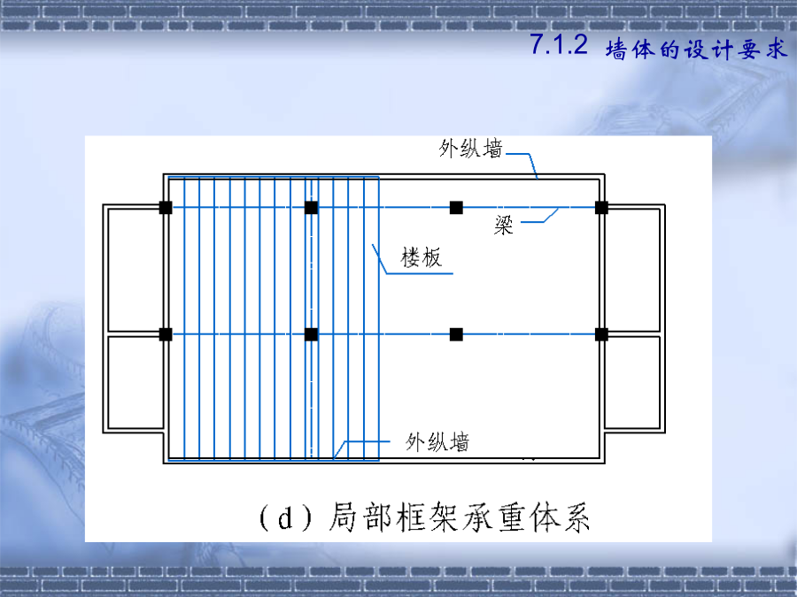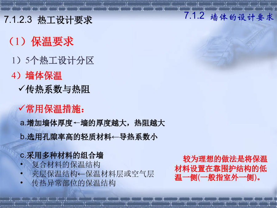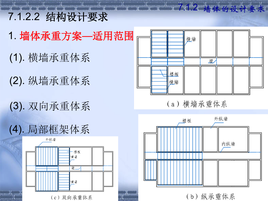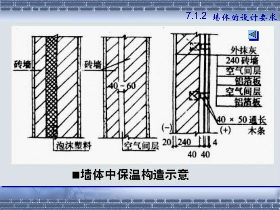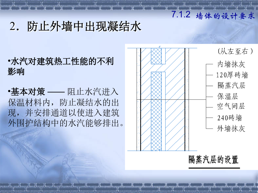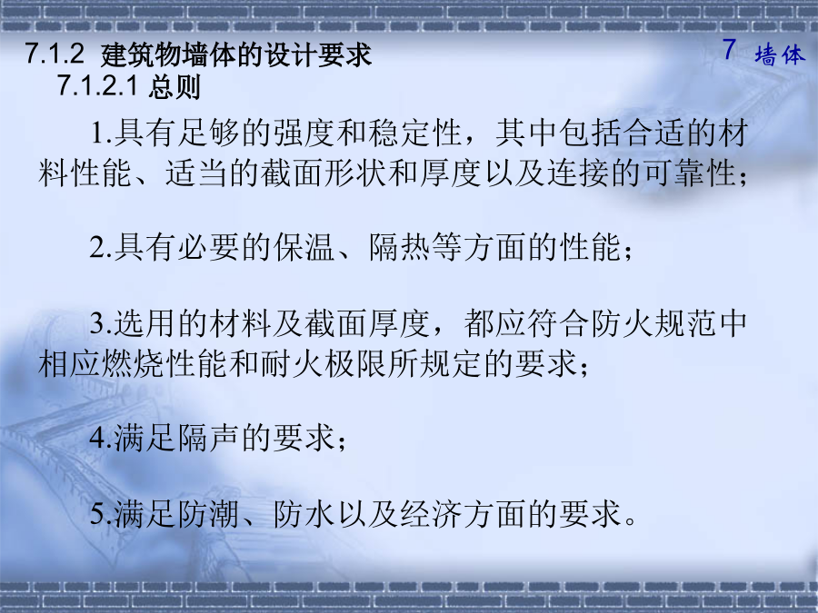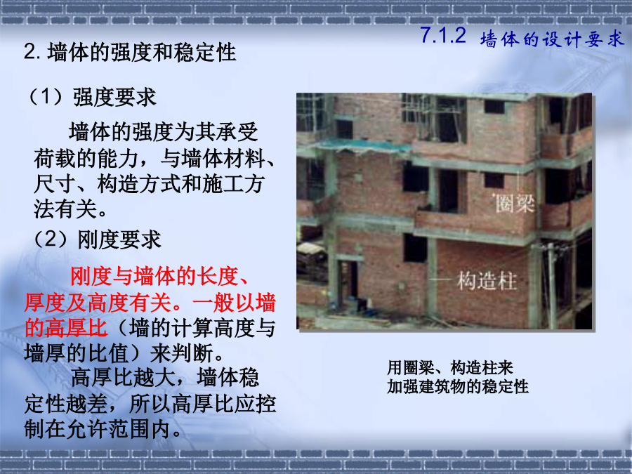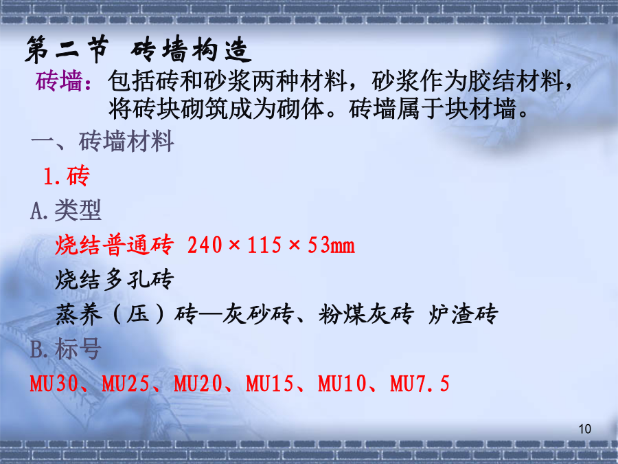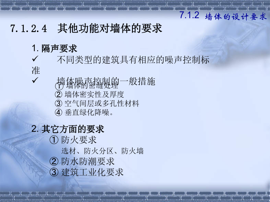 第七章墙体7.1.2建筑物墙体的设计要求(1).横墙承重体系2.墙体的强度和稳定性(1)保温要求7.1.2墙体的设计要求水汽对建筑热工性能的不利影响基本对策——阻止水汽进入保温材料内,防止凝结水的出现,并安排通道以使进入建筑外围护结构中的水汽能够排出。2.其它方面的要求①防火要求选材、防火分区、防火墙②防水防潮要求③建筑工业化要求第二节砖墙构造2.砂浆—粘结材料B.类型:水泥砂浆混合砂浆石灰砂浆C.标号M15、M10、M7.5、M5、M2.5、M1、M0.4强度—砂浆为刚性材料,主要考虑抗压强度。其强度等级分为:M0.4、M1.0、M2.5、M5.0、M7.5、M10、M15等7个等级。水泥砂浆的强度和防水性能要高于混合砂浆;混合砂浆的和易性优于水泥砂浆。±0.00以下用水泥砂浆砌筑,±0.00以上用混合砂浆砌筑。二、砖墙的组砌方式组砌原则—砖缝横平竖直、错缝搭接、避免通缝砂浆饱满、厚薄均匀1.实砌砖墙:常用组砌方式及厚度(P119图7-7)全顺式---115mm、178mm每皮一顺一丁式---240mm、365mm上下皮一顺一丁式----240mm、365mm多顺一丁式---240mm、370mm2.空体墙:3.组合墙:2.空体墙(空斗墙、空心墙)1)空斗砖墙的组砌方式②洞口尺寸砖墙洞口主要是指门窗洞口一般门窗洞口宽、高的尺寸采用300mm的倍数,但是在1000mm以内的小洞口可采用基本模数100mm的倍数。四、砖墙细部构造2.墙身防潮墙身防潮的方法是在墙身铺设防潮层,防止土壤和地面水渗入砖墙体。防潮层的位置:与地面垫层所用材料有关。P122防潮层的做法:(刚性防潮和柔性防潮)19(3)散水和明沟1)散水的构造做法明沟构造做法特点:砖砌挑窗台施工简单,应用广泛。预制混凝土挑窗台施工速度快,使用较广。构造要点:悬挑窗台向外出挑60mm;窗台长度每边应超过窗宽120mm;窗台表面及窗下槛交接处应考虑防、排水处理;窗台下应做滴水引导雨水垂直下落不致影响窗下墙面门窗过梁的形式:(四)墙身加固原因:集中荷载、开洞以及地震等因素影响1.增设壁柱和门垛A.壁柱条件:窗间墙向出现集中荷载,而墙厚又不足或者墙体的长度和高度超过一定限度尺寸:一般为120mm×370mm,240×370,240×490等等,以砖模数为准。26圈梁位置:圈梁宜连续地设在同一水平面上,并形成封闭状态。圈梁必须与构造柱连通房屋各部分刚度均衡附加圈梁的增设——设于连接构造比较薄弱,易于产生应力集中的部位,如房屋转角、楼梯间四角、有错层处。类型1砌块的类型与规格按不同尺寸和质量的大小:使用中以中小型砌块居多。小型砌块:高度为115mm—380mm中型砌块:高度为380-980mm大型砌块:高度大于980mm按构造方式:实心砌块:单排方孔空心砌块:单排圆孔多排扁孔(保温较有利)按砌块在组砌中的位置与作用:主砌块辅助砌块砌块墙应事先作排列设计排列要求:错缝搭接、内外墙交接处和转角处应使砌块彼此搭接、优先采用大规格的砌块并尽量减少砌块的规格、当采用空心砌块时上下匹砌块应孔对孔、肋对肋以扩大受压面积。(二)砌块墙的构造1.砌块墙的拼接---砌块缝型和通缝处理砌块建筑可采用平缝、凹槽缝或高低缝。砂浆强度等级不低于M5。当上下皮砌块出现通缝,或错缝距离不足150mm时,应在水平缝通缝处加钢筋网片,使之拉结成整体。2、砌块墙应按楼层每层加设圈梁圈梁用以加强砌块墙的整体性。圈梁通常与窗过梁合并,可现浇,也可预制成圈梁砌块。3、砌块墙芯柱构造当采用混凝土空心砌块时,应在房屋四大角、外墙转角、楼梯间四角设芯柱。芯柱用C15细石混凝土填入砌块孔中,并在孔中插入通长钢筋。一、隔墙——非承重墙,用来分隔室内空间A.隔墙的作用与要求B.隔墙的分类(按构造形式分)1.轻骨架隔墙2.块材隔墙3.板材隔墙(一)轻骨架隔墙(立筋类)轻骨架隔墙由骨架(统称为龙骨或墙筋)和面层两部分组成,由于是先立墙筋(骨架)后再做面层,因而又称为立筋式隔墙。块材隔墙是用普通砖、空心砖、加气混凝土等块材砌筑而成的,常用的有普通砖隔墙和砌块隔墙。板材隔墙是指单板高度相当于房间净高,面积较大,且不依赖骨架、直接装配而成的隔墙。采用的大多为条板,如加气混凝土条板、石膏条板、碳化石灰板,蜂窝纸板、水泥刨花板等。材料是具有一定厚度和刚度的条形板材,安装时不需要内骨架来支撑。楼地层包括楼板层和地坪层,是水平方向分隔房屋空间的承重构件,楼板层分隔上下楼层空间,地坪层分隔大地与底层空间。8.1.2楼板层的设计要求隔绝固体传声的方法有三种:a.在楼板面铺设弹性面层。如铺