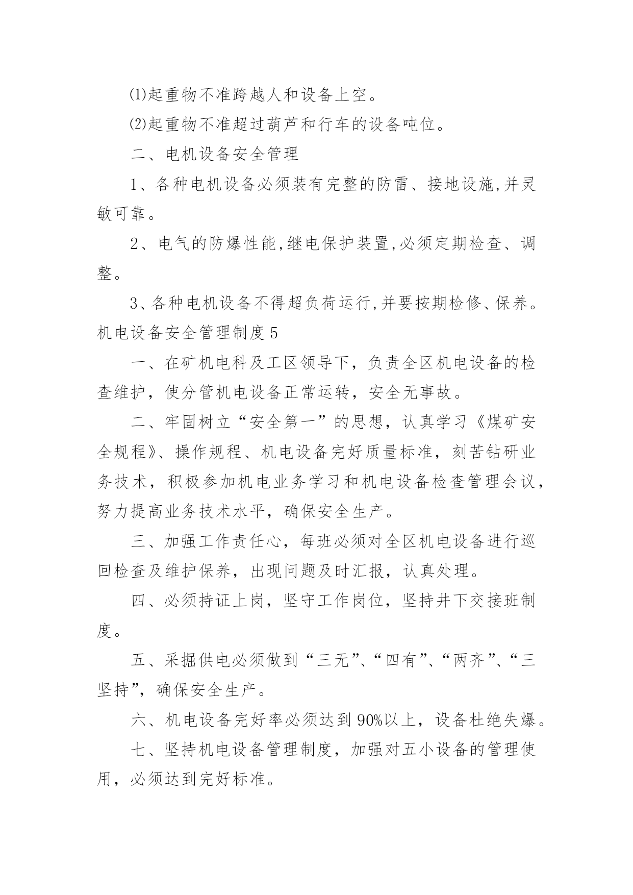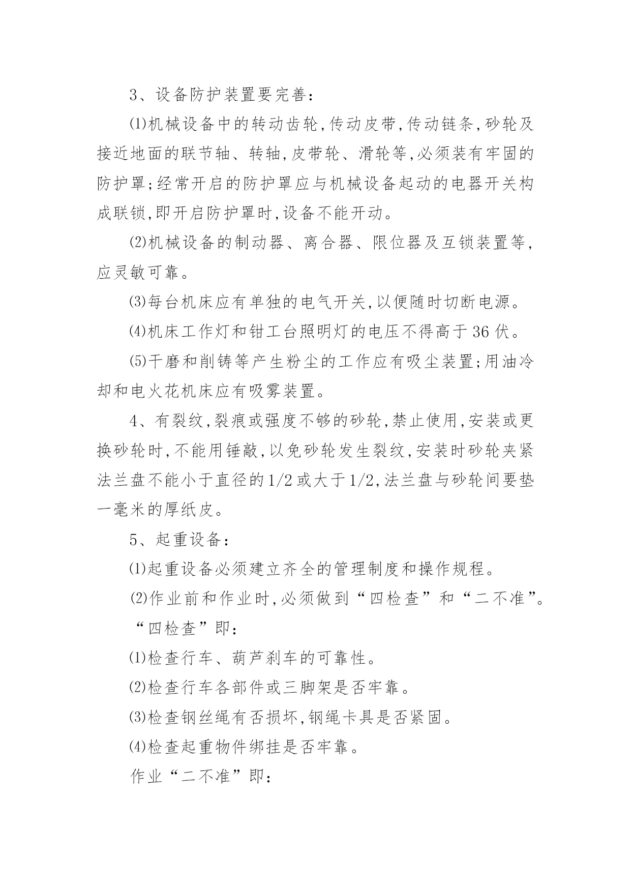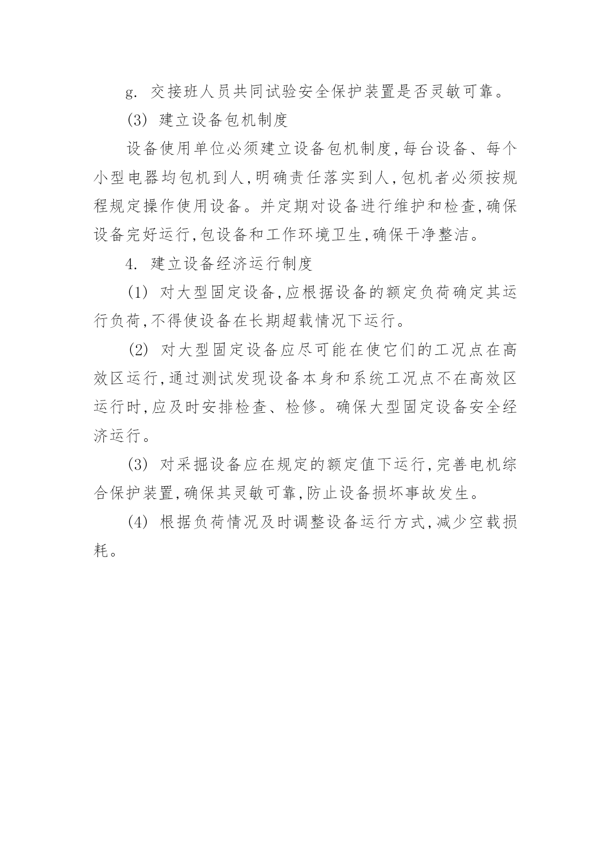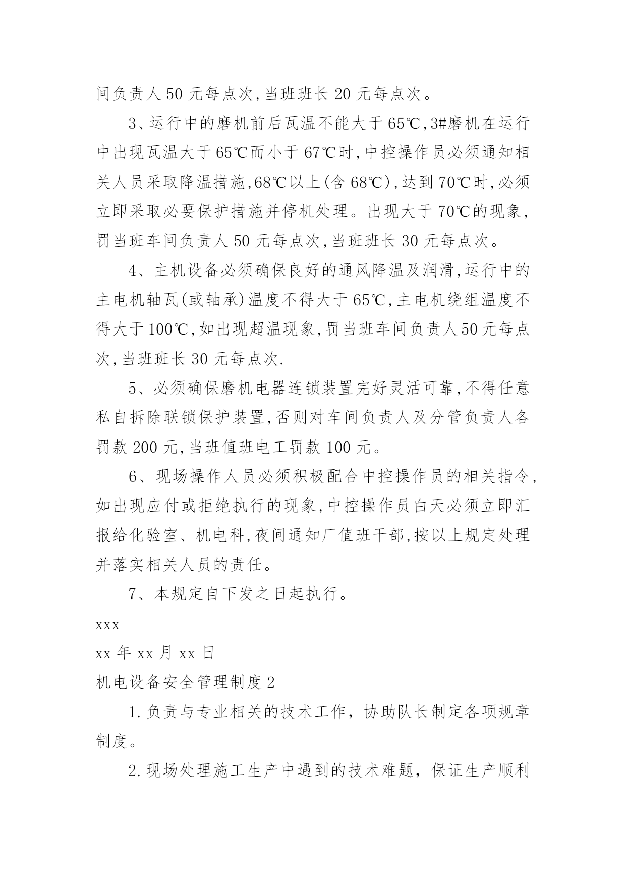 机电设备安全管理制度机电设备安全管理制度在现在的社会生活中,制度起到的作用越来越大,制度是指在特定社会范围内统一的、调节人与人之间社会关系的一系列习惯、道德、法律(包括宪法和各种具体法规)、戒律、规章(包括政府制定的条例)等的总和它由社会认可的非正式约束、国家规定的正式约束和实施机制三个部分构成。那么相关的制度到底是怎么制定的呢?下面是小编为大家整理的机电设备安全管理制度,仅供参考,大家一起来看看吧。机电设备安全管理制度1当前正值高温季节,为确保大型主机设备安全良性运行,特作如下规定:1、3#水泥磨机所有设备的中控显示参数(温度、压力、电流、喂料量反馈等)数值必须确保显示准确,其误差必须在额定范围内(实测值的正负2%),现场显示温度必须与中控显示温度相一致,如出现仪表损坏后未及时发现更换或与实测值超出范围的现象,罚当班车间负责人100元每点次,当班值班电工50元每点次,当班班长50元每点次。2、3#水泥磨必须严格控制出磨水泥温度,不得超过120℃,超过120℃时,中控操作员通知相关人员,如出现超过130℃的现象(含130℃)。出现大于130℃的现象,罚当班车间负责人50元每点次,当班班长20元每点次。3、运行中的磨机前后瓦温不能大于65℃,3#磨机在运行中出现瓦温大于65℃而小于67℃时,中控操作员必须通知相关人员采取降温措施,68℃以上(含68℃),达到70℃时,必须立即采取必要保护措施并停机处理。出现大于70℃的现象,罚当班车间负责人50元每点次,当班班长30元每点次。4、主机设备必须确保良好的通风降温及润滑,运行中的主电机轴瓦(或轴承)温度不得大于65℃,主电机绕组温度不得大于100℃,如出现超温现象,罚当班车间负责人50元每点次,当班班长30元每点次.5、必须确保磨机电器连锁装置完好灵活可靠,不得任意私自拆除联锁保护装置,否则对车间负责人及分管负责人各罚款200元,当班值班电工罚款100元。6、现场操作人员必须积极配合中控操作员的相关指令,如出现应付或拒绝执行的现象,中控操作员白天必须立即汇报给化验室、机电科,夜间通知厂值班干部,按以上规定处理并落实相关人员的责任。7、本规定自下发之日起执行。xxxxx年xx月xx日机电设备安全管理制度21.负责与专业相关的技术工作,协助队长制定各项规章制度。2.现场处理施工生产中遇到的技术难题,保证生产顺利进行。3.负责编制与专业相关的施工措施,并上报处有关部门审批,负责措施的传达、贯彻。4.协助队长搞好设备管理。5.定期组织检查、调试机电设备的安全保护装置,确保灵敏可靠,做好安全运转。6.组织机电职工搞好业务技术知识学习,按月提出设备主要备品,配件计划。机电设备安全管理制度31、每天巡视各机房一次,查看运转日志,检查安全保护装置的试验动作情况,查钢丝绳与吊挂装置的检查情况记录,查设备运转情况,发现问题,立即安排处理,查司机持证上岗与坚守工作岗位情况。2、区、队二十四小时有人值班,查交接班情况,各个岗位上的人员是否到齐,查夜班是否有人离岗或睡觉。3、查设备日常维修与安排一般检修执行情况与完成情况。机电设备安全管理制度4机电设备由机动部门统一管理,由经专门技术培训,考试合格,取得合格证的运转工操作。一、机械设备安全管理1、各种机械设备规定定期检修、保养,提高设备作业率和完好率,保证设备安全运转。2、设备发生故障时,必须停机处理。3、设备防护装置要完善:⑴机械设备中的转动齿轮,传动皮带,传动链条,砂轮及接近地面的联节轴、转轴,皮带轮、滑轮等,必须装有牢固的防护罩;经常开启的防护罩应与机械设备起动的电器开关构成联锁,即开启防护罩时,设备不能开动。⑵机械设备的制动器、离合器、限位器及互锁装置等,应灵敏可靠。⑶每台机床应有单独的电气开关,以便随时切断电源。⑷机床工作灯和钳工台照明灯的电压不得高于36伏。⑸干磨和削铸等产生粉尘的工作应有吸尘装置;用油冷却和电火花机床应有吸雾装置。4、有裂纹,裂痕或强度不够的砂轮,禁止使用,安装或更换砂轮时,不能用锤敲,以免砂轮发生裂纹,安装时砂轮夹紧法兰盘不能小于直径的1/2或大于1/2,法兰盘与砂轮间要垫一毫米的厚纸皮。5、起重设备:⑴起重设备必须建立齐全的管理制度和操作规程。⑵作业前和作业时,必须做到“四检查”和“二不准”。“四检查”即:⑴检查行车、葫芦刹车的可靠性。⑵检查行车各部件或三脚架是否牢靠。⑶检查钢丝绳有否损坏,钢绳卡具是否紧固。⑷检查起重物件绑挂是否牢靠。作业“二不准”即:⑴起重物不准跨越人和设备上空。⑵起重物不准超过葫芦和行车的设备吨位。二、电机设备安全管理1、各种电机设备必须装有完整的防雷、接地设施,并灵敏可靠。2、电气的防爆性能,继电保护装置,必须定期检查、调整。3、各种电机设备不得超负荷运行,并要按期检修、保养。机电设备安全管理制度5