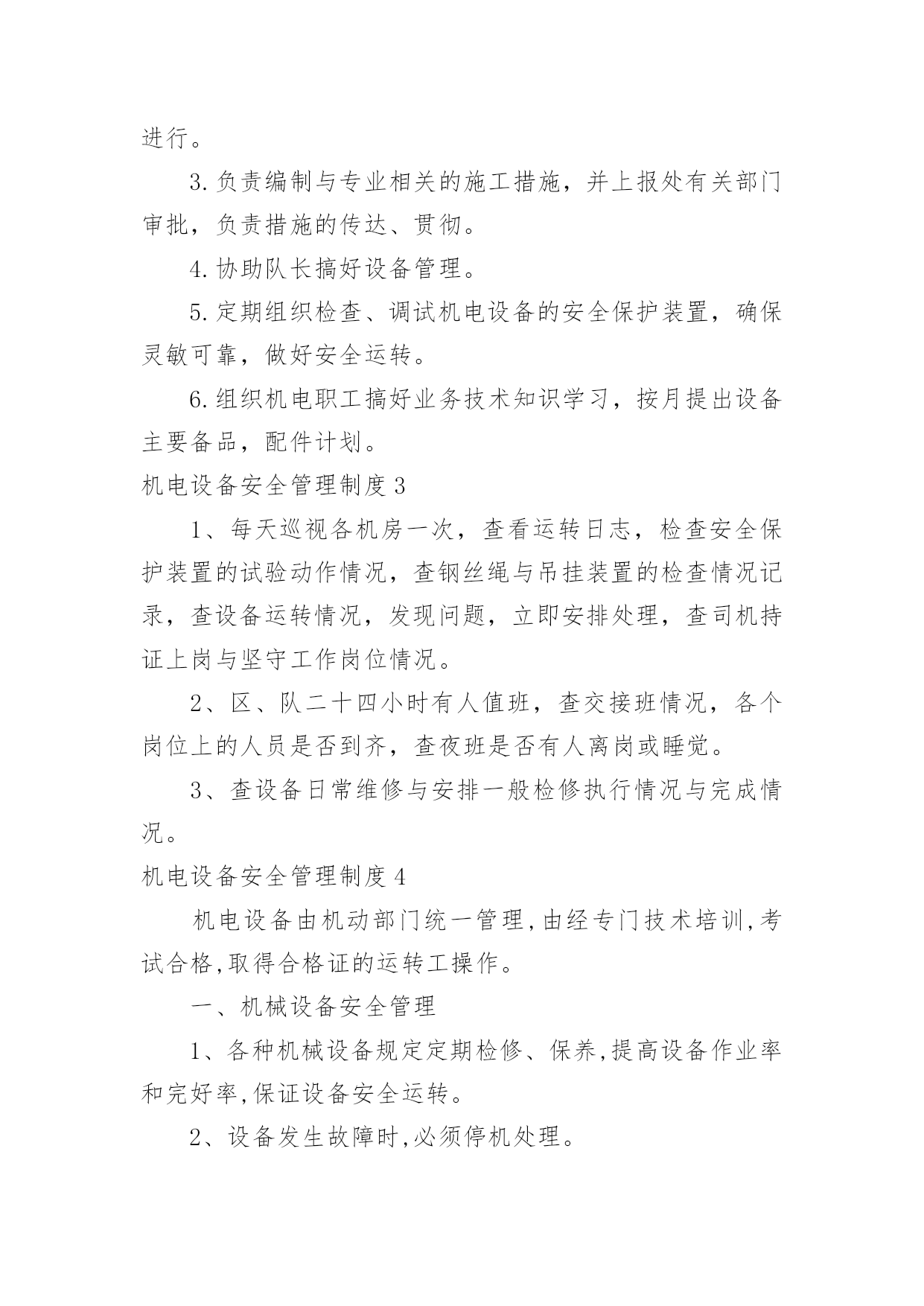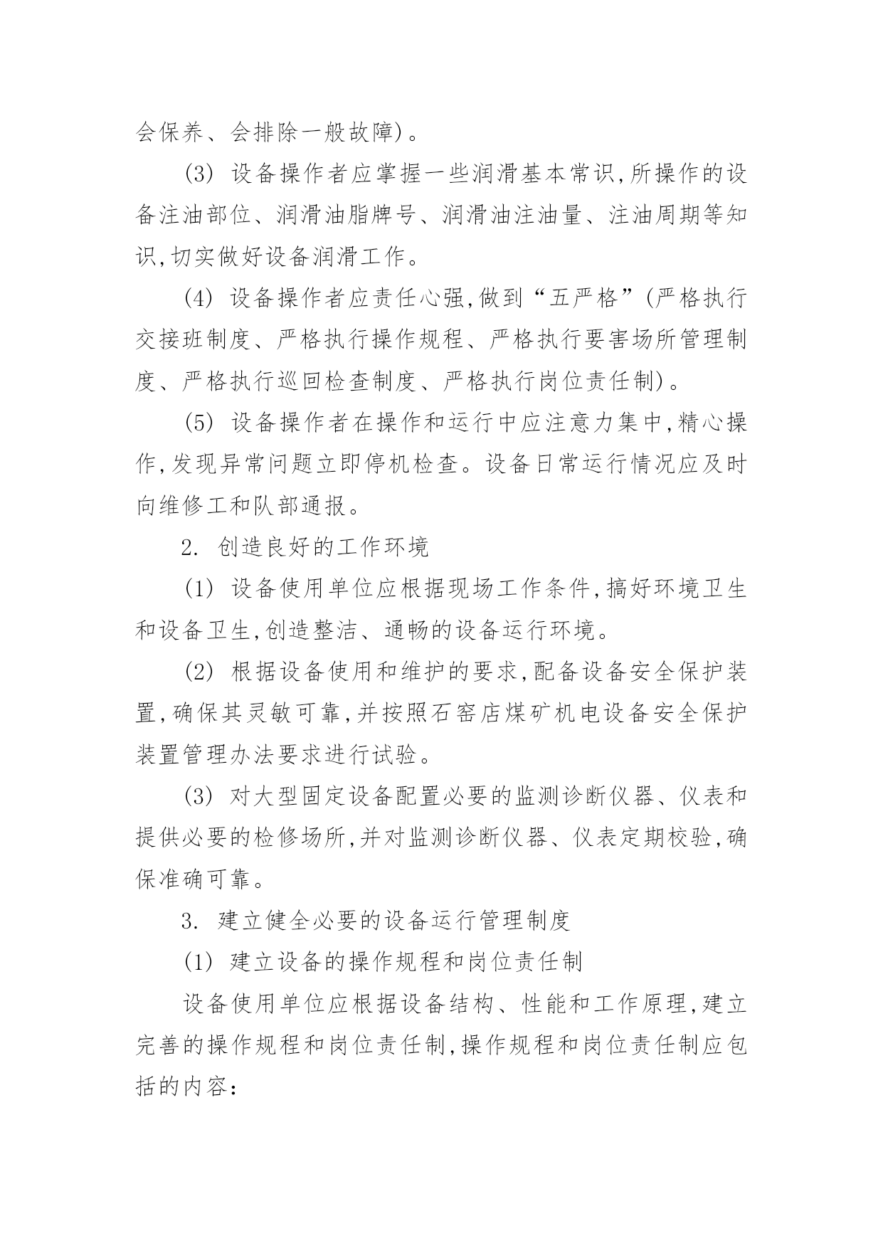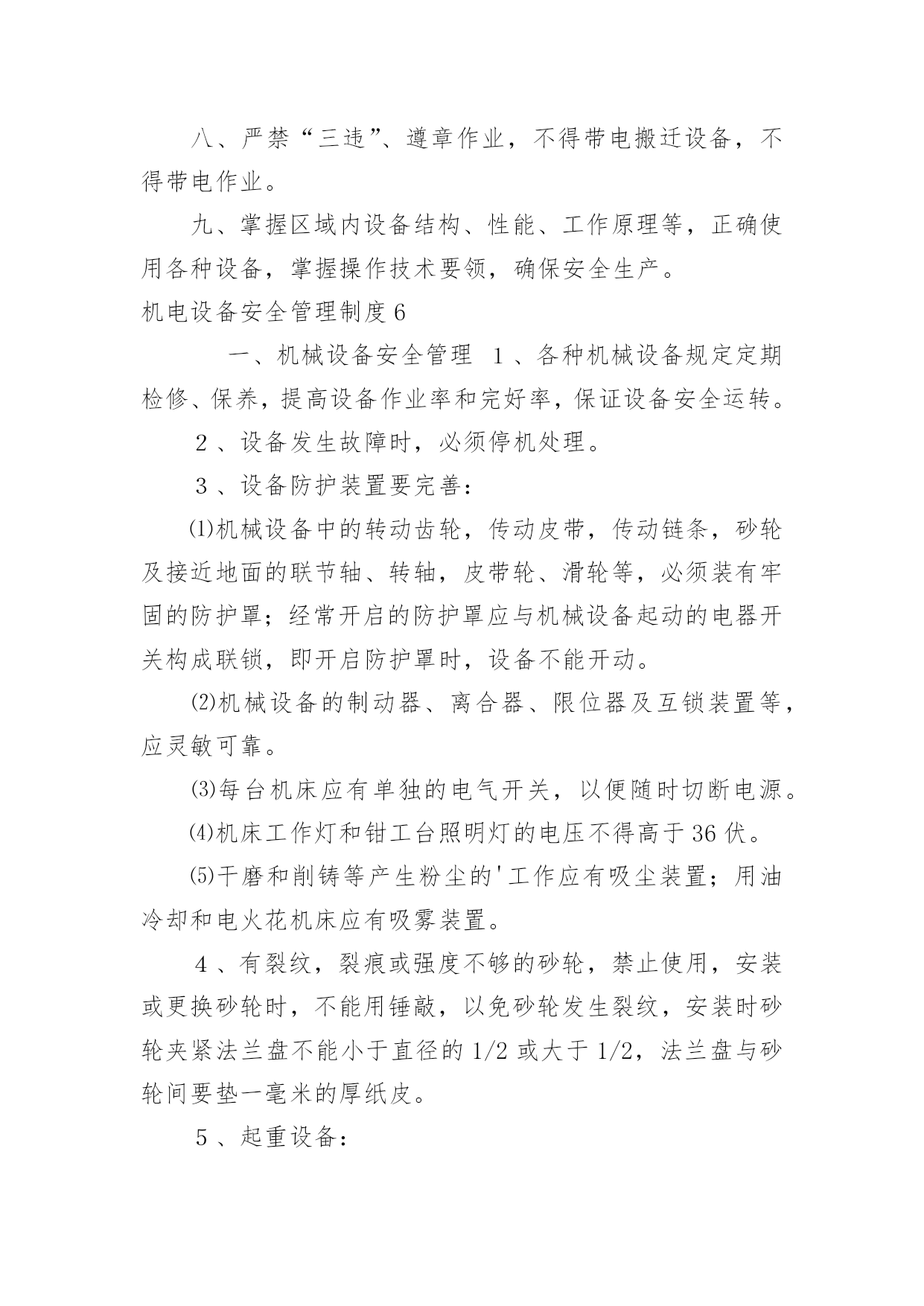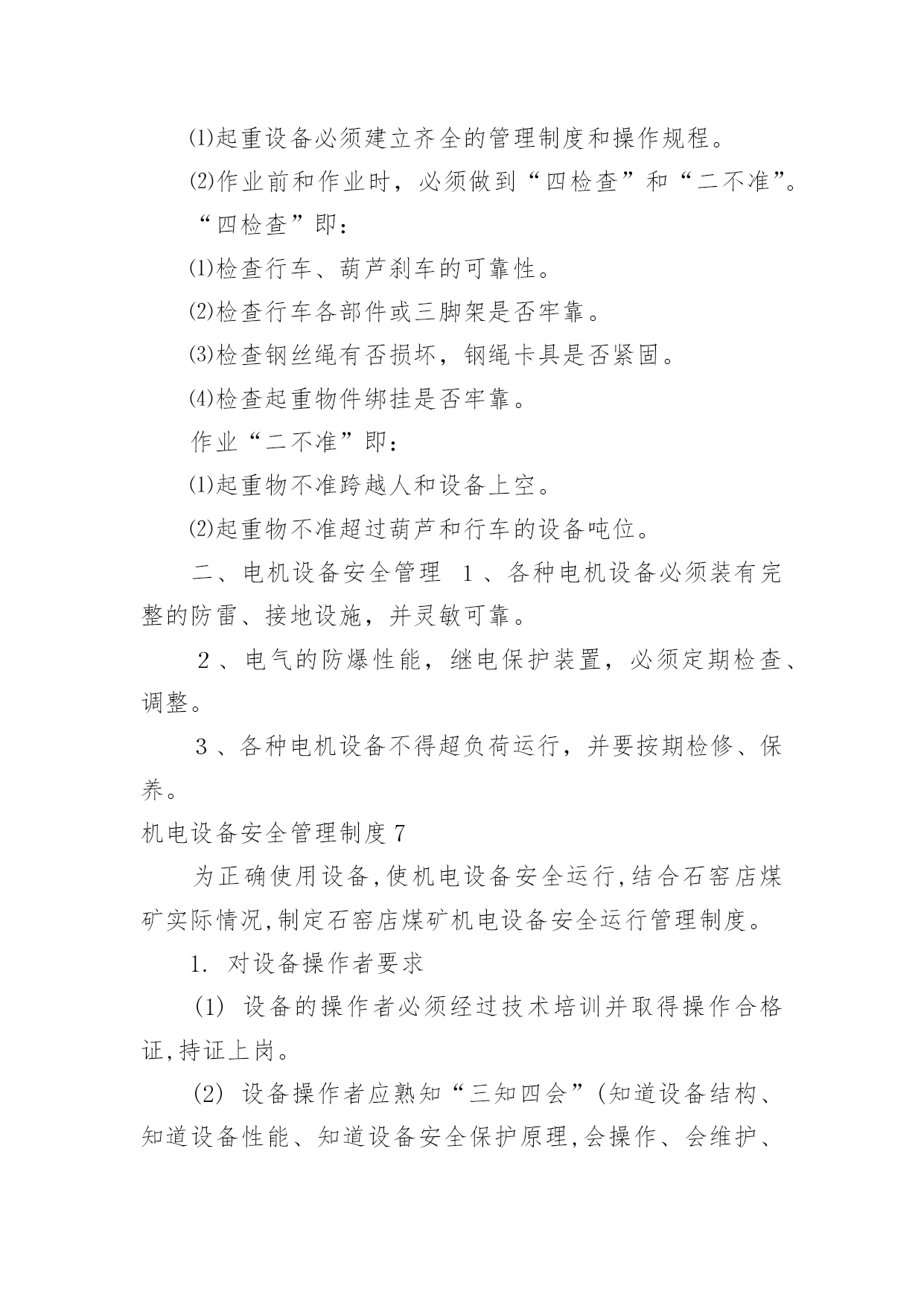 机电设备安全管理制度机电设备安全管理制度在现在的社会生活中,制度起到的作用越来越大,制度是指在特定社会范围内统一的、调节人与人之间社会关系的一系列习惯、道德、法律(包括宪法和各种具体法规)、戒律、规章(包括政府制定的条例)等的总和它由社会认可的非正式约束、国家规定的正式约束和实施机制三个部分构成。那么相关的制度到底是怎么制定的呢?下面是小编为大家整理的机电设备安全管理制度,仅供参考,大家一起来看看吧。机电设备安全管理制度1当前正值高温季节,为确保大型主机设备安全良性运行,特作如下规定:1、3#水泥磨机所有设备的中控显示参数(温度、压力、电流、喂料量反馈等)数值必须确保显示准确,其误差必须在额定范围内(实测值的正负2%),现场显示温度必须与中控显示温度相一致,如出现仪表损坏后未及时发现更换或与实测值超出范围的现象,罚当班车间负责人100元每点次,当班值班电工50元每点次,当班班长50元每点次。2、3#水泥磨必须严格控制出磨水泥温度,不得超过120℃,超过120℃时,中控操作员通知相关人员,如出现超过130℃的现象(含130℃)。出现大于130℃的现象,罚当班车间负责人50元每点次,当班班长20元每点次。3、运行中的磨机前后瓦温不能大于65℃,3#磨机在运行中出现瓦温大于65℃而小于67℃时,中控操作员必须通知相关人员采取降温措施,68℃以上(含68℃),达到70℃时,必须立即采取必要保护措施并停机处理。出现大于70℃的现象,罚当班车间负责人50元每点次,当班班长30元每点次。4、主机设备必须确保良好的通风降温及润滑,运行中的主电机轴瓦(或轴承)温度不得大于65℃,主电机绕组温度不得大于100℃,如出现超温现象,罚当班车间负责人50元每点次,当班班长30元每点次.5、必须确保磨机电器连锁装置完好灵活可靠,不得任意私自拆除联锁保护装置,否则对车间负责人及分管负责人各罚款200元,当班值班电工罚款100元。6、现场操作人员必须积极配合中控操作员的相关指令,如出现应付或拒绝执行的现象,中控操作员白天必须立即汇报给化验室、机电科,夜间通知厂值班干部,按以上规定处理并落实相关人员的责任。7、本规定自下发之日起执行。xxxxx年xx月xx日机电设备安全管理制度21.负责与专业相关的技术工作,协助队长制定各项规章制度。2.现场处理施工生产中遇到的技术难题,保证生产顺利进行。3.负责编制与专业相关的施工措施,并上报处有关部门审批,负责措施的传达、贯彻。4.协助队长搞好设备管理。5.定期组织检查、调试机电设备的安全保护装置,确保灵敏可靠,做好安全运转。6.组织机电职工搞好业务技术知识学习,按月提出设备主要备品,配件计划。机电设备安全管理制度31、每天巡视各机房一次,查看运转日志,检查安全保护装置的试验动作情况,查钢丝绳与吊挂装置的检查情况记录,查设备运转情况,发现问题,立即安排处理,查司机持证上岗与坚守工作岗位情况。2、区、队二十四小时有人值班,查交接班情况,各个岗位上的人员是否到齐,查夜班是否有人离岗或睡觉。3、查设备日常维修与安排一般检修执行情况与完成情况。机电设备安全管理制度4机电设备由机动部门统一管理,由经专门技术培训,考试合格,取得合格证的运转工操作。一、机械设备安全管理1、各种机械设备规定定期检修、保养,提高设备作业率和完好率,保证设备安全运转。2、设备发生故障时,必须停机处理。3、设备防护装置要完善:⑴机械设备中的转动齿轮,传动皮带,传动链条,砂轮及接近地面的联节轴、转轴,皮带轮、滑轮等,必须装有牢固的防护罩;经常开启的防护罩应与机械设备起动的电器开关构成联锁,即开启防护罩时,设备不能开动。⑵机械设备的制动器、离合器、限位器及互锁装置等,应灵敏可靠。⑶每台机床应有单独的电气开关,以便随时切断电源。⑷机床工作灯和钳工台照明灯的电压不得高于36伏。⑸干磨和削铸等产生粉尘的工作应有吸尘装置;用油冷却和电火花机床应有吸雾装置。4、有裂纹,裂痕或强度不够的砂轮,禁止使用,安装或更换砂轮时,不能用锤敲,以免砂轮发生裂纹,安装时砂轮夹紧法兰盘不能小于直径的1/2或大于1/2,法兰盘与砂轮间要垫一毫米的厚纸皮。5、起重设备:⑴起重设备必须建立齐全的管理制度和操作规程。⑵作业前和作业时,必须做到“四检查”和“二不准”。“四检查”即:⑴检查行车、葫芦刹车的可靠性。⑵检查行车各部件或三脚架是否牢靠。⑶检查钢丝绳有否损坏,钢绳卡具是否紧固。⑷检查起重物件绑挂是否牢靠。作业“二不准”即:⑴起重物不准跨越人和设备上空。⑵起重物不准超过葫芦和行车的设备吨位。二、电机设备安全管理1、各种电机设备必须装有完整的防雷、接地设施,并灵敏可靠。2、电气的防爆性能,继电保护装置,必须定期检查、调整。3、各种电机设备不得超负荷运行,并要按期检修、保养。机电设备安全管理制度5