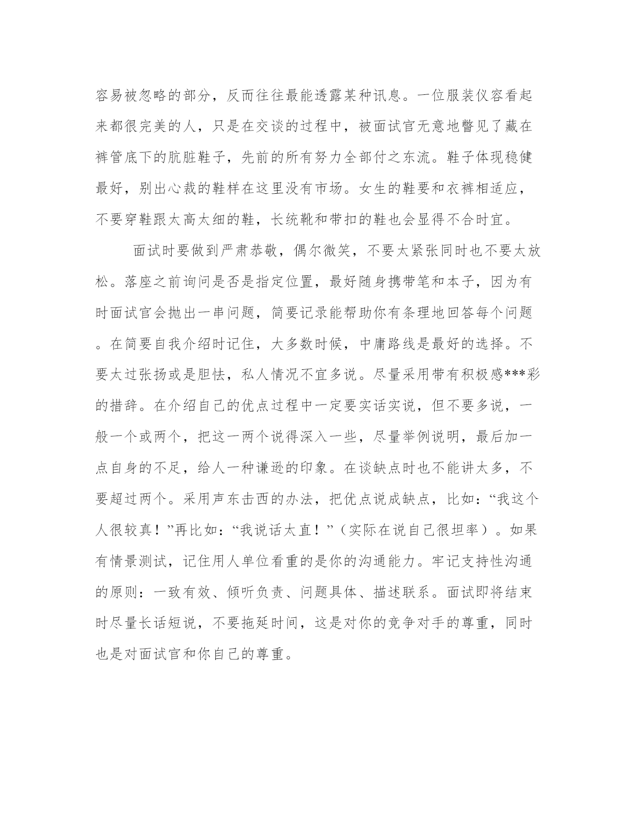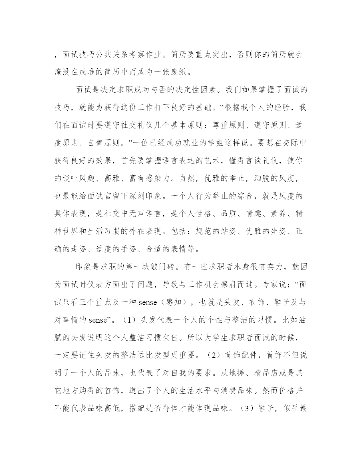 公共关系考察作业议论文首先我们不打无准备的仗,做任何事情之前准备工作是必须的,面试也一样,只有准备充分才能在面试时应对自如。求职前的准备包括以下几个方面:(1)正确的自我定位。很多人事业上发展不顺利不是因为能力不够,而是选择了并不适合自己的工作。只有找到准确的定位,才可能获得更加长足的发展。(2)充分了解自己的兴趣、爱好、特长以及优点和缺点。只有你认为有兴趣的事情,才会真正地去做,而且做好;所谓的特长是你擅长的方面,有可能是一门技术,一种知识,还有可能是你某方面的能力。(3)尽可能地收集相关信息。求职之前,要尽可能收集应试单位的有关信息,并筛选出有用的信息,尽可能让这些信息与自己的特点发生联系,以展示出自己的特长。(4)精心策划设计个人简历。个人简历是求职应聘时必不可缺的材料。一份精心设计、编排的个人简历,可以引起主考官的注意和重视。制作简历时应对本人的能力、经验分门别类地做一个简要地描述,并针对应聘职务的不同,选择不同的重点。假设你在计算机编程方面的能力比较突出,并且作为班干部组织了许多学生活动。如果是应聘营销、公关、文秘类的职务,你就应该突出后者以显示你的公关能力;而如果你打算到一个软件开发公司应聘,你对后者的描述就应该弱化,而花较大篇幅说明你在数学、语言、程序开发等方面的才能。总之,要站在招聘单位的角度来思考,你打算应聘的那个职位的基本要求是什么,面试技巧公共关系考察作业。简历要重点突出,否则你的简历就会淹没在成堆的简历中而成为一张废纸。面试是决定求职成功与否的决定性因素。我们如果掌握了面试的技巧,就能为获得这份工作打下良好的基础。“根据我个人的经验,我们在面试时要遵守社交礼仪几个基本原则:尊重原则、遵守原则、适度原则、自律原则。”一位已经成功就业的学姐这样说。要想在交际中获得良好的效果,首先要掌握语言表达的艺术,懂得言谈礼仪,使你的谈吐风趣、高雅、富有感染力。自然,优雅的举止,洒脱的风度,也最能给面试官留下深刻印象。一个人行为举止的综合,就是风度的具体表现,是社交中无声语言,是个人性格、品质、情趣、素养、精神世界和生活习惯的外在表现。包括:规范的站姿、优雅的坐姿、正确的走姿、适度的手姿、合适的表情等。印象是求职的第一块敲门砖。有一些求职者本身很有实力,就因为面试时仪表方面出了问题,导致与工作机会擦肩而过。专家说:“面试只看三个重点及一种sense(感知),也就是头发、衣饰、鞋子及与对事情的sense”。(1)头发代表一个人的个性与整洁的习惯。比如油腻的头发说明这个人整洁习惯欠佳。所以大学生求职者面试的时候,一定要记住头发的整洁远比发型更重要。(2)首饰配件,首饰不但说明了一个人的品味,也代表了对自我的要求。从地摊、精品店或是其它地方购得的首饰,道出了个人的生活水平与消费品味。然而价格并不能代表品味高低,搭配是否得体才能体现品味。(3)鞋子,似乎最容易被忽略的部分,反而往往最能透露某种讯息。一位服装仪容看起来都很完美的人,只是在交谈的过程中,被面试官无意地瞥见了藏在裤管底下的肮脏鞋子,先前的所有努力全部付之东流。鞋子体现稳健最好,别出心裁的鞋样在这里没有市场。女生的鞋要和衣裤相适应,不要穿鞋跟太高太细的鞋,长统靴和带扣的鞋也会显得不合时宜。面试时要做到严肃恭敬,偶尔微笑,不要太紧张同时也不要太放松。落座之前询问是否是指定位置,最好随身携带笔和本子,因为有时面试官会抛出一串问题,简要记录能帮助你有条理地回答每个问题。在简要自我介绍时记住,大多数时候,中庸路线是最好的选择。不要太过张扬或是胆怯,私人情况不宜多说。尽量采用带有积极感***彩的措辞。在介绍自己的优点过程中一定要实话实说,但不要多说,一般一个或两个,把这一两个说得深入一些,尽量举例说明,最后加一点自身的不足,给人一种谦逊的印象。在谈缺点时也不能讲太多,不要超过两个。采用声东击西的办法,把优点说成缺点,比如:“我这个人很较真!”再比如:“我说话太直!”(实际在说自己很坦率)。如果有情景测试,记住用人单位看重的是你的沟通能力。牢记支持性沟通的原则:一致有效、倾听负责、问题具体、描述联系。面试即将结束时尽量长话短说,不要拖延时间,这是对你的竞争对手的尊重,同时也是对面试官和你自己的尊重。