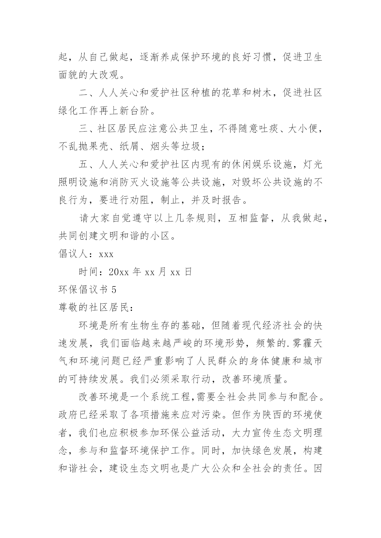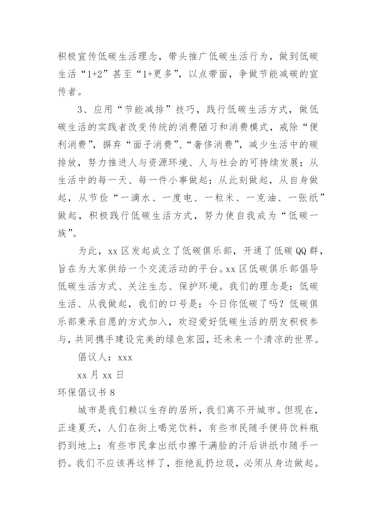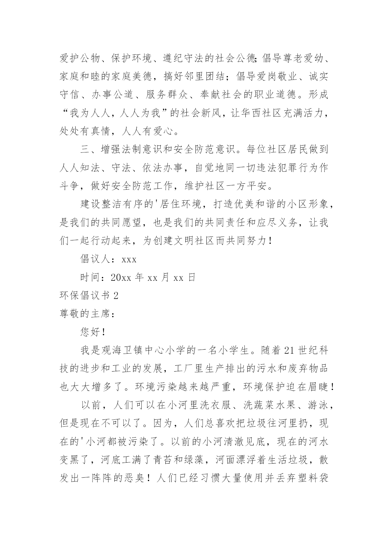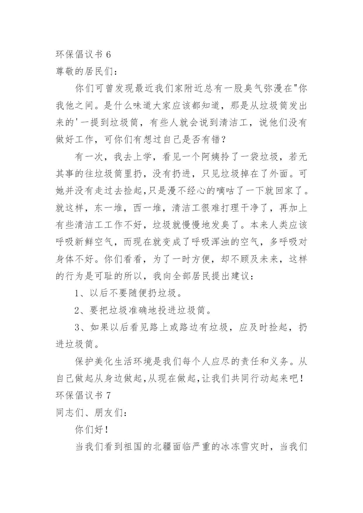 环保倡议书环保倡议书在现实社会中,越来越多地方需要用到倡议书,倡议书有利于倡议者交代清楚倡议活动的原因,以及当时的各种背景事实。为了让您在写倡议书中更加简单方便,下面是小编整理的环保倡议书,仅供参考,希望能够帮助到大家。环保倡议书1居民朋友们:大家好!根据沙坡头区有关文明社区创建精神,华西社区将以构建和谐社会,创建文明社区为目标,努力把华西社区创建成环境整洁、秩序安定、组织健全、服务完善、文化丰富、风尚良好的文明社区。“社区是我家,创建靠大家”,创建文明社区需要社区每个家庭、每一位居民的共同努力,共同参与。为此,我们特向社区广大居民发出以下倡议:一、争做文明居民。树立“人人清洁,人人受益”的意识,养成良好的卫生习惯,积极维护社区公共卫生,保持楼道公用部位的整洁、清洁,楼上居民不往楼下乱抛乱丢垃圾、杂物。保持小区整洁美观,不乱吐乱扔,乱刻乱画,乱泼乱倒,乱牵乱挂,提倡用可降解塑料袋装垃圾,并且放入指定的地点。二、倡导文明新风尚。积极倡导文明礼貌、助人为乐、爱护公物、保护环境、遵纪守法的社会公德;倡导尊老爱幼、家庭和睦的家庭美德,搞好邻里团结;倡导爱岗敬业、诚实守信、办事公道、服务群众、奉献社会的职业道德。形成“我为人人,人人为我”的社会新风,让华西社区充满活力,处处有真情,人人有爱心。三、增强法制意识和安全防范意识。每位社区居民做到人人知法、守法、依法办事,自觉地同一切违法犯罪行为作斗争,做好安全防范工作,维护社区一方平安。建设整洁有序的'居住环境,打造优美和谐的小区形象,是我们的共同愿望,也是我们的共同责任和应尽义务,让我们一起行动起来,为创建文明社区而共同努力!倡议人:xxx时间:20xx年xx月xx日环保倡议书2尊敬的主席:您好!我是观海卫镇中心小学的一名小学生。随着21世纪科技的进步和工业的发展,工厂里生产排出的污水和废弃物品也大大增多了。环境污染越来越严重,环境保护迫在眉睫!以前,人们可以在小河里洗衣服、洗蔬菜水果、游泳,但是现在不可以了。因为,人们总喜欢把垃圾往河里扔,现在的'小河都被污染了。以前的小河清澈见底,现在的河水变黑了,河底工满了青苔和绿藻,河面漂浮着生活垃圾,散发出一阵阵的恶臭!人们已经习惯大量使用并丢弃塑料袋了,这些塑料袋被埋在土里,需要很多很多年后才能被完全分解,还会污染土地,同时污染到种在这些田里的蔬菜水果。工厂排出的废气污染到大气环境。人类经常呼吸到这种空气,就会容易生病的,甚至缩短寿命!因此,我倡议:我们要保护环境,不去破坏生态平衡,珍惜我们赖以生存的家园。从我做起,从现在做起,从身边做起,从小事做起,让我们的生活变得更加美好!倡议人:xx20xx年5月26日环保倡议书3低碳环保、绿色出行,既是一种健康的生活方式,也是改善我们生活环境的一种美好愿望。为了缓解交通拥堵、减低碳排放量,促使我们生活更加幸福、环境更加美好,成都青年之声响应中心特向成都青年发起倡议,共同践行低碳环保、绿色出行理念。1做“低碳环保、绿色出行”的践行者。日常生活及工作当中,青年群体可尽量乘坐公共交通工具,或者采取步行、骑自行车等出行方式。同时从身边小事做起,购物时自带环保袋,少用塑料袋;就餐时拒绝使用一次性筷子;出门时提前关闭电器电源;照明选用节能灯等,真正把低碳环保行为融入日常生活。2做“低碳环保、绿色出行”的`倡导者。青年群体自身可树立“能走不骑,能骑不坐,能坐不开”的出行理念,上下班主动放弃开车,尽可能采取乘坐公交车、骑自行车或步行等出行方式,减少交通拥堵,减少空气污染,并为其余青年做好表率工作,从而带动更多青年群体参与到“低碳环保、绿色出行”行动中来。3做“低碳环保、绿色出行”的监督者。青年群体见到倒在路边的自行车时自觉扶起并停放好,及时劝阻、制止破坏共享单车的不良行为,并大胆举报故意破坏行为。同时针对违规停放的现象及时举报,从而为徒步、骑行等绿色出行方式提供更好地外在条件。为了归还成都一片蓝天,为了减少城市交通拥堵,也为了更好地增强体魄,成都青年都一起行动吧,从我做起,从现在做起,积极投身到“低碳环保,绿色出行”的行动中来,共筑成都美好未来。环保倡议书4尊敬的各位业主、住户:常言说得好保护环境,人人有责。保护环境的确是一个值得大家关注的问题。现在人们的生活水平不断提高,而保护环境的意识却越来越淡薄。环境整洁,楼道干净,空气清新,不仅能促进广大居民朋友的'身心健康,提高小区的良好形象,更能融洽邻里之间的关系,同时又能使我们每个居民朋友享受到美好环境,从中得到温馨喜悦的心情。在此为了保护好我们小区的环境,为了我们的小区更加美丽和卫生,也为了让我们都有一个舒适的家,重庆路第二社区向居民提出以下倡议:一、共同关爱社区环境,共同关注楼道卫生。从现在做起,从自己做起,逐渐养成保护环境的良好习惯,促进卫生面貌的大改观。二、人