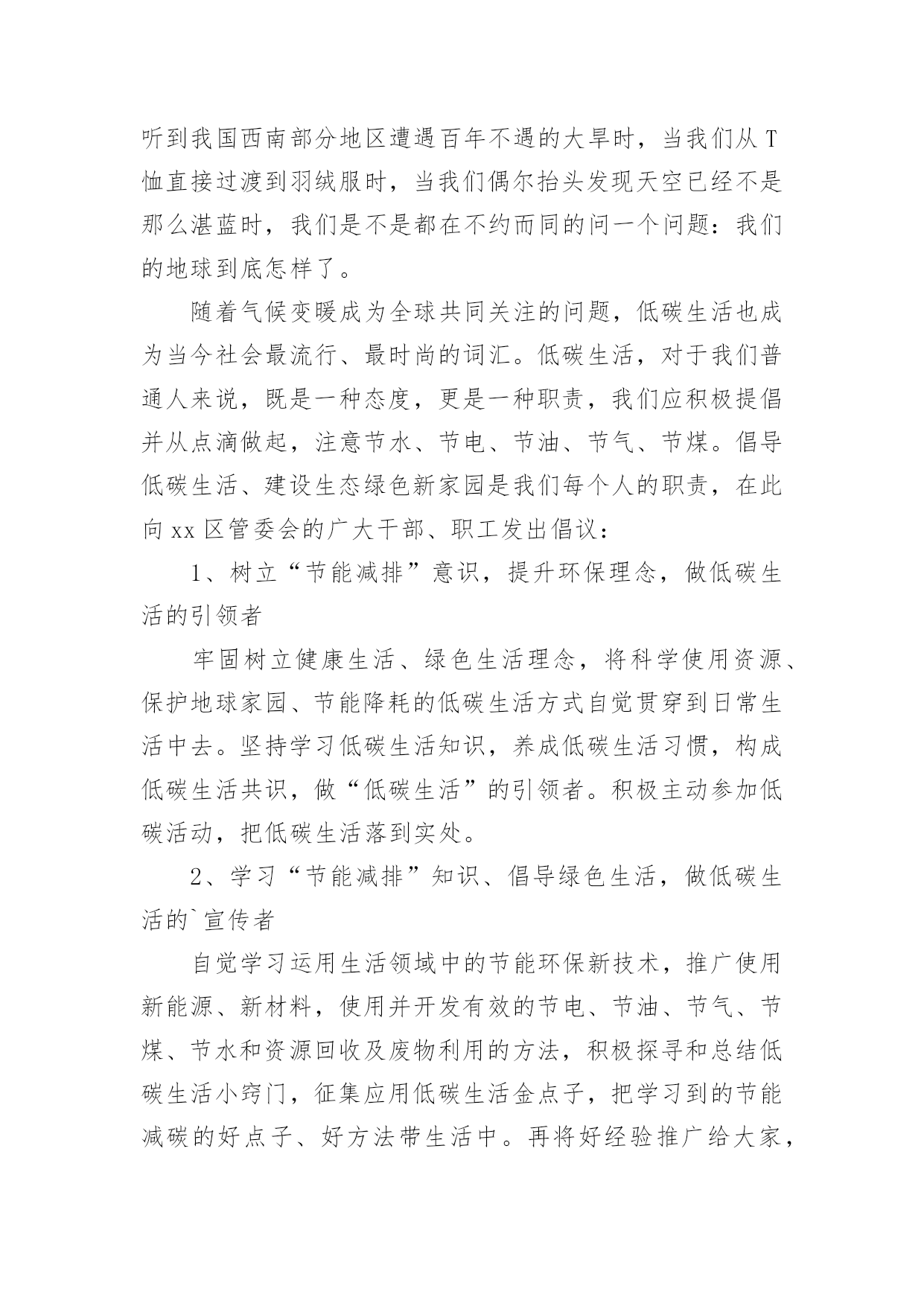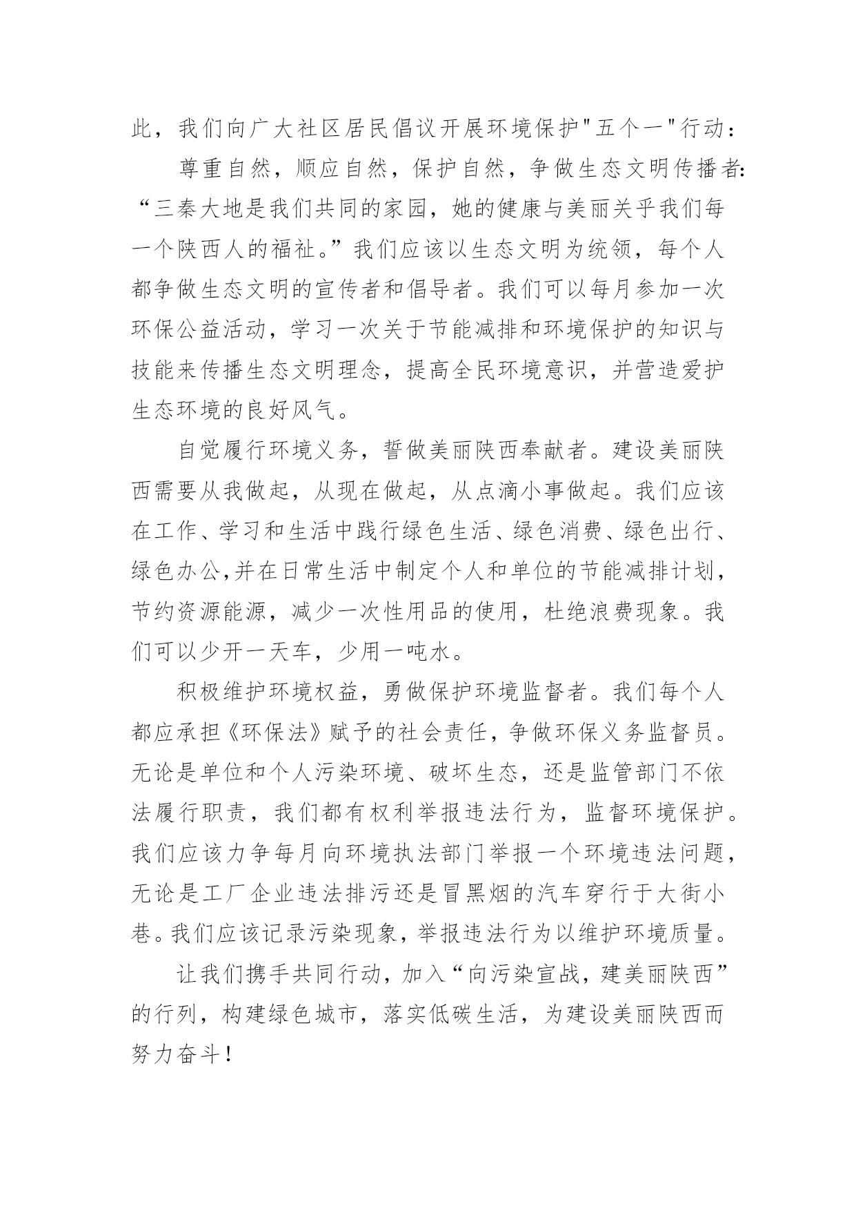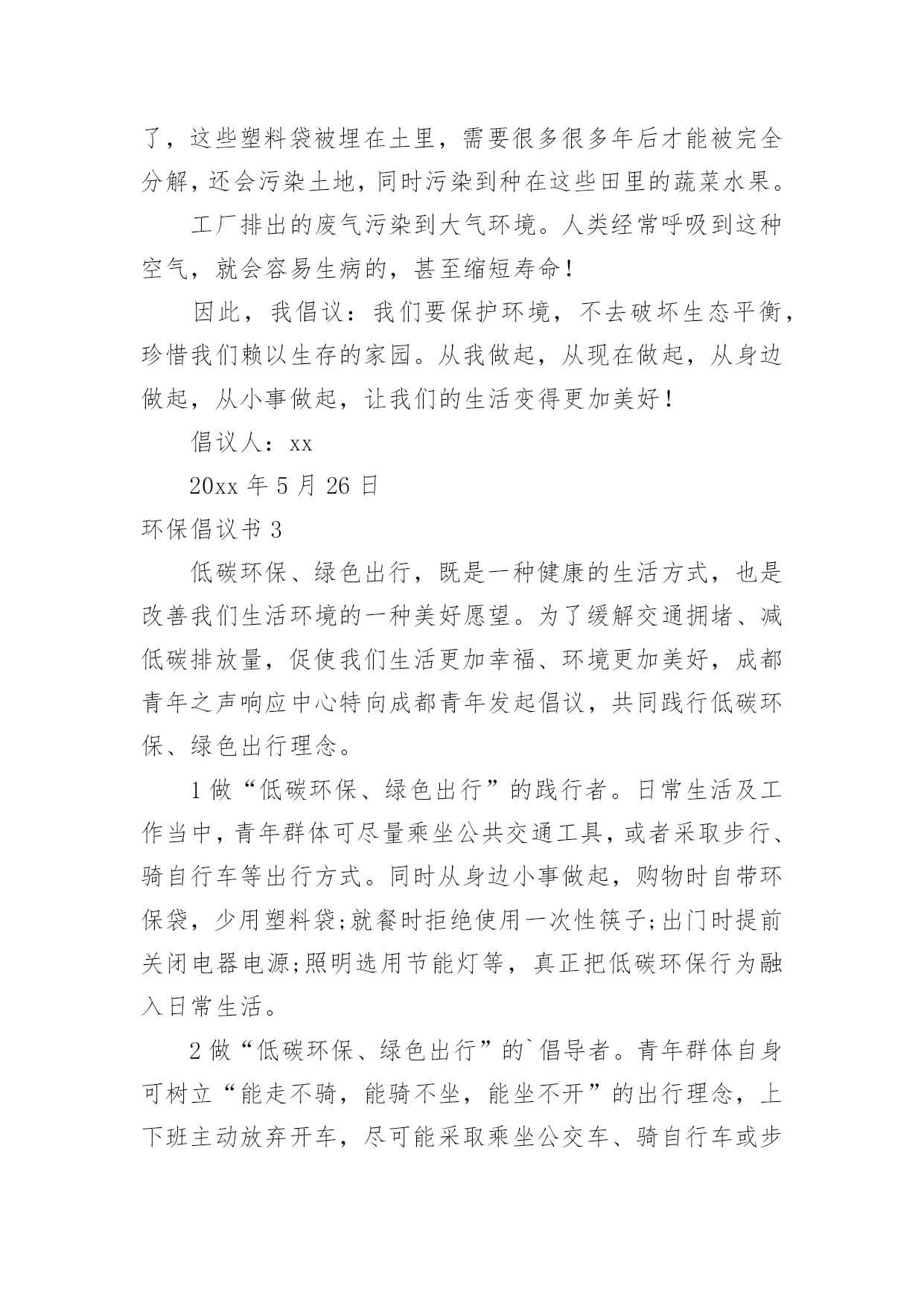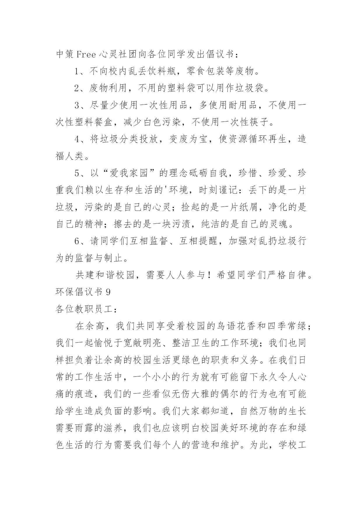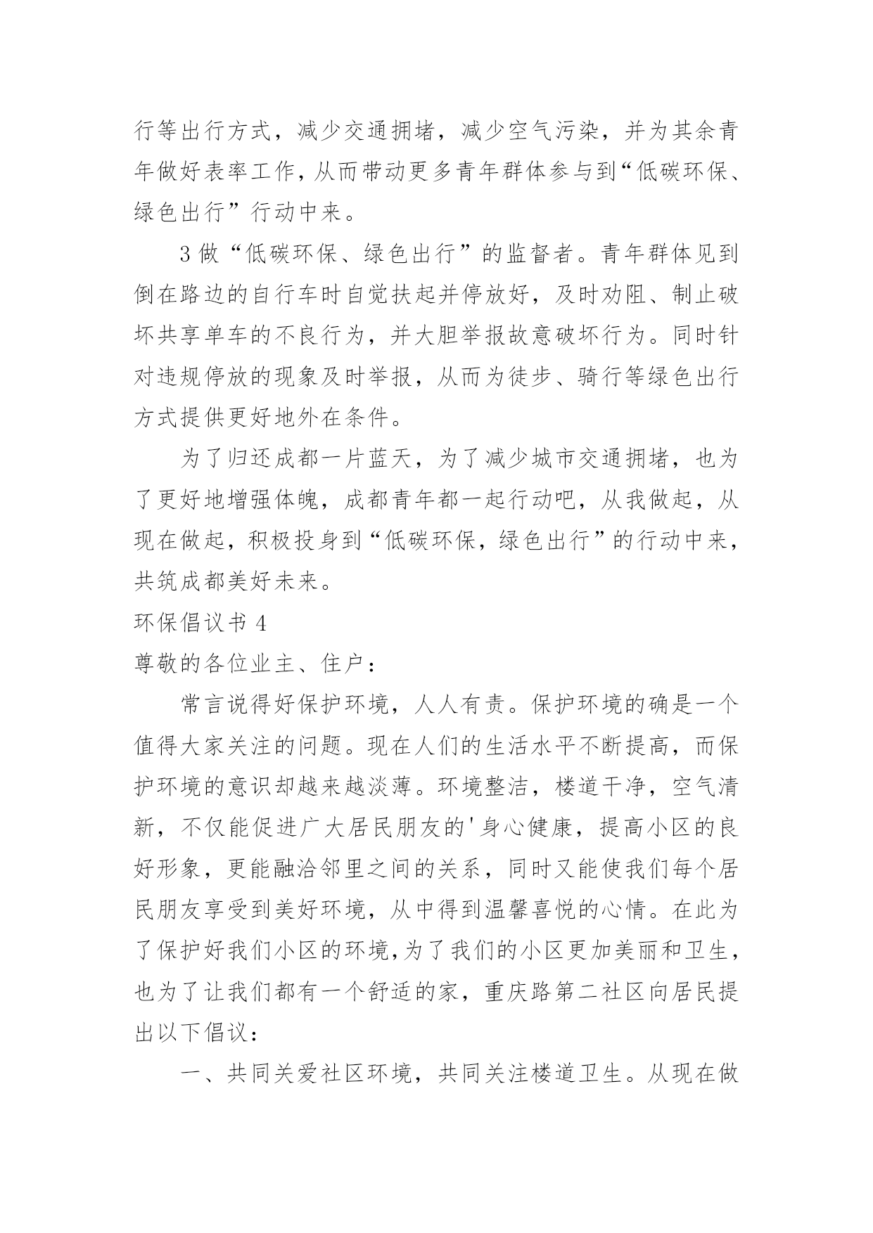 环保倡议书环保倡议书在现实社会中,越来越多地方需要用到倡议书,倡议书有利于倡议者交代清楚倡议活动的原因,以及当时的各种背景事实。为了让您在写倡议书中更加简单方便,下面是小编整理的环保倡议书,仅供参考,希望能够帮助到大家。环保倡议书1居民朋友们:大家好!根据沙坡头区有关文明社区创建精神,华西社区将以构建和谐社会,创建文明社区为目标,努力把华西社区创建成环境整洁、秩序安定、组织健全、服务完善、文化丰富、风尚良好的文明社区。“社区是我家,创建靠大家”,创建文明社区需要社区每个家庭、每一位居民的共同努力,共同参与。为此,我们特向社区广大居民发出以下倡议:一、争做文明居民。树立“人人清洁,人人受益”的意识,养成良好的卫生习惯,积极维护社区公共卫生,保持楼道公用部位的整洁、清洁,楼上居民不往楼下乱抛乱丢垃圾、杂物。保持小区整洁美观,不乱吐乱扔,乱刻乱画,乱泼乱倒,乱牵乱挂,提倡用可降解塑料袋装垃圾,并且放入指定的地点。二、倡导文明新风尚。积极倡导文明礼貌、助人为乐、爱护公物、保护环境、遵纪守法的社会公德;倡导尊老爱幼、家庭和睦的家庭美德,搞好邻里团结;倡导爱岗敬业、诚实守信、办事公道、服务群众、奉献社会的职业道德。形成“我为人人,人人为我”的社会新风,让华西社区充满活力,处处有真情,人人有爱心。三、增强法制意识和安全防范意识。每位社区居民做到人人知法、守法、依法办事,自觉地同一切违法犯罪行为作斗争,做好安全防范工作,维护社区一方平安。建设整洁有序的'居住环境,打造优美和谐的小区形象,是我们的共同愿望,也是我们的共同责任和应尽义务,让我们一起行动起来,为创建文明社区而共同努力!倡议人:xxx时间:20xx年xx月xx日环保倡议书2尊敬的主席:您好!我是观海卫镇中心小学的一名小学生。随着21世纪科技的进步和工业的发展,工厂里生产排出的污水和废弃物品也大大增多了。环境污染越来越严重,环境保护迫在眉睫!以前,人们可以在小河里洗衣服、洗蔬菜水果、游泳,但是现在不可以了。因为,人们总喜欢把垃圾往河里扔,现在的'小河都被污染了。以前的小河清澈见底,现在的河水变黑了,河底工满了青苔和绿藻,河面漂浮着生活垃圾,散发出一阵阵的恶臭!人们已经习惯大量使用并丢弃塑料袋了,这些塑料袋被埋在土里,需要很多很多年后才能被完全分解,还会污染土地,同时污染到种在这些田里的蔬菜水果。工厂排出的废气污染到大气环境。人类经常呼吸到这种空气,就会容易生病的,甚至缩短寿命!因此,我倡议:我们要保护环境,不去破坏生态平衡,珍惜我们赖以生存的家园。从我做起,从现在做起,从身边做起,从小事做起,让我们的生活变得更加美好!倡议人:xx20xx年5月26日环保倡议书3低碳环保、绿色出行,既是一种健康的生活方式,也是改善我们生活环境的一种美好愿望。为了缓解交通拥堵、减低碳排放量,促使我们生活更加幸福、环境更加美好,成都青年之声响应中心特向成都青年发起倡议,共同践行低碳环保、绿色出行理念。1做“低碳环保、绿色出行”的践行者。日常生活及工作当中,青年群体可尽量乘坐公共交通工具,或者采取步行、骑自行车等出行方式。同时从身边小事做起,购物时自带环保袋,少用塑料袋;就餐时拒绝使用一次性筷子;出门时提前关闭电器电源;照明选用节能灯等,真正把低碳环保行为融入日常生活。2做“低碳环保、绿色出行”的`倡导者。青年群体自身可树立“能走不骑,能骑不坐,能坐不开”的出行理念,上下班主动放弃开车,尽可能采取乘坐公交车、骑自行车或步行等出行方式,减少交通拥堵,减少空气污染,并为其余青年做好表率工作,从而带动更多青年群体参与到“低碳环保、绿色出行”行动中来。3做“低碳环保、绿色出行”的监督者。青年群体见到倒在路边的自行车时自觉扶起并停放好,及时劝阻、制止破坏共享单车的不良行为,并大胆举报故意破坏行为。同时针对违规停放的现象及时举报,从而为徒步、骑行等绿色出行方式提供更好地外在条件。为了归还成都一片蓝天,为了减少城市交通拥堵,也为了更好地增强体魄,成都青年都一起行动吧,从我做起,从现在做起,积极投身到“低碳环保,绿色出行”的行动中来,共筑成都美好未来。环保倡议书4尊敬的各位业主、住户:常言说得好保护环境,人人有责。保护环境的确是一个值得大家关注的问题。现在人们的生活水平不断提高,而保护环境的意识却越来越淡薄。环境整洁,楼道干净,空气清新,不仅能促进广大居民朋友的'身心健康,提高小区的良好形象,更能融洽邻里之间的关系,同时又能使我们每个居民朋友享受到美好环境,从中得到温馨喜悦的心情。在此为了保护好我们小区的环境,为了我们的小区更加美丽和卫生,也为了让我们都有一个舒适的家,重庆路第二社区向居民提出以下倡议:一、共同关爱社区环境,共同关注楼道卫生。从现在做起,从自己做起,逐渐养成保护环境的良好习惯,促进卫生面貌的大改观。二、人