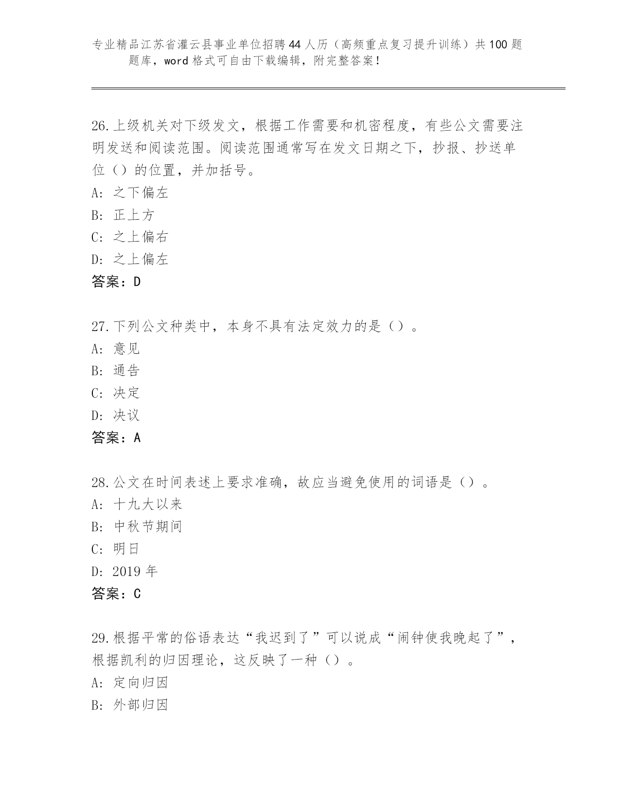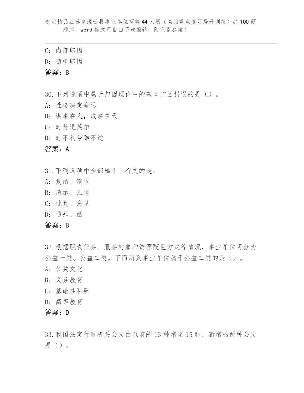 内部培训江苏省灌云县事业单位招聘44人历(高频重点复习提升训练)共100题 精品题库及答案(全国通用)
