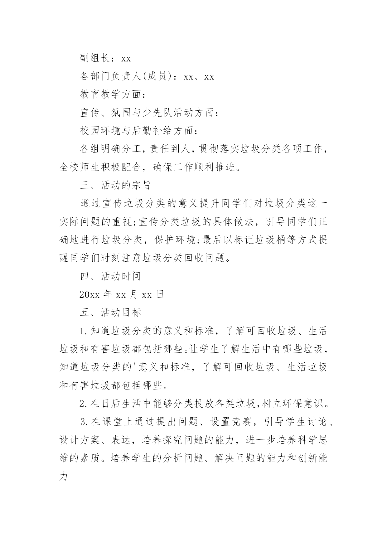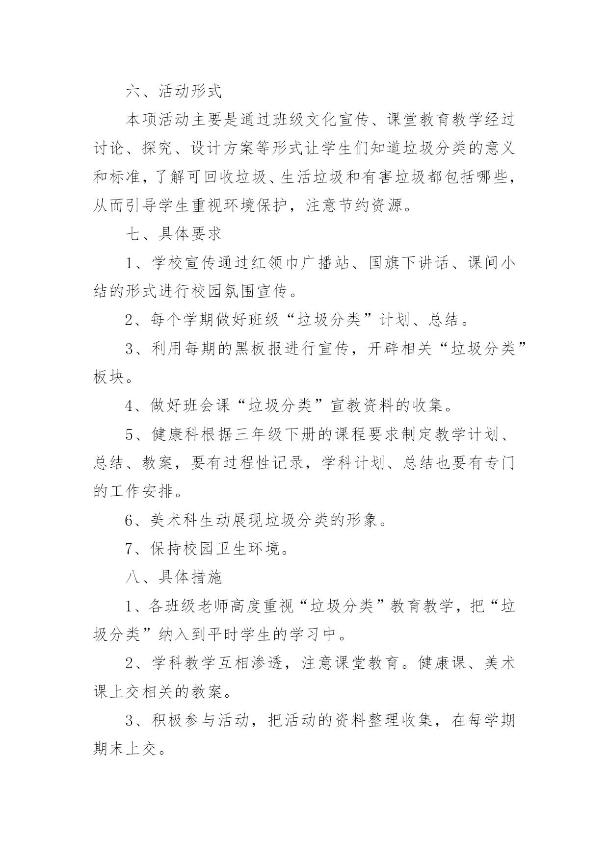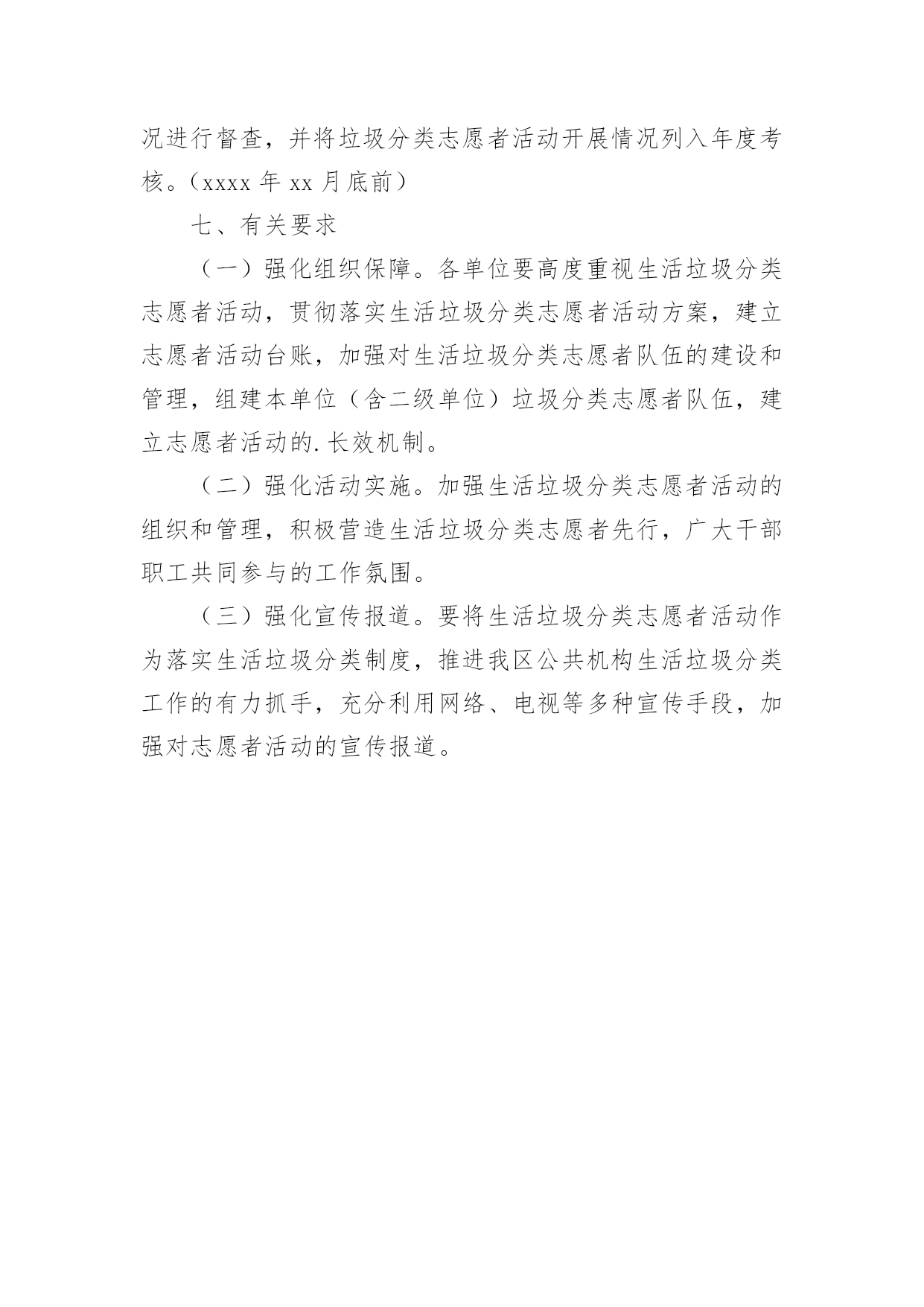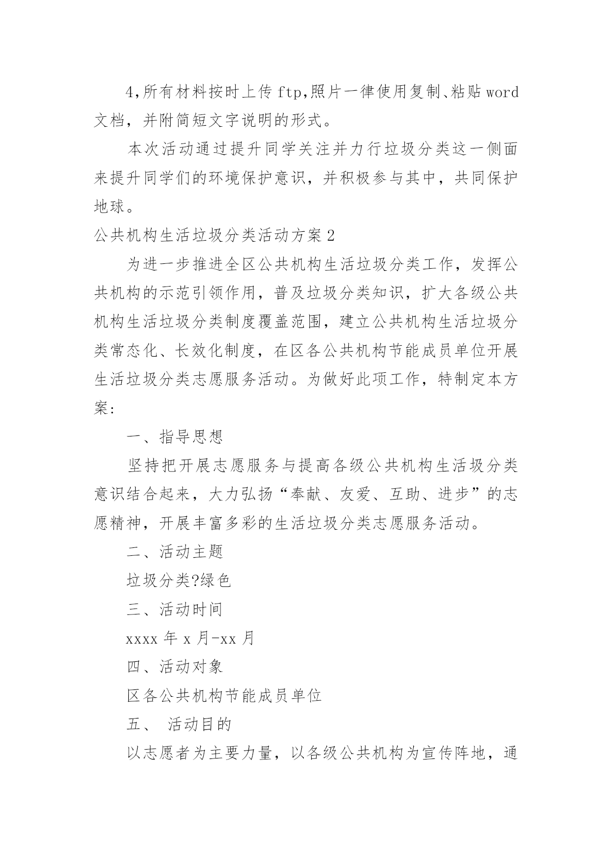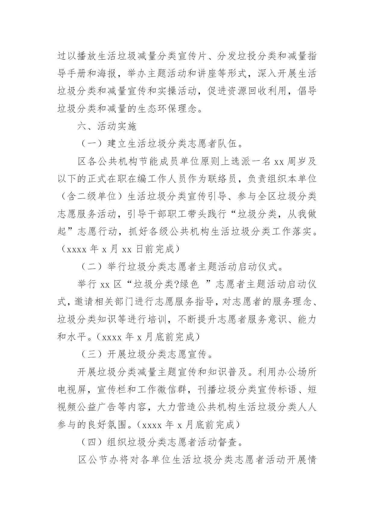 公共机构生活垃圾分类活动方案为了保障事情或工作顺利、圆满进行,常常要根据具体情况预先制定方案,方案是从目的、要求、方式、方法、进度等都部署具体、周密,并有很强可操作性的计划。那么你有了解过方案吗?下面是小编收集整理的公共机构生活垃圾分类活动方案,希望能够帮助到大家。公共机构生活垃圾分类活动方案1城市生活垃圾分类收集工作是实施垃圾减量化、资源化、无害化的一个十分重要的步骤,对于改善人民环境,实现城市的可持续发展,创建节约型社会具有重要意义。城市生活垃圾分类收集,不仅关系到城市的文明程度和城市形象,也是城市生态环境建设最基础的工作,更是一项利国利民的事业。垃圾是放错地方的资源。然而垃圾的回收与利用却被垃圾分类这一问题所限。当今社会,垃圾回收并非技术问题,而是人们没有较强的垃圾分类回收的意识。我校响应上级部门“垃圾分类,环保节能”的号召,举行“垃圾分类,你我有责”主题活动,具体方案如下一、活动的主题垃圾分类,你我有责二、成立学校“垃圾分类,你我有责”主题活动的领导小组组长:xx副组长:xx各部门负责人(成员):xx、xx教育教学方面:宣传、氛围与少先队活动方面:校园环境与后勤补给方面:各组明确分工,责任到人,贯彻落实垃圾分类各项工作,全校师生积极配合,确保工作顺利推进。三、活动的宗旨通过宣传垃圾分类的意义提升同学们对垃圾分类这一实际问题的重视;宣传分类垃圾的具体做法,引导同学们正确地进行垃圾分类,保护环境;最后以标记垃圾桶等方式提醒同学们时刻注意垃圾分类回收问题。四、活动时间20xx年xx月xx日五、活动目标1.知道垃圾分类的意义和标准,了解可回收垃圾、生活垃圾和有害垃圾都包括哪些。让学生了解生活中有哪些垃圾,知道垃圾分类的'意义和标准,了解可回收垃圾、生活垃圾和有害垃圾都包括哪些。2.在日后生活中能够分类投放各类垃圾,树立环保意识。3.在课堂上通过提出问题、设置竞赛,引导学生讨论、设计方案、表达,培养探究问题的能力,进一步培养科学思维的素质。培养学生的分析问题、解决问题的能力和创新能力六、活动形式本项活动主要是通过班级文化宣传、课堂教育教学经过讨论、探究、设计方案等形式让学生们知道垃圾分类的意义和标准,了解可回收垃圾、生活垃圾和有害垃圾都包括哪些,从而引导学生重视环境保护,注意节约资源。七、具体要求1、学校宣传通过红领巾广播站、国旗下讲话、课间小结的形式进行校园氛围宣传。2、每个学期做好班级“垃圾分类”计划、总结。3、利用每期的黑板报进行宣传,开辟相关“垃圾分类”板块。4、做好班会课“垃圾分类”宣教资料的收集。5、健康科根据三年级下册的课程要求制定教学计划、总结、教案,要有过程性记录,学科计划、总结也要有专门的工作安排。6、美术科生动展现垃圾分类的形象。7、保持校园卫生环境。八、具体措施1、各班级老师高度重视“垃圾分类”教育教学,把“垃圾分类”纳入到平时学生的学习中。2、学科教学互相渗透,注意课堂教育。健康课、美术课上交相关的教案。3、积极参与活动,把活动的资料整理收集,在每学期期末上交。4,所有材料按时上传ftp,照片一律使用复制、粘贴word文档,并附简短文字说明的形式。本次活动通过提升同学关注并力行垃圾分类这一侧面来提升同学们的环境保护意识,并积极参与其中,共同保护地球。公共机构生活垃圾分类活动方案2为进一步推进全区公共机构生活垃圾分类工作,发挥公共机构的示范引领作用,普及垃圾分类知识,扩大各级公共机构生活垃圾分类制度覆盖范围,建立公共机构生活垃圾分类常态化、长效化制度,在区各公共机构节能成员单位开展生活垃圾分类志愿服务活动。为做好此项工作,特制定本方案:一、指导思想坚持把开展志愿服务与提高各级公共机构生活圾分类意识结合起来,大力弘扬“奉献、友爱、互助、进步”的志愿精神,开展丰富多彩的生活垃圾分类志愿服务活动。二、活动主题垃圾分类?绿色三、活动时间xxxx年x月-xx月四、活动对象区各公共机构节能成员单位五、活动目的以志愿者为主要力量,以各级公共机构为宣传阵地,通过以播放生活垃圾减量分类宣传片、分发垃投分类和减量指导手册和海报,举办主题活动和讲座等形式,深入开展生活垃圾分类和减量宣传和实操活动,促进资源回收利用,倡导垃圾分类和减量的生态环保理念。六、活动实施(一)建立生活垃圾分类志愿者队伍。区各公共机构节能成员单位原则上选派一名xx周岁及以下的正式在职在编工作人员作为联络员,负责组织本单位(含二级单位)生活垃圾分类宣传引导、参与全区垃圾分类志愿服务活动,引导干部职工带头践行“垃圾分类,从我做起”志愿行动,抓好各级公共机构生活垃圾分类工作落实。(xxxx年x月xx日前完成)(二)举行垃圾分类志愿者主题活动启动仪式。举行xx区“垃圾分类?绿色”志愿者主题活动启动仪式,邀请相关部门进行志愿服务指导,对志愿者的服务理念、垃圾分类