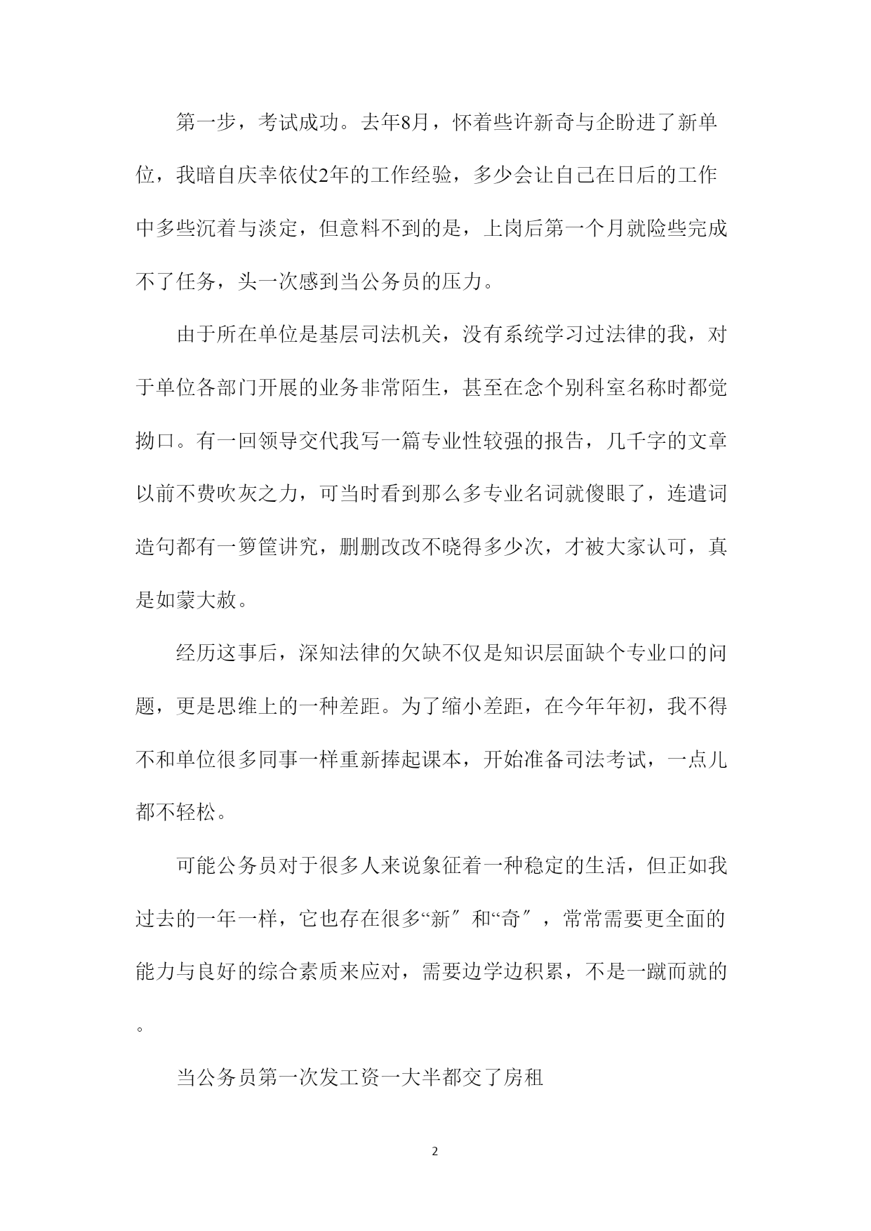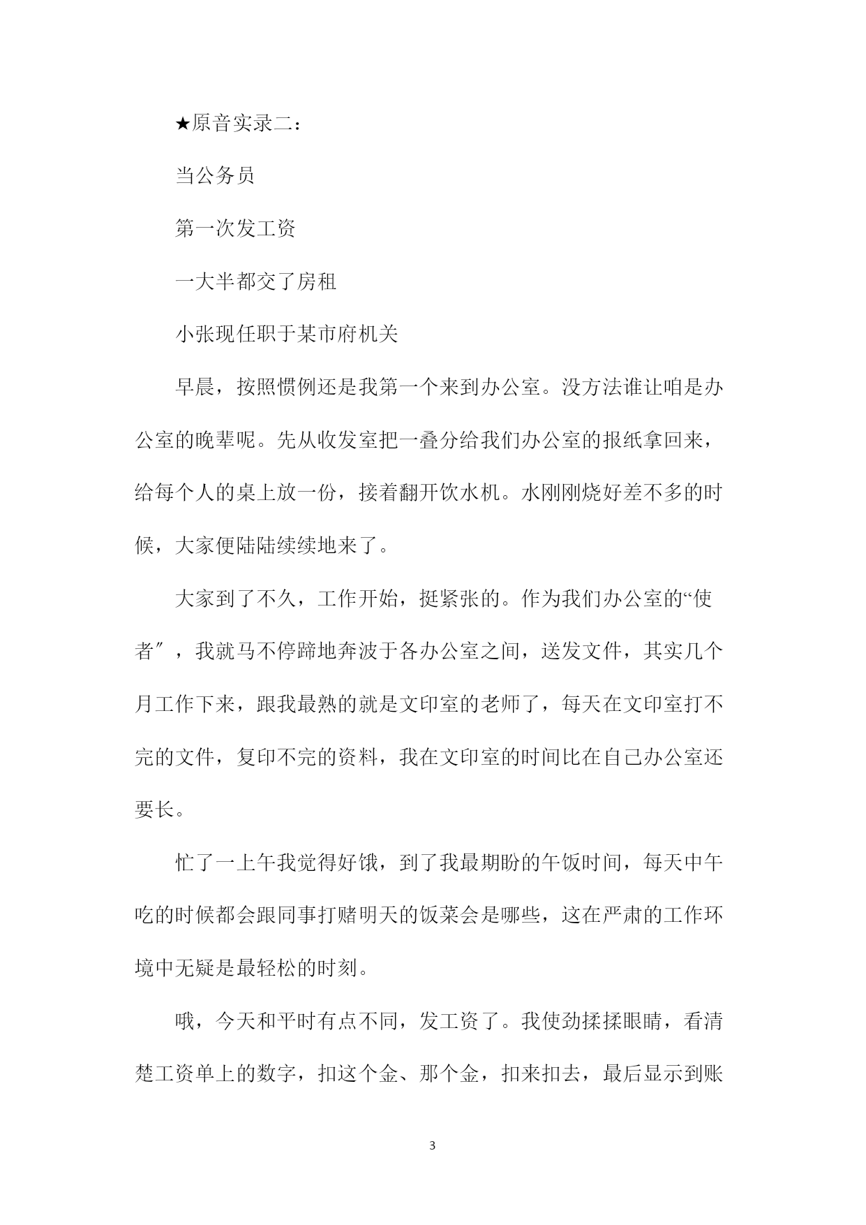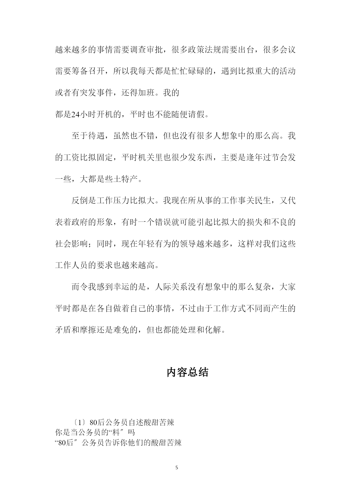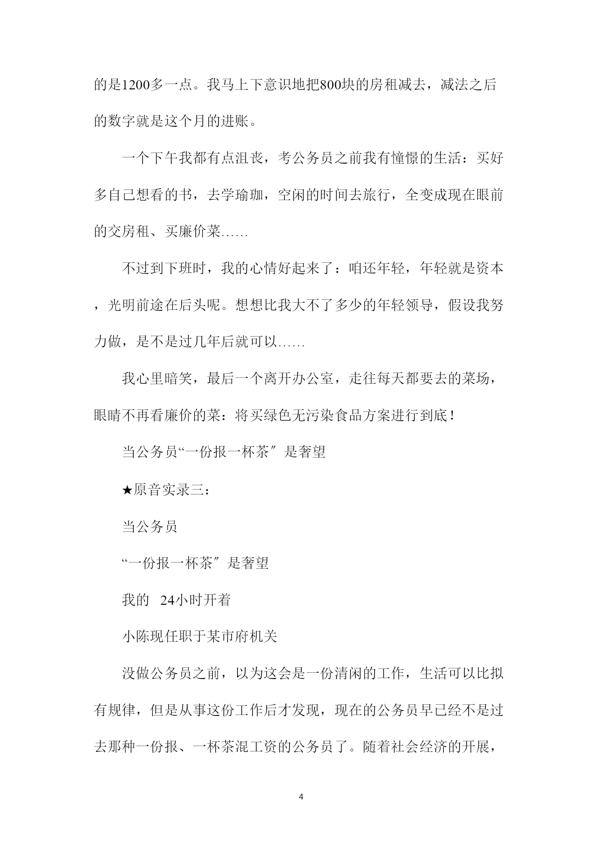 PAGEPAGE680后公务员自述酸甜苦辣你是当公务员的“料〞吗“80后〞公务员告诉你他们的酸甜苦辣明天,2021年国家公务员考试就要举行。公务员考试这几年持续升温,今年我省的参考人数比去年又有增加,其中很大一局部是即将从高校毕业的应届生。有关调查显示,公务员“收入稳定、工作轻松〞是吸引年轻人报考的主要原因之一。然而,你真了解公务员的生活和工作状态吗你确定自己就是当公务员的“料〞吗昨天,我们采访了3位“80后〞公务员,他们向记者诉说了公务员工作的甜酸苦辣,希望能给立志成为公务员的年轻人提供一点参考。★原音实录一:当公务员上岗第一个月我险些没完成任务小夏现任职于某县检察院我2021年大学毕业,先去了一家私企做文案筹划,工作很辛苦。积累了近两年文字工作经验后,我更期待一份稳定而轻松的工作,于是报考了公务员。第一步,考试成功。去年8月,怀着些许新奇与企盼进了新单位,我暗自庆幸依仗2年的工作经验,多少会让自己在日后的工作中多些沉着与淡定,但意料不到的是,上岗后第一个月就险些完成不了任务,头一次感到当公务员的压力。由于所在单位是基层司法机关,没有系统学习过法律的我,对于单位各部门开展的业务非常陌生,甚至在念个别科室名称时都觉拗口。有一回领导交代我写一篇专业性较强的报告,几千字的文章以前不费吹灰之力,可当时看到那么多专业名词就傻眼了,连遣词造句都有一箩筐讲究,删删改改不晓得多少次,才被大家认可,真是如蒙大赦。经历这事后,深知法律的欠缺不仅是知识层面缺个专业口的问题,更是思维上的一种差距。为了缩小差距,在今年年初,我不得不和单位很多同事一样重新捧起课本,开始准备司法考试,一点儿都不轻松。可能公务员对于很多人来说象征着一种稳定的生活,但正如我过去的一年一样,它也存在很多“新〞和“奇〞,常常需要更全面的能力与良好的综合素质来应对,需要边学边积累,不是一蹴而就的。当公务员第一次发工资一大半都交了房租★原音实录二:当公务员第一次发工资一大半都交了房租小张现任职于某市府机关早晨,按照惯例还是我第一个来到办公室。没方法谁让咱是办公室的晚辈呢。先从收发室把一叠分给我们办公室的报纸拿回来,给每个人的桌上放一份,接着翻开饮水机。水刚刚烧好差不多的时候,大家便陆陆续续地来了。大家到了不久,工作开始,挺紧张的。作为我们办公室的“使者〞,我就马不停蹄地奔波于各办公室之间,送发文件,其实几个月工作下来,跟我最熟的就是文印室的老师了,每天在文印室打不完的文件,复印不完的资料,我在文印室的时间比在自己办公室还要长。忙了一上午我觉得好饿,到了我最期盼的午饭时间,每天中午吃的时候都会跟同事打赌明天的饭菜会是哪些,这在严肃的工作环境中无疑是最轻松的时刻。哦,今天和平时有点不同,发工资了。我使劲揉揉眼睛,看清楚工资单上的数字,扣这个金、那个金,扣来扣去,最后显示到账的是1200多一点。我马上下意识地把800块的房租减去,减法之后的数字就是这个月的进账。一个下午我都有点沮丧,考公务员之前我有憧憬的生活:买好多自己想看的书,去学瑜珈,空闲的时间去旅行,全变成现在眼前的交房租、买廉价菜……不过到下班时,我的心情好起来了:咱还年轻,年轻就是资本,光明前途在后头呢。想想比我大不了多少的年轻领导,假设我努力做,是不是过几年后就可以……我心里暗笑,最后一个离开办公室,走往每天都要去的菜场,眼睛不再看廉价的菜:将买绿色无污染食品方案进行到底!当公务员“一份报一杯茶〞是奢望★原音实录三:当公务员“一份报一杯茶〞是奢望我的24小时开着小陈现任职于某市府机关没做公务员之前,以为这会是一份清闲的工作,生活可以比拟有规律,但是从事这份工作后才发现,现在的公务员早已经不是过去那种一份报、一杯茶混工资的公务员了。随着社会经济的开展,越来越多的事情需要调查审批,很多政策法规需要出台,很多会议需要筹备召开,所以我每天都是忙忙碌碌的,遇到比拟重大的活动或者有突发事件,还得加班。我的都是24小时开机的,平时也不能随便请假。至于待遇,虽然也不错,但也没有很多人想象中的那么高。我的工资比拟固定,平时机关里也很少发东西,主要是逢年过节会发一些,大都是些土特产。反倒是工作压力比拟大。我现在所从事的工作事关民生,又代表着政府的形象,有时一个错误就可能引起比拟大的损失和不良的社会影响;同时,现在年轻有为的领导越来越多,这样对我们这些工作人员的要求也越来越高。而令我感到幸运的是,人际关系没有想象中的那么复杂,大家平时都是在各自做着自己的事情,不过由于工作方式不同而产生的矛盾和摩擦还是难免的,但也都能处理和化解。内容总结〔1〕80后公务员自述酸甜苦辣你是当公务员的“料〞吗“80后〞公务员告诉你他们的酸甜苦辣明天,20