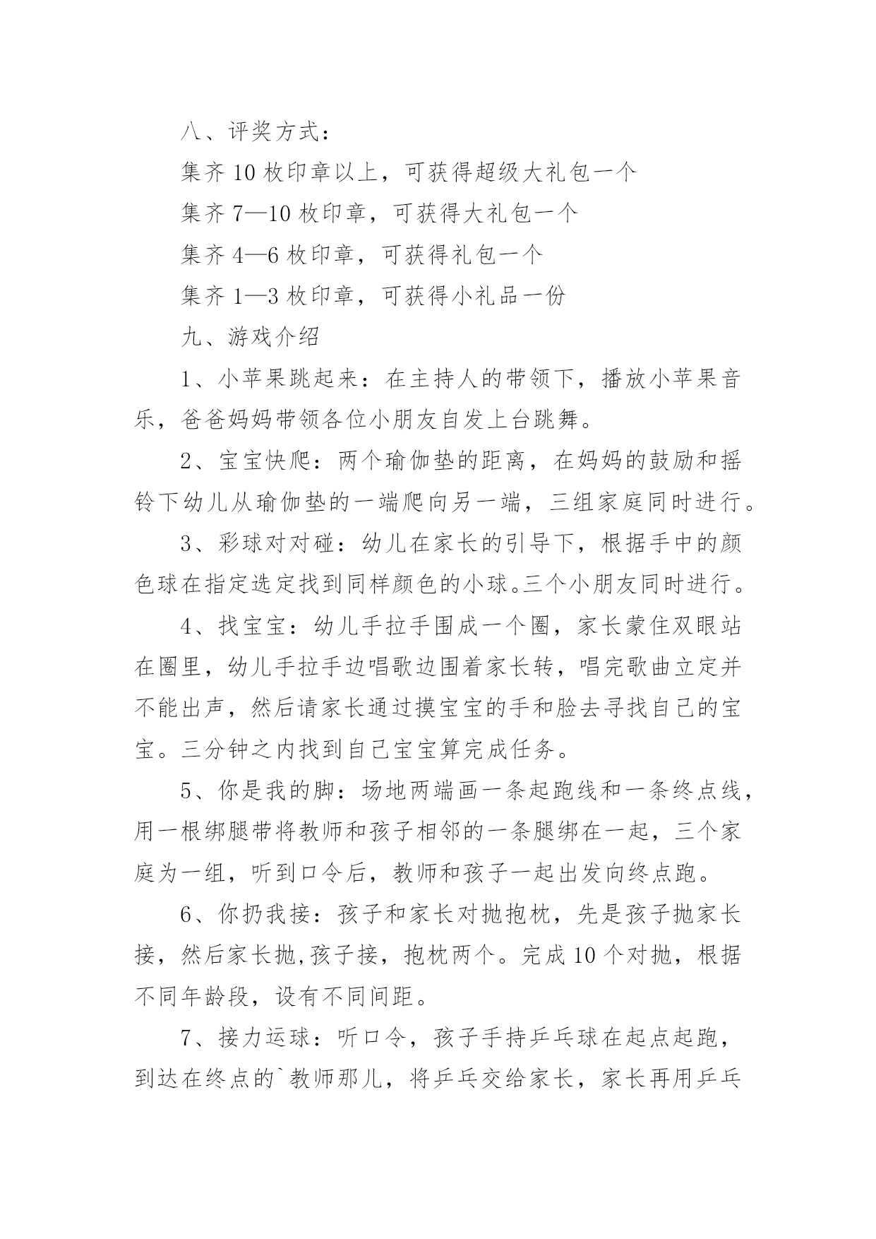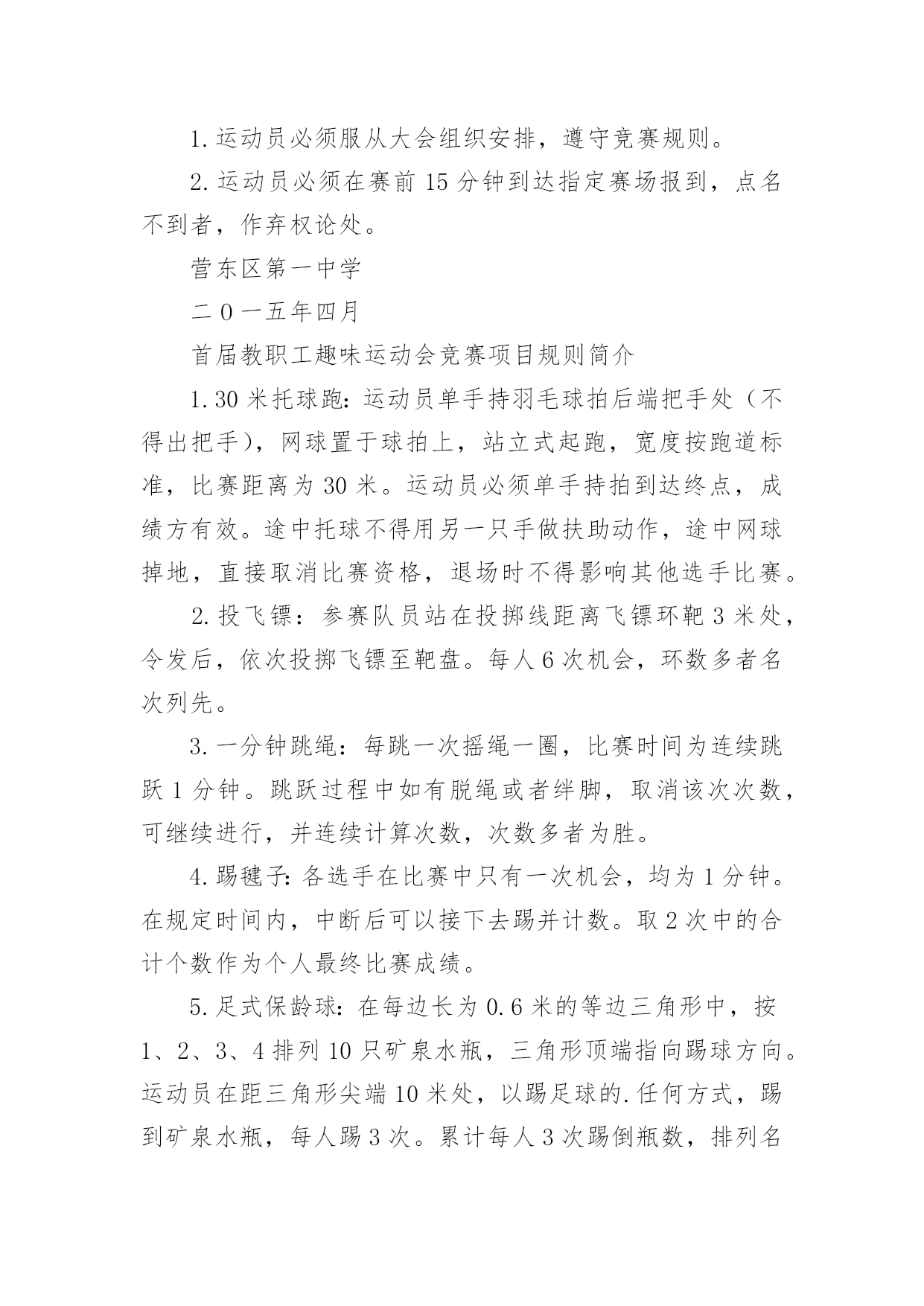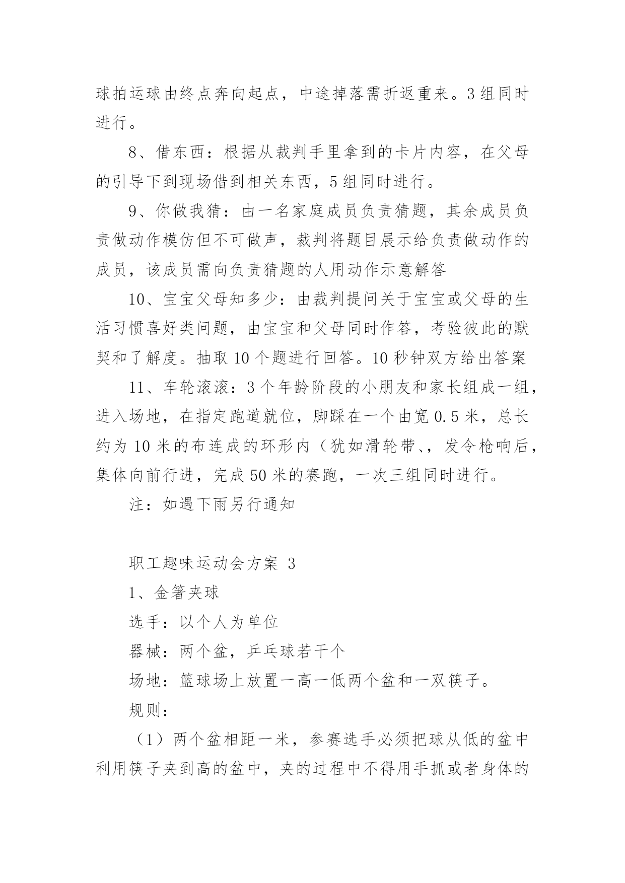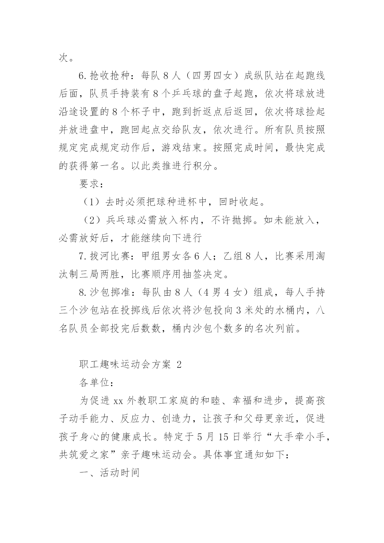 职工趣味运动会方案职工趣味运动会方案(通用20篇)为保障事情或工作顺利开展,往往需要预先进行方案制定工作,方案可以对一个行动明确一个大概的方向。方案的格式和要求是什么样的呢?下面是小编为大家整理的职工趣味运动会方案,希望能够帮助到大家。职工趣味运动会方案1为丰富教职工文体生活,展示教职工风采,进一步弘扬“竞和”学校精神,经学校研究决定,举行首届教职工趣味运动会。现将有关事项通知如下,希望老师们积极准备,争取优异成绩。一、时间:四月中下旬二、地点:学校操场三、参加对象:教工组队:参赛队员分甲、乙两个组别甲组:六年级级部七年级级部八年级级部九年级级部综合组(校领导:z,办公室、工会、后勤、财务、图书馆、信息中心)共五个组。注:其他各处室的教职工归属自己的代课级部。乙组:一年级级部二年级级部三年级级部四年级级部五年级级部共五个组。四、比赛项目:1.个人项目女子组:托球跑跳绳踢毽子足式保龄球男子:定点投篮自行车慢骑足球射门投掷飞镖2.集体项目拔河比赛沙包投准4x50m接力抢收抢种要求:教师必须参加个人项目的比赛,个人项目每人限报2项。五、报名:1.各代表队可报领队一人,教练员一人。2.个人项目每人限报两项,可兼报集体项目。3.报名表于4月10日前报至政教(电子版放ftp中学政教,小学报z处)。4.集体项目,每个项目每个代表队限报一组队员参加六、录取名次与计分:1.单项取前六名,按7、5、4、3、2、1计分。2.团体取前三名,以各队在各单项中得分之和计算团体总分,如遇两队或两队以上得分相等,则以获第一名多的队名次列前,余类推。七、奖励办法每个项目根据竞赛结果,评出一等奖、二等奖、三等奖进行奖励;凡参加人员每人一份纪念品。八、参赛须知:1.运动员必须服从大会组织安排,遵守竞赛规则。2.运动员必须在赛前15分钟到达指定赛场报到,点名不到者,作弃权论处。营东区第一中学二O一五年四月首届教职工趣味运动会竞赛项目规则简介1.30米托球跑:运动员单手持羽毛球拍后端把手处(不得出把手),网球置于球拍上,站立式起跑,宽度按跑道标准,比赛距离为30米。运动员必须单手持拍到达终点,成绩方有效。途中托球不得用另一只手做扶助动作,途中网球掉地,直接取消比赛资格,退场时不得影响其他选手比赛。2.投飞镖:参赛队员站在投掷线距离飞镖环靶3米处,令发后,依次投掷飞镖至靶盘。每人6次机会,环数多者名次列先。3.一分钟跳绳:每跳一次摇绳一圈,比赛时间为连续跳跃1分钟。跳跃过程中如有脱绳或者绊脚,取消该次次数,可继续进行,并连续计算次数,次数多者为胜。4.踢毽子:各选手在比赛中只有一次机会,均为1分钟。在规定时间内,中断后可以接下去踢并计数。取2次中的合计个数作为个人最终比赛成绩。5.足式保龄球:在每边长为0.6米的等边三角形中,按1、2、3、4排列10只矿泉水瓶,三角形顶端指向踢球方向。运动员在距三角形尖端10米处,以踢足球的.任何方式,踢到矿泉水瓶,每人踢3次。累计每人3次踢倒瓶数,排列名次。6.抢收抢种:每队8人(四男四女)成纵队站在起跑线后面,队员手持装有8个乒乓球的盘子起跑,依次将球放进沿途设置的8个杯子中,跑到折返点后返回,依次将球捡起并放进盘中,跑回起点交给队友,依次进行。所有队员按照规定完成规定动作后,游戏结束。按照完成时间,最快完成的获得第一名。以此类推进行积分。要求:(1)去时必须把球种进杯中,回时收起。(2)兵乓球必需放入杯内,不许抛掷。如未能放入,必需放好后,才能继续向下进行7.拔河比赛:甲组男女各6人;乙组8人,比赛采用淘汰制三局两胜,比赛顺序用抽签决定。8.沙包掷准:每队由8人(4男4女)组成,每人手持三个沙包站在投掷线后依次将沙包投向3米处的水桶内,八名队员全部投完后数数,桶内沙包个数多的名次列前。职工趣味运动会方案2各单位:为促进xx外教职工家庭的和睦、幸福和进步,提高孩子动手能力、反应力、创造力,让孩子和父母更亲近,促进孩子身心的健康成长。特定于5月15日举行“大手牵小手,共筑爱之家”亲子趣味运动会。具体事宜通知如下:一、活动时间5月15日(本周日、上午9:00点开始,活动时间半天二、活动地点山下排球场三、活动主题“大手牵小手,共筑爱之家”四、活动对象xx外国语大学全体教职工及子女,以家庭为单位报名参加。五、活动要求请各家庭于5月15日上午8:40到山下排球场报到。六、报名报名时间:5.9-5.12报名方式:编辑内容“所属单位+老师姓名+孩子姓名+孩子年龄+联系电话+活动项目”(如“宣传部+王某某+孩子姓名+3岁+1+宝宝快爬、接力传球”、发送至1(王同学、。注:如一个家庭有两个孩子,请编辑两条进行发送;七、活动内容2岁以下;小苹果跳起来;宝宝快爬;颜色对对碰2—5岁;小苹果跳起来;找宝宝;你扔我接;接力运球:借东西;车轮滚滚6—8岁: