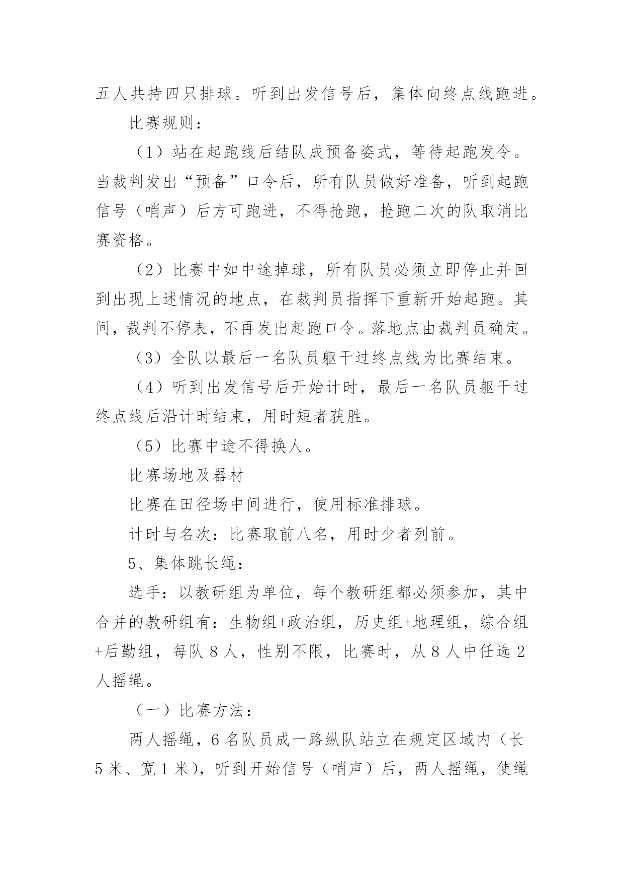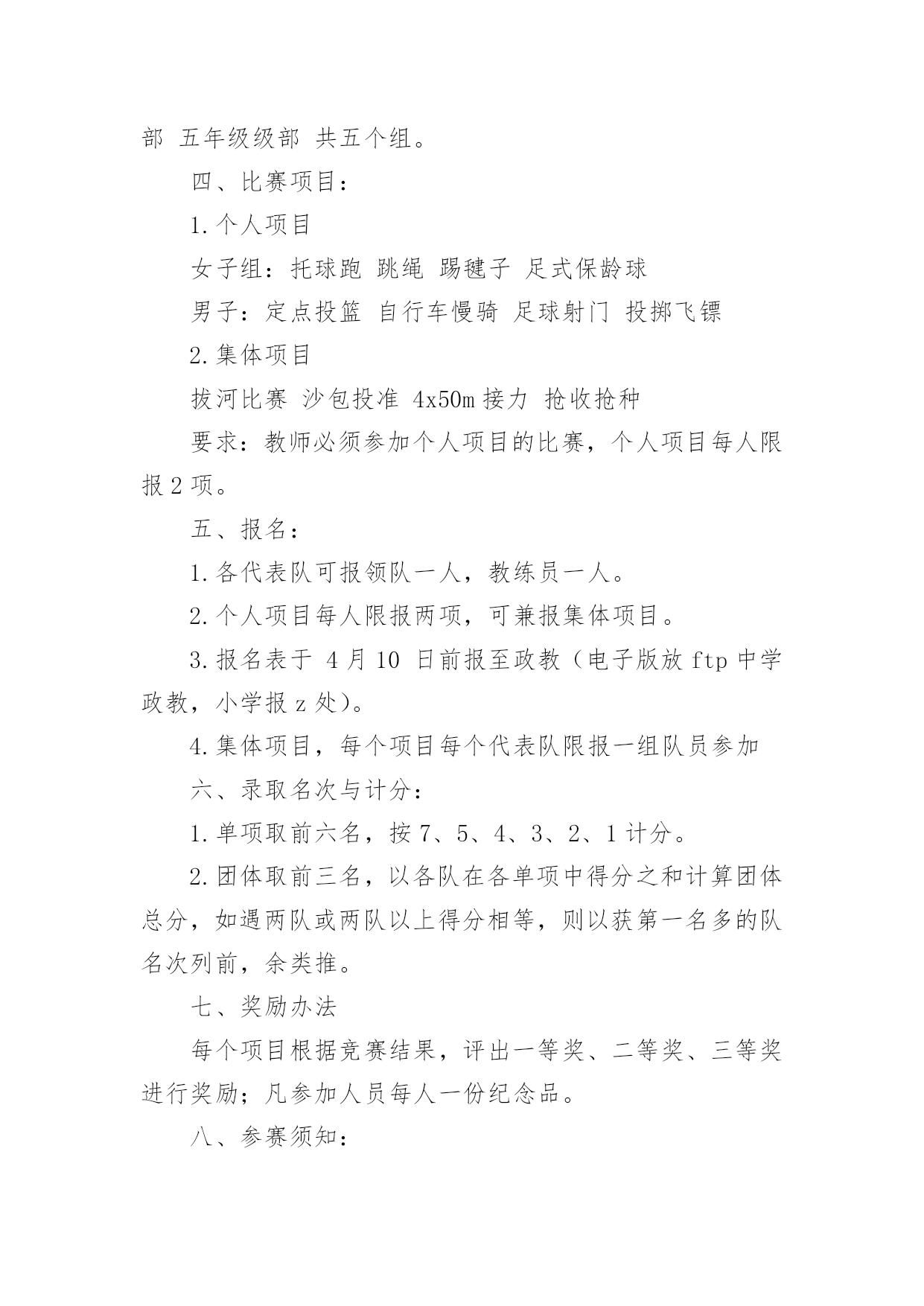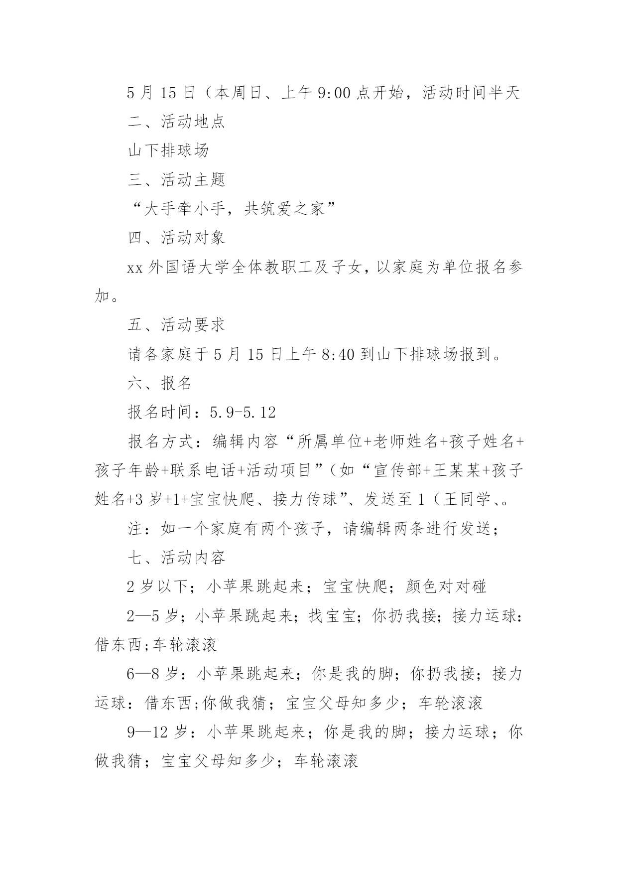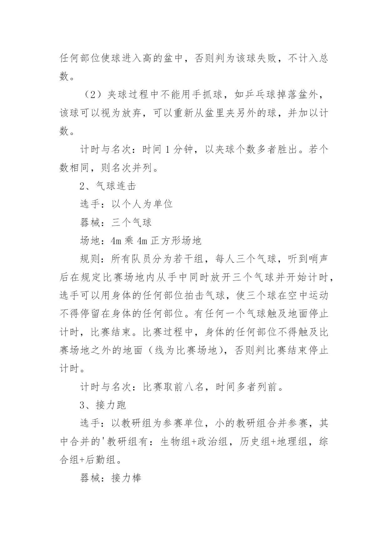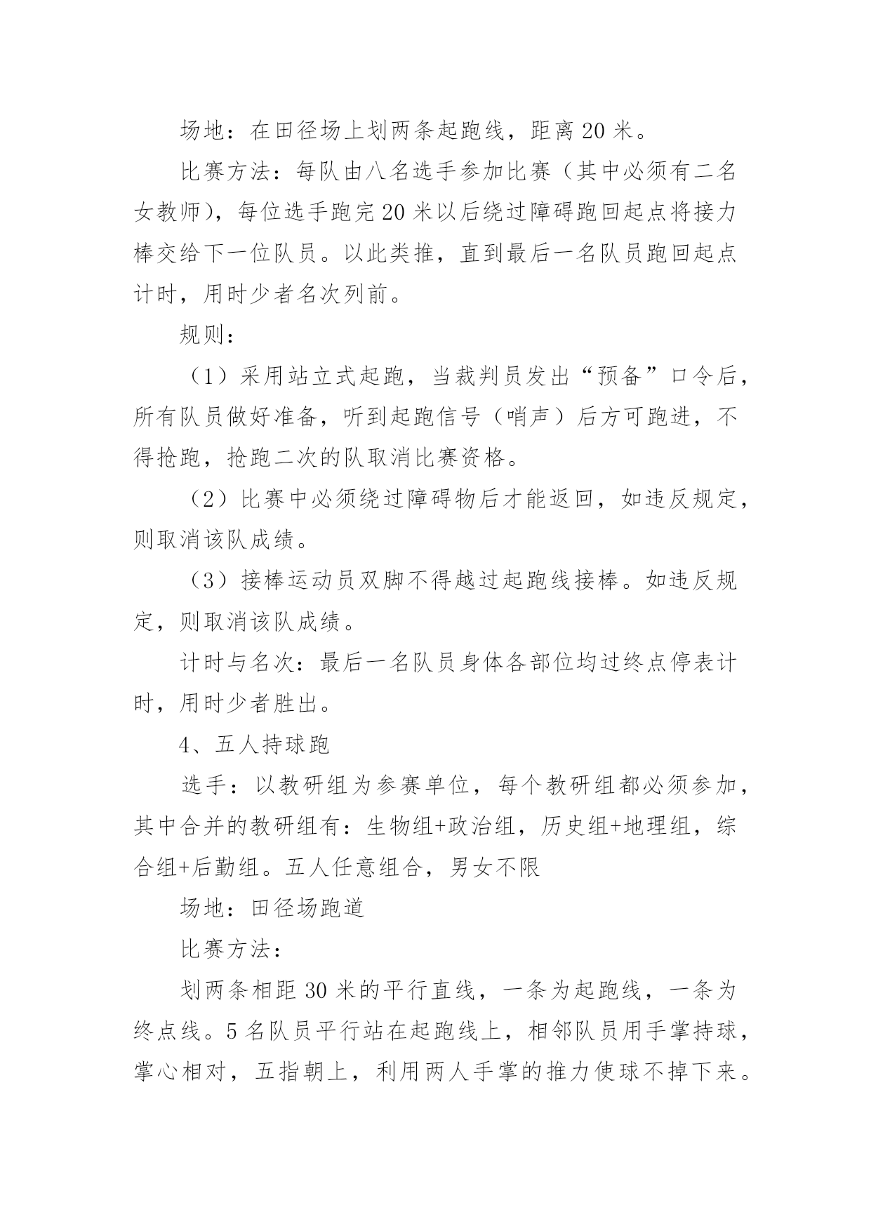 职工趣味运动会方案职工趣味运动会方案(通用20篇)为保障事情或工作顺利开展,往往需要预先进行方案制定工作,方案可以对一个行动明确一个大概的方向。方案的格式和要求是什么样的呢?下面是小编为大家整理的职工趣味运动会方案,希望能够帮助到大家。职工趣味运动会方案1为丰富教职工文体生活,展示教职工风采,进一步弘扬“竞和”学校精神,经学校研究决定,举行首届教职工趣味运动会。现将有关事项通知如下,希望老师们积极准备,争取优异成绩。一、时间:四月中下旬二、地点:学校操场三、参加对象:教工组队:参赛队员分甲、乙两个组别甲组:六年级级部七年级级部八年级级部九年级级部综合组(校领导:z,办公室、工会、后勤、财务、图书馆、信息中心)共五个组。注:其他各处室的教职工归属自己的代课级部。乙组:一年级级部二年级级部三年级级部四年级级部五年级级部共五个组。四、比赛项目:1.个人项目女子组:托球跑跳绳踢毽子足式保龄球男子:定点投篮自行车慢骑足球射门投掷飞镖2.集体项目拔河比赛沙包投准4x50m接力抢收抢种要求:教师必须参加个人项目的比赛,个人项目每人限报2项。五、报名:1.各代表队可报领队一人,教练员一人。2.个人项目每人限报两项,可兼报集体项目。3.报名表于4月10日前报至政教(电子版放ftp中学政教,小学报z处)。4.集体项目,每个项目每个代表队限报一组队员参加六、录取名次与计分:1.单项取前六名,按7、5、4、3、2、1计分。2.团体取前三名,以各队在各单项中得分之和计算团体总分,如遇两队或两队以上得分相等,则以获第一名多的队名次列前,余类推。七、奖励办法每个项目根据竞赛结果,评出一等奖、二等奖、三等奖进行奖励;凡参加人员每人一份纪念品。八、参赛须知:1.运动员必须服从大会组织安排,遵守竞赛规则。2.运动员必须在赛前15分钟到达指定赛场报到,点名不到者,作弃权论处。营东区第一中学二O一五年四月首届教职工趣味运动会竞赛项目规则简介1.30米托球跑:运动员单手持羽毛球拍后端把手处(不得出把手),网球置于球拍上,站立式起跑,宽度按跑道标准,比赛距离为30米。运动员必须单手持拍到达终点,成绩方有效。途中托球不得用另一只手做扶助动作,途中网球掉地,直接取消比赛资格,退场时不得影响其他选手比赛。2.投飞镖:参赛队员站在投掷线距离飞镖环靶3米处,令发后,依次投掷飞镖至靶盘。每人6次机会,环数多者名次列先。3.一分钟跳绳:每跳一次摇绳一圈,比赛时间为连续跳跃1分钟。跳跃过程中如有脱绳或者绊脚,取消该次次数,可继续进行,并连续计算次数,次数多者为胜。4.踢毽子:各选手在比赛中只有一次机会,均为1分钟。在规定时间内,中断后可以接下去踢并计数。取2次中的合计个数作为个人最终比赛成绩。5.足式保龄球:在每边长为0.6米的等边三角形中,按1、2、3、4排列10只矿泉水瓶,三角形顶端指向踢球方向。运动员在距三角形尖端10米处,以踢足球的.任何方式,踢到矿泉水瓶,每人踢3次。累计每人3次踢倒瓶数,排列名次。6.抢收抢种:每队8人(四男四女)成纵队站在起跑线后面,队员手持装有8个乒乓球的盘子起跑,依次将球放进沿途设置的8个杯子中,跑到折返点后返回,依次将球捡起并放进盘中,跑回起点交给队友,依次进行。所有队员按照规定完成规定动作后,游戏结束。按照完成时间,最快完成的获得第一名。以此类推进行积分。要求:(1)去时必须把球种进杯中,回时收起。(2)兵乓球必需放入杯内,不许抛掷。如未能放入,必需放好后,才能继续向下进行7.拔河比赛:甲组男女各6人;乙组8人,比赛采用淘汰制三局两胜,比赛顺序用抽签决定。8.沙包掷准:每队由8人(4男4女)组成,每人手持三个沙包站在投掷线后依次将沙包投向3米处的水桶内,八名队员全部投完后数数,桶内沙包个数多的名次列前。职工趣味运动会方案2各单位:为促进xx外教职工家庭的和睦、幸福和进步,提高孩子动手能力、反应力、创造力,让孩子和父母更亲近,促进孩子身心的健康成长。特定于5月15日举行“大手牵小手,共筑爱之家”亲子趣味运动会。具体事宜通知如下:一、活动时间5月15日(本周日、上午9:00点开始,活动时间半天二、活动地点山下排球场三、活动主题“大手牵小手,共筑爱之家”四、活动对象xx外国语大学全体教职工及子女,以家庭为单位报名参加。五、活动要求请各家庭于5月15日上午8:40到山下排球场报到。六、报名报名时间:5.9-5.12报名方式:编辑内容“所属单位+老师姓名+孩子姓名+孩子年龄+联系电话+活动项目”(如“宣传部+王某某+孩子姓名+3岁+1+宝宝快爬、接力传球”、发送至1(王同学、。注:如一个家庭有两个孩子,请编辑两条进行发送;七、活动内容2岁以下;小苹果跳起来;宝宝快爬;颜色对对碰2—5岁;小苹果跳起来;找宝宝;你扔我接;接力运球:借东西;车轮滚滚6—8岁: