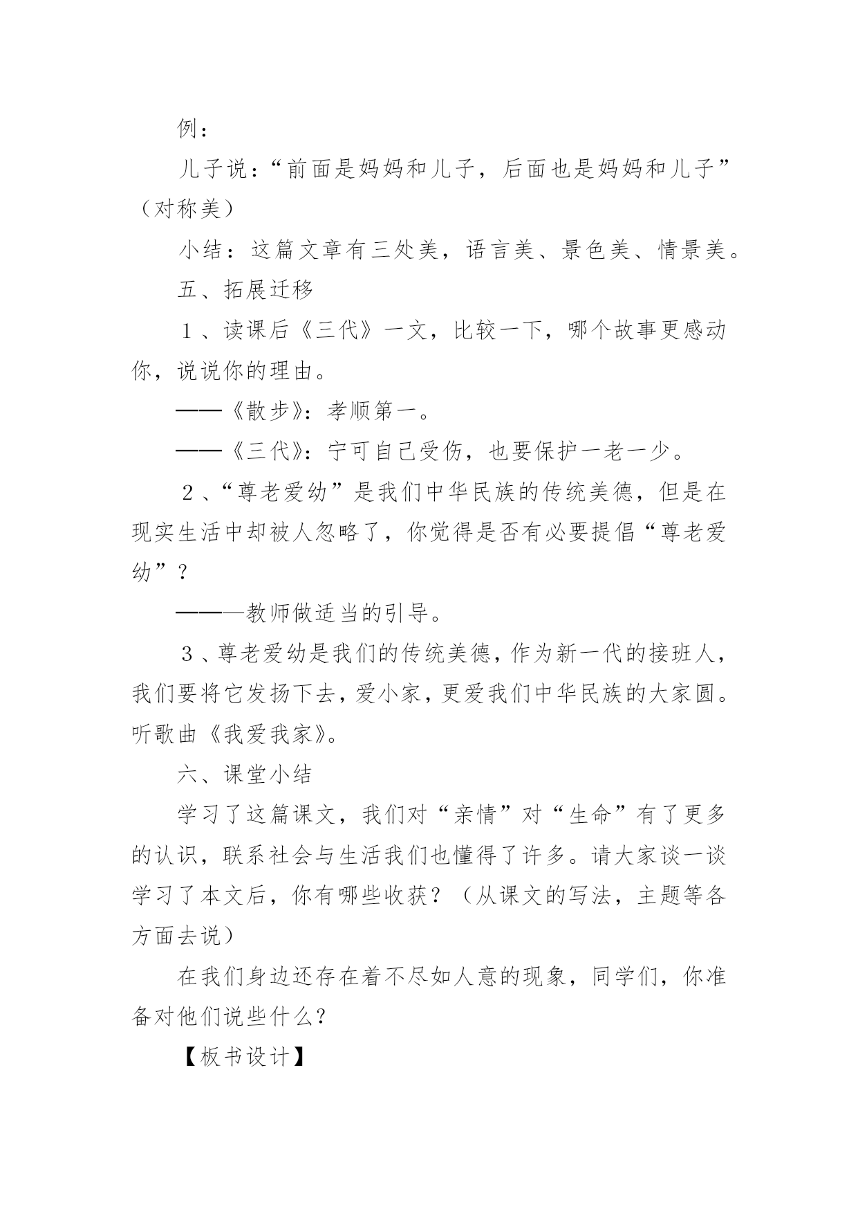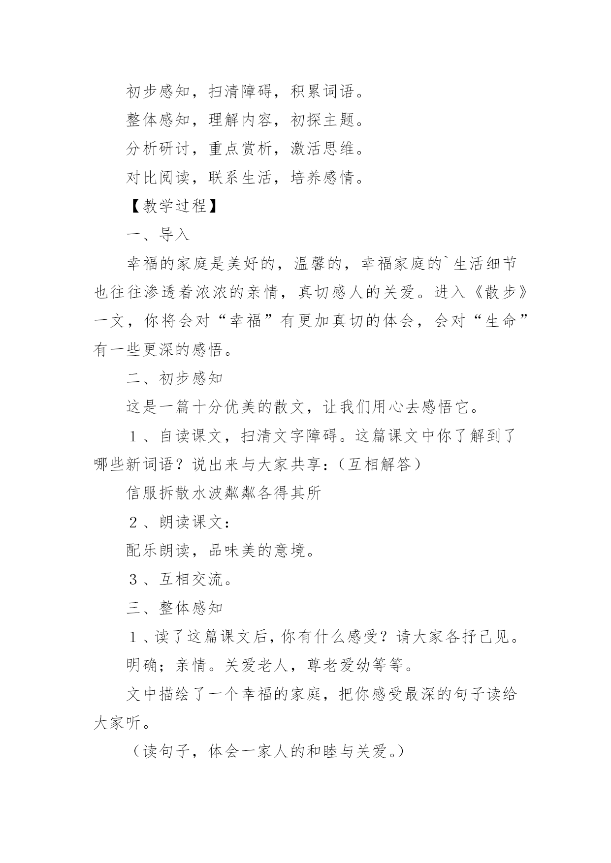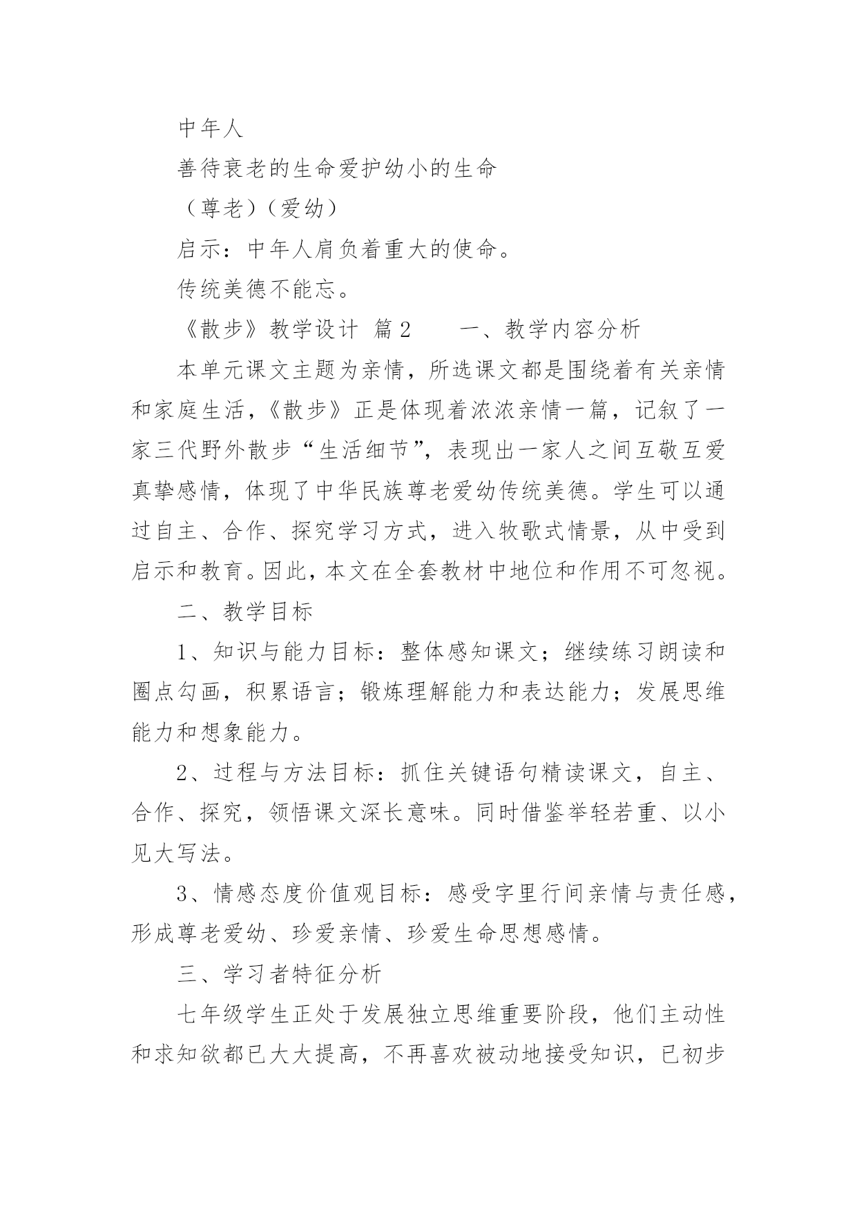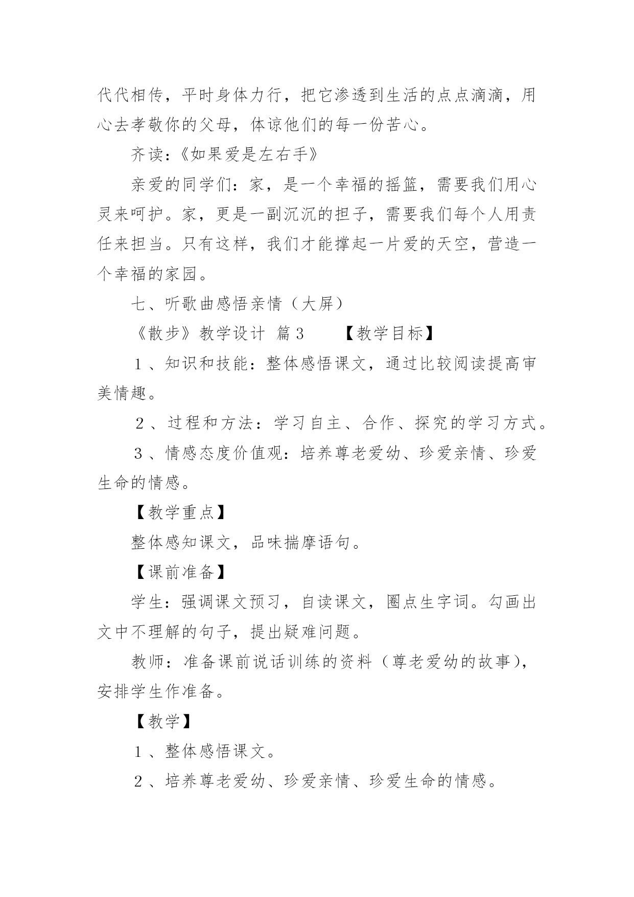 《散步》教学设计《散步》教学设计作为一名辛苦耕耘的教育工作者,就难以避免地要准备教学设计,教学设计是根据课程标准的要求和教学对象的特点,将教学诸要素有序安排,确定合适的教学方案的设想和计划。那么应当如何写教学设计呢?以下是小编精心整理的《散步》教学设计,希望对大家有所帮助。《散步》教学设计篇1【教学目标】1、学习理解课文优美的语言。2、能恰当运用在朗读中品味文章内容的方法。3、结合自身实际,理解,感悟文中亲情。【教学重点】运用在朗读中品味文章内容的方法,深入体会文章主题。【教学难点】学会揣摩,品味语言特点。【教学设想】本文是一篇散文,主要是将朗读教学贯穿始终,让学生在朗读中感知课文内容,在朗读中感受文章语言的美,进而学会揣摩。品味文章语言,并通过联系生活实际加深对文章主题的理解。培养学生爱家(小家),爱国家(大家)的思想感情。【教学步骤】初步感知,扫清障碍,积累词语。整体感知,理解内容,初探主题。分析研讨,重点赏析,激活思维。对比阅读,联系生活,培养感情。【教学过程】一、导入幸福的家庭是美好的,温馨的,幸福家庭的`生活细节也往往渗透着浓浓的亲情,真切感人的关爱。进入《散步》一文,你将会对“幸福”有更加真切的体会,会对“生命”有一些更深的感悟。二、初步感知这是一篇十分优美的散文,让我们用心去感悟它。1、自读课文,扫清文字障碍。这篇课文中你了解到了哪些新词语?说出来与大家共享:(互相解答)信服拆散水波粼粼各得其所2、朗读课文:配乐朗读,品味美的意境。3、互相交流。三、整体感知1、读了这篇课文后,你有什么感受?请大家各抒己见。明确;亲情。关爱老人,尊老爱幼等等。文中描绘了一个幸福的家庭,把你感受最深的句子读给大家听。(读句子,体会一家人的和睦与关爱。)2、课文描写了发生在一家三代人之间的感人故事。再读课文,说一说:课文中刻画了怎样的人物形象,你觉得文中的老人幸福吗?学生评论:老人有一个孝顺的儿子,可爱聪明的小孙子,还有贤惠懂事的儿媳妇,所以老人是幸福的。我们身边也有许多的老人,你觉得他们幸福吗?──幸福。他们子女事业有成,孝敬老人……──也有不幸福的。原因是无人照顾,甚至有的被当成累赘;或者有的虽然儿女在身边,但却不能体谅老人内心的孤独……你的爷爷奶奶幸福吗?学了这篇课文后,你以准备为他们作些什么?(各抒己见,畅所欲言)3、自己有感情的朗读课文,感悟文章的亲情美。四、分析研讨,重点赏析1、课文结尾说:“好象我背上的和她背上的加起来就是整个世界”,说说如何理解这句话?学生分小组讨论:──—明确:作为中年人“我们”肩负着重要的使命,既要照顾老人,又要照顾儿子(既要尊老又要爱幼)。一个家庭是这样,一个民族,一个国家又何尝不是这样?2、本文是一篇散文,除了感人外,语言也很优美,很值得我们细细品味,找出你喜欢的句子来,小组交流,说说它美在何处?例:儿子说:“前面是妈妈和儿子,后面也是妈妈和儿子”(对称美)小结:这篇文章有三处美,语言美、景色美、情景美。五、拓展迁移1、读课后《三代》一文,比较一下,哪个故事更感动你,说说你的理由。──《散步》:孝顺第一。──《三代》:宁可自己受伤,也要保护一老一少。2、“尊老爱幼”是我们中华民族的传统美德,但是在现实生活中却被人忽略了,你觉得是否有必要提倡“尊老爱幼”?──—教师做适当的引导。3、尊老爱幼是我们的传统美德,作为新一代的接班人,我们要将它发扬下去,爱小家,更爱我们中华民族的大家圆。听歌曲《我爱我家》。六、课堂小结学习了这篇课文,我们对“亲情”对“生命”有了更多的认识,联系社会与生活我们也懂得了许多。请大家谈一谈学习了本文后,你有哪些收获?(从课文的写法,主题等各方面去说)在我们身边还存在着不尽如人意的现象,同学们,你准备对他们说些什么?【板书设计】中年人善待衰老的生命爱护幼小的生命(尊老)(爱幼)启示:中年人肩负着重大的使命。传统美德不能忘。《散步》教学设计篇2一、教学内容分析本单元课文主题为亲情,所选课文都是围绕着有关亲情和家庭生活,《散步》正是体现着浓浓亲情一篇,记叙了一家三代野外散步“生活细节”,表现出一家人之间互敬互爱真挚感情,体现了中华民族尊老爱幼传统美德。学生可以通过自主、合作、探究学习方式,进入牧歌式情景,从中受到启示和教育。因此,本文在全套教材中地位和作用不可忽视。二、教学目标1、知识与能力目标:整体感知课文;继续练习朗读和圈点勾画,积累语言;锻炼理解能力和表达能力;发展思维能力和想象能力。2、过程与方法目标:抓住关键语句精读课文,自主、合作、探究,领悟课文深长意味。同时借鉴举轻若重、以小见大写法。3、情感态度价值观目标:感受字里行间亲情与责任感,形成尊老爱幼、珍爱亲情、珍爱生命思想感情。三、学习者特征分析七年级学生正处于发展独立思维重要阶段,他们主动性和求知欲都已大大提高,不