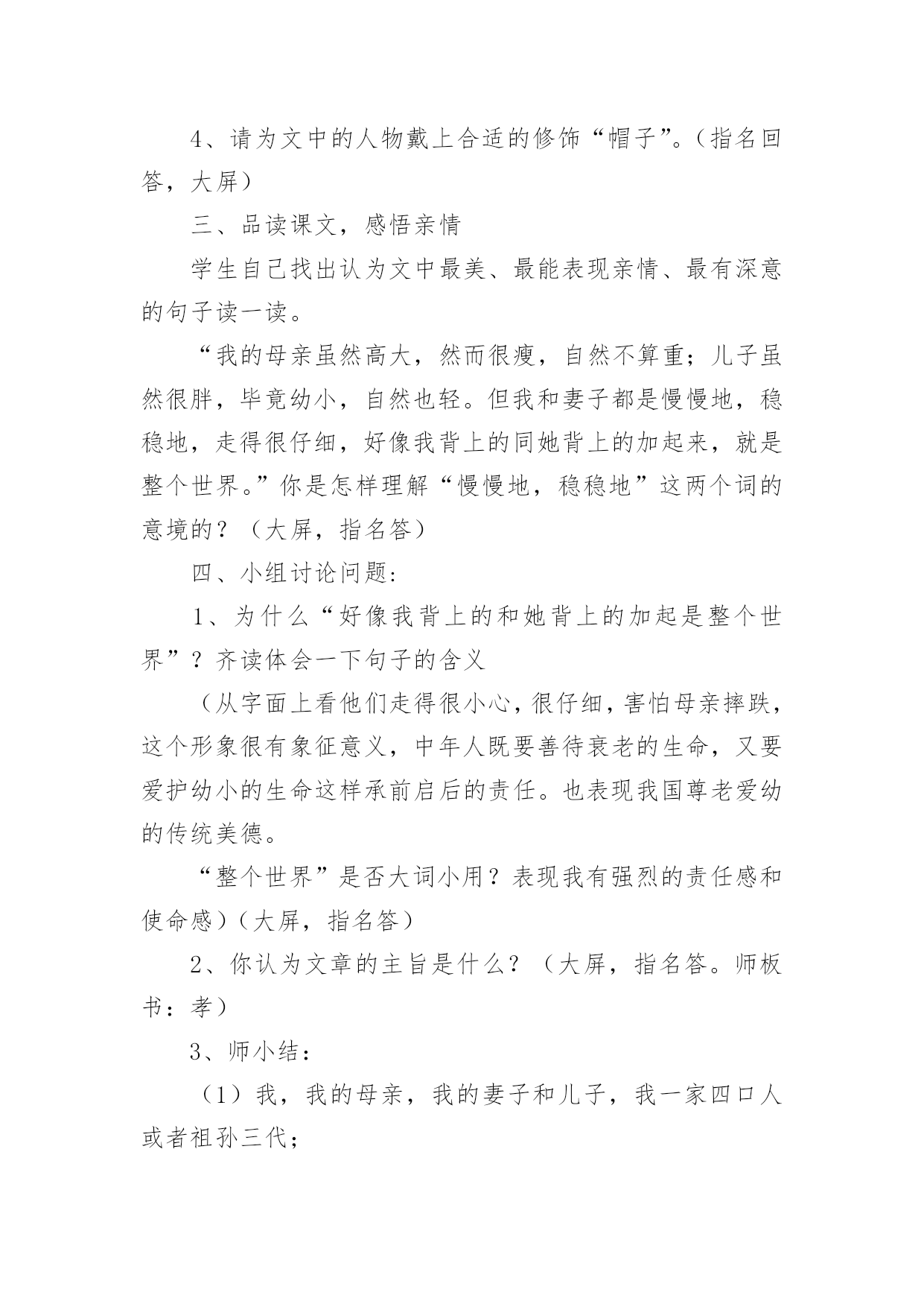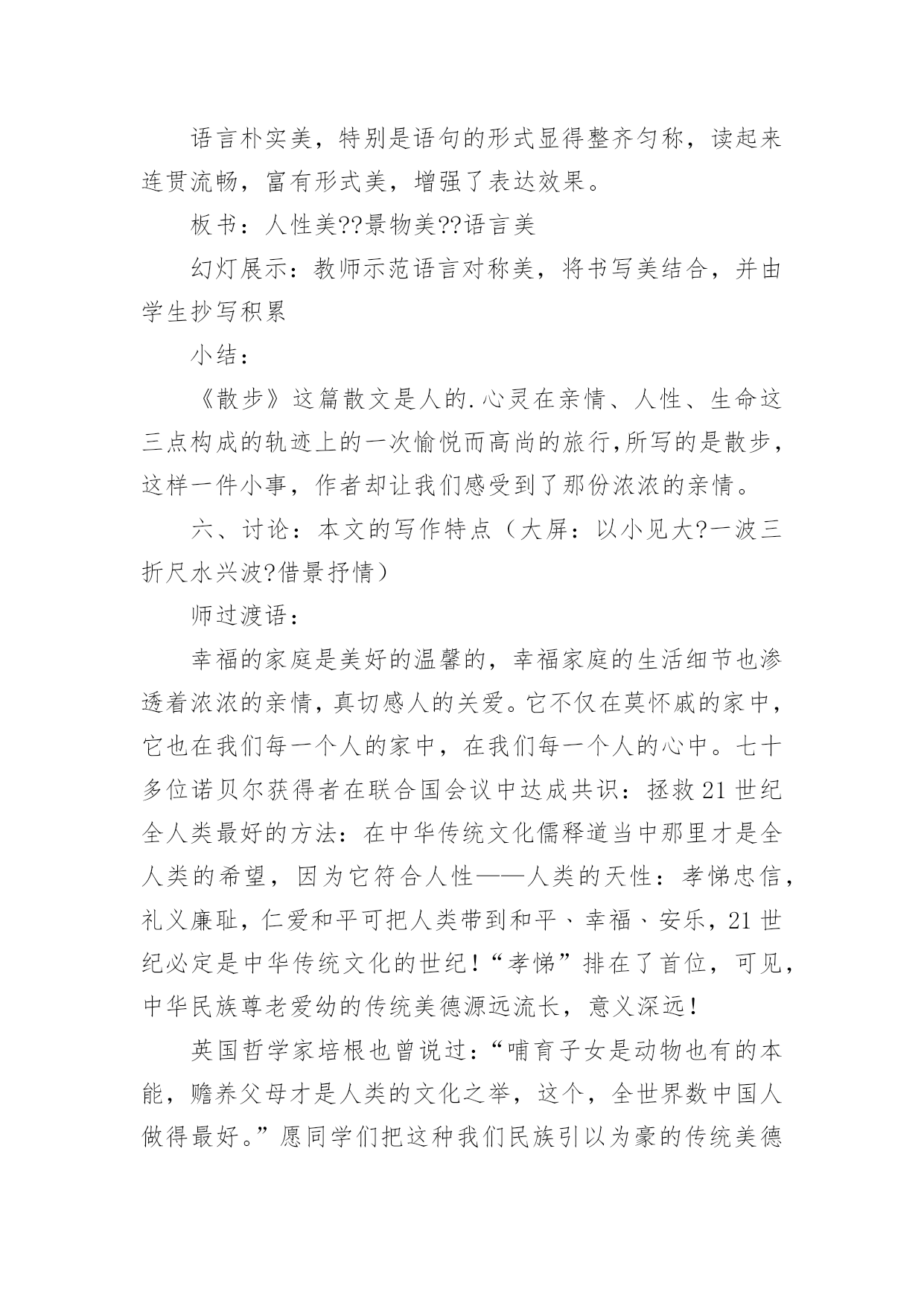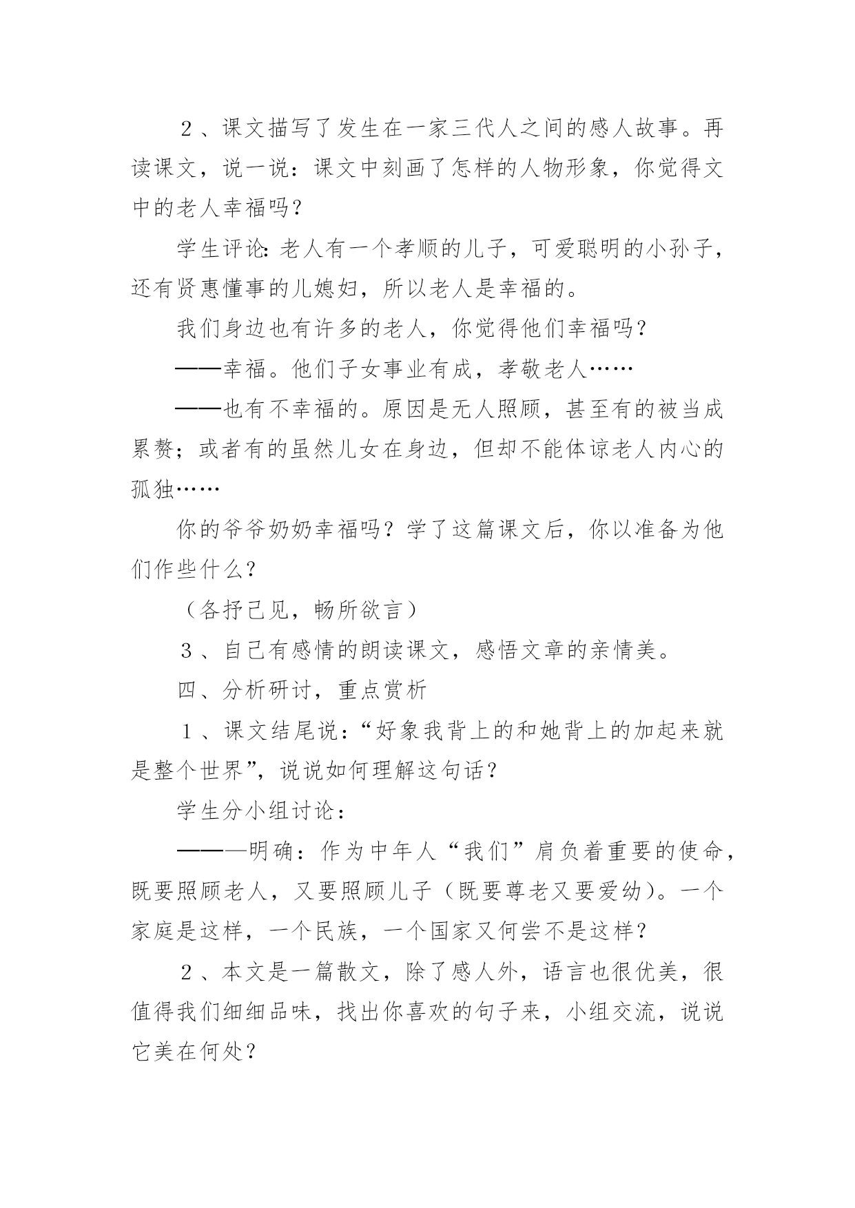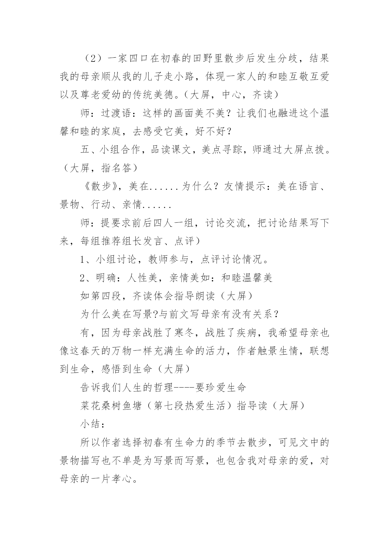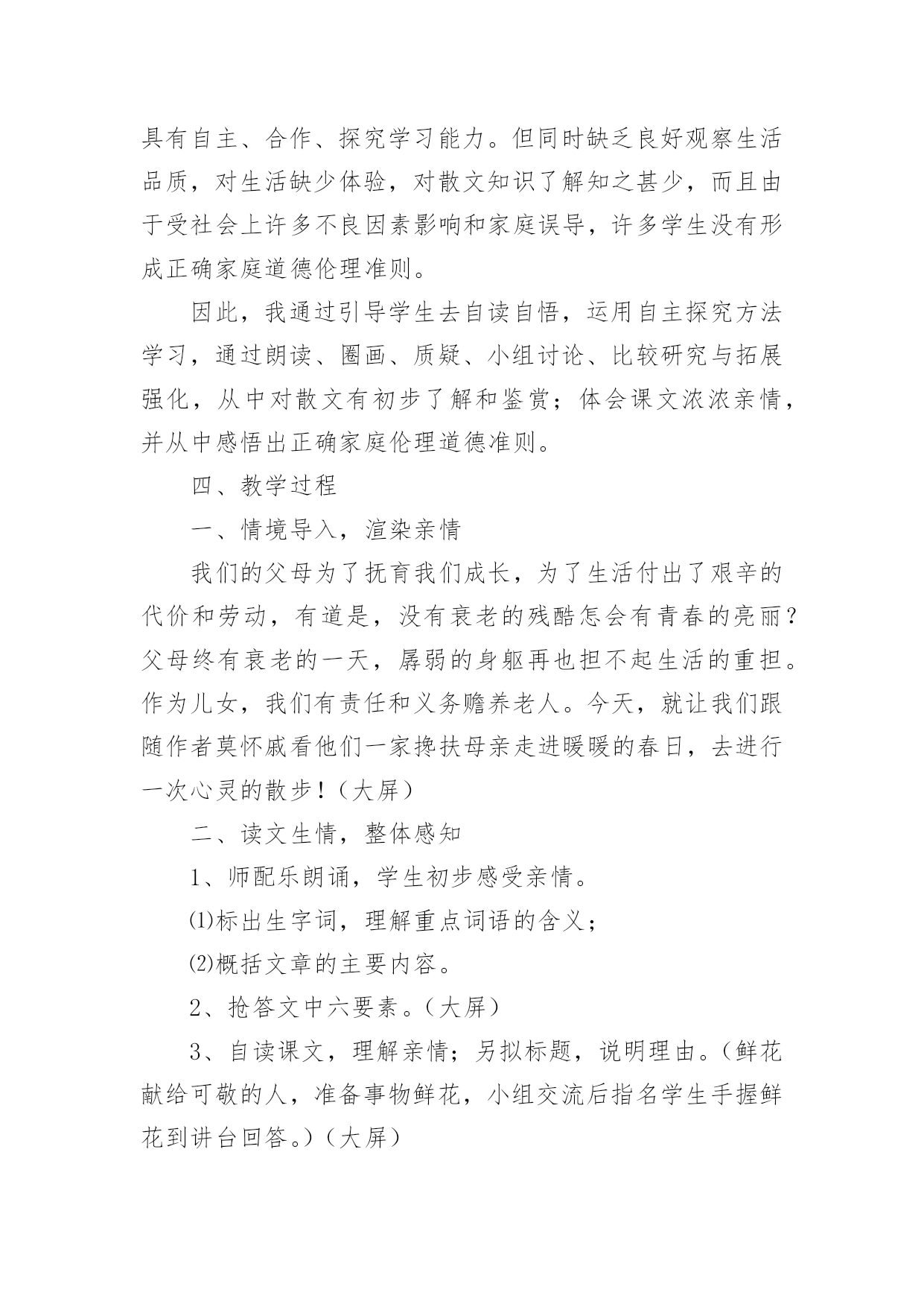 《散步》教学设计《散步》教学设计作为一名辛苦耕耘的教育工作者,就难以避免地要准备教学设计,教学设计是根据课程标准的要求和教学对象的特点,将教学诸要素有序安排,确定合适的教学方案的设想和计划。那么应当如何写教学设计呢?以下是小编精心整理的《散步》教学设计,希望对大家有所帮助。《散步》教学设计篇1【教学目标】1、学习理解课文优美的语言。2、能恰当运用在朗读中品味文章内容的方法。3、结合自身实际,理解,感悟文中亲情。【教学重点】运用在朗读中品味文章内容的方法,深入体会文章主题。【教学难点】学会揣摩,品味语言特点。【教学设想】本文是一篇散文,主要是将朗读教学贯穿始终,让学生在朗读中感知课文内容,在朗读中感受文章语言的美,进而学会揣摩。品味文章语言,并通过联系生活实际加深对文章主题的理解。培养学生爱家(小家),爱国家(大家)的思想感情。【教学步骤】初步感知,扫清障碍,积累词语。整体感知,理解内容,初探主题。分析研讨,重点赏析,激活思维。对比阅读,联系生活,培养感情。【教学过程】一、导入幸福的家庭是美好的,温馨的,幸福家庭的`生活细节也往往渗透着浓浓的亲情,真切感人的关爱。进入《散步》一文,你将会对“幸福”有更加真切的体会,会对“生命”有一些更深的感悟。二、初步感知这是一篇十分优美的散文,让我们用心去感悟它。1、自读课文,扫清文字障碍。这篇课文中你了解到了哪些新词语?说出来与大家共享:(互相解答)信服拆散水波粼粼各得其所2、朗读课文:配乐朗读,品味美的意境。3、互相交流。三、整体感知1、读了这篇课文后,你有什么感受?请大家各抒己见。明确;亲情。关爱老人,尊老爱幼等等。文中描绘了一个幸福的家庭,把你感受最深的句子读给大家听。(读句子,体会一家人的和睦与关爱。)2、课文描写了发生在一家三代人之间的感人故事。再读课文,说一说:课文中刻画了怎样的人物形象,你觉得文中的老人幸福吗?学生评论:老人有一个孝顺的儿子,可爱聪明的小孙子,还有贤惠懂事的儿媳妇,所以老人是幸福的。我们身边也有许多的老人,你觉得他们幸福吗?──幸福。他们子女事业有成,孝敬老人……──也有不幸福的。原因是无人照顾,甚至有的被当成累赘;或者有的虽然儿女在身边,但却不能体谅老人内心的孤独……你的爷爷奶奶幸福吗?学了这篇课文后,你以准备为他们作些什么?(各抒己见,畅所欲言)3、自己有感情的朗读课文,感悟文章的亲情美。四、分析研讨,重点赏析1、课文结尾说:“好象我背上的和她背上的加起来就是整个世界”,说说如何理解这句话?学生分小组讨论:──—明确:作为中年人“我们”肩负着重要的使命,既要照顾老人,又要照顾儿子(既要尊老又要爱幼)。一个家庭是这样,一个民族,一个国家又何尝不是这样?2、本文是一篇散文,除了感人外,语言也很优美,很值得我们细细品味,找出你喜欢的句子来,小组交流,说说它美在何处?例:儿子说:“前面是妈妈和儿子,后面也是妈妈和儿子”(对称美)小结:这篇文章有三处美,语言美、景色美、情景美。五、拓展迁移1、读课后《三代》一文,比较一下,哪个故事更感动你,说说你的理由。──《散步》:孝顺第一。──《三代》:宁可自己受伤,也要保护一老一少。2、“尊老爱幼”是我们中华民族的传统美德,但是在现实生活中却被人忽略了,你觉得是否有必要提倡“尊老爱幼”?──—教师做适当的引导。3、尊老爱幼是我们的传统美德,作为新一代的接班人,我们要将它发扬下去,爱小家,更爱我们中华民族的大家圆。听歌曲《我爱我家》。六、课堂小结学习了这篇课文,我们对“亲情”对“生命”有了更多的认识,联系社会与生活我们也懂得了许多。请大家谈一谈学习了本文后,你有哪些收获?(从课文的写法,主题等各方面去说)在我们身边还存在着不尽如人意的现象,同学们,你准备对他们说些什么?【板书设计】中年人善待衰老的生命爱护幼小的生命(尊老)(爱幼)启示:中年人肩负着重大的使命。传统美德不能忘。《散步》教学设计篇2一、教学内容分析本单元课文主题为亲情,所选课文都是围绕着有关亲情和家庭生活,《散步》正是体现着浓浓亲情一篇,记叙了一家三代野外散步“生活细节”,表现出一家人之间互敬互爱真挚感情,体现了中华民族尊老爱幼传统美德。学生可以通过自主、合作、探究学习方式,进入牧歌式情景,从中受到启示和教育。因此,本文在全套教材中地位和作用不可忽视。二、教学目标1、知识与能力目标:整体感知课文;继续练习朗读和圈点勾画,积累语言;锻炼理解能力和表达能力;发展思维能力和想象能力。2、过程与方法目标:抓住关键语句精读课文,自主、合作、探究,领悟课文深长意味。同时借鉴举轻若重、以小见大写法。3、情感态度价值观目标:感受字里行间亲情与责任感,形成尊老爱幼、珍爱亲情、珍爱生命思想感情。三、学习者特征分析七年级学生正处于发展独立思维重要阶段,他们主动性和求知欲都已大大提高,不