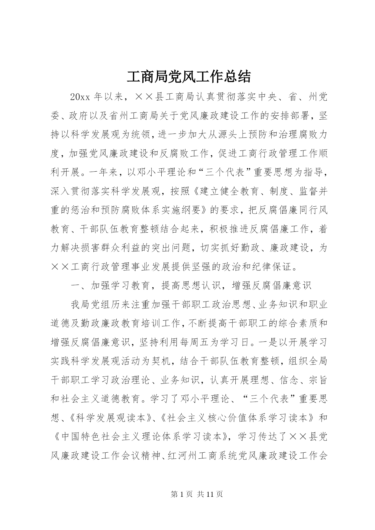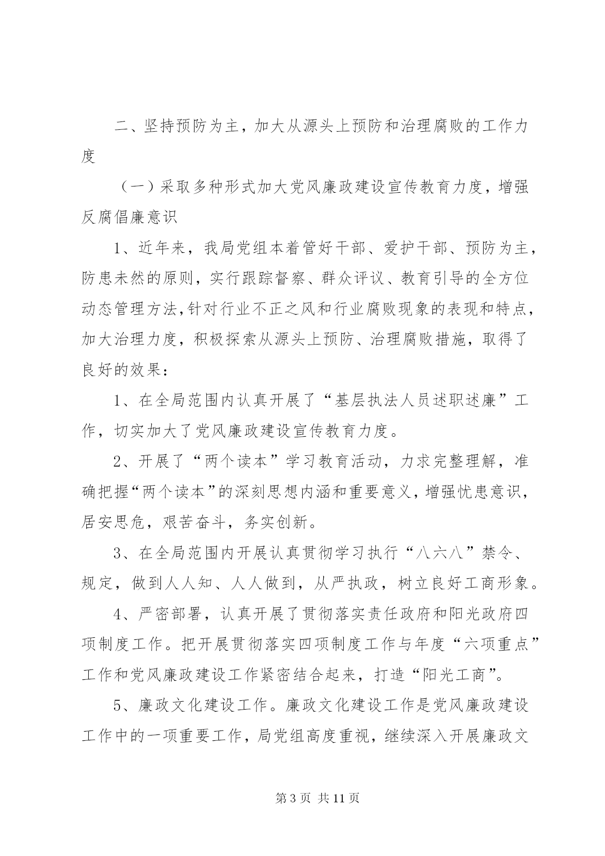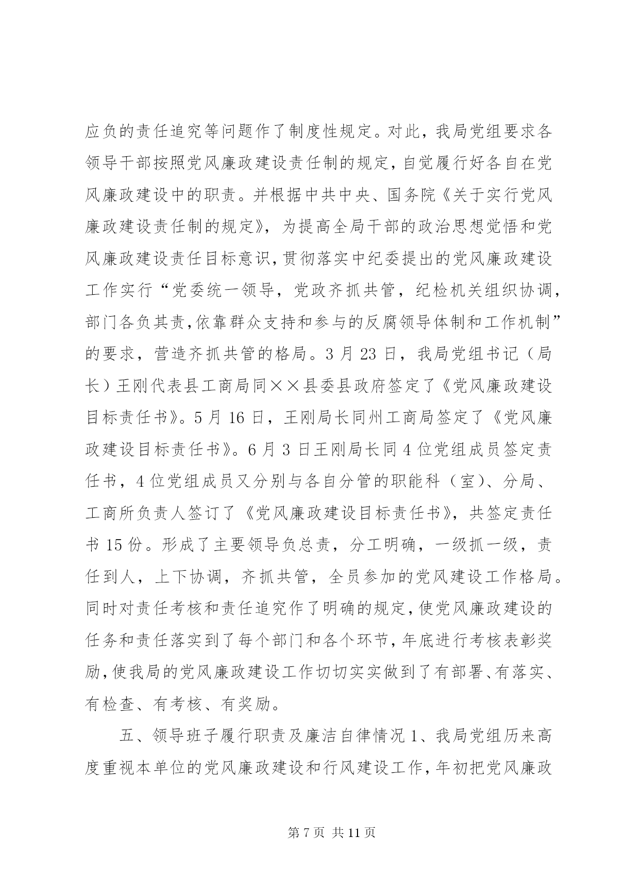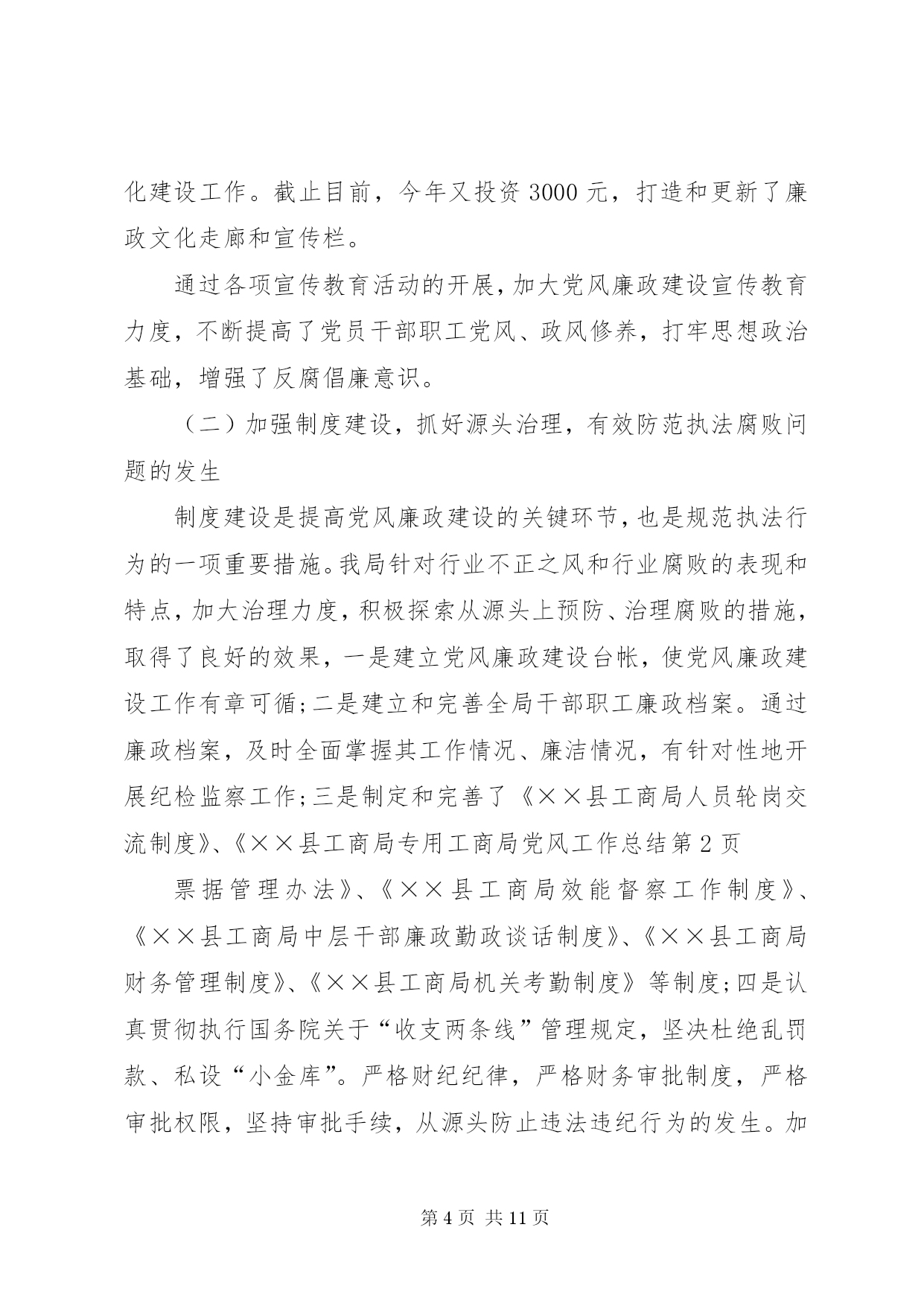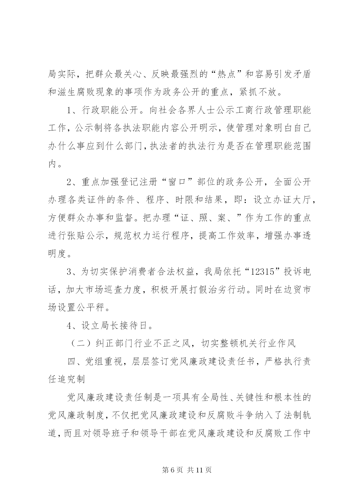 第PAGE\*Arabic\*MERGEFORMAT11页共NUMPAGES\*MERGEFORMAT11页工商局党风工作总结20xx年以来,××县工商局认真贯彻落实中央、省、州党委、政府以及省州工商局关于党风廉政建设工作的安排部署,坚持以科学发展观为统领,进一步加大从源头上预防和治理腐败力度,加强党风廉政建设和反腐败工作,促进工商行政管理工作顺利开展。一年来,以邓小平理论和“三个代表”重要思想为指导,深入贯彻落实科学发展观,按照《建立健全教育、制度、监督并重的惩治和预防腐败体系实施纲要》的要求,把反腐倡廉同行风教育、干部队伍教育整顿结合起来,积极推进反腐倡廉工作,着力解决损害群众利益的突出问题,切实抓好勤政、廉政建设,为××工商行政管理事业发展提供坚强的政治和纪律保证。一、加强学习教育,提高思想认识,增强反腐倡廉意识我局党组历来注重加强干部职工政治思想、业务知识和职业道德及勤政廉政教育培训工作,不断提高干部职工的综合素质和增强反腐倡廉意识,坚持利用每周五为学习日。一是以开展学习实践科学发展观活动为契机,结合干部队伍教育整顿,组织全局干部职工学习政治理论、业务知识,认真开展理想、信念、宗旨和社会主义道德教育。学习了邓小平理论、“三个代表”重要思想、《科学发展观读本》、《社会主义核心价值体系学习读本》和《中国特色社会主义理论体系学习读本》,学习传达了××县党风廉政建设工作会议精神、红河州工商系统党风廉政建设工作会议精神,组织干部职工收看先进事迹报告会和警示教育片等。引导党员、干部职工进一步坚定共产主义和建设有中国特色社会主义的理想信念,增强全心全意为人民服务的宗旨和责任意识,自觉抵御资产阶级腐朽思想的侵蚀;二是开展党纪、政纪、法律、法规教育学习活动,抓好形势和政策教育,增强党员干部反腐必胜的信念。学习了《公民道德建设实施纲要》、《中国共产党党章》、《XX省纪检监察机关“一案双查”暂行办法》、《中国共产党党内监督条例》、《中国共产党纪律处分条例》、《中华人民共和国宪法》、《中华人民共和国公务员法》和《行政机关公务员处分条例》等法律法规。三是领导干部在带头坚持学习、执行党的路线、方针、政策自觉遵守党纪国法的同时,注重抓好机关作风建设,转变作风,深入基层为群众办实事,解决基层干部职工在工作生活中的实际问题。迄今为止,领导班子成员共下基层26人次,92天次。一年来,我局共组织召开各类专题会、座谈会9次,参会党员干部职工260人次,撰写各类学习心得58篇,上报理论调研文章6篇,纪检监察部门分别向州局、县纪委、县机关工委、《××报》投稿8篇,被采用3篇。通过一系列的学习教育活动,使党员、干部受到了深刻的党性、党风和反腐倡廉教育,牢固树立正确的世界观、人生观、价值观,不断增强了自觉抵御腐败侵蚀的能力,提高了反腐败斗争的必胜信心。二、坚持预防为主,加大从源头上预防和治理腐败的工作力度(一)采取多种形式加大党风廉政建设宣传教育力度,增强反腐倡廉意识1、近年来,我局党组本着管好干部、爱护干部、预防为主,防患未然的原则,实行跟踪督察、群众评议、教育引导的全方位动态管理方法,针对行业不正之风和行业腐败现象的表现和特点,加大治理力度,积极探索从源头上预防、治理腐败措施,取得了良好的效果:1、在全局范围内认真开展了“基层执法人员述职述廉”工作,切实加大了党风廉政建设宣传教育力度。2、开展了“两个读本”学习教育活动,力求完整理解,准确把握“两个读本”的深刻思想内涵和重要意义,增强忧患意识,居安思危,艰苦奋斗,务实创新。3、在全局范围内开展认真贯彻学习执行“八六八”禁令、规定,做到人人知、人人做到,从严执政,树立良好工商形象。4、严密部署,认真开展了贯彻落实责任政府和阳光政府四项制度工作。把开展贯彻落实四项制度工作与年度“六项重点”工作和党风廉政建设工作紧密结合起来,打造“阳光工商”。5、廉政文化建设工作。廉政文化建设工作是党风廉政建设工作中的一项重要工作,局党组高度重视,继续深入开展廉政文化建设工作。截止目前,今年又投资3000元,打造和更新了廉政文化走廊和宣传栏。通过各项宣传教育活动的开展,加大党风廉政建设宣传教育力度,不断提高了党员干部职工党风、政风修养,打牢思想政治基础,增强了反腐倡廉意识。(二)加强制度建设,抓好源头治理,有效防范执法腐败问题的发生制度建设是提高党风廉政建设的关键环节,也是规范执法行为的一项重要措施。我局针对行业不正之风和行业腐败的表现和特点,加大治理力度,积极探索从源头上预防、治理腐败的措施,取得了良好的效果,一是建立党风廉政建设台帐,使党风廉政建设工作有章可循;二是建立和完善全局干部职工廉政档案。通过廉政档案,及时全面掌握其工作情况、廉洁情况,有针对性地开展纪检监察工作;三是制定和完善了《××县工商局人员