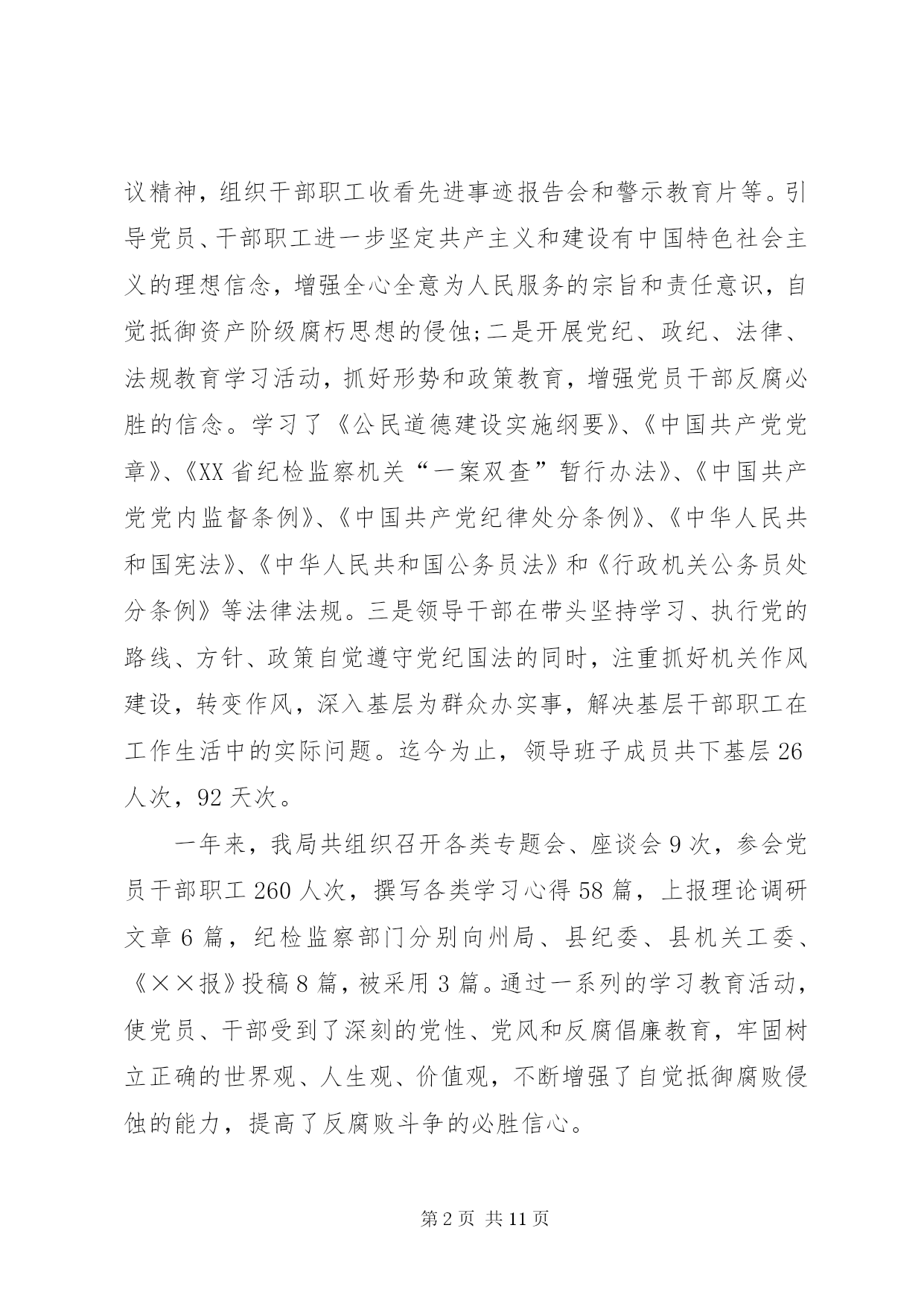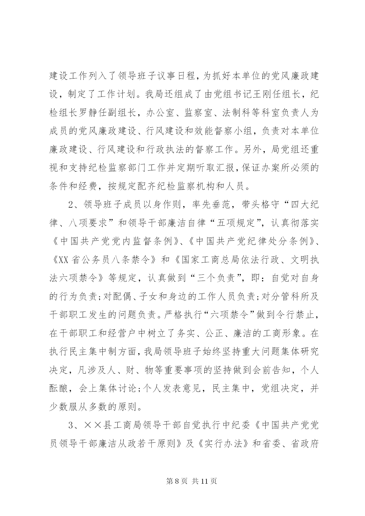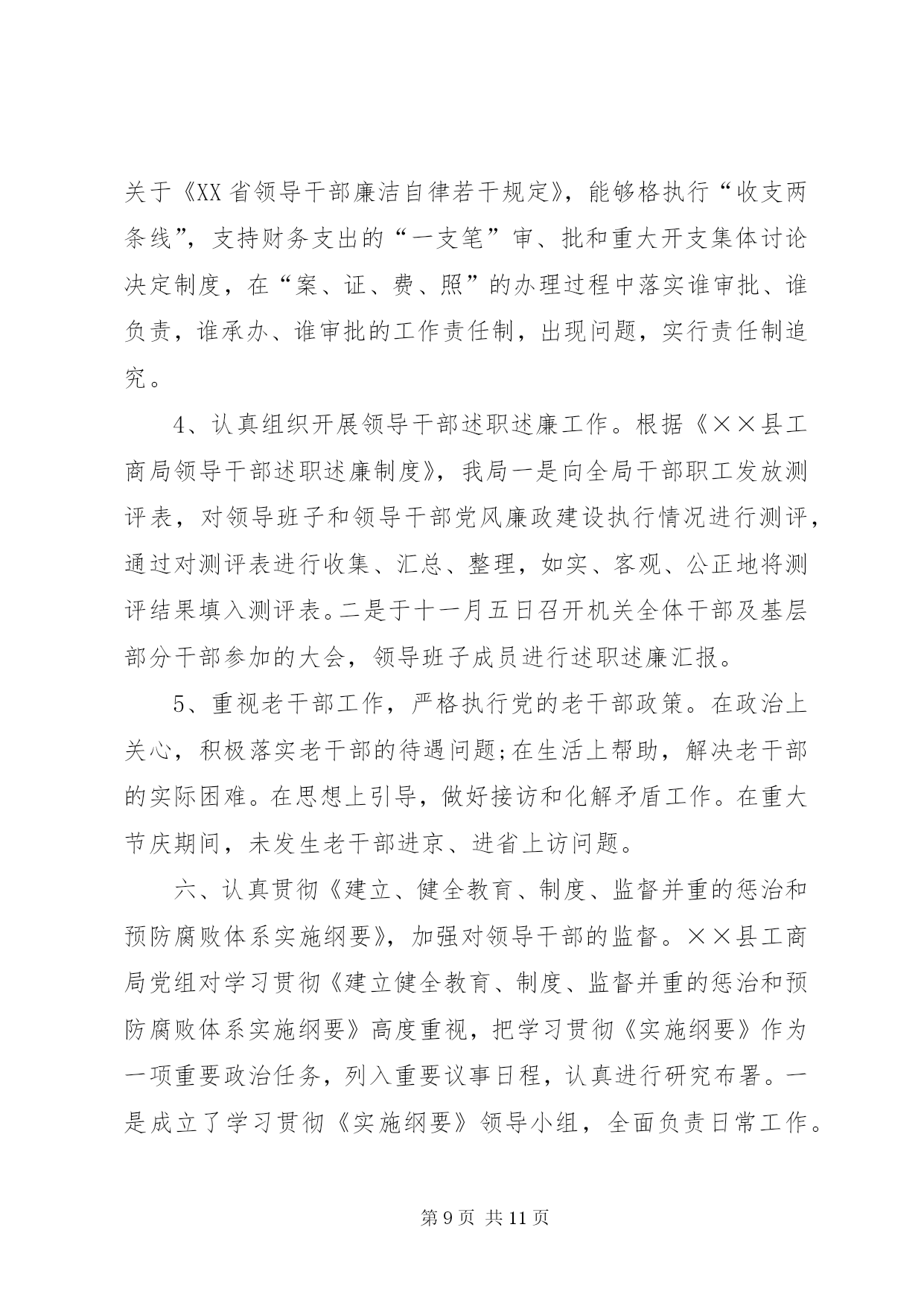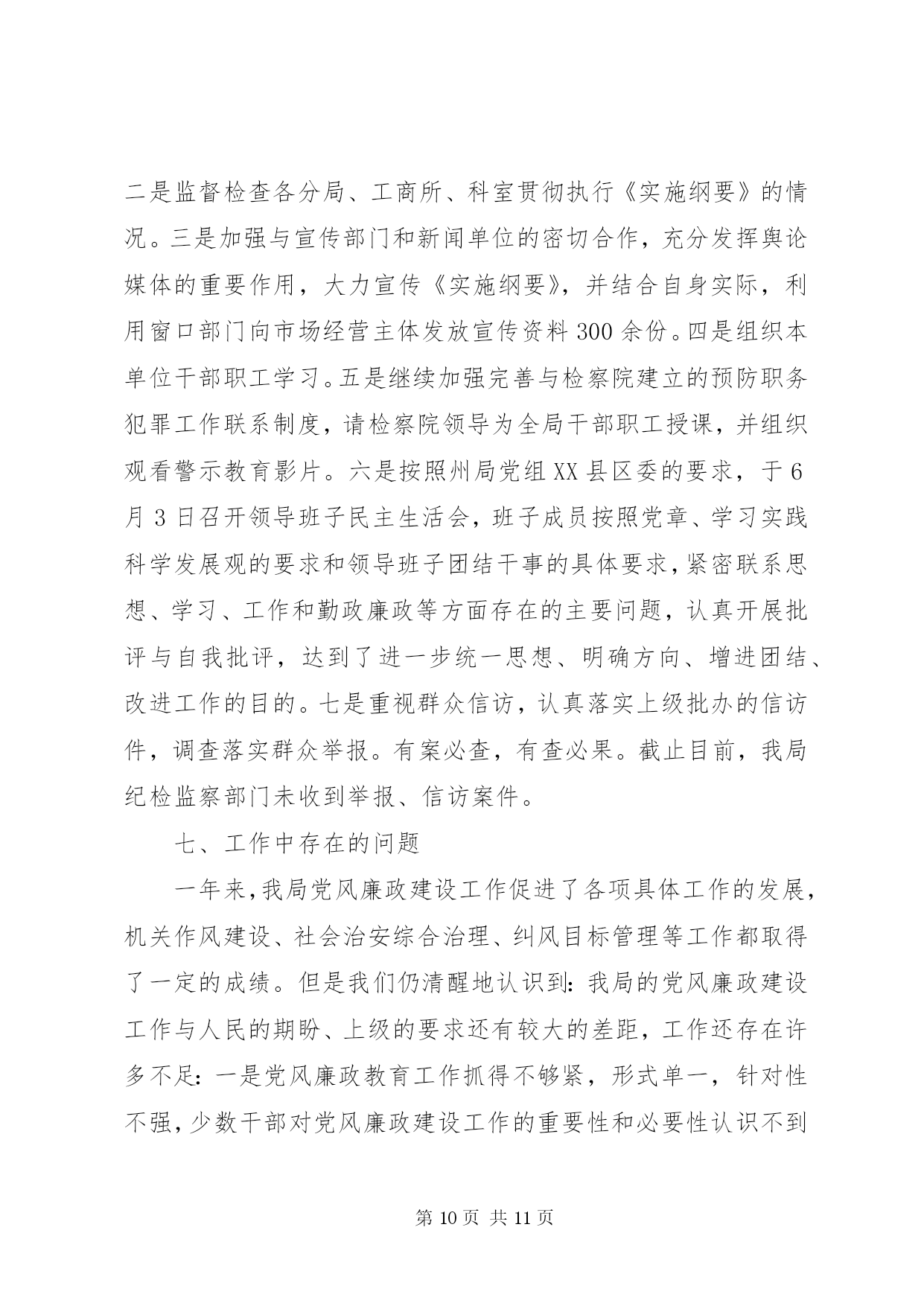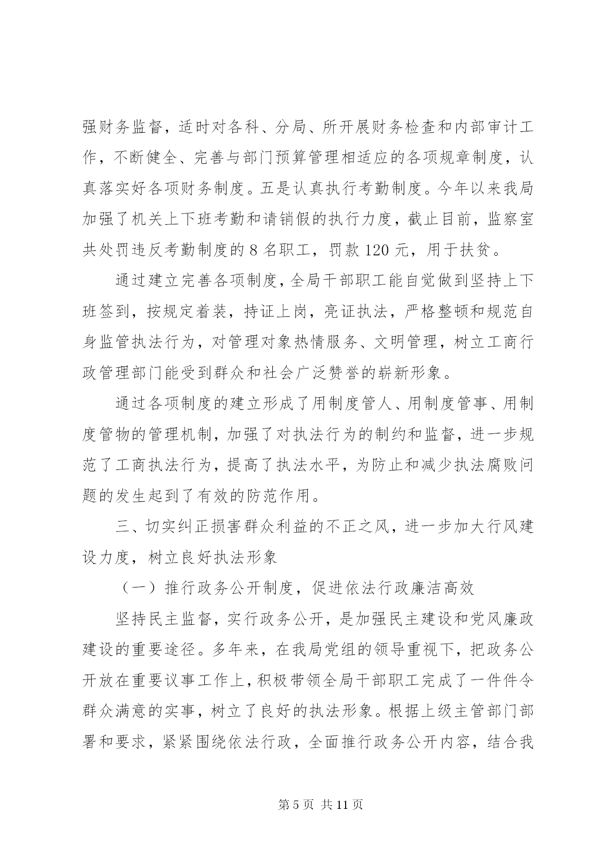 第PAGE\*Arabic\*MERGEFORMAT11页共NUMPAGES\*MERGEFORMAT11页工商局党风工作总结20xx年以来,××县工商局认真贯彻落实中央、省、州党委、政府以及省州工商局关于党风廉政建设工作的安排部署,坚持以科学发展观为统领,进一步加大从源头上预防和治理腐败力度,加强党风廉政建设和反腐败工作,促进工商行政管理工作顺利开展。一年来,以邓小平理论和“三个代表”重要思想为指导,深入贯彻落实科学发展观,按照《建立健全教育、制度、监督并重的惩治和预防腐败体系实施纲要》的要求,把反腐倡廉同行风教育、干部队伍教育整顿结合起来,积极推进反腐倡廉工作,着力解决损害群众利益的突出问题,切实抓好勤政、廉政建设,为××工商行政管理事业发展提供坚强的政治和纪律保证。一、加强学习教育,提高思想认识,增强反腐倡廉意识我局党组历来注重加强干部职工政治思想、业务知识和职业道德及勤政廉政教育培训工作,不断提高干部职工的综合素质和增强反腐倡廉意识,坚持利用每周五为学习日。一是以开展学习实践科学发展观活动为契机,结合干部队伍教育整顿,组织全局干部职工学习政治理论、业务知识,认真开展理想、信念、宗旨和社会主义道德教育。学习了邓小平理论、“三个代表”重要思想、《科学发展观读本》、《社会主义核心价值体系学习读本》和《中国特色社会主义理论体系学习读本》,学习传达了××县党风廉政建设工作会议精神、红河州工商系统党风廉政建设工作会议精神,组织干部职工收看先进事迹报告会和警示教育片等。引导党员、干部职工进一步坚定共产主义和建设有中国特色社会主义的理想信念,增强全心全意为人民服务的宗旨和责任意识,自觉抵御资产阶级腐朽思想的侵蚀;二是开展党纪、政纪、法律、法规教育学习活动,抓好形势和政策教育,增强党员干部反腐必胜的信念。学习了《公民道德建设实施纲要》、《中国共产党党章》、《XX省纪检监察机关“一案双查”暂行办法》、《中国共产党党内监督条例》、《中国共产党纪律处分条例》、《中华人民共和国宪法》、《中华人民共和国公务员法》和《行政机关公务员处分条例》等法律法规。三是领导干部在带头坚持学习、执行党的路线、方针、政策自觉遵守党纪国法的同时,注重抓好机关作风建设,转变作风,深入基层为群众办实事,解决基层干部职工在工作生活中的实际问题。迄今为止,领导班子成员共下基层26人次,92天次。一年来,我局共组织召开各类专题会、座谈会9次,参会党员干部职工260人次,撰写各类学习心得58篇,上报理论调研文章6篇,纪检监察部门分别向州局、县纪委、县机关工委、《××报》投稿8篇,被采用3篇。通过一系列的学习教育活动,使党员、干部受到了深刻的党性、党风和反腐倡廉教育,牢固树立正确的世界观、人生观、价值观,不断增强了自觉抵御腐败侵蚀的能力,提高了反腐败斗争的必胜信心。二、坚持预防为主,加大从源头上预防和治理腐败的工作力度(一)采取多种形式加大党风廉政建设宣传教育力度,增强反腐倡廉意识1、近年来,我局党组本着管好干部、爱护干部、预防为主,防患未然的原则,实行跟踪督察、群众评议、教育引导的全方位动态管理方法,针对行业不正之风和行业腐败现象的表现和特点,加大治理力度,积极探索从源头上预防、治理腐败措施,取得了良好的效果:1、在全局范围内认真开展了“基层执法人员述职述廉”工作,切实加大了党风廉政建设宣传教育力度。2、开展了“两个读本”学习教育活动,力求完整理解,准确把握“两个读本”的深刻思想内涵和重要意义,增强忧患意识,居安思危,艰苦奋斗,务实创新。3、在全局范围内开展认真贯彻学习执行“八六八”禁令、规定,做到人人知、人人做到,从严执政,树立良好工商形象。4、严密部署,认真开展了贯彻落实责任政府和阳光政府四项制度工作。把开展贯彻落实四项制度工作与年度“六项重点”工作和党风廉政建设工作紧密结合起来,打造“阳光工商”。5、廉政文化建设工作。廉政文化建设工作是党风廉政建设工作中的一项重要工作,局党组高度重视,继续深入开展廉政文化建设工作。截止目前,今年又投资3000元,打造和更新了廉政文化走廊和宣传栏。通过各项宣传教育活动的开展,加大党风廉政建设宣传教育力度,不断提高了党员干部职工党风、政风修养,打牢思想政治基础,增强了反腐倡廉意识。(二)加强制度建设,抓好源头治理,有效防范执法腐败问题的发生制度建设是提高党风廉政建设的关键环节,也是规范执法行为的一项重要措施。我局针对行业不正之风和行业腐败的表现和特点,加大治理力度,积极探索从源头上预防、治理腐败的措施,取得了良好的效果,一是建立党风廉政建设台帐,使党风廉政建设工作有章可循;二是建立和完善全局干部职工廉政档案。通过廉政档案,及时全面掌握其工作情况、廉洁情况,有针对性地开展纪检监察工作;三是制定和完善了《××县工商局人员