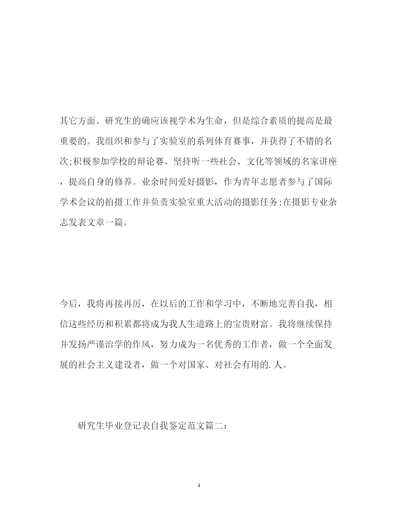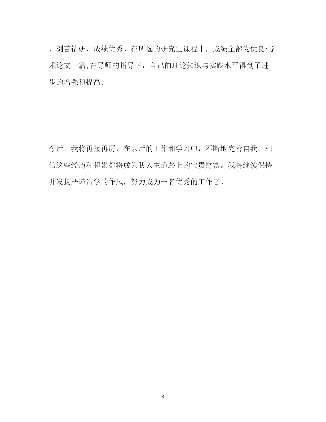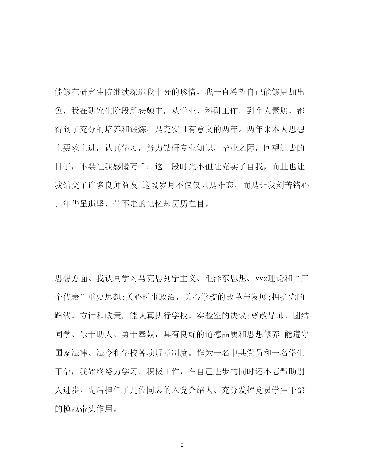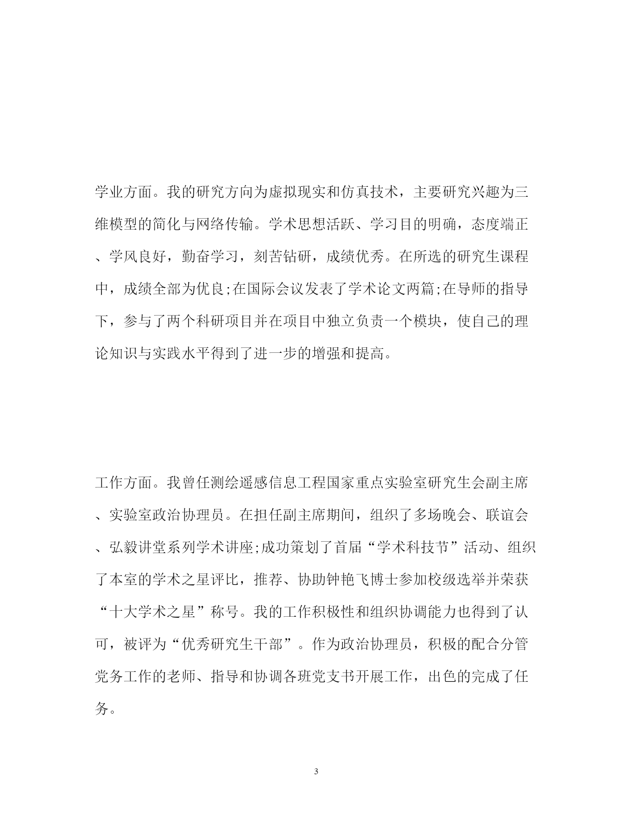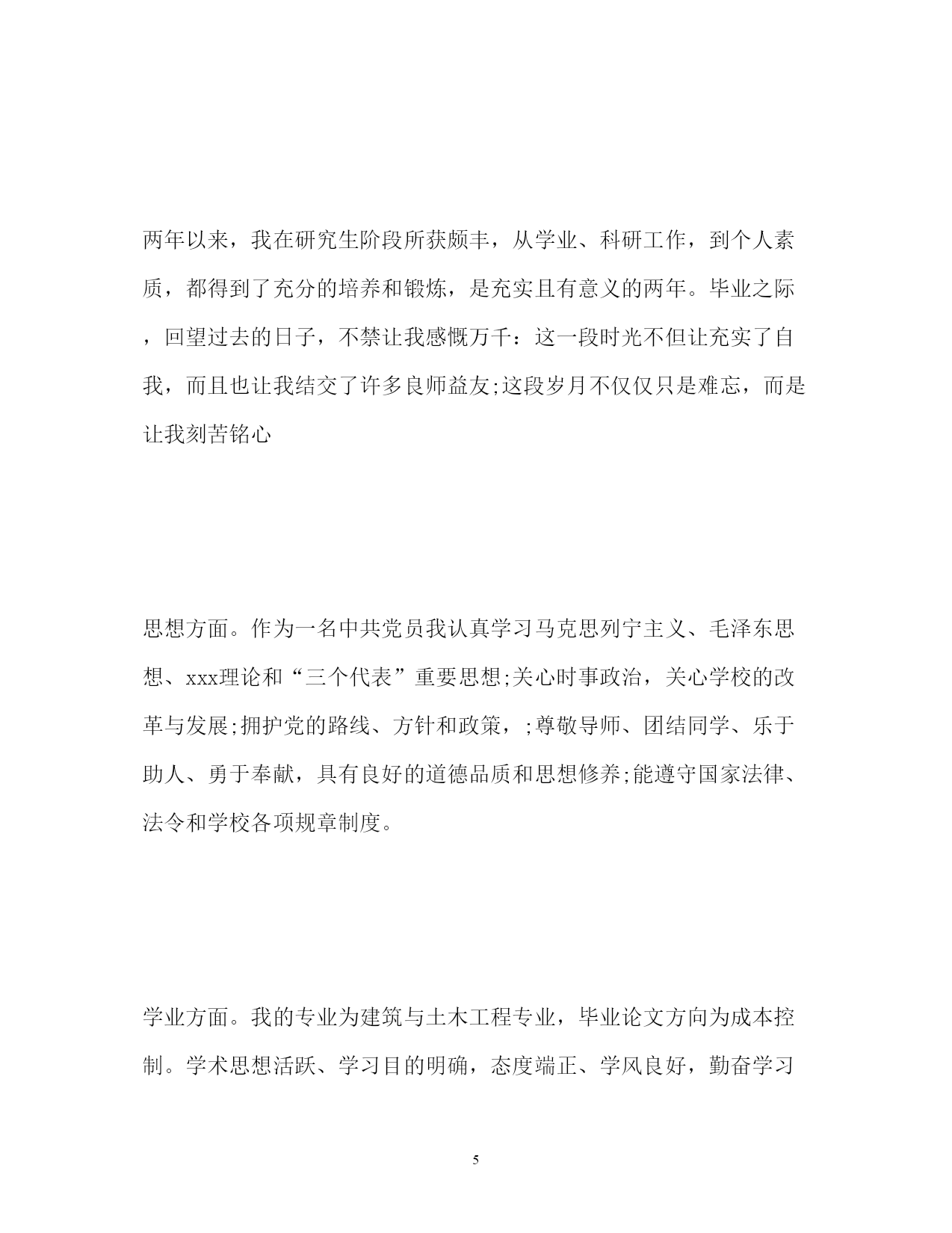 此资料由网络收集而来,如有侵权请告知上传者立即删除。资料共分享,我们负责传递知识。PAGEPAGE6研究生毕业登记表自我鉴定「」研究生毕业登记表自我鉴定「精选」毕业生登记表是由教育行政机关统一印制的具有规范格式的毕业生信息表格,一般由上级教育主管部门发放、备案,由毕业生所属学校管理、存档,由毕业生本人和校方分别填写相关内容,全面并客观记录、评价毕业生在校学习及行为表现。经过两年半的研究生学习,本人所获颇丰,从思想、学业、科研工作,到个人素质,都得到了充分的培养和锻炼,是充实而有意义。相信这些经历和积累都将成为人生道路上的宝贵财富。本文是小编为大家整理的研究生毕业登记表自我鉴定范文,仅供参考。研究生毕业登记表自我鉴定范文篇一:能够在研究生院继续深造我十分的珍惜,我一直希望自己能够更加出色,我在研究生阶段所获颇丰,从学业、科研工作,到个人素质,都得到了充分的培养和锻炼,是充实且有意义的两年。两年来本人思想上要求上进,认真学习,努力钻研专业知识,毕业之际,回望过去的日子,不禁让我感慨万千:这一段时光不但让充实了自我,而且也让我结交了许多良师益友;这段岁月不仅仅只是难忘,而是让我刻苦铭心。年华虽逝坚,带不走的记忆却历历在目。思想方面。我认真学习马克思列宁主义、毛泽东思想、xxx理论和“三个代表”重要思想;关心时事政治,关心学校的改革与发展;拥护党的路线、方针和政策,能认真执行学校、实验室的决议;尊敬导师、团结同学、乐于助人、勇于奉献,具有良好的道德品质和思想修养;能遵守国家法律、法令和学校各项规章制度。作为一名中共党员和一名学生干部,我始终努力学习、积极工作,在自己进步的同时还不忘帮助别人进步,先后担任了几位同志的入党介绍人、充分发挥党员学生干部的模范带头作用。学业方面。我的研究方向为虚拟现实和仿真技术,主要研究兴趣为三维模型的简化与网络传输。学术思想活跃、学习目的明确,态度端正、学风良好,勤奋学习,刻苦钻研,成绩优秀。在所选的研究生课程中,成绩全部为优良;在国际会议发表了学术论文两篇;在导师的指导下,参与了两个科研项目并在项目中独立负责一个模块,使自己的理论知识与实践水平得到了进一步的增强和提高。工作方面。我曾任测绘遥感信息工程国家重点实验室研究生会副主席、实验室政治协理员。在担任副主席期间,组织了多场晚会、联谊会、弘毅讲堂系列学术讲座;成功策划了首届“学术科技节”活动、组织了本室的学术之星评比,推荐、协助钟艳飞博士参加校级选举并荣获“十大学术之星”称号。我的工作积极性和组织协调能力也得到了认可,被评为“优秀研究生干部”。作为政治协理员,积极的配合分管党务工作的老师、指导和协调各班党支书开展工作,出色的完成了任务。其它方面。研究生的确应该视学术为生命,但是综合素质的提高是最重要的。我组织和参与了实验室的系列体育赛事,并获得了不错的名次;积极参加学校的辩论赛。坚持听一些社会、文化等领域的名家讲座,提高自身的修养。业余时间爱好摄影,作为青年志愿者参与了国际学术会议的拍摄工作并负责实验室重大活动的摄影任务;在摄影专业杂志发表文章一篇。今后,我将再接再厉,在以后的工作和学习中,不断地完善自我,相信这些经历和积累都将成为我人生道路上的宝贵财富。我将继续保持并发扬严谨治学的作风,努力成为一名优秀的工作者,做一个全面发展的社会主义建设者,做一个对国家、对社会有用的.人。研究生毕业登记表自我鉴定范文篇二:两年以来,我在研究生阶段所获颇丰,从学业、科研工作,到个人素质,都得到了充分的培养和锻炼,是充实且有意义的两年。毕业之际,回望过去的日子,不禁让我感慨万千:这一段时光不但让充实了自我,而且也让我结交了许多良师益友;这段岁月不仅仅只是难忘,而是让我刻苦铭心思想方面。作为一名中共党员我认真学习马克思列宁主义、毛泽东思想、xxx理论和“三个代表”重要思想;关心时事政治,关心学校的改革与发展;拥护党的路线、方针和政策,;尊敬导师、团结同学、乐于助人、勇于奉献,具有良好的道德品质和思想修养;能遵守国家法律、法令和学校各项规章制度。学业方面。我的专业为建筑与土木工程专业,毕业论文方向为成本控制。学术思想活跃、学习目的明确,态度端正、学风良好,勤奋学习,刻苦钻研,成绩优秀。在所选的研究生课程中,成绩全部为优良;学术论文一篇;在导师的指导下,自己的理论知识与实践水平得到了进一步的增强和提高。今后,我将再接再厉,在以后的工作和学习中,不断地完善自我,相信这些经历和积累都将成为我人生道路上的宝贵财富。我将继续保持并发扬严谨治学的作风,努力成为一名优秀的工作者。
