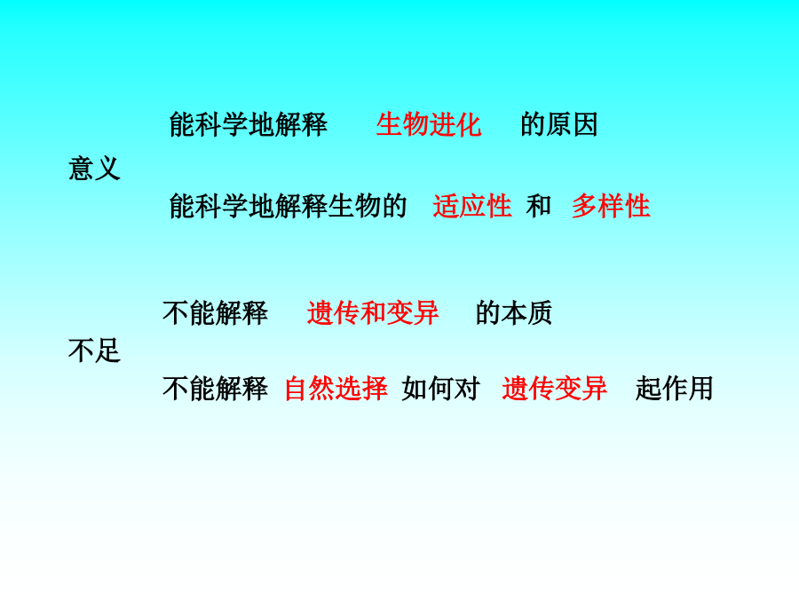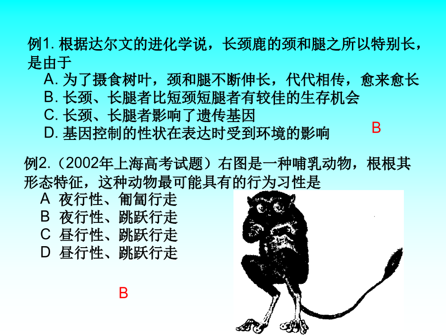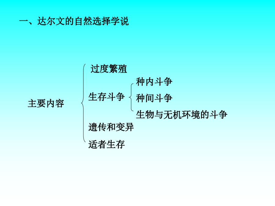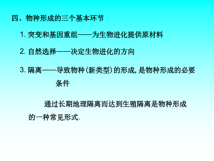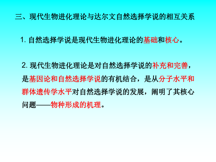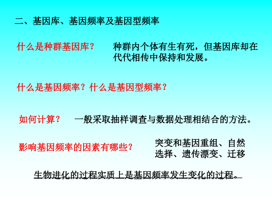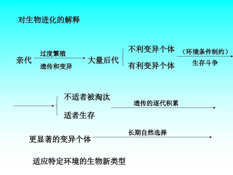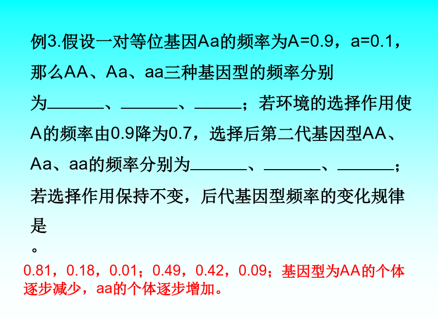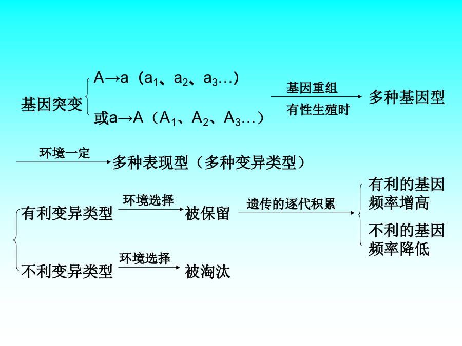 现代生物进化理论简介一、达尔文的自然选择学说对生物进化的解释意义例1.根据达尔文的进化学说,长颈鹿的颈和腿之所以特别长,是由于A.为了摄食树叶,颈和腿不断伸长,代代相传,愈来愈长B.长颈、长腿者比短颈短腿者有较佳的生存机会C.长颈、长腿者影响了遗传基因D.基因控制的性状在表达时受到环境的影响二、基因库、基因频率及基因型频率例3.假设一对等位基因Aa的频率为A=0.9,a=0.1,那么AA、Aa、aa三种基因型的频率分别为、、;若环境的选择作用使A的频率由0.9降为0.7,选择后第二代基因型AA、Aa、aa的频率分别为、、;若选择作用保持不变,后代基因型频率的变化规律是。三、现代生物进化理论与达尔文自然选择学说的相互关系四、物种形成的三个基本环节多种基因型例4.用A(较易保存),B(较易被淘汰)填空:(1)在生物的变异中,与环境变化一致的基因,与环境不一致的基因。(2)结构复杂的生态系统中的基因,结构简单的生态系统中的基因。(3)对人类有利,对生物本身并无害处的基因在自然条件下,在生产条件下。例5.某海岛上生活着一种昆虫,经调查翅的长度和个体数目的关系如图中甲曲线(纵坐标为个体数量,横坐标为翅的长度)。假如该海岛上经常刮大风,若干年后,在调查(1)你认为最可能代表此时情况的曲线是()(2)假如若干年后调查的情况如图d所示,则该海岛上的环境条件。