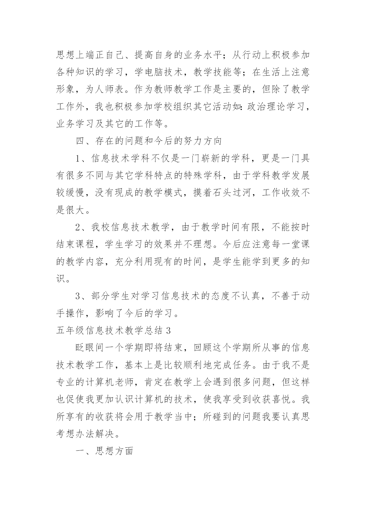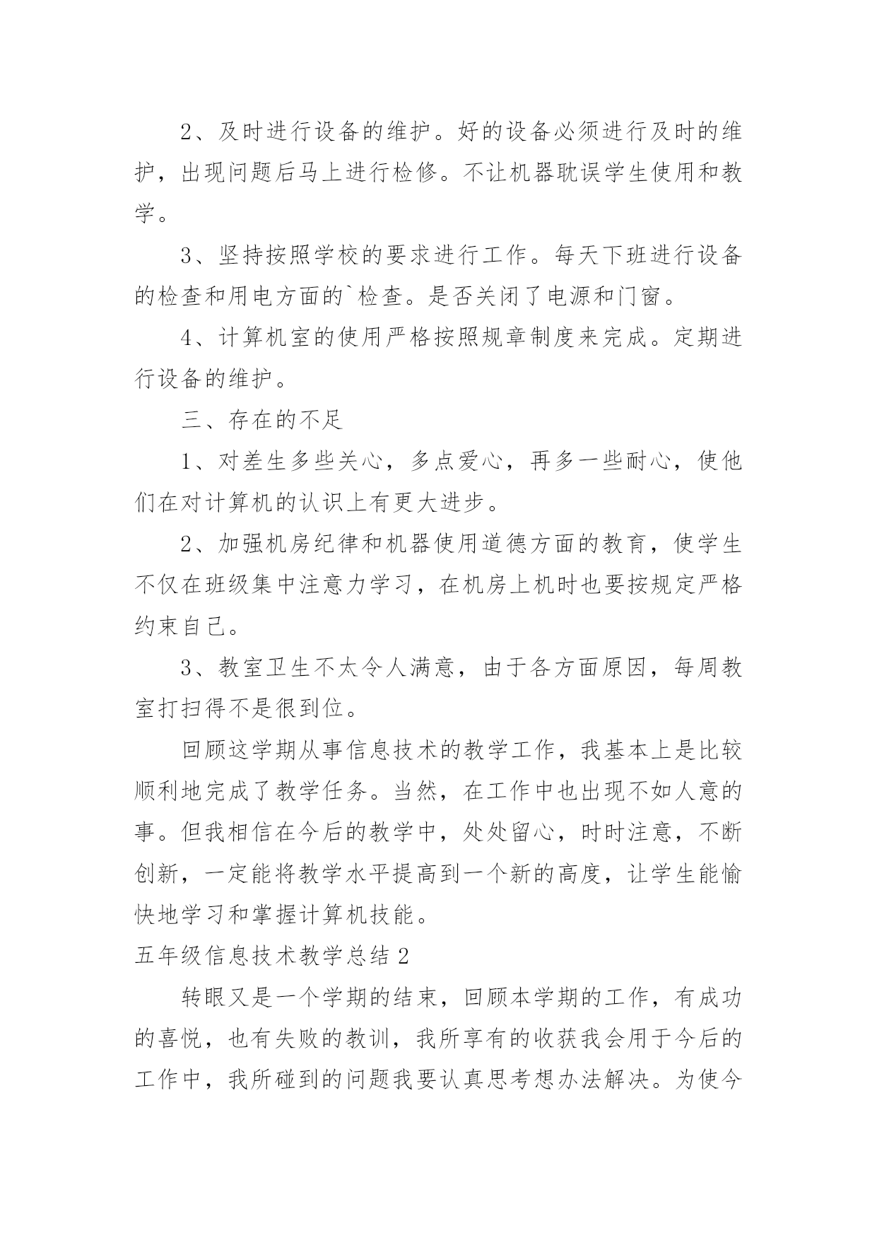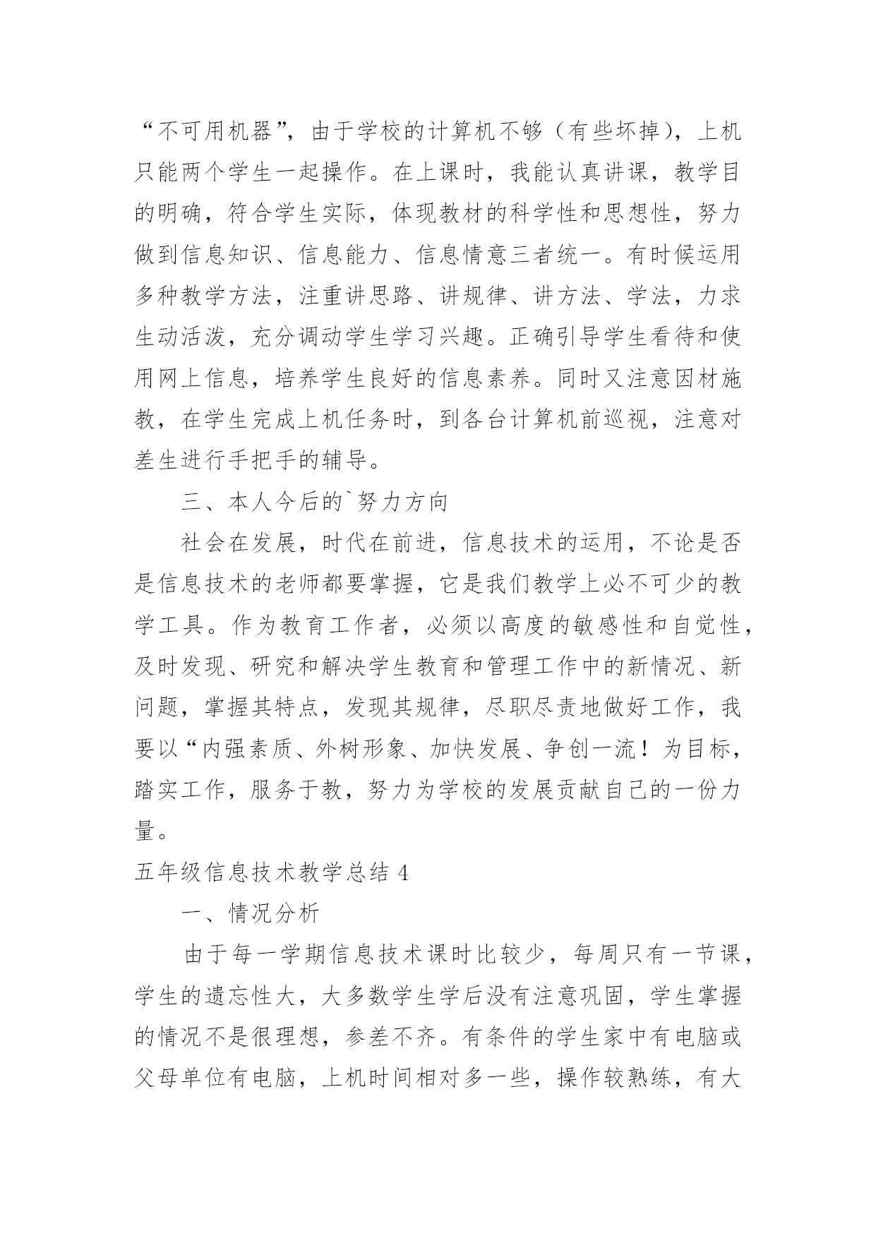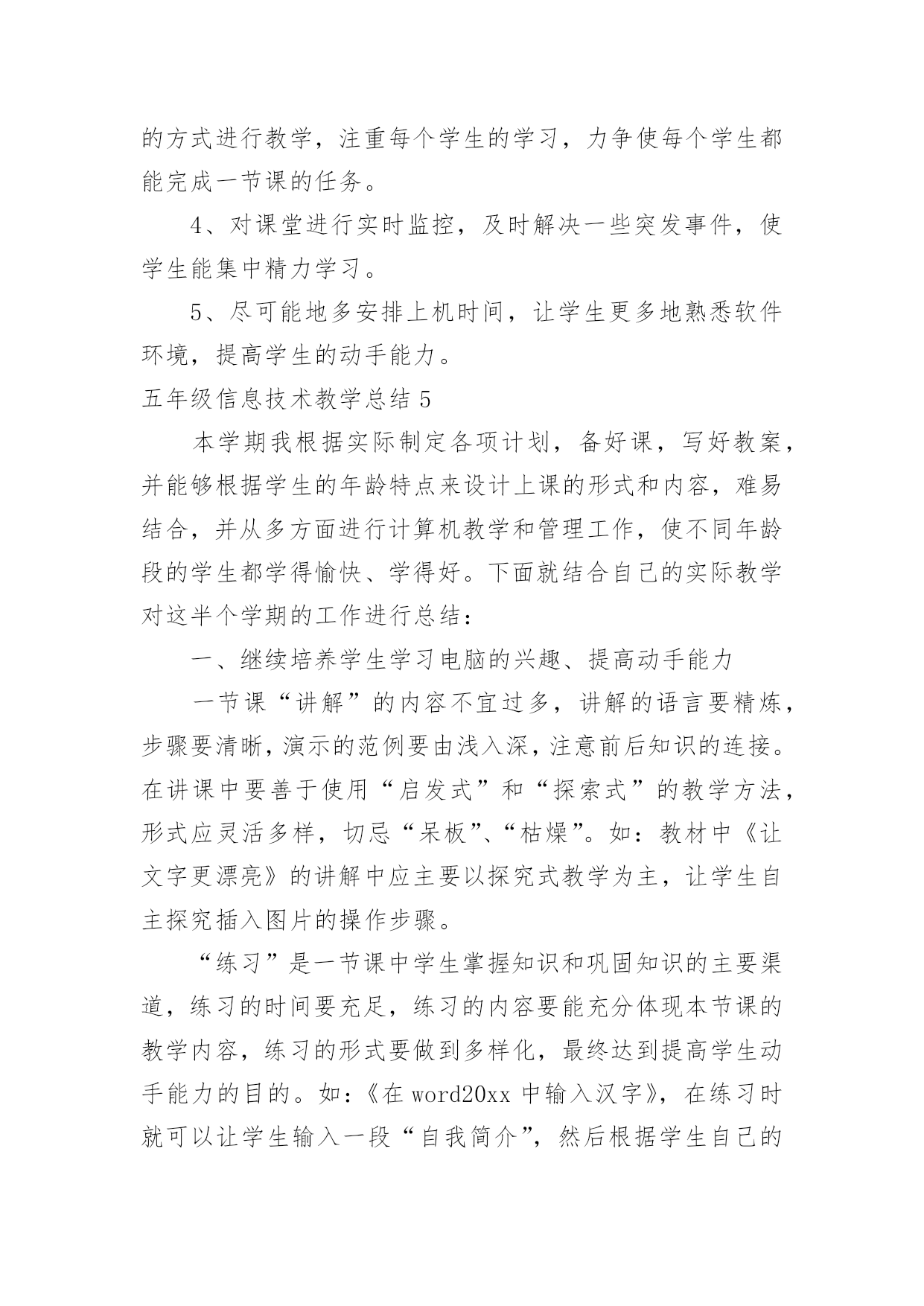 五年级信息技术教学总结五年级信息技术教学总结(集合13篇)总结是指对某一阶段的工作、学习或思想中的经验或情况加以总结和概括的书面材料,它可以给我们下一阶段的学习和工作生活做指导,不如静下心来好好写写总结吧。你想知道总结怎么写吗?以下是小编为大家整理的五年级信息技术教学总结,希望能够帮助到大家。五年级信息技术教学总结1本学期,我担任镇沅直属小学五年级5个班的信息技术教学工作。通过教学工作使我深刻地认识到信息技术课程的地位和作用,对信息技术的发展有了正确的认识,它既是基础教育课程改革和发展的需要,又是小学素质教育工程的重要内容。在工作中我享受到了收获喜悦,也在工作中发现一些存在的问题。我所享有的收获我会用于新学期的工作中,我所碰到的问题我要认真思考想办法解决。本学期我主要做了这一些工作:一、教学方面1、做到期初有计划,有教学进度,使教学工作能有条不紊地顺利进行下去;由于教学计划安排的比较好,所以并没有给工作带来影响,反而在一定程度上有利于教学工作的进行,使得大量电脑理论知识得于传授给学生。2、按照学校工作管理规定,认真备好课,写好教案,努力上好每一节课。电脑课校安排的课时比较少(一周每班1节)这对于学生来讲的很重要的1节课;对老师来讲是比较难上的1节课。所以才能上好每1节课对老师对学生都是很关键的。除了备好课、写好教案外,我还要查阅各种资料,上网寻找好的教学材料,教学课件,把它们和我所从事的工作结合起来,为我所用。3、学生方面:(1)采用学生竞赛的方法。相互学习,相互促进,看谁的表现操作、完成任务等最好。充分利用课堂时间,学习新知识,掌握新技能。(2)采用边学边用的方法。学一点就让学生应用起来,不仅要满足学生的好奇心,还要在应用过程中,充分肯定学生自身的能力,增强学生的自信心,保持和促进学生的积极性,进一步激发学生学习的积极性和兴趣,形成良性循环。4、个人提高方面:深入钻研信息技术教学教材,在备课上下功夫,查阅大量的书除了听课,评课,参加教研组教研活动外,我还注意到要自学。5、及时做总结、写反思。认真进行课后写教学博客。信息技术教学注重内容衔接,抓住重点。因此在课后要及时总结课堂上的不足,以便能及时更正。只有不断反思,才有不断进步。二、电脑室管理方面1、本学期,严格按照学校的规定,电脑室完成了教学和使用任务。2、及时进行设备的维护。好的设备必须进行及时的维护,出现问题后马上进行检修。不让机器耽误学生使用和教学。3、坚持按照学校的要求进行工作。每天下班进行设备的检查和用电方面的`检查。是否关闭了电源和门窗。4、计算机室的使用严格按照规章制度来完成。定期进行设备的维护。三、存在的不足1、对差生多些关心,多点爱心,再多一些耐心,使他们在对计算机的认识上有更大进步。2、加强机房纪律和机器使用道德方面的教育,使学生不仅在班级集中注意力学习,在机房上机时也要按规定严格约束自己。3、教室卫生不太令人满意,由于各方面原因,每周教室打扫得不是很到位。回顾这学期从事信息技术的教学工作,我基本上是比较顺利地完成了教学任务。当然,在工作中也出现不如人意的事。但我相信在今后的教学中,处处留心,时时注意,不断创新,一定能将教学水平提高到一个新的高度,让学生能愉快地学习和掌握计算机技能。五年级信息技术教学总结2转眼又是一个学期的结束,回顾本学期的工作,有成功的喜悦,也有失败的教训,我所享有的收获我会用于今后的工作中,我所碰到的问题我要认真思考想办法解决。为使今后的工作做得更好,现总结如下。一、本学期信息技术学科教学目的要求1、增强学生的信息意识,了解信息技术的发展变化及其对工作和社会的影响。2、了解文字处理软件word操作系统及其操作方法。3、了解文字处理软件在日常生活中的应用XX-XX学年下期信息技术教学工作总结,帮助学生从小树立团结合作、互帮互学、资源共享的团队精神。二、提高教学质量的具体措施他山之石,可以攻玉。针对学生实际,我在教学中认真做了以下几方面的工作。1、结合计算机教学实际,开展好常规教学。⑴开学初,便结合我校的计算机教学实际,制定出切实可行的教学计划,并严格按教学计划进行上课。在教学过程中,对具体的教学内容都进小学信息技术教学工作总结范文行了认真的教学分析,思考在现有计算机软教学的实际情况下如何实施教学,并写成教案上课。收到较好的效果。⑵、在教学中,我经常研究学生的思想发展变化,为了提高学生学习信息技术的兴趣,在不影响教学的情况下,自己从光盘上或到其它学校去找了一些有利于学生智力发展的小游戏,把这些游戏在学生完成学习任务后给学生玩,让学生既巩固了所学知识,又提高了学习兴趣,并有助于学生智力发展。经本期实践,取得了很好的效果。学生不但掌握了规定的.信息技术知识和达到了规定的操作技能水平,而且还从游戏中学到了许多其它的知识。信息技术课已经成了学