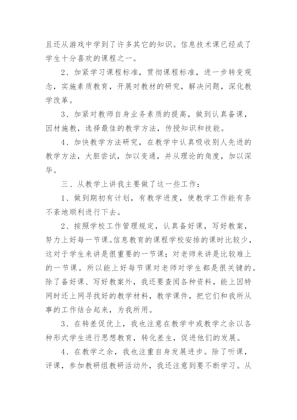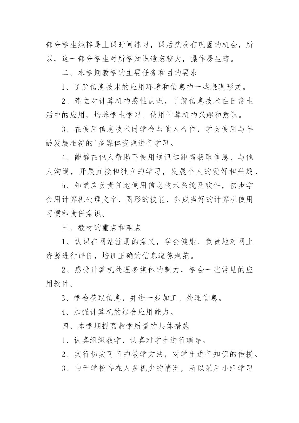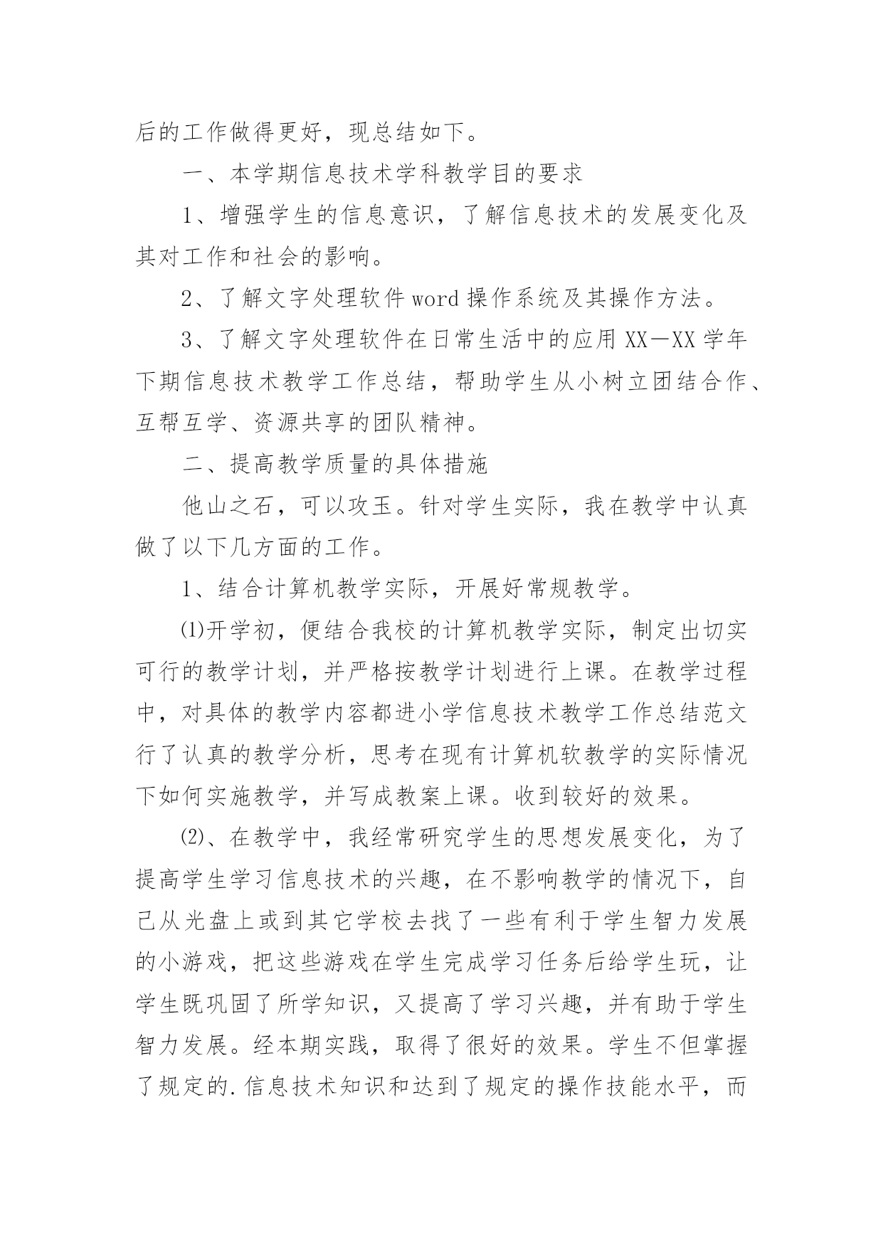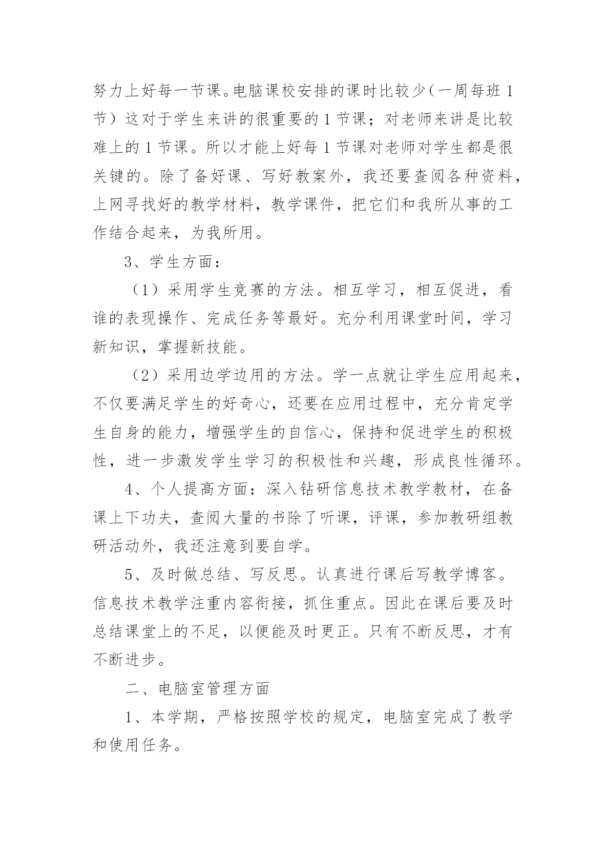 五年级信息技术教学总结五年级信息技术教学总结(集合13篇)总结是指对某一阶段的工作、学习或思想中的经验或情况加以总结和概括的书面材料,它可以给我们下一阶段的学习和工作生活做指导,不如静下心来好好写写总结吧。你想知道总结怎么写吗?以下是小编为大家整理的五年级信息技术教学总结,希望能够帮助到大家。五年级信息技术教学总结1本学期,我担任镇沅直属小学五年级5个班的信息技术教学工作。通过教学工作使我深刻地认识到信息技术课程的地位和作用,对信息技术的发展有了正确的认识,它既是基础教育课程改革和发展的需要,又是小学素质教育工程的重要内容。在工作中我享受到了收获喜悦,也在工作中发现一些存在的问题。我所享有的收获我会用于新学期的工作中,我所碰到的问题我要认真思考想办法解决。本学期我主要做了这一些工作:一、教学方面1、做到期初有计划,有教学进度,使教学工作能有条不紊地顺利进行下去;由于教学计划安排的比较好,所以并没有给工作带来影响,反而在一定程度上有利于教学工作的进行,使得大量电脑理论知识得于传授给学生。2、按照学校工作管理规定,认真备好课,写好教案,努力上好每一节课。电脑课校安排的课时比较少(一周每班1节)这对于学生来讲的很重要的1节课;对老师来讲是比较难上的1节课。所以才能上好每1节课对老师对学生都是很关键的。除了备好课、写好教案外,我还要查阅各种资料,上网寻找好的教学材料,教学课件,把它们和我所从事的工作结合起来,为我所用。3、学生方面:(1)采用学生竞赛的方法。相互学习,相互促进,看谁的表现操作、完成任务等最好。充分利用课堂时间,学习新知识,掌握新技能。(2)采用边学边用的方法。学一点就让学生应用起来,不仅要满足学生的好奇心,还要在应用过程中,充分肯定学生自身的能力,增强学生的自信心,保持和促进学生的积极性,进一步激发学生学习的积极性和兴趣,形成良性循环。4、个人提高方面:深入钻研信息技术教学教材,在备课上下功夫,查阅大量的书除了听课,评课,参加教研组教研活动外,我还注意到要自学。5、及时做总结、写反思。认真进行课后写教学博客。信息技术教学注重内容衔接,抓住重点。因此在课后要及时总结课堂上的不足,以便能及时更正。只有不断反思,才有不断进步。二、电脑室管理方面1、本学期,严格按照学校的规定,电脑室完成了教学和使用任务。2、及时进行设备的维护。好的设备必须进行及时的维护,出现问题后马上进行检修。不让机器耽误学生使用和教学。3、坚持按照学校的要求进行工作。每天下班进行设备的检查和用电方面的`检查。是否关闭了电源和门窗。4、计算机室的使用严格按照规章制度来完成。定期进行设备的维护。三、存在的不足1、对差生多些关心,多点爱心,再多一些耐心,使他们在对计算机的认识上有更大进步。2、加强机房纪律和机器使用道德方面的教育,使学生不仅在班级集中注意力学习,在机房上机时也要按规定严格约束自己。3、教室卫生不太令人满意,由于各方面原因,每周教室打扫得不是很到位。回顾这学期从事信息技术的教学工作,我基本上是比较顺利地完成了教学任务。当然,在工作中也出现不如人意的事。但我相信在今后的教学中,处处留心,时时注意,不断创新,一定能将教学水平提高到一个新的高度,让学生能愉快地学习和掌握计算机技能。五年级信息技术教学总结2转眼又是一个学期的结束,回顾本学期的工作,有成功的喜悦,也有失败的教训,我所享有的收获我会用于今后的工作中,我所碰到的问题我要认真思考想办法解决。为使今后的工作做得更好,现总结如下。一、本学期信息技术学科教学目的要求1、增强学生的信息意识,了解信息技术的发展变化及其对工作和社会的影响。2、了解文字处理软件word操作系统及其操作方法。3、了解文字处理软件在日常生活中的应用XX-XX学年下期信息技术教学工作总结,帮助学生从小树立团结合作、互帮互学、资源共享的团队精神。二、提高教学质量的具体措施他山之石,可以攻玉。针对学生实际,我在教学中认真做了以下几方面的工作。1、结合计算机教学实际,开展好常规教学。⑴开学初,便结合我校的计算机教学实际,制定出切实可行的教学计划,并严格按教学计划进行上课。在教学过程中,对具体的教学内容都进小学信息技术教学工作总结范文行了认真的教学分析,思考在现有计算机软教学的实际情况下如何实施教学,并写成教案上课。收到较好的效果。⑵、在教学中,我经常研究学生的思想发展变化,为了提高学生学习信息技术的兴趣,在不影响教学的情况下,自己从光盘上或到其它学校去找了一些有利于学生智力发展的小游戏,把这些游戏在学生完成学习任务后给学生玩,让学生既巩固了所学知识,又提高了学习兴趣,并有助于学生智力发展。经本期实践,取得了很好的效果。学生不但掌握了规定的.信息技术知识和达到了规定的操作技能水平,而且还从游戏中学到了许多其它的知识。信息技术课已经成了学
